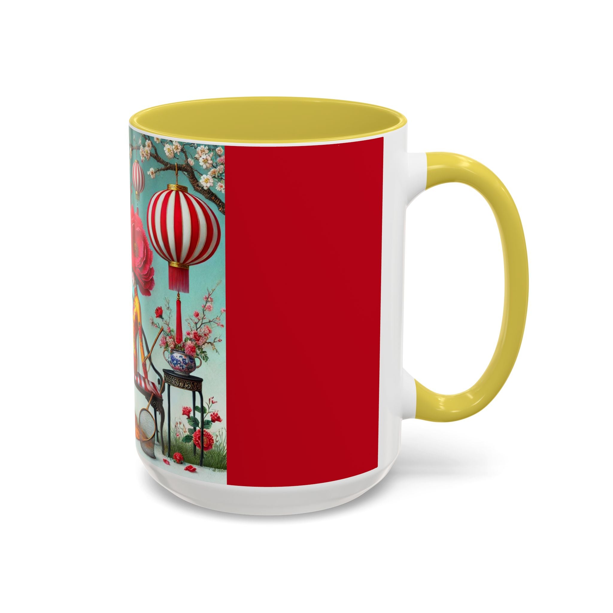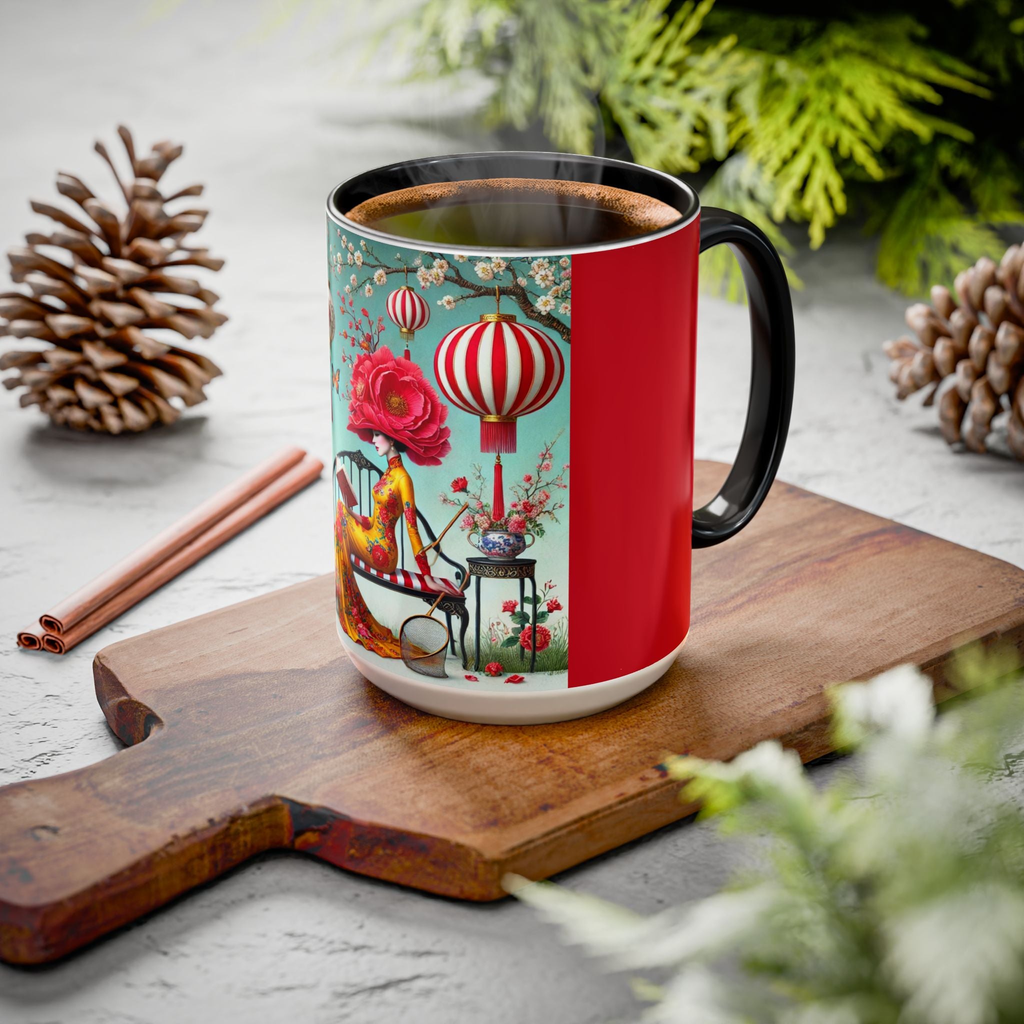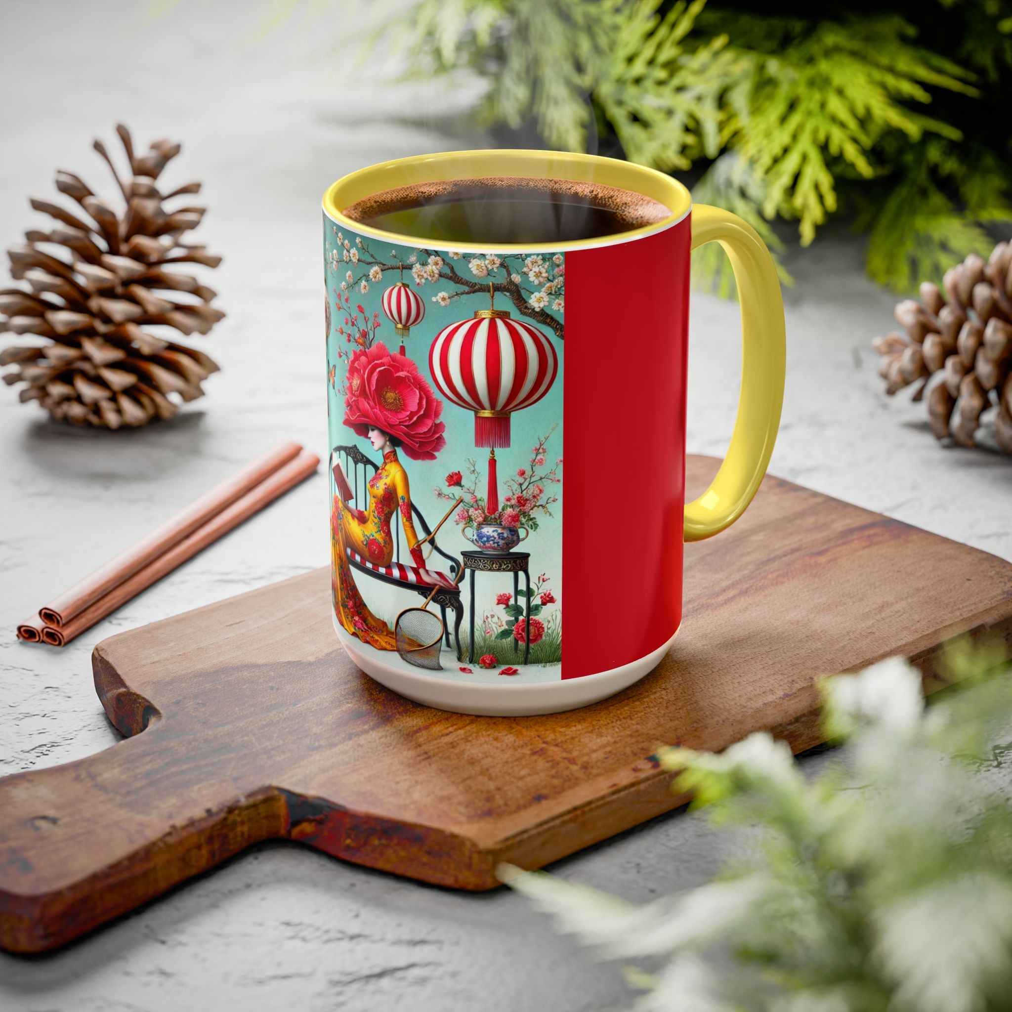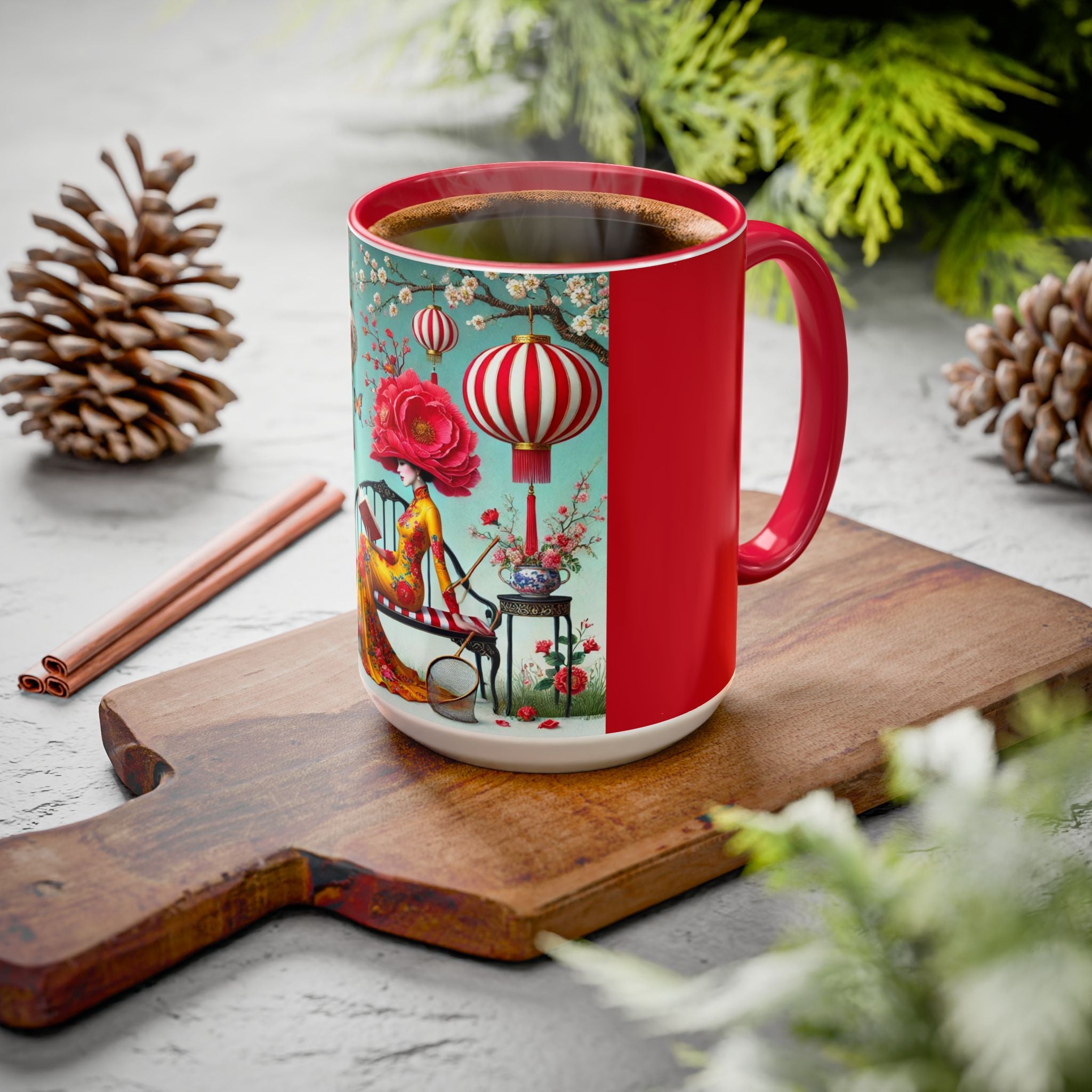 Reading in a Painted Garden turns every sip into a quiet, beautiful pause—featuring a graceful figure lost in a book beneath blooming branches, floating lanterns, and drifting butterflies. Turquoise skies, warm florals, and delicate gold-toned details create a serene, storybook atmosphere that feels curated and calm. With 12 accent colors to choose from and two generous sizes, this glossy ceramic mug is a cheerful everyday staple that also makes a thoughtful gift for readers, art lovers, and anyone who enjoys a peaceful moment.