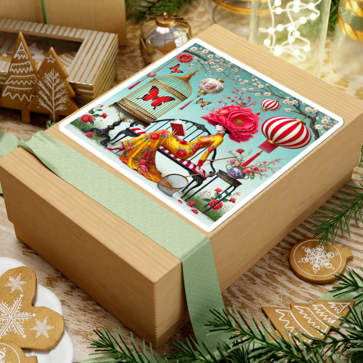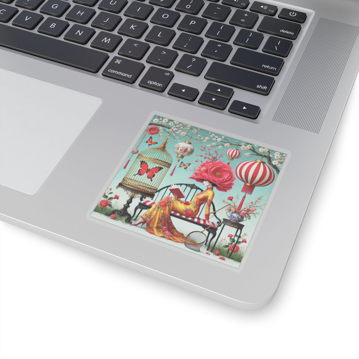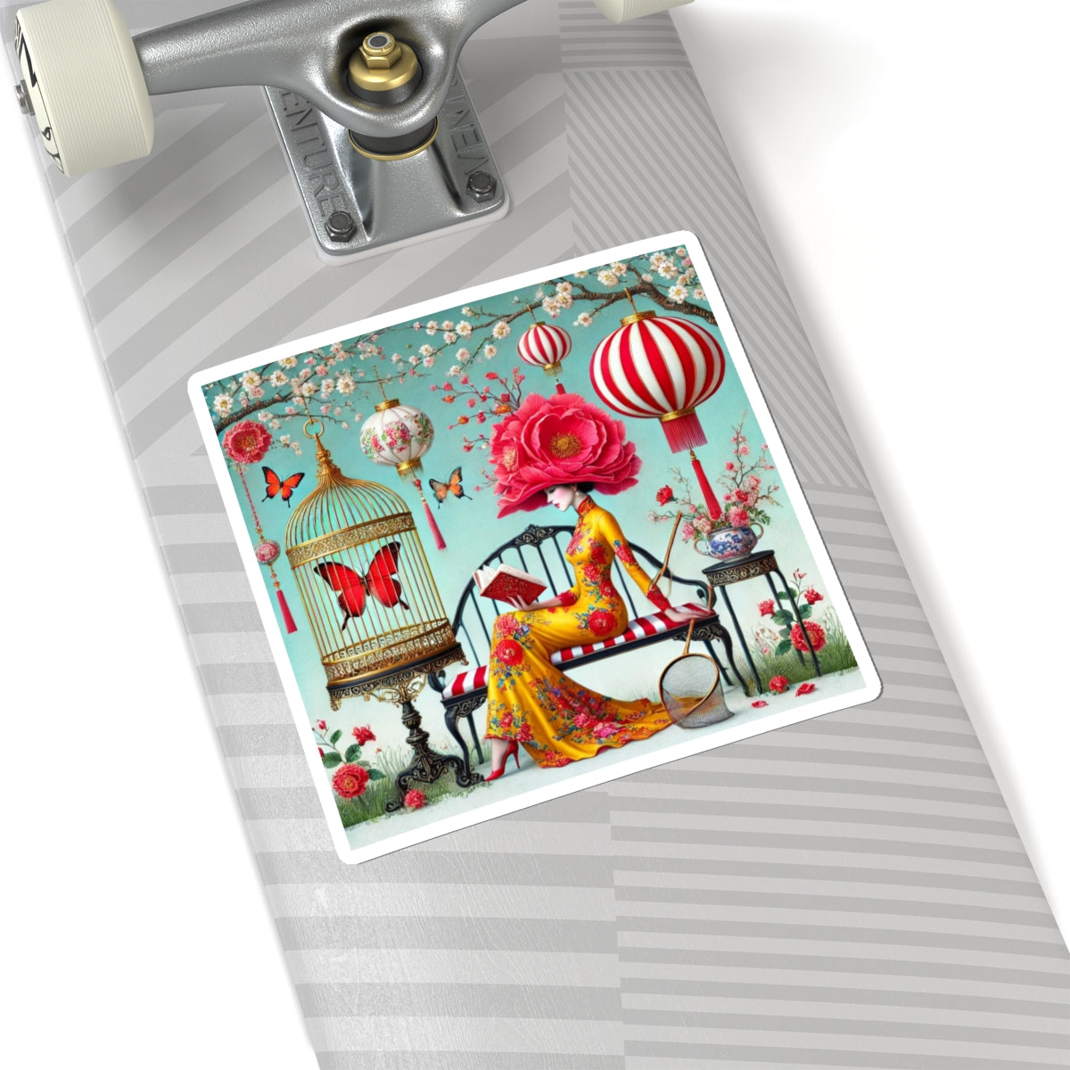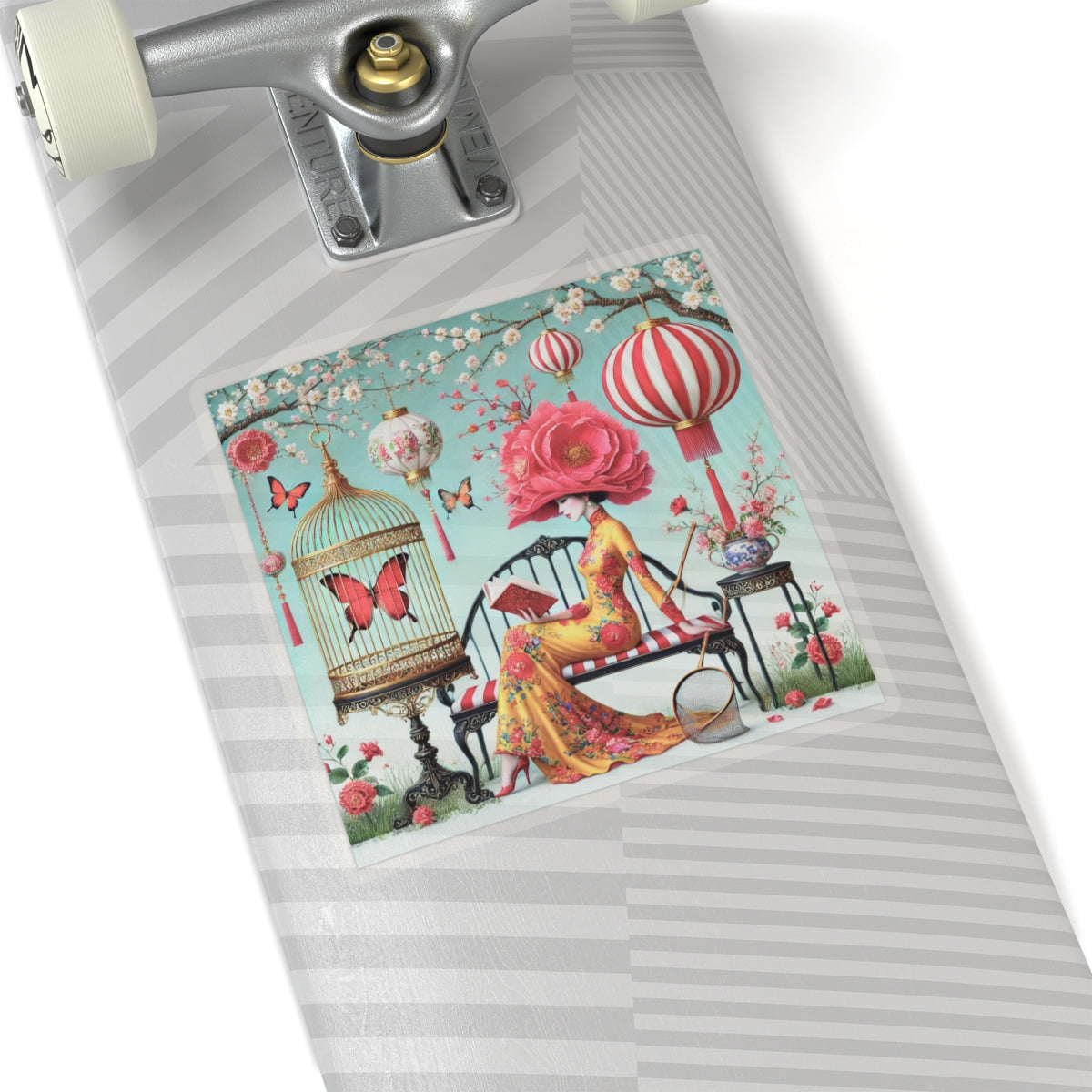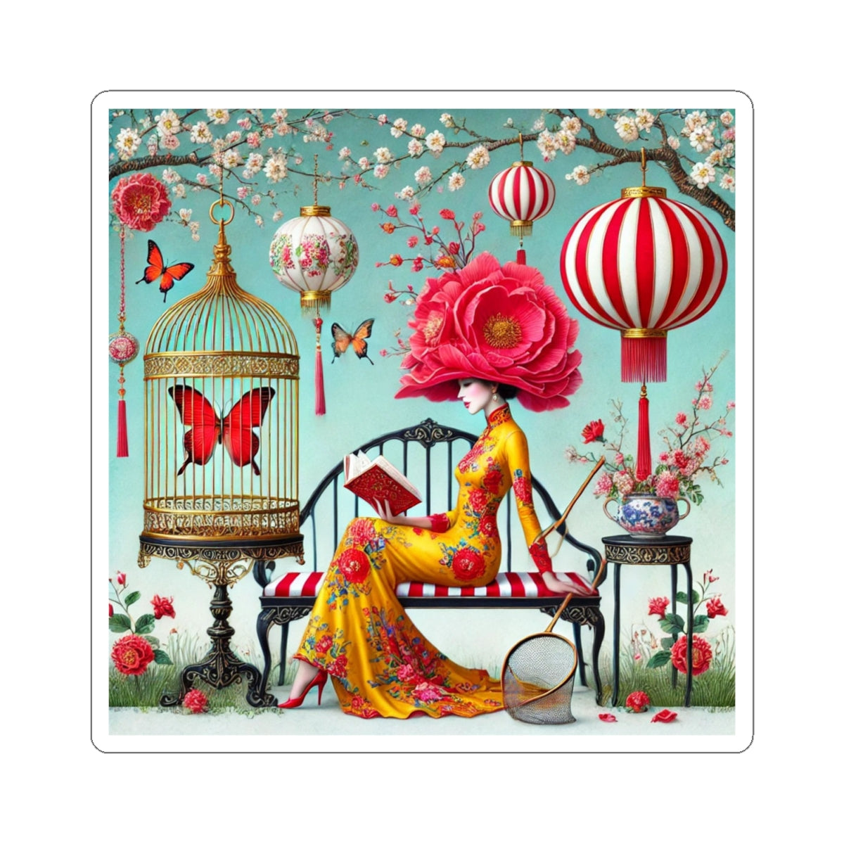 Reading In A Painted Garden Kiss-Cut Stickers bring a quiet moment of elegance and reflection to laptops, journals, water bottles for indoor use, and creative corners of your home. The artwork features a graceful figure absorbed in a book, surrounded by blooming branches, floating lanterns, and drifting butterflies. A refined palette of turquoise, warm florals, and soft gold accents creates a dreamlike setting that feels curated and calm, blending stillness with ornate detail and celebrating reading as a peaceful pause filled with beauty, imagination, and quiet focus.