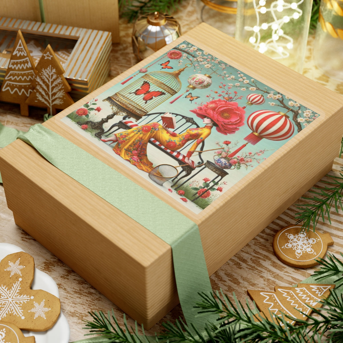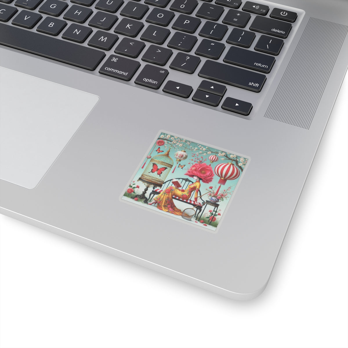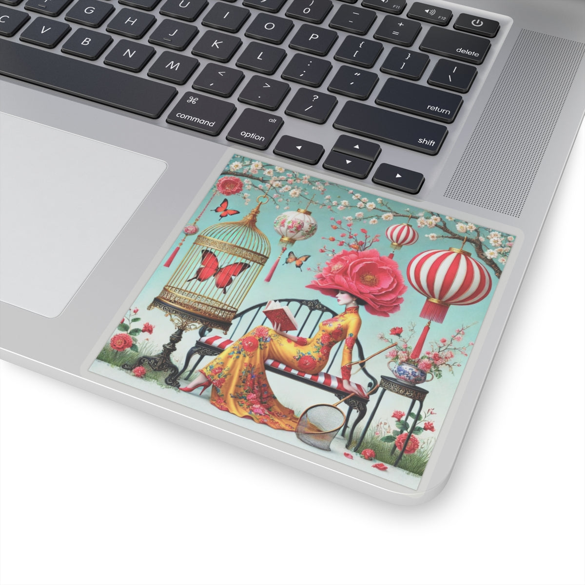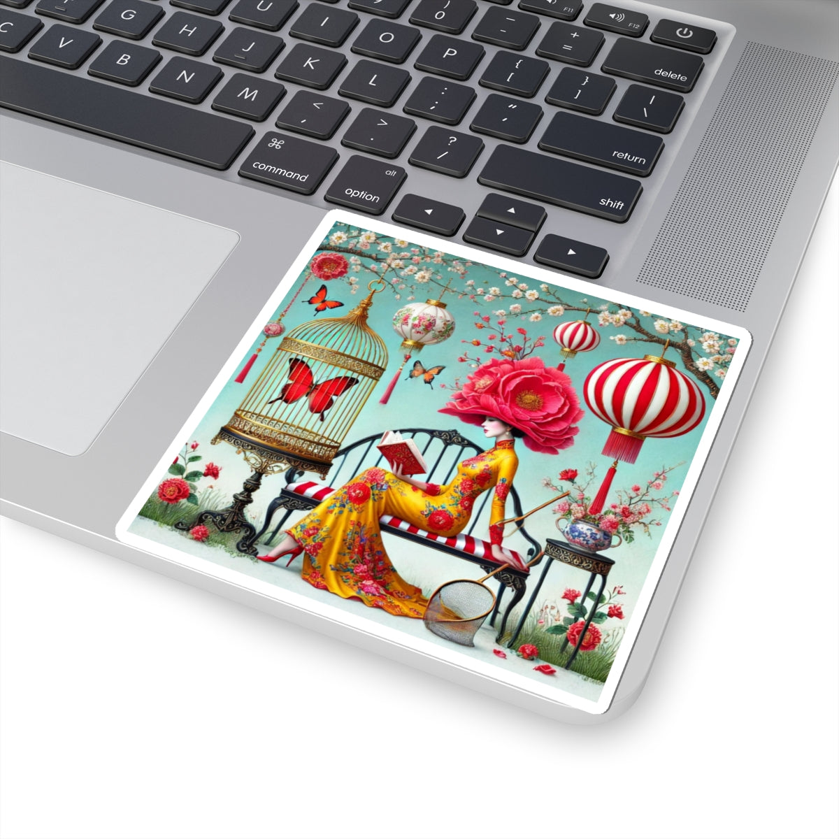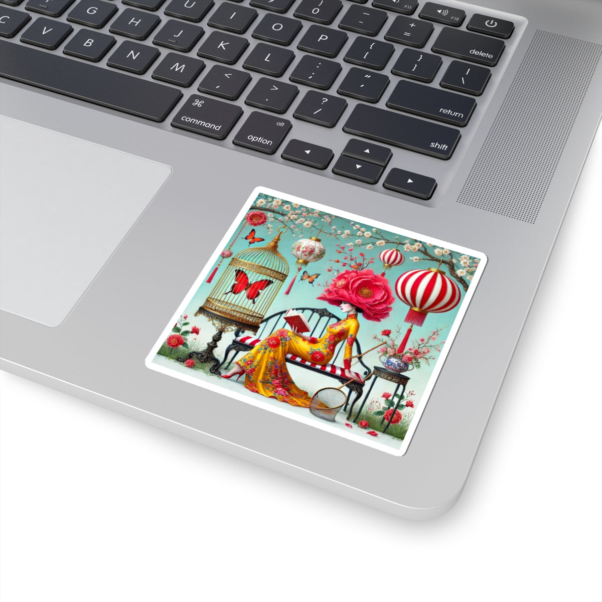 Reading In A Painted Garden Kiss-Cut Stickers bring a quiet moment of elegance and reflection to laptops, journals, water bottles for indoor use, and creative corners of your home. The artwork features a graceful figure absorbed in a book, surrounded by blooming branches, floating lanterns, and drifting butterflies. A refined palette of turquoise, warm florals, and soft gold accents creates a dreamlike setting that feels curated and calm, blending stillness with ornate detail and celebrating reading as a peaceful pause filled with beauty, imagination, and quiet focus.