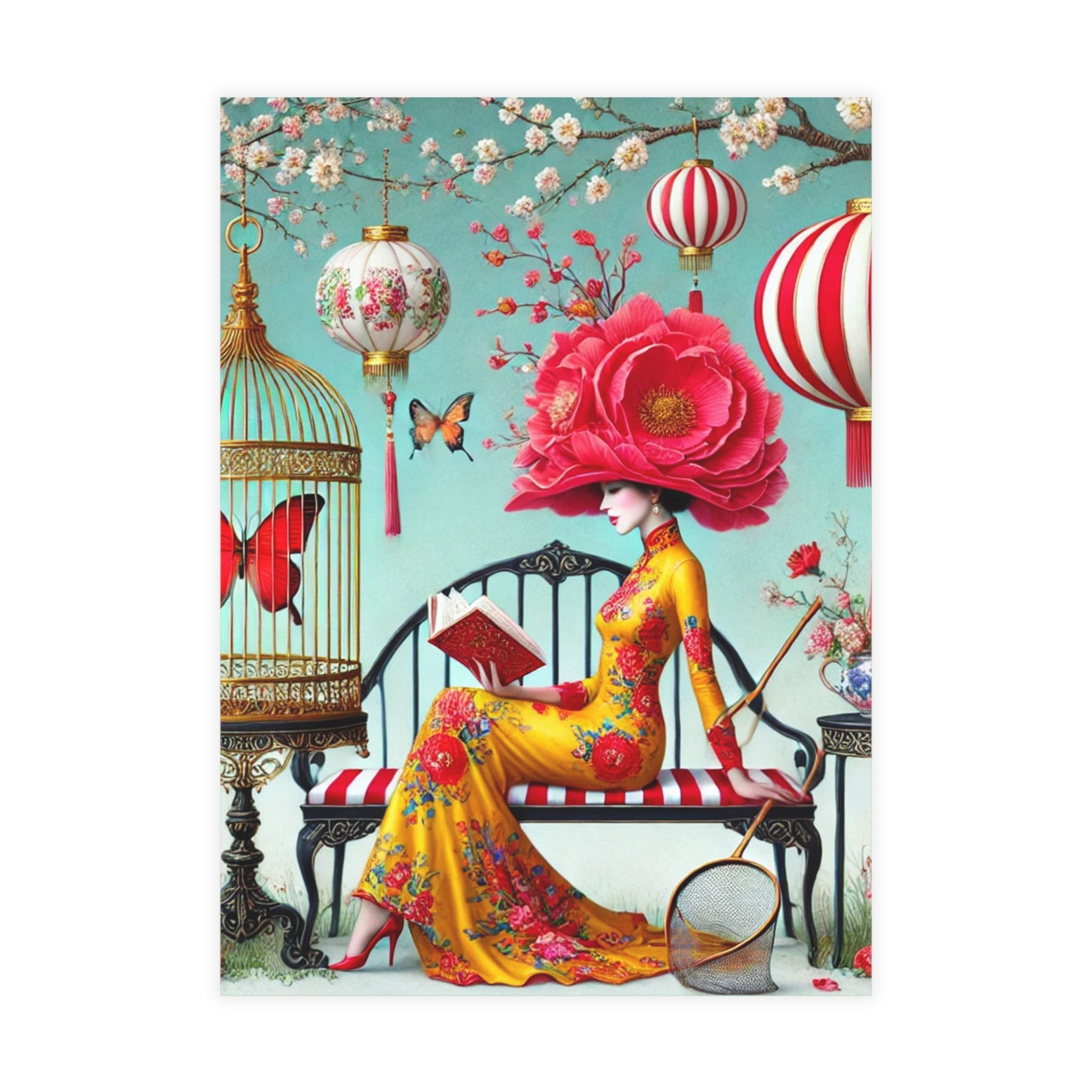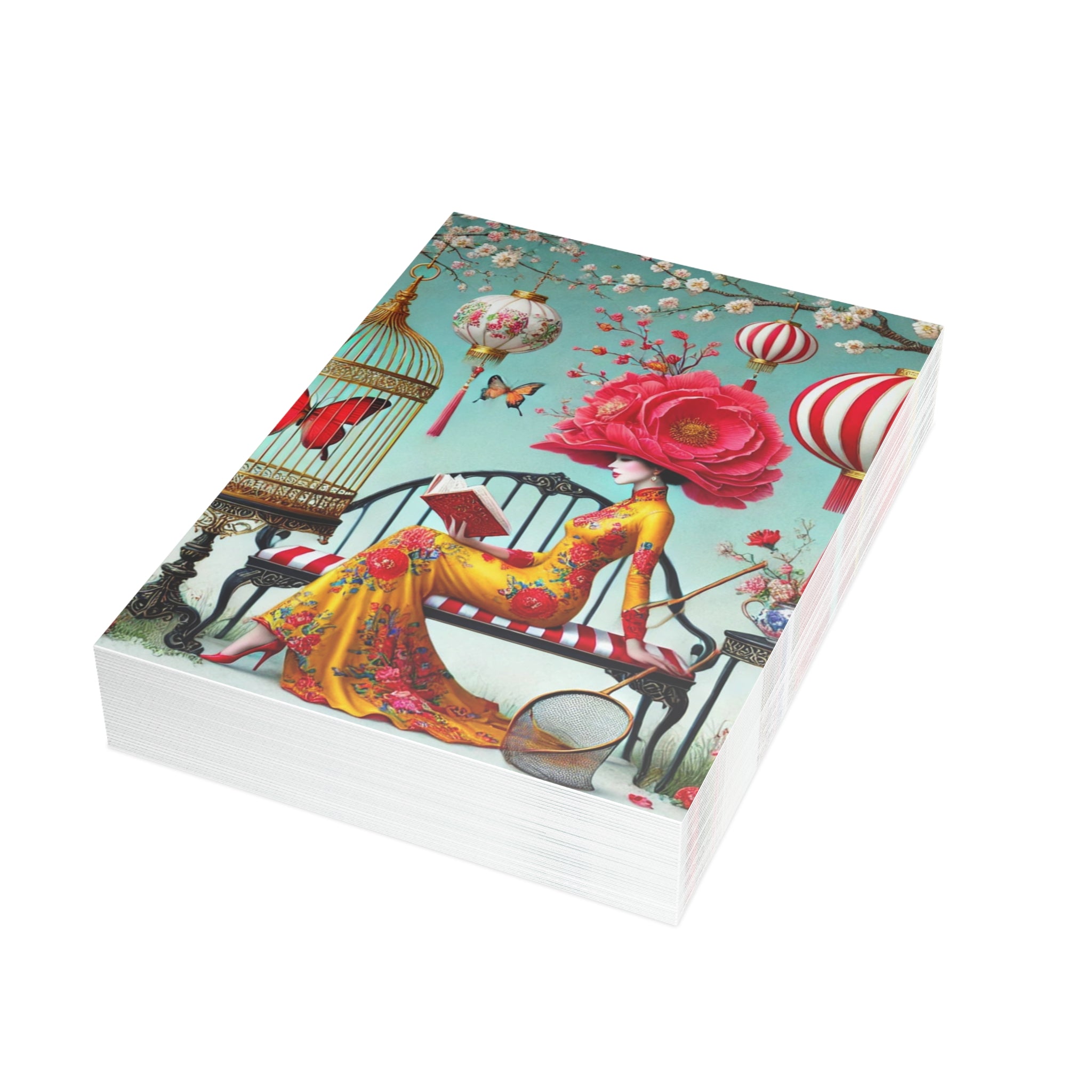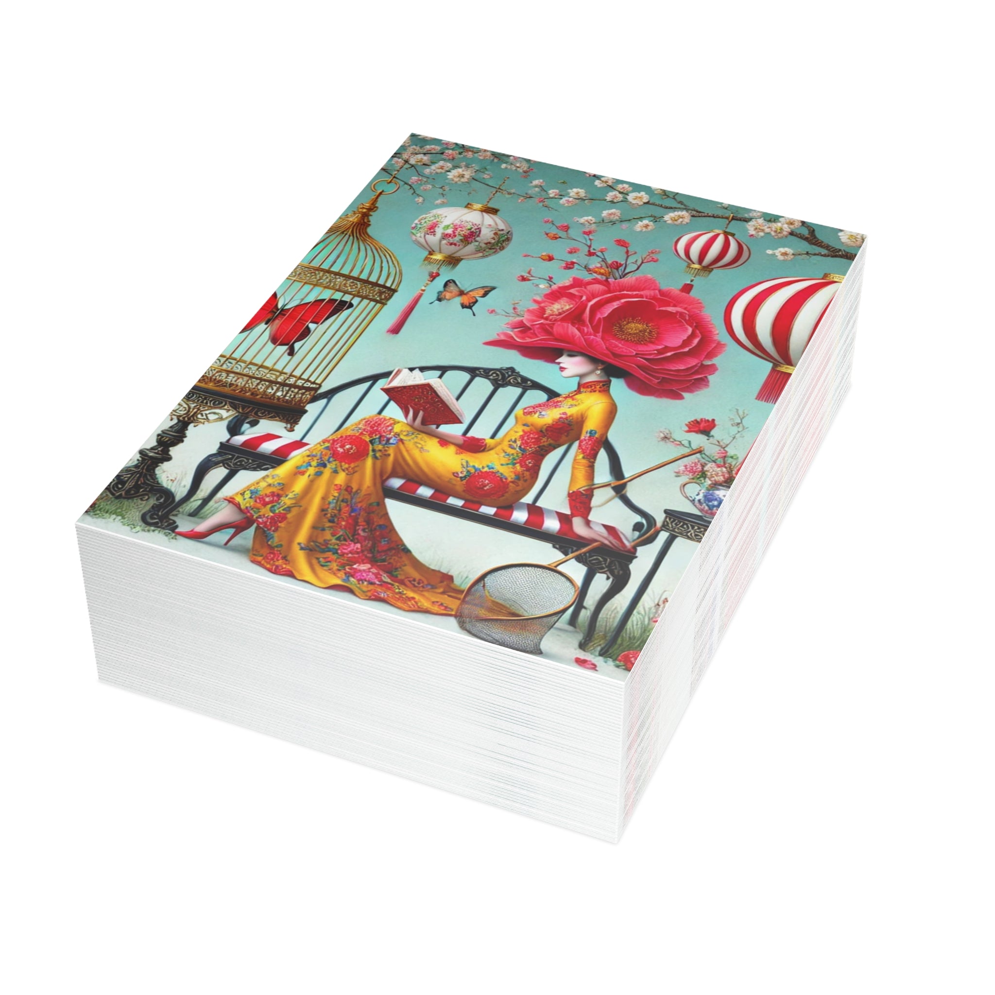 Reading In A Painted Garden Postcard Bundles let you share a quiet moment of elegance and reflection through the mail, turning simple notes into small works of art. The scene features a graceful figure absorbed in a book, surrounded by blooming branches, floating lanterns, and drifting butterflies. A refined palette of turquoise, warm florals, and soft gold accents creates a dreamlike setting that feels curated and calm, blending stillness with ornate detail and celebrating reading as a peaceful pause filled with beauty, imagination, and quiet focus.