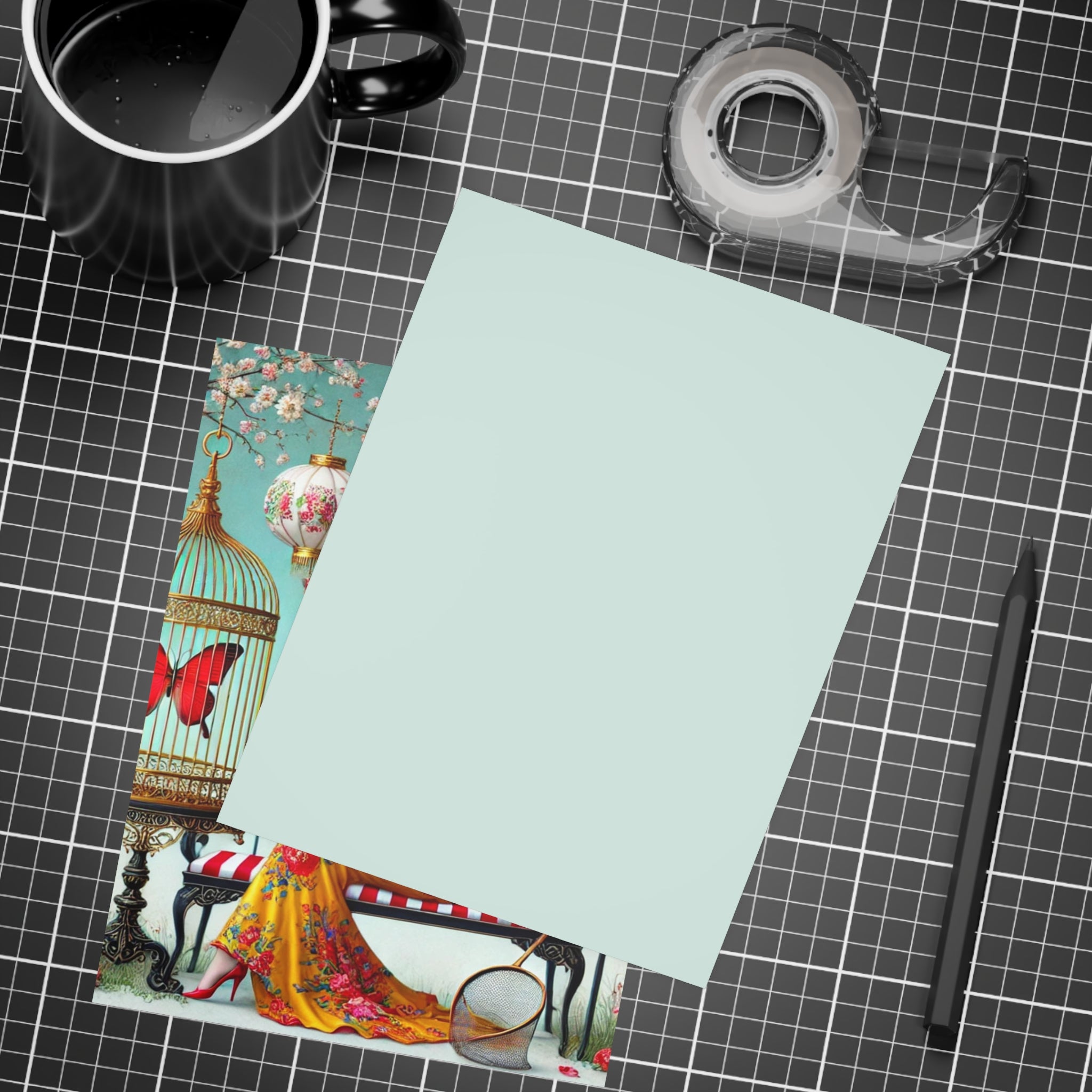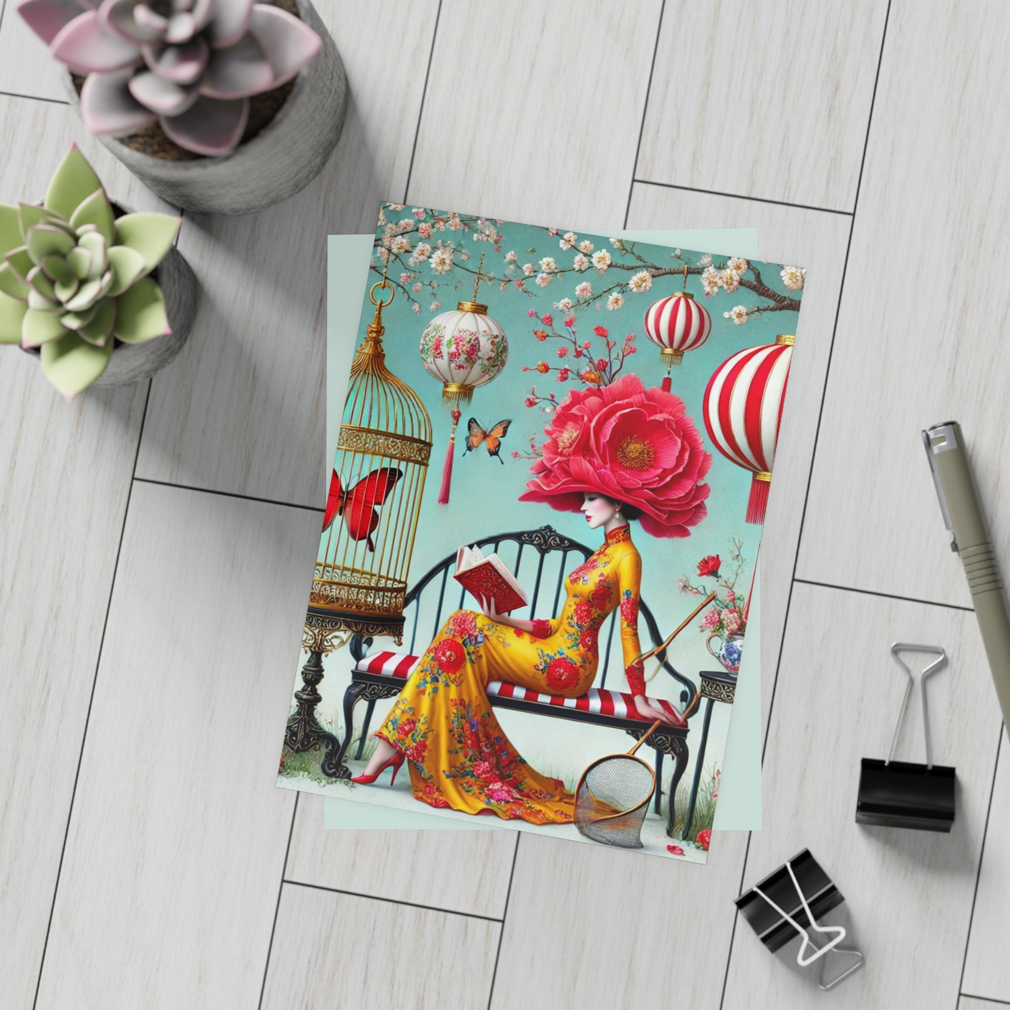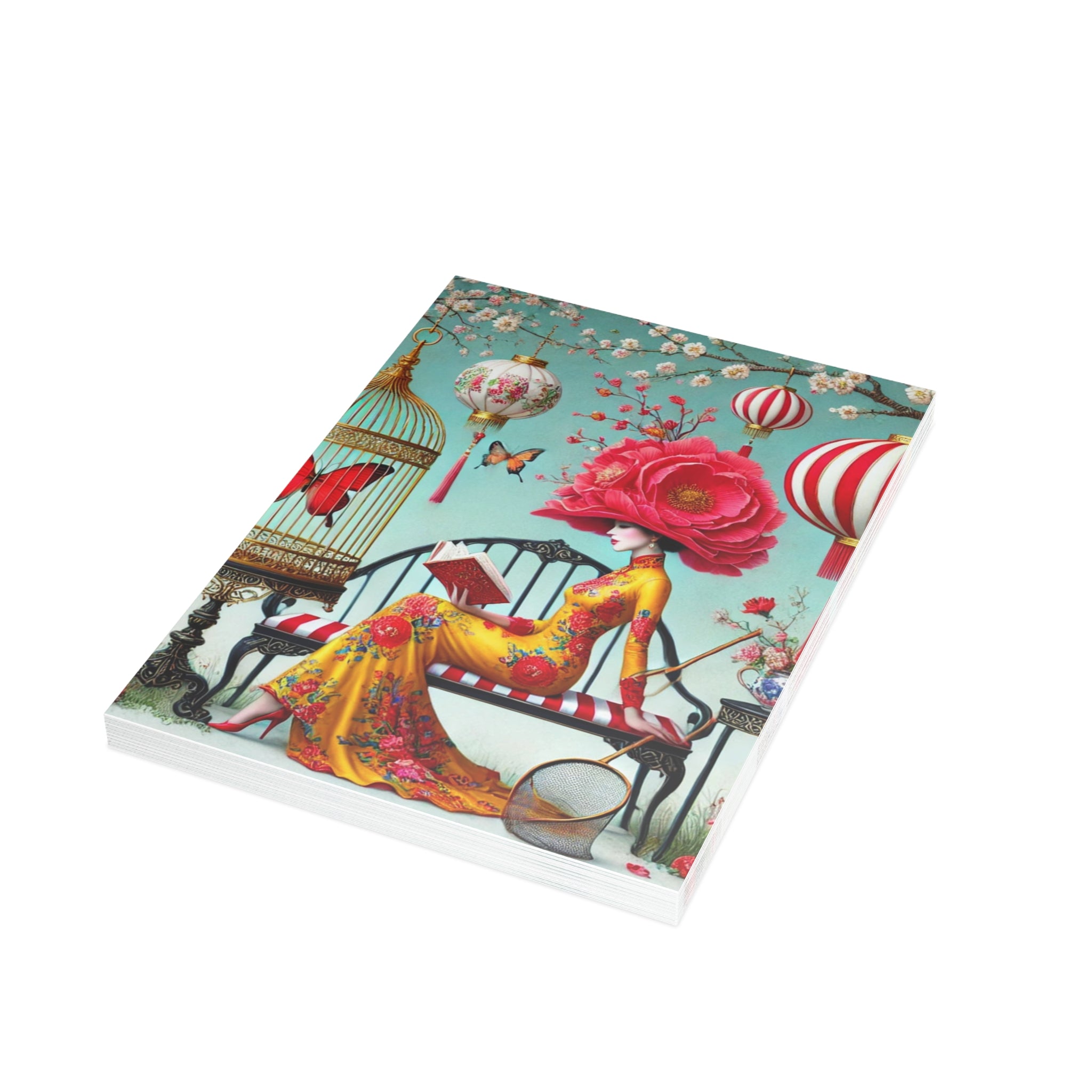 Reading In A Painted Garden Postcard Bundles let you share a quiet moment of elegance and reflection through the mail, turning simple notes into small works of art. The scene features a graceful figure absorbed in a book, surrounded by blooming branches, floating lanterns, and drifting butterflies. A refined palette of turquoise, warm florals, and soft gold accents creates a dreamlike setting that feels curated and calm, blending stillness with ornate detail and celebrating reading as a peaceful pause filled with beauty, imagination, and quiet focus.