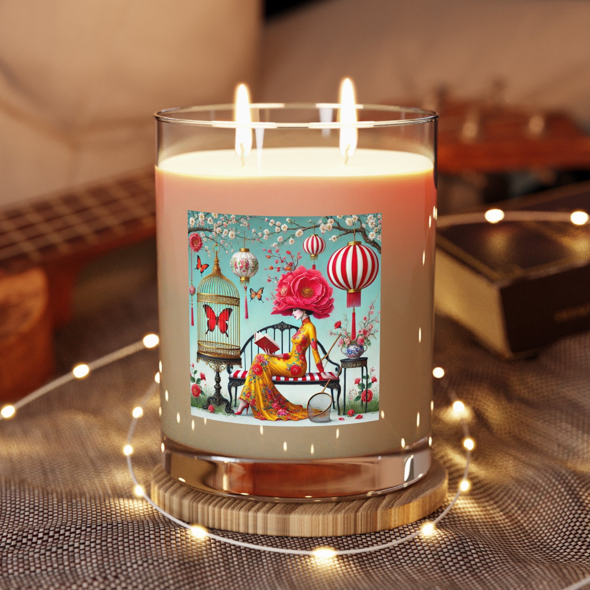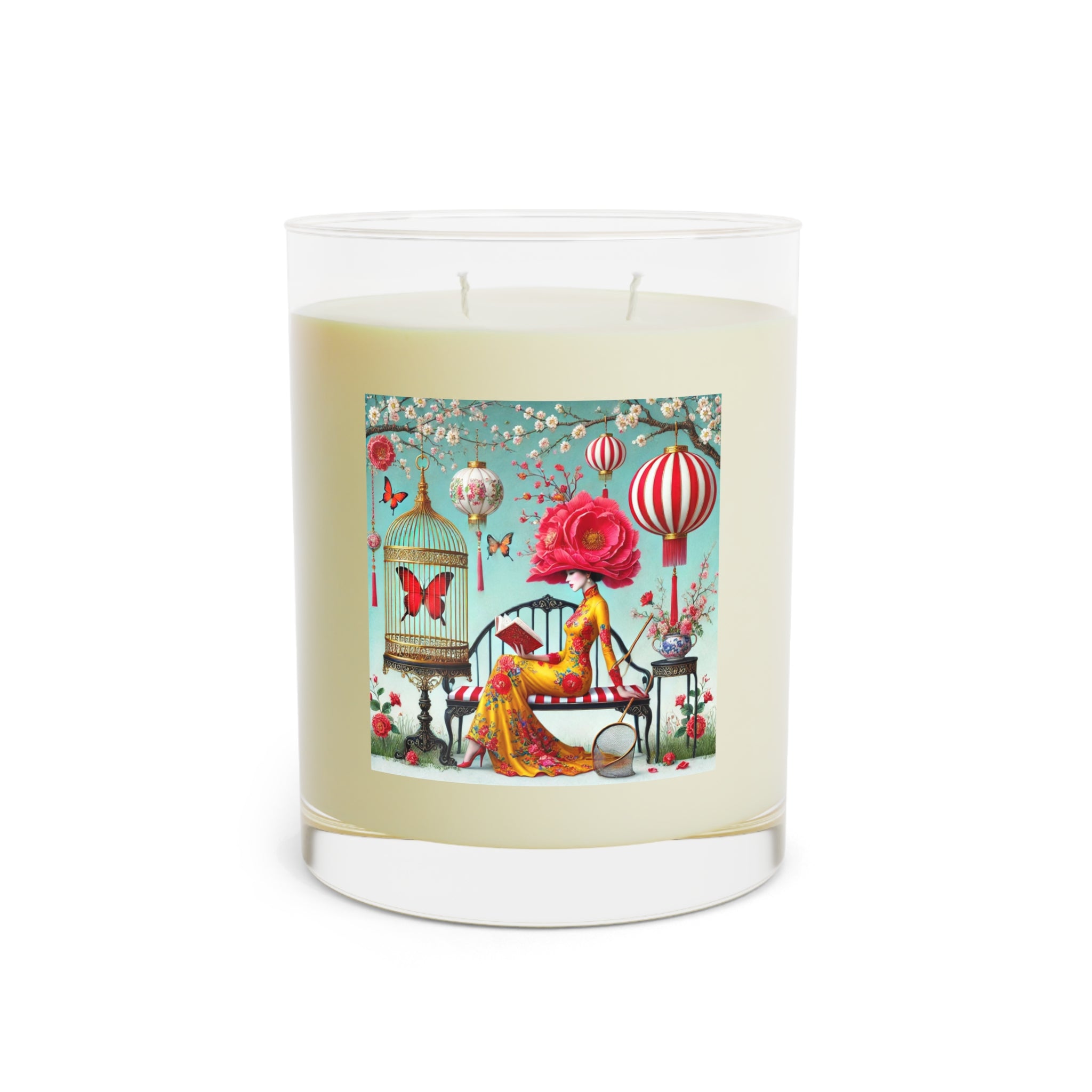 Reading In A Painted Garden Scented Candle opens like a quiet chapter, inviting you to breathe in, breathe out, and settle into a moment where fragrance and art gently unfold together. The artwork captures a serene scene of elegance and reflection: a graceful figure sits absorbed in a book, surrounded by blooming branches, softly glowing lanterns, and drifting butterflies. A refined palette of turquoise, warm florals, and subtle gold accents creates a dreamlike garden that feels curated, calm, and intimate—celebrating reading as a peaceful pause filled with imagination and stillness.