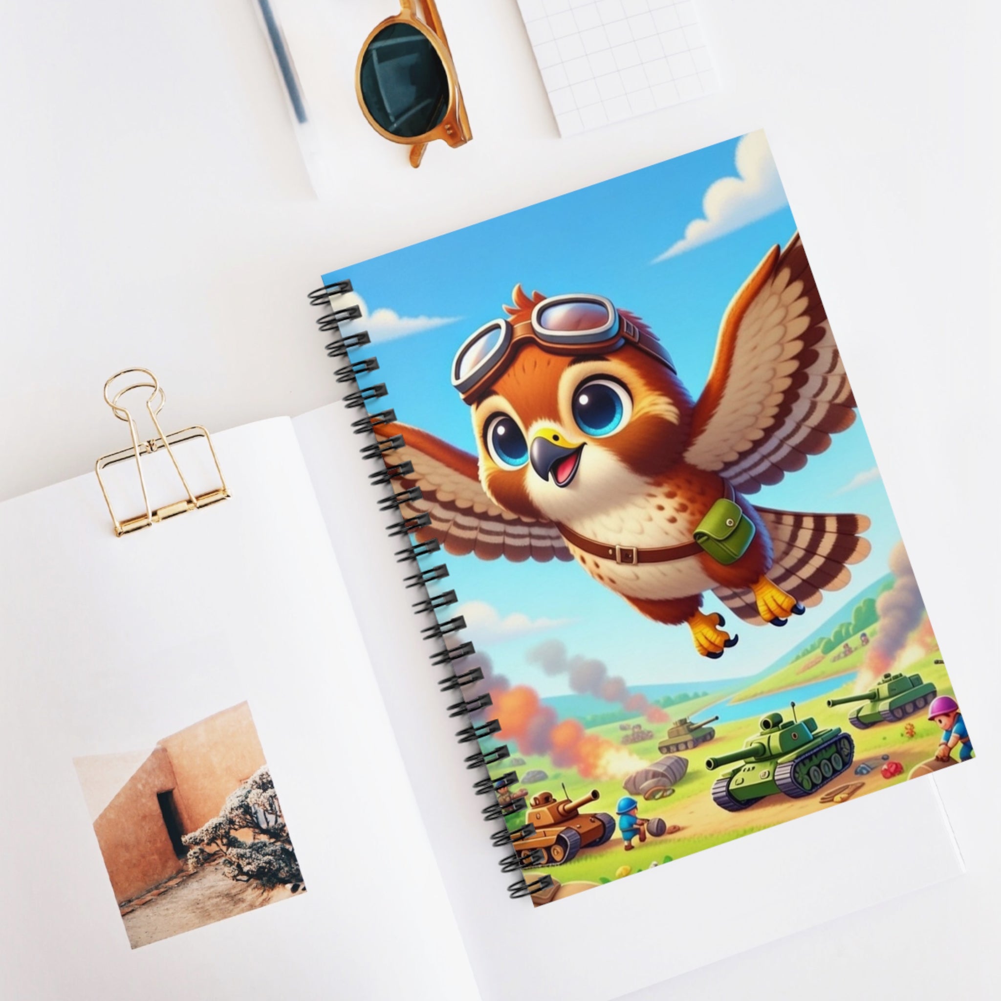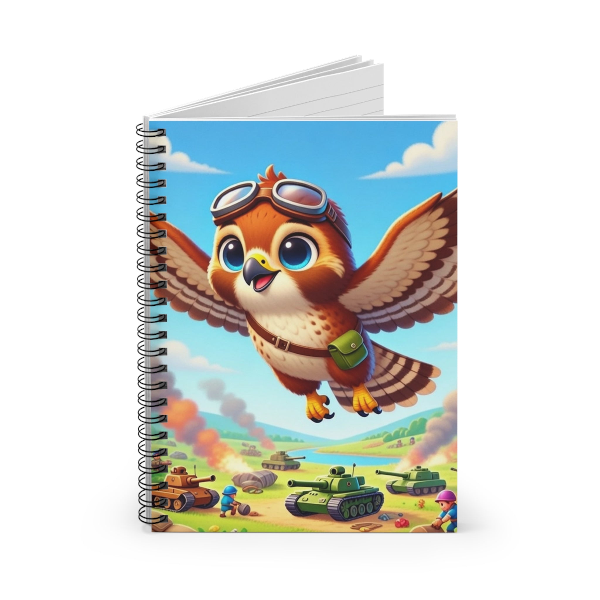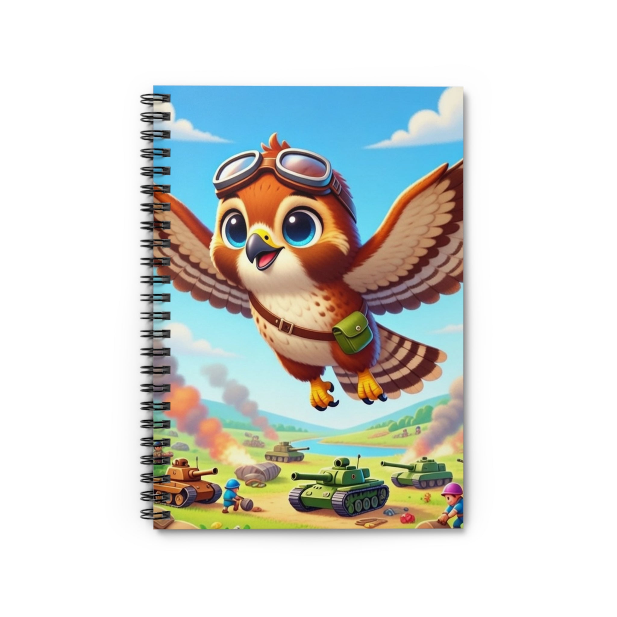 Red-Tailed Hawk in Battle Spiral Notebook features a red-tailed hawk depicted mid-flight with wings extended, wearing aviator goggles and a small pack. The character is set against an illustrated landscape that includes rolling terrain, trees, clouds, and ground-level activity, rendered in a bright, cartoon-style illustration with clear detail and strong color contrast. Shopping lists, school notes, or poems—this 118-page spiral notebook with ruled line paper is a perfect companion in everyday life, and the durable printed cover makes the owner proud to carry it everywhere.