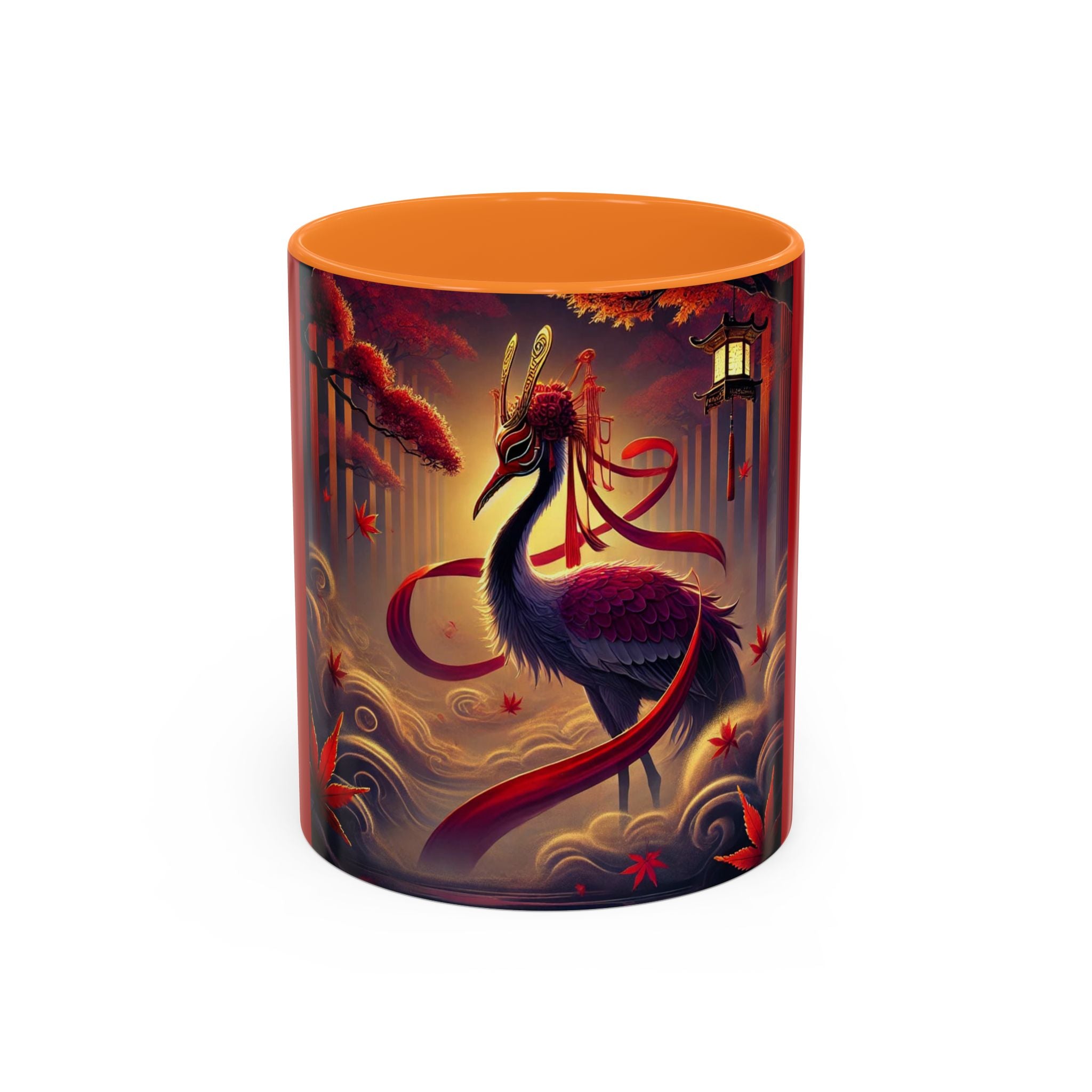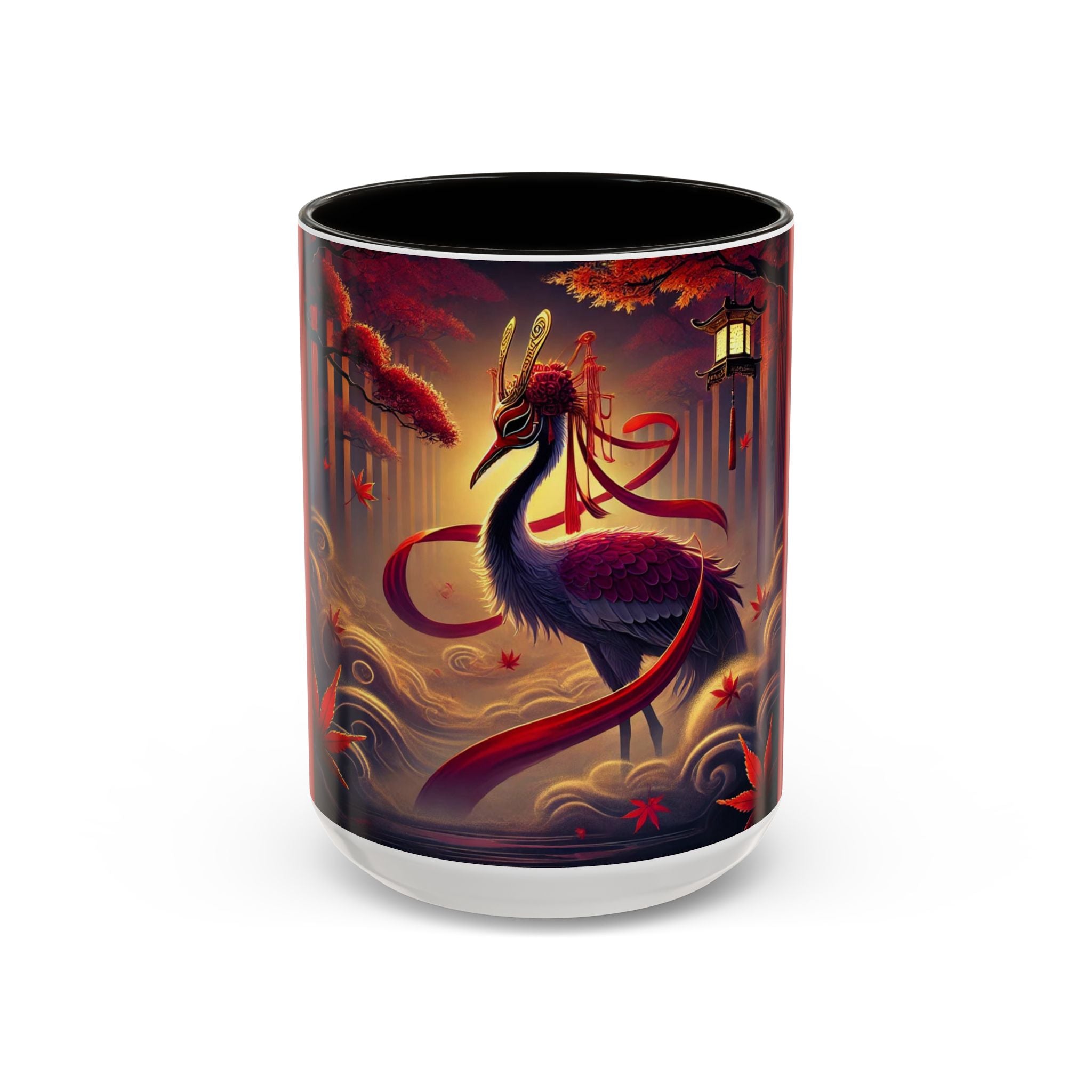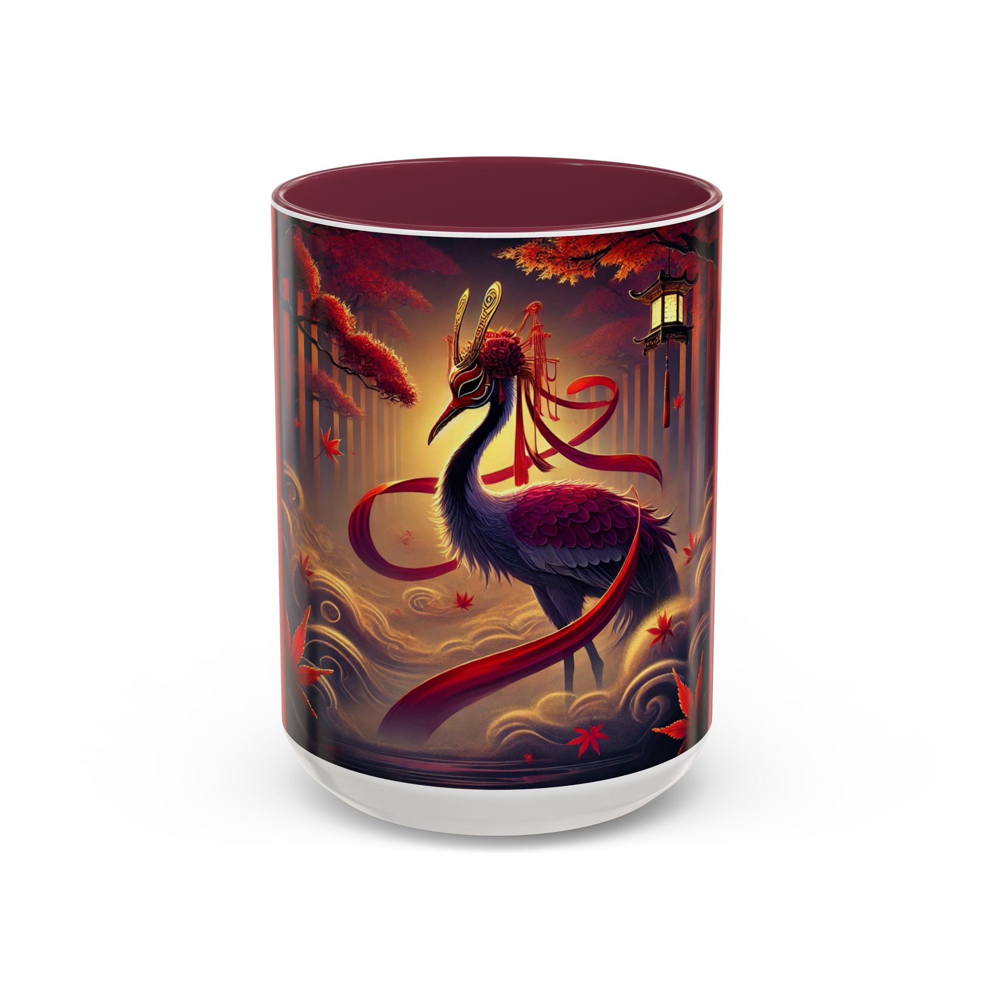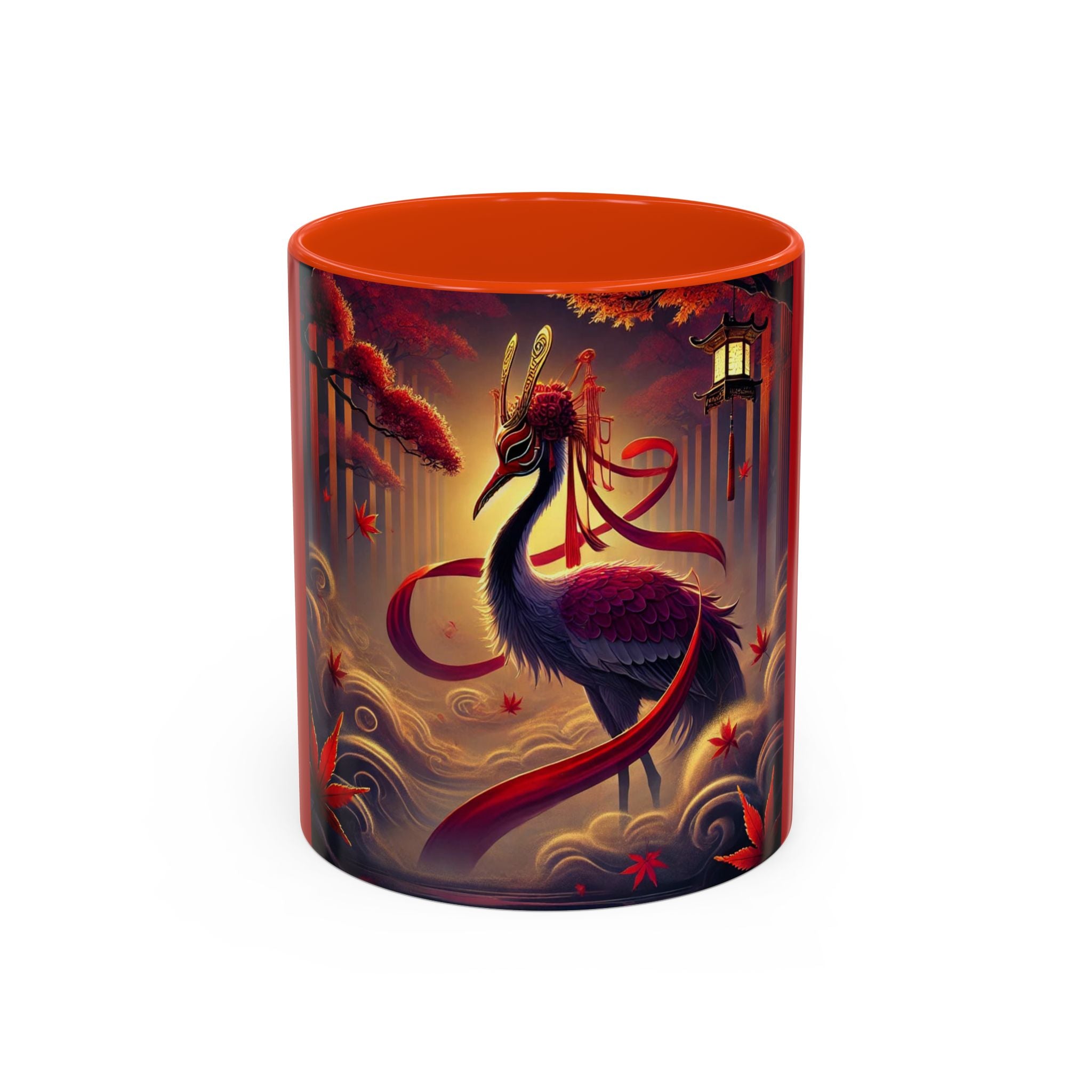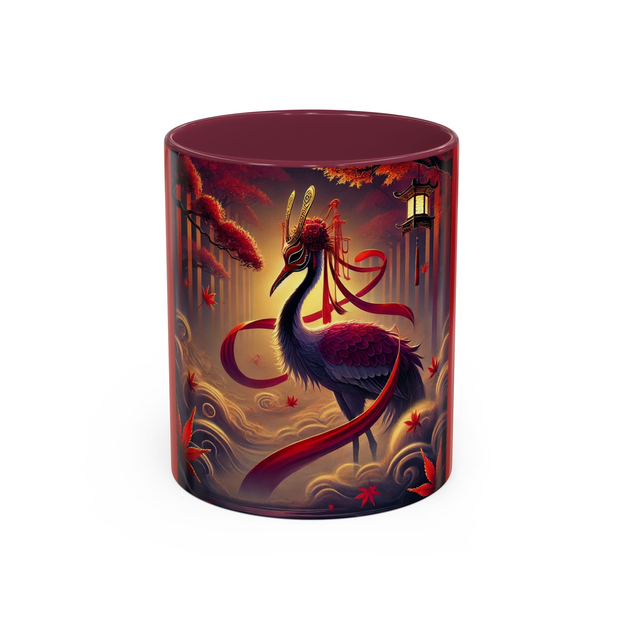 Sip your favorite drink in style with these ceramic mugs that blend function and artistry. Available in 11oz and 15oz sizes, each mug comes with a colored handle and interior in 12 vibrant options, while the glossy finish enhances the high-fidelity print. Wrapped around the surface is the Regal Crimson Crane in the Autumn Mist artwork—a kabuki-inspired Halloween portrait featuring a crimson-feathered crane standing gracefully in drifting autumn mist, adorned in traditional Japanese attire with harvest motifs. The haunting yet refined design transforms this everyday kitchen staple into a functional piece of seasonal art, perfect for coffee, tea, or gifting during the autumn months.