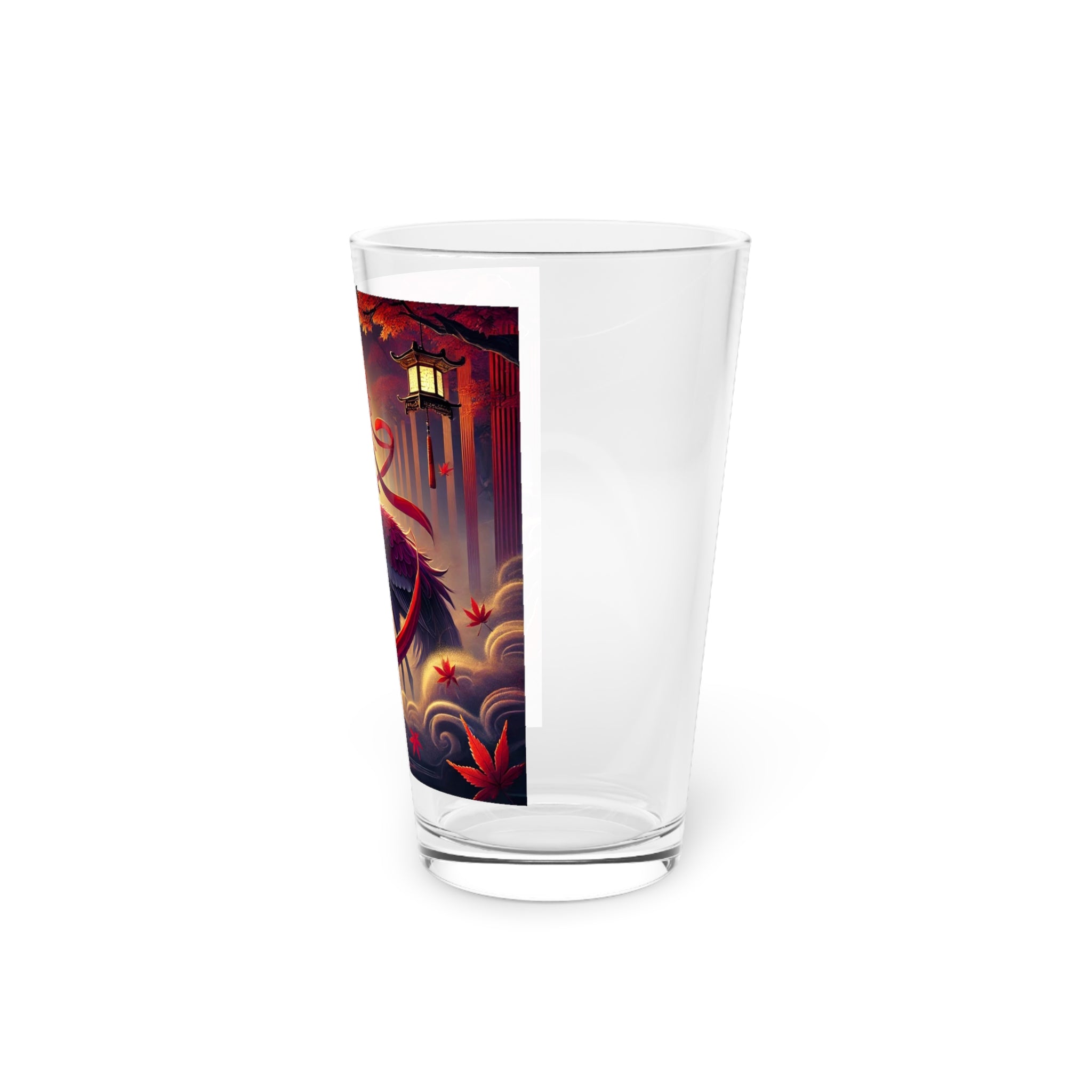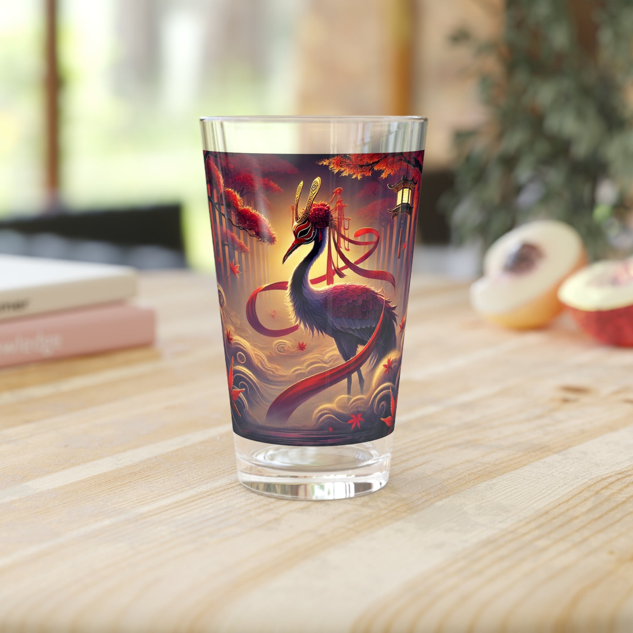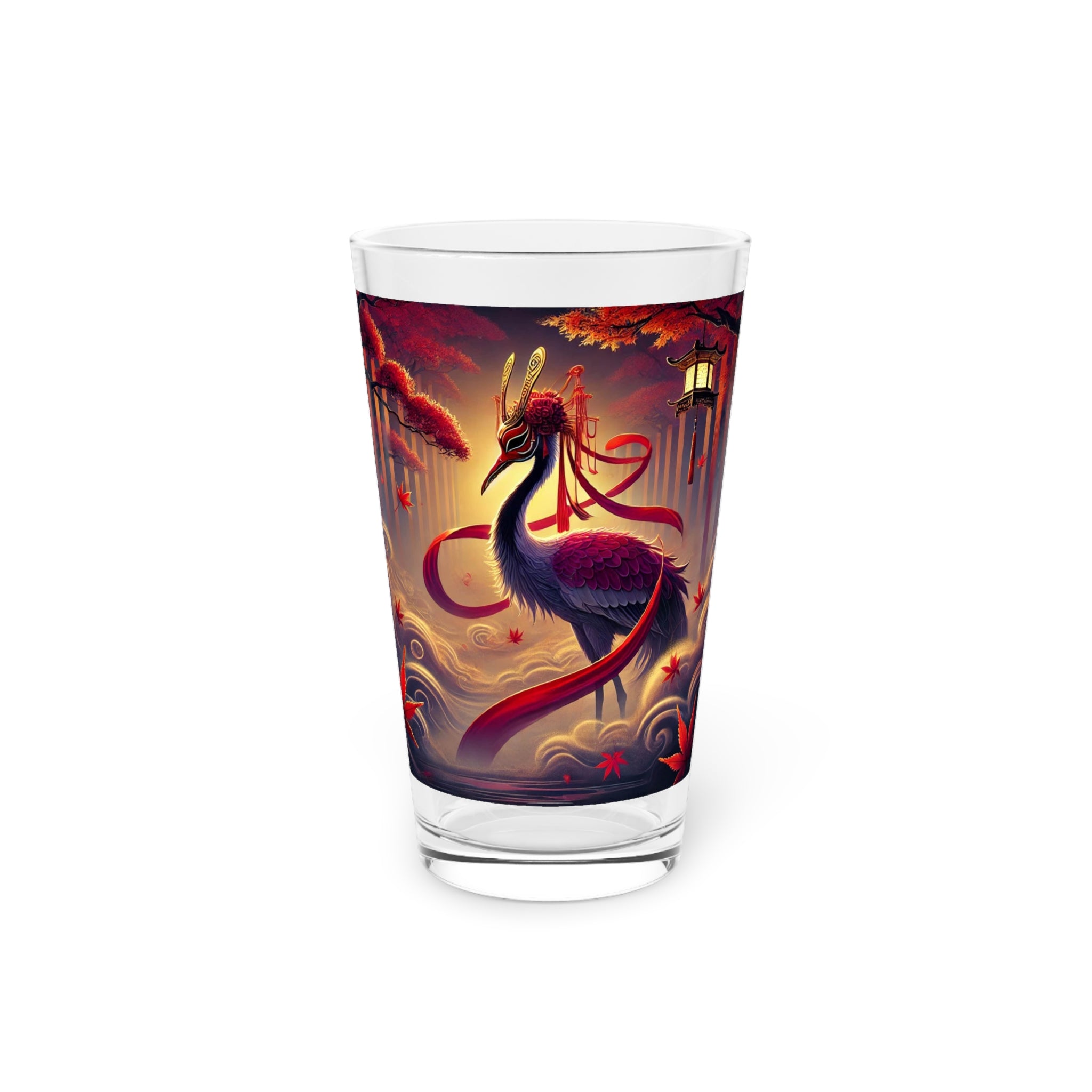 This 16oz pint glass combines everyday practicality with haunting seasonal artistry. Its long, transparent design is perfect for water, cocktails, or craft beer, while the custom print brings the drama of kabuki theater into your kitchen. The featured artwork shows a regal crimson-feathered crane standing in autumn mist, adorned in flowing Japanese robes patterned with harvest motifs. Elegant yet mysterious, the imagery captures the quiet magic of Halloween, making this glass as much a conversation piece as it is a functional essential.
