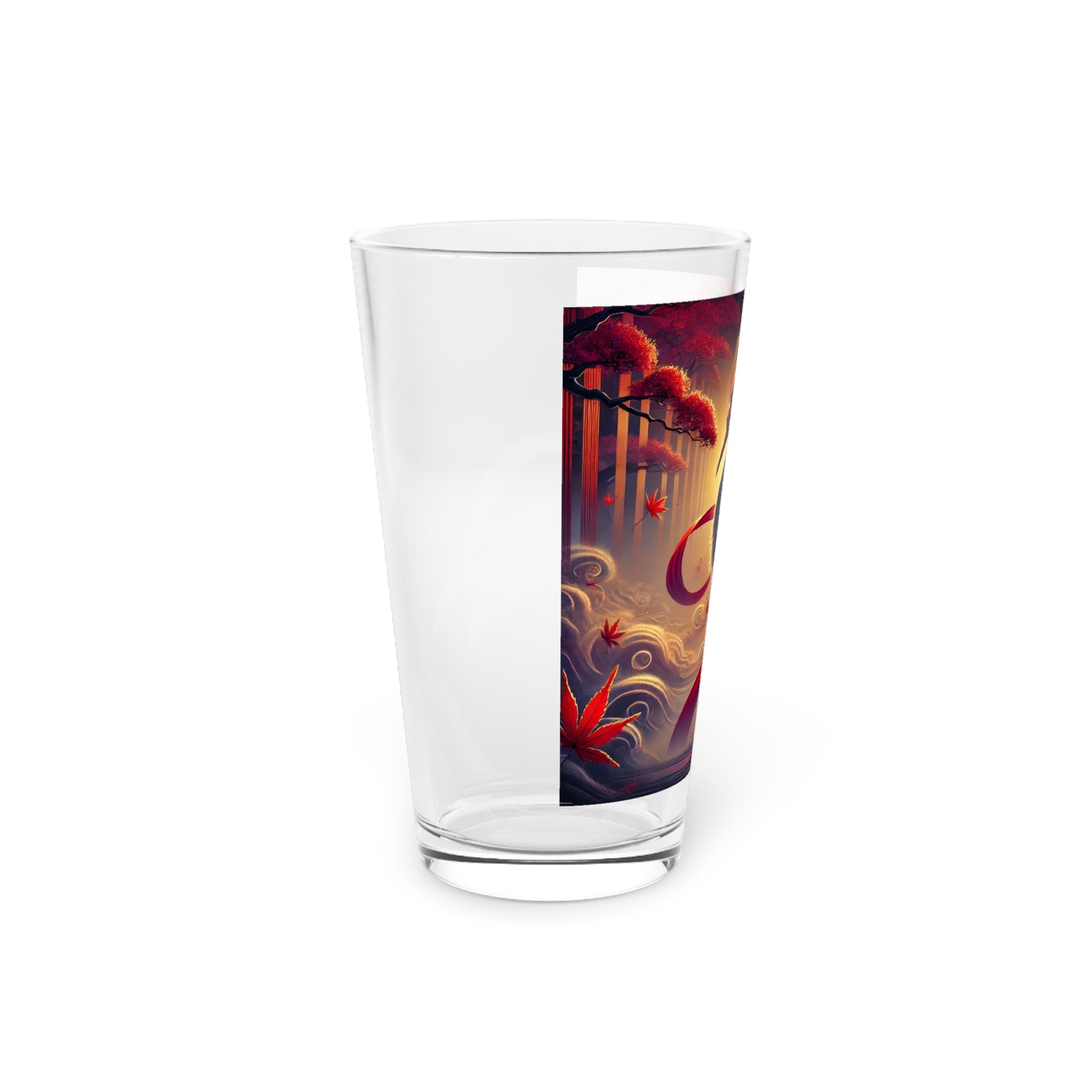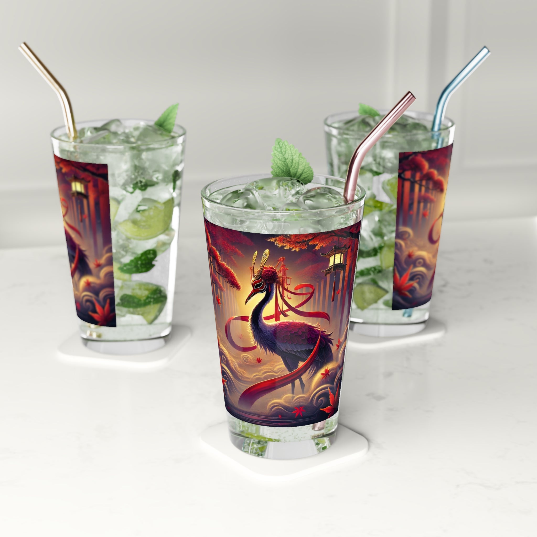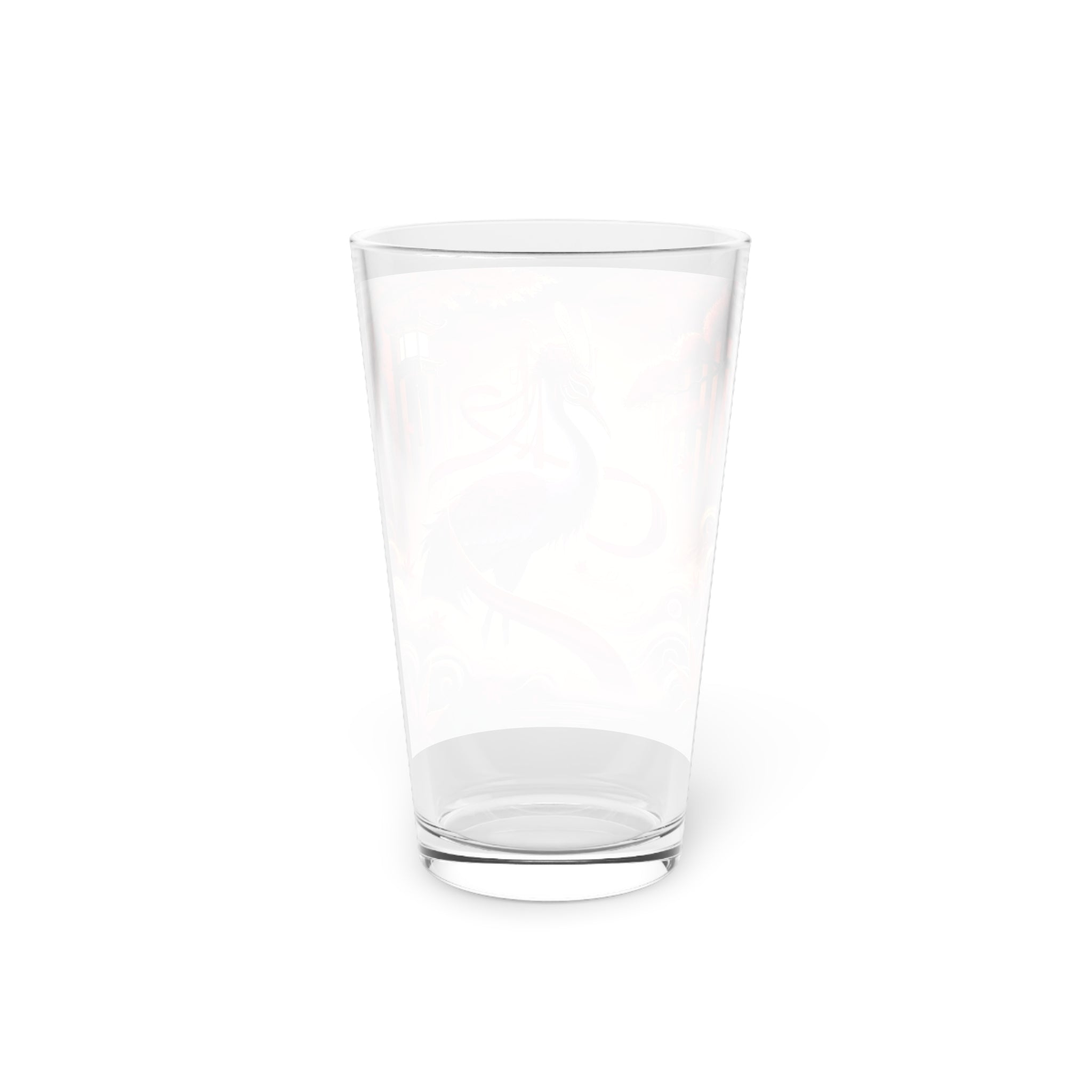 This 16oz pint glass combines everyday practicality with haunting seasonal artistry. Its long, transparent design is perfect for water, cocktails, or craft beer, while the custom print brings the drama of kabuki theater into your kitchen. The featured artwork shows a regal crimson-feathered crane standing in autumn mist, adorned in flowing Japanese robes patterned with harvest motifs. Elegant yet mysterious, the imagery captures the quiet magic of Halloween, making this glass as much a conversation piece as it is a functional essential.