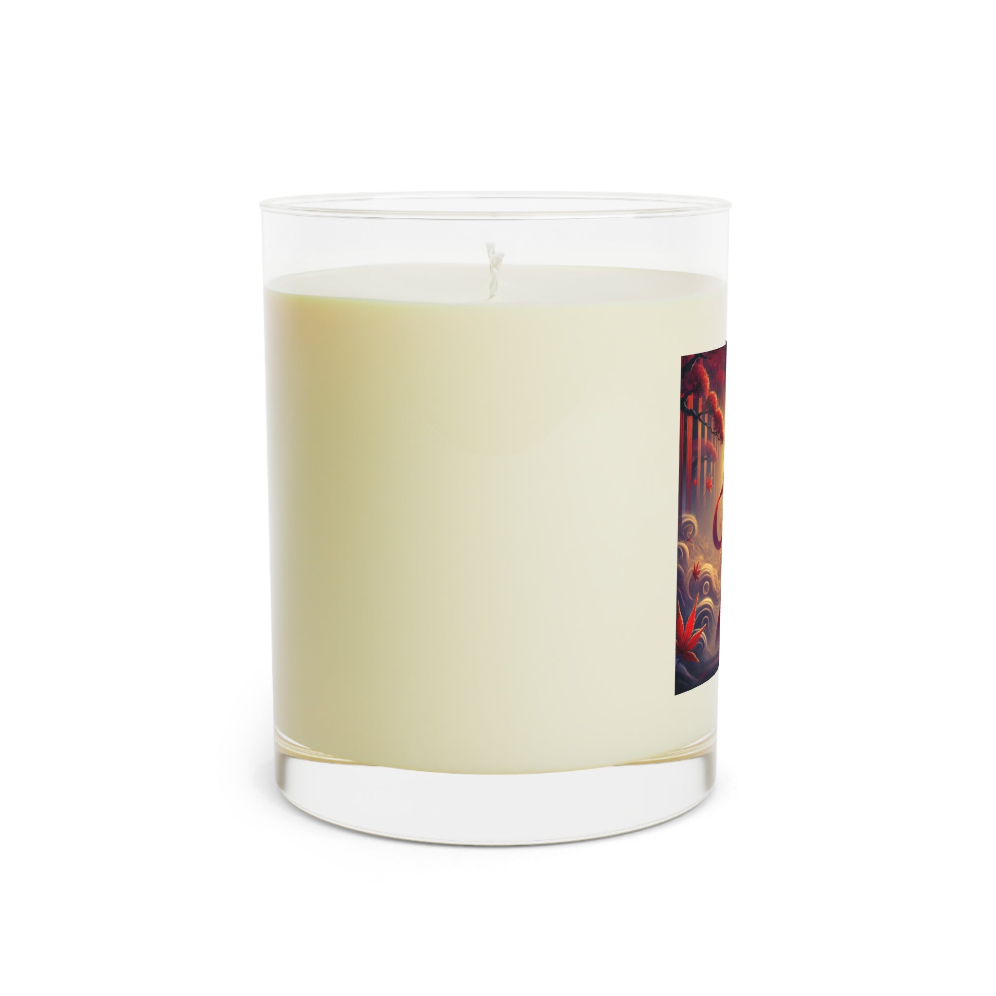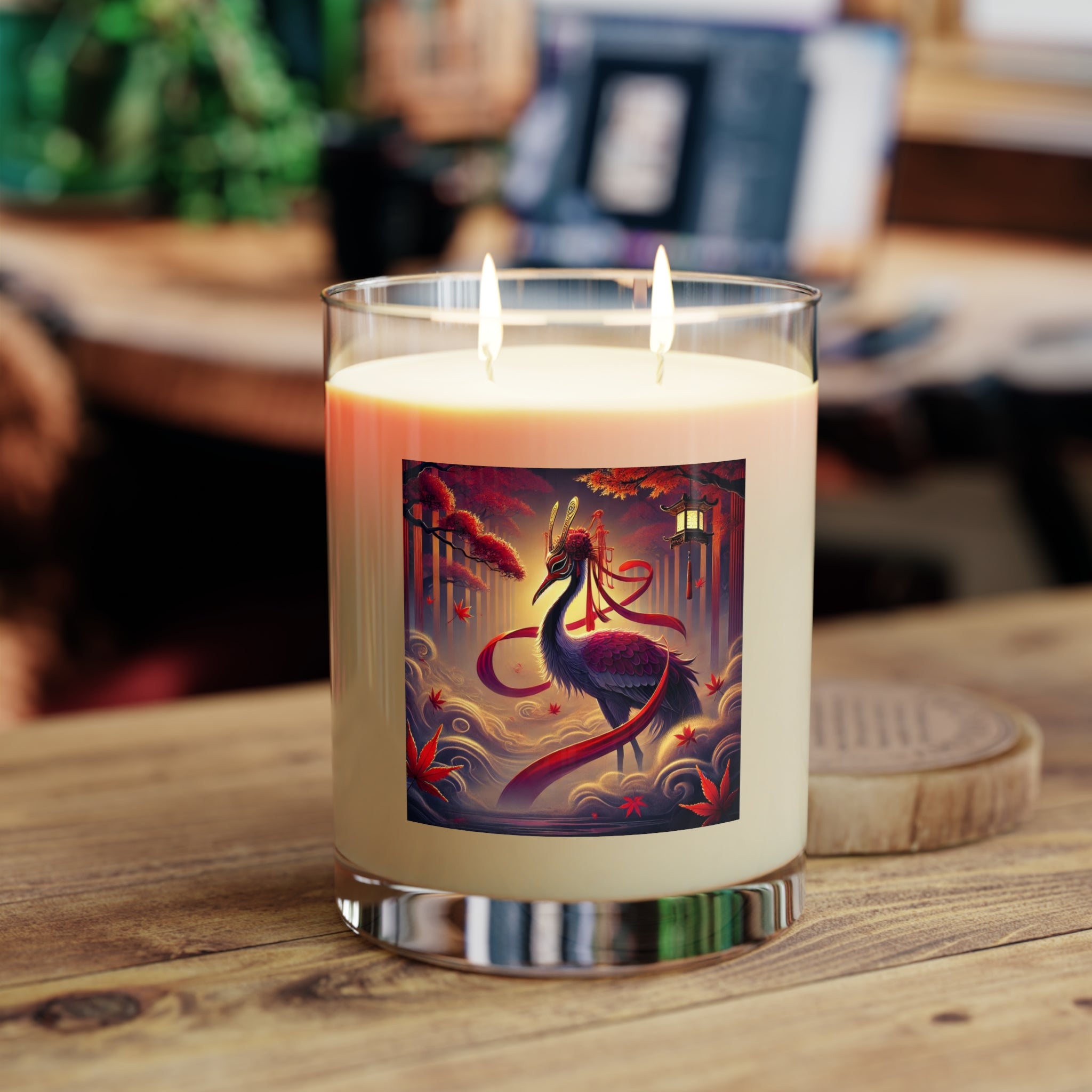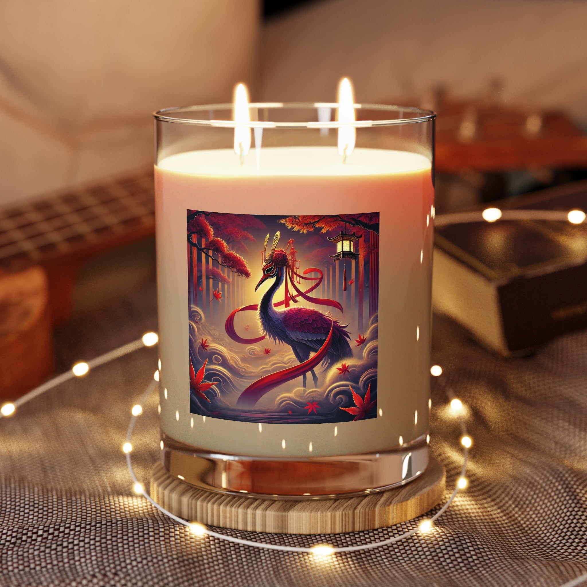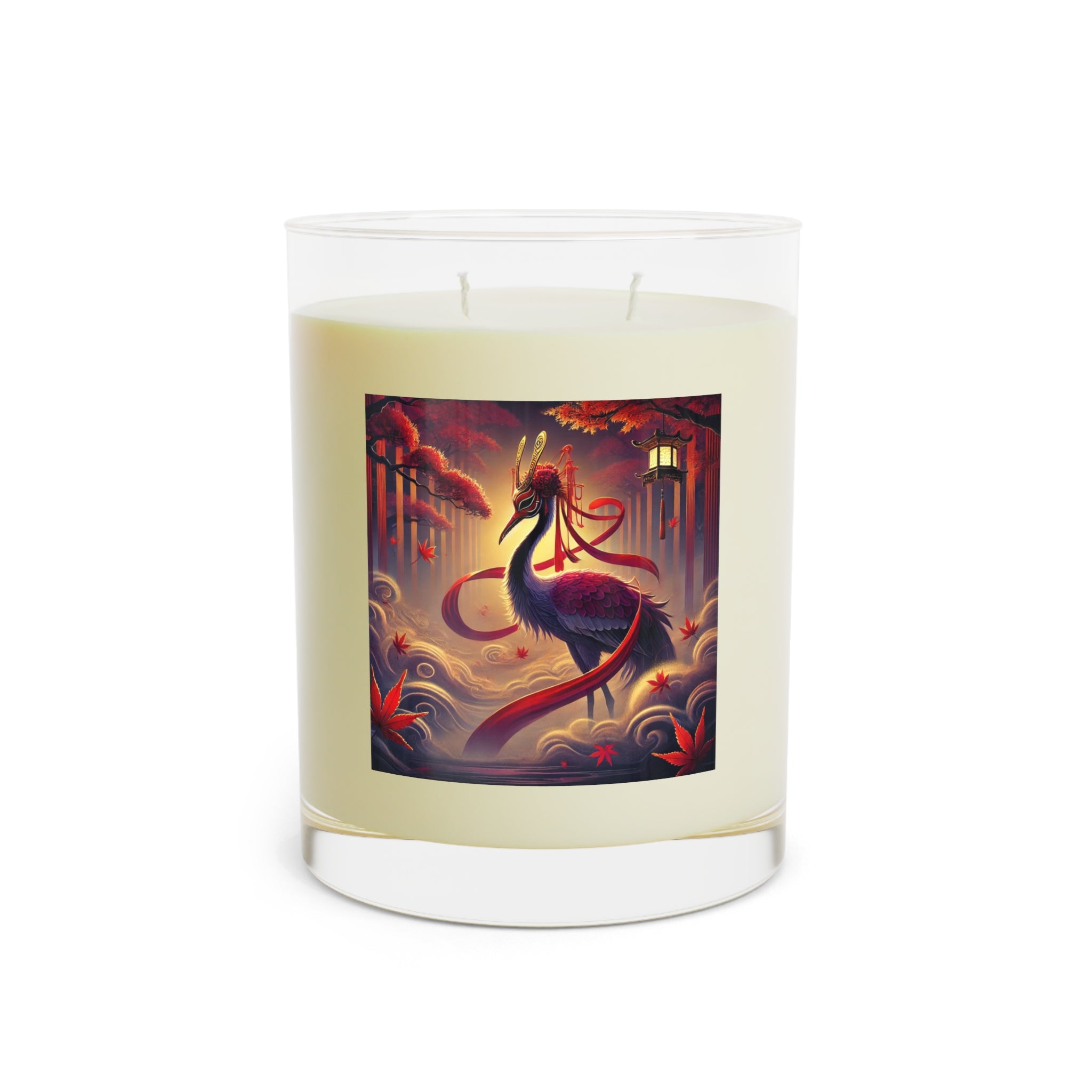 Elevate your space with this 11oz full-glass scented candle, crafted from 100% food-grade soy wax and premium fragrance oils for a clean burn lasting up to 65 hours. The wraparound design features the Regal Crimson Crane in the Autumn Mist—a kabuki-inspired Halloween portrait of a crimson-feathered crane standing in autumn mist, adorned in traditional Japanese attire. Blending seasonal mystery with cultural artistry, this candle is as decorative as it is soothing. Available in three scents—White Tea & Fig, Lavender & Sage, and Ocean Mist & Moss—it’s perfect for relaxation, home décor, or gifting.