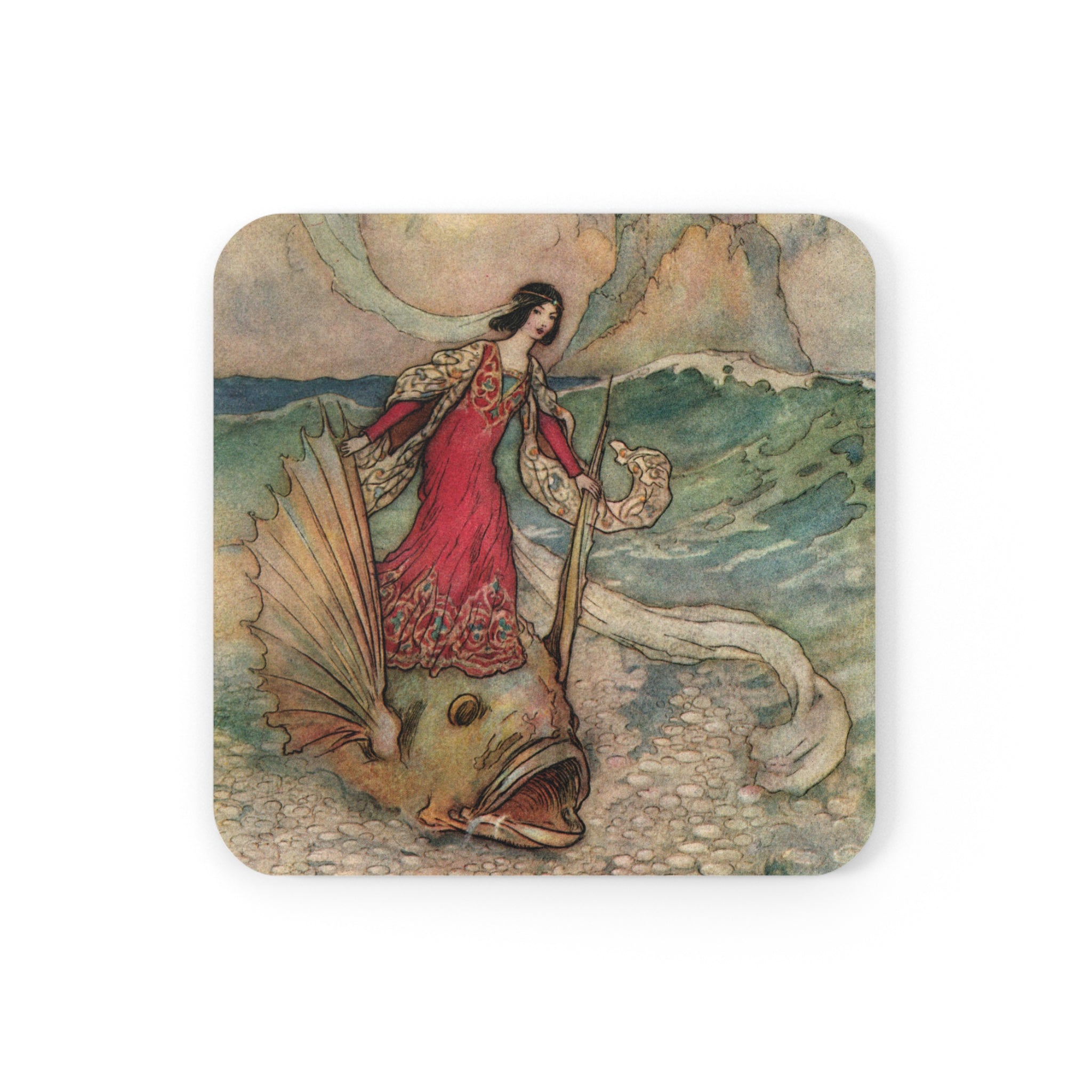 Rita Rides on the Dolphin by Warwick Goble | Cork Back Coaster captures the enchantment and whimsy of early twentieth-century fairy-tale illustration. A perfect blend of storybook fantasy and fine art, this piece brings ethereal elegance to any home or collection.