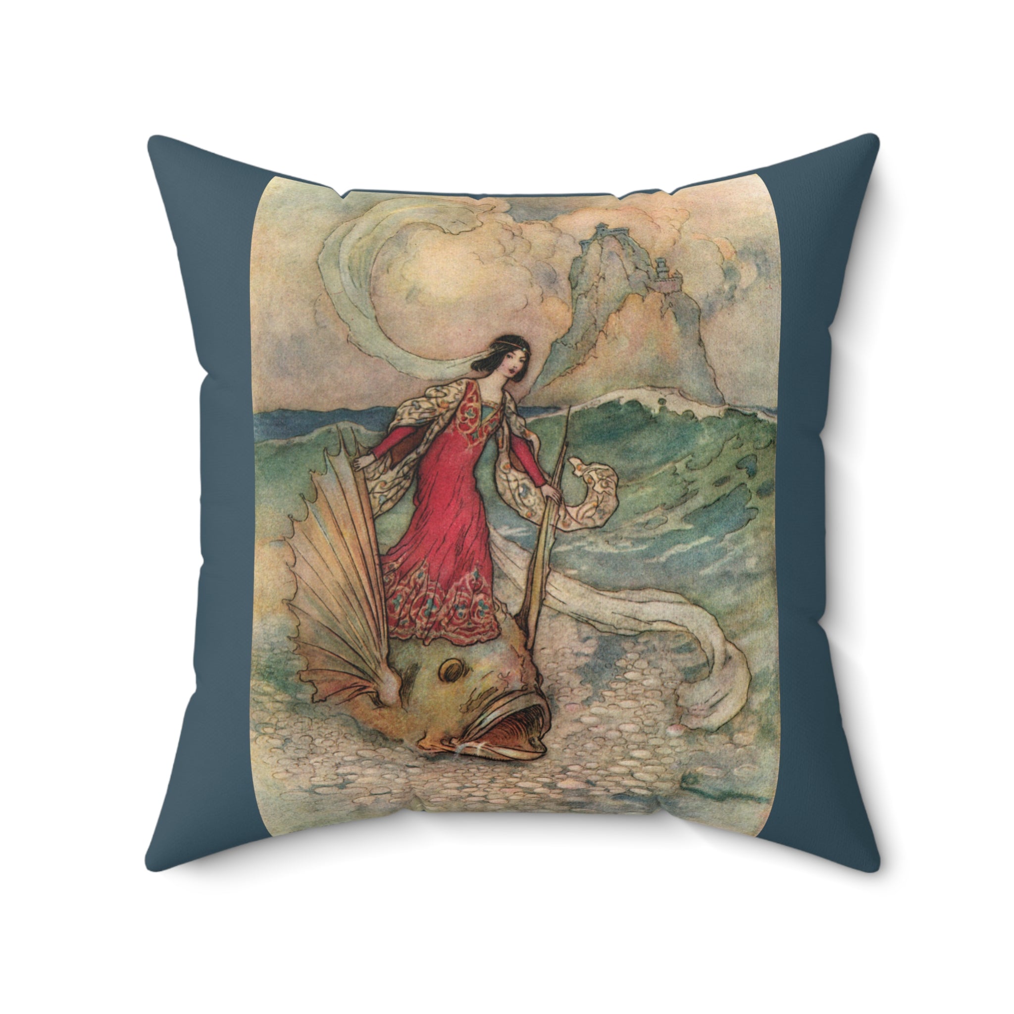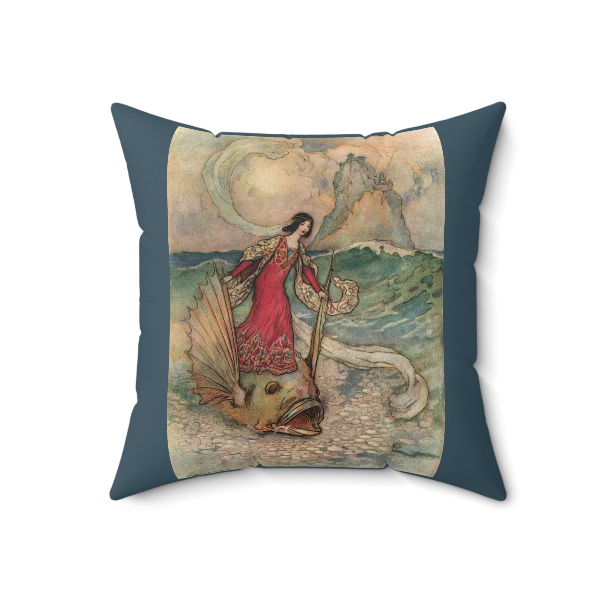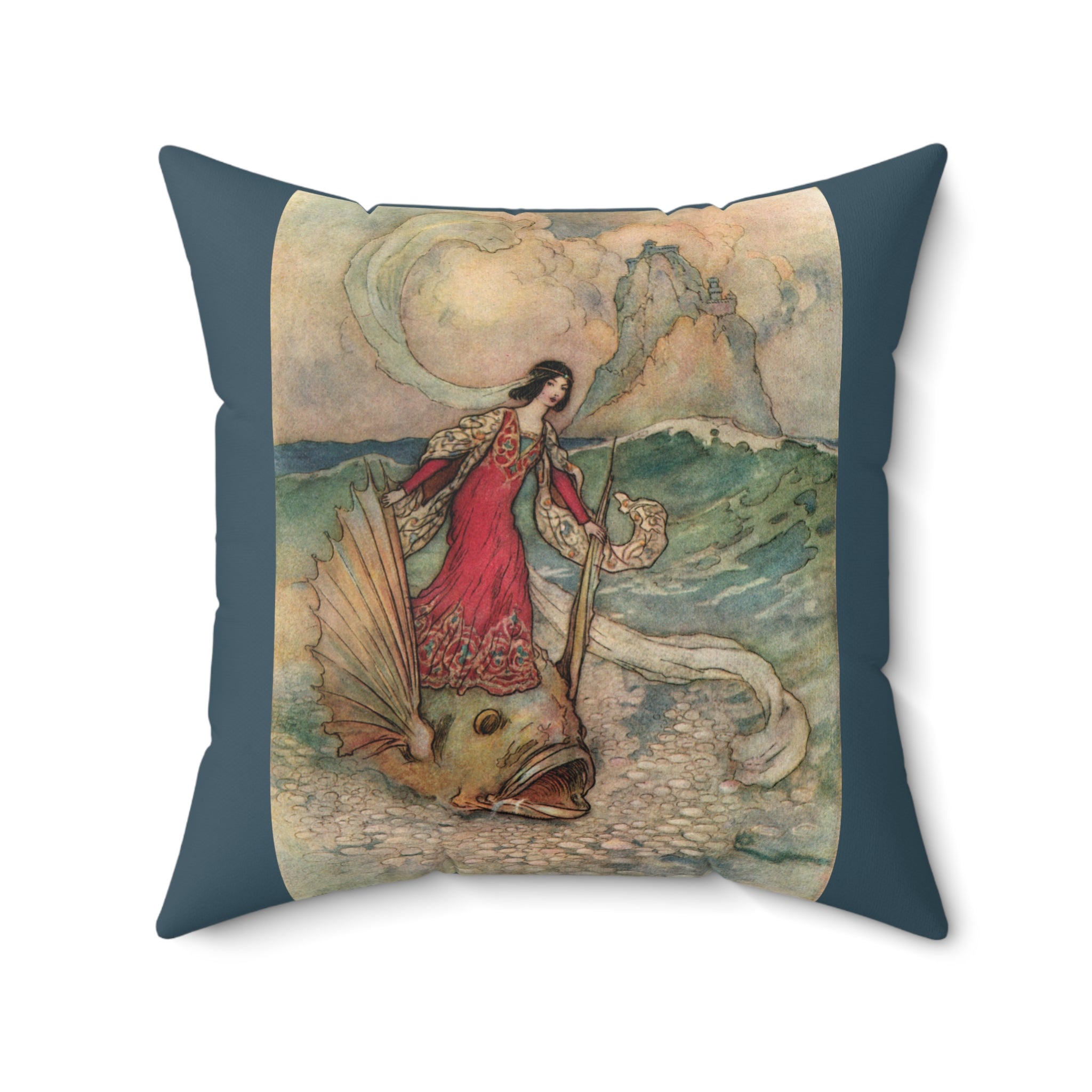 Artwork designed and digitally remastered by Sarasvati Designs. Rita Rides on the Dolphin is a 1911 illustration by Warwick Goble for the fairy tale "The Three Enchanted Princes" from the Pentamerone, a collection of Italian fairy tales by Giambattista Basile. The illustration depicts Rita, a young woman with long flowing hair and a flowing gown, riding on the back of a dolphin across a turquoise sea. The fairy tale "The Three Enchanted Princes" is about three princes who are cursed by an evil witch to live as animals until they can find someone who will love them for who they are, even if they are not in human form. The first prince is transformed into a falcon, the second is transformed into a stag, and the third is transformed into a dolphin. They are banished from the kingdom and must live in the wild until they can break the curse. One day, three sisters are walking in the forest when they come across the three enchanted princes. The sisters are initially frightened by the animals, but they eventually come to love them and agree to marry them. The King eventually welcomes the three enchanted princes into the kingdom, and the curse is broken. The princes transform back into human form, and they and their wives live happily ever after.