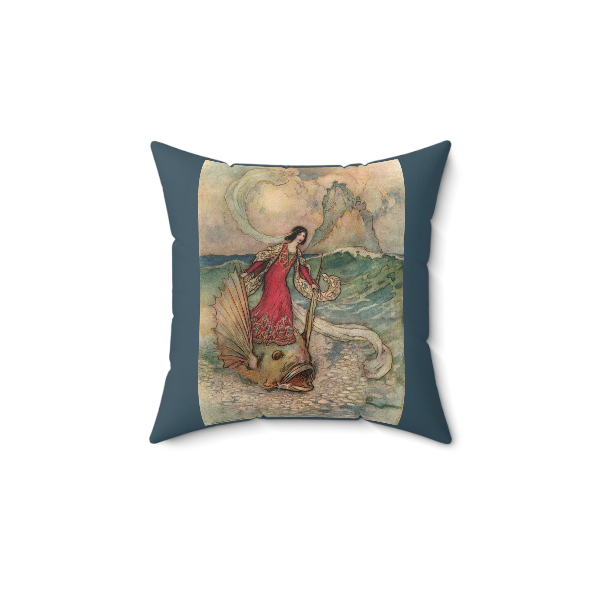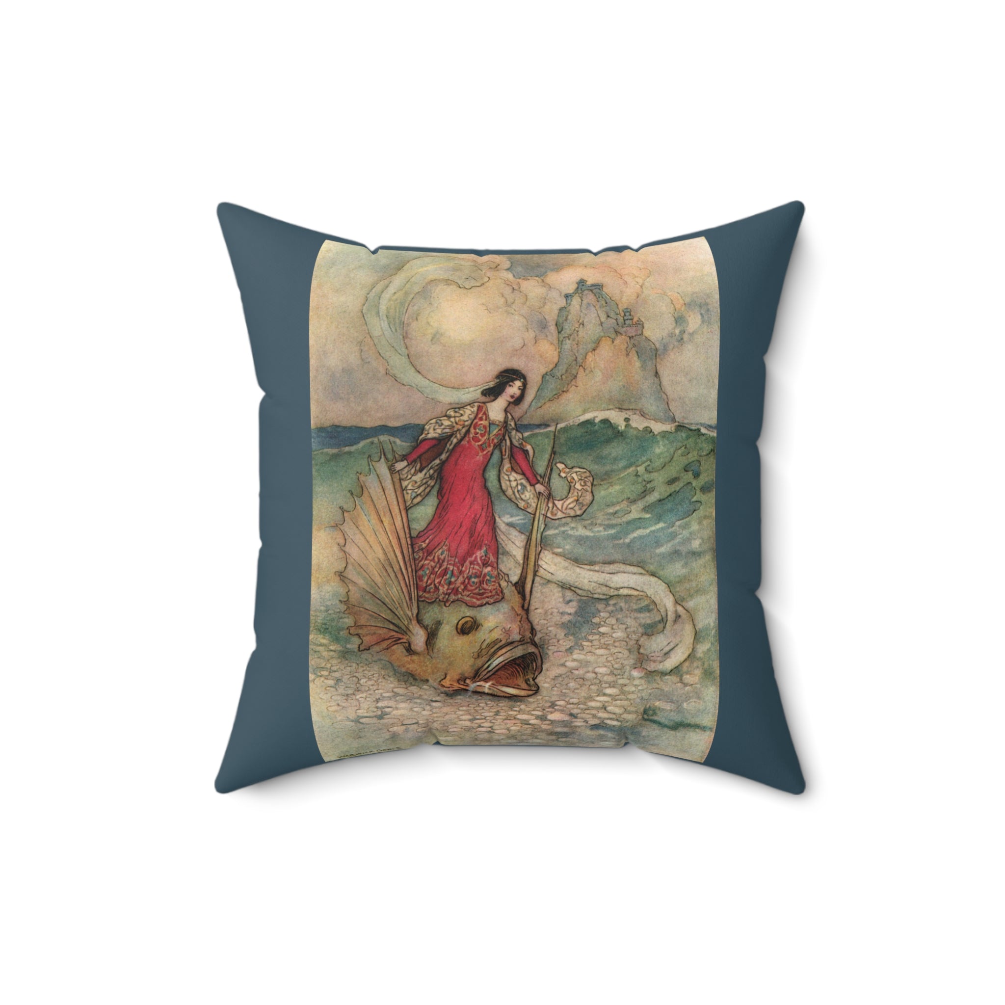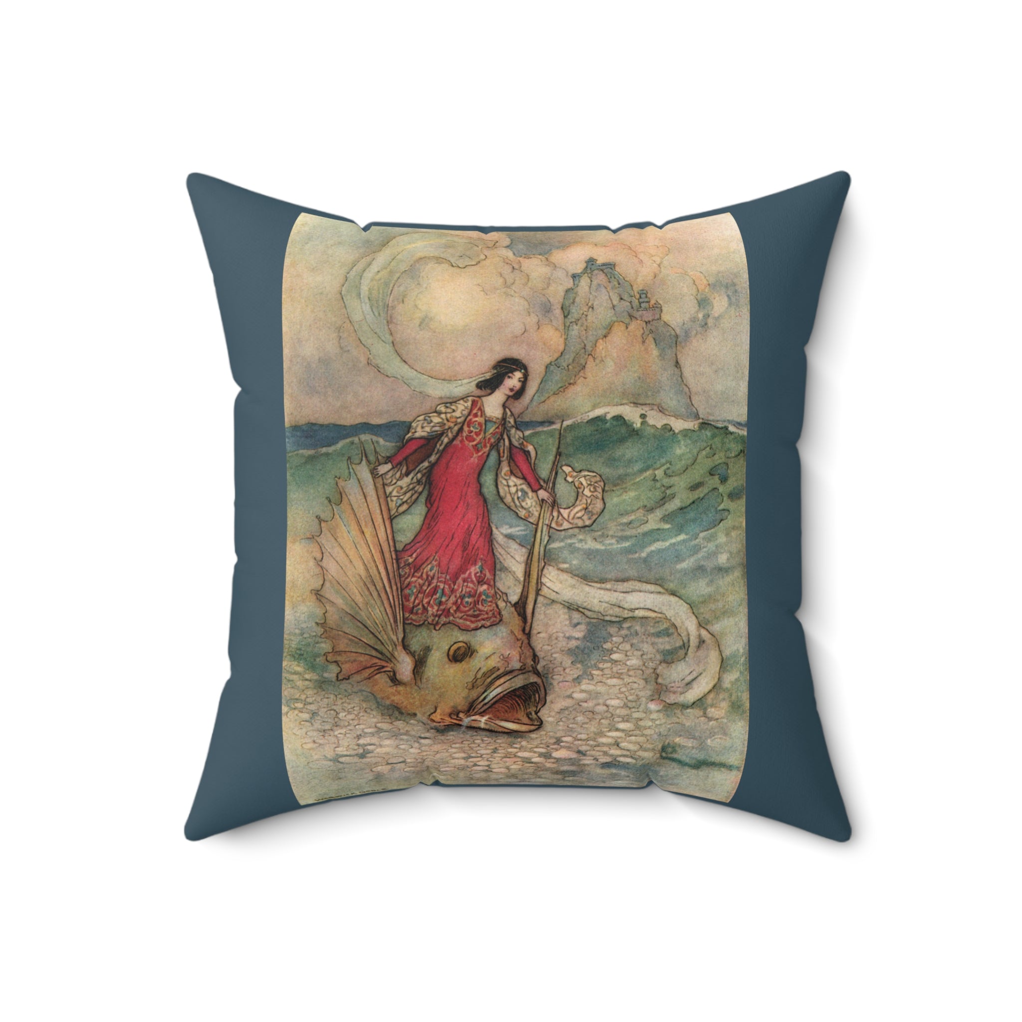 Artwork designed and digitally remastered by Sarasvati Designs. Rita Rides on the Dolphin is a 1911 illustration by Warwick Goble for the fairy tale "The Three Enchanted Princes" from the Pentamerone, a collection of Italian fairy tales by Giambattista Basile. The illustration depicts Rita, a young woman with long flowing hair and a flowing gown, riding on the back of a dolphin across a turquoise sea. The fairy tale "The Three Enchanted Princes" is about three princes who are cursed by an evil witch to live as animals until they can find someone who will love them for who they are, even if they are not in human form. The first prince is transformed into a falcon, the second is transformed into a stag, and the third is transformed into a dolphin. They are banished from the kingdom and must live in the wild until they can break the curse. One day, three sisters are walking in the forest when they come across the three enchanted princes. The sisters are initially frightened by the animals, but they eventually come to love them and agree to marry them. The King eventually welcomes the three enchanted princes into the kingdom, and the curse is broken. The princes transform back into human form, and they and their wives live happily ever after.