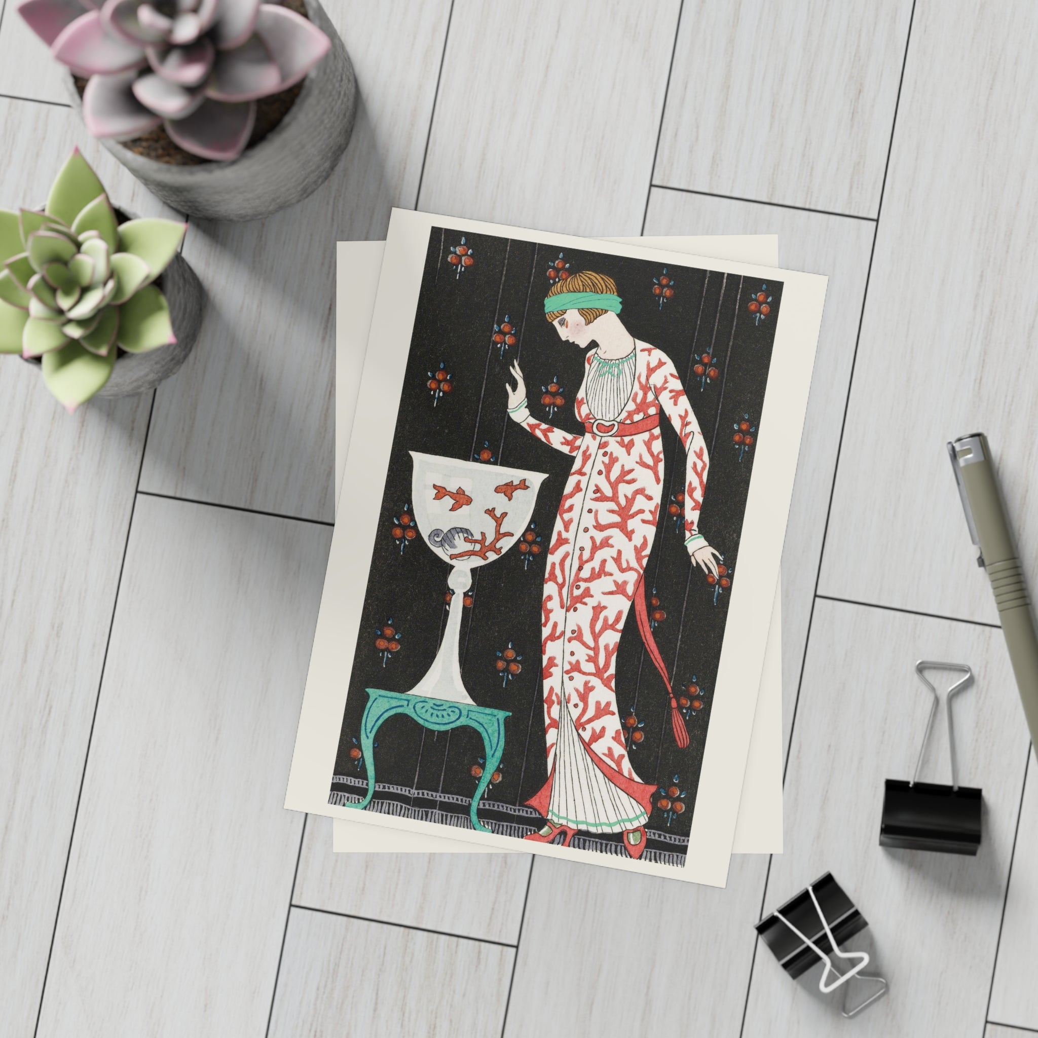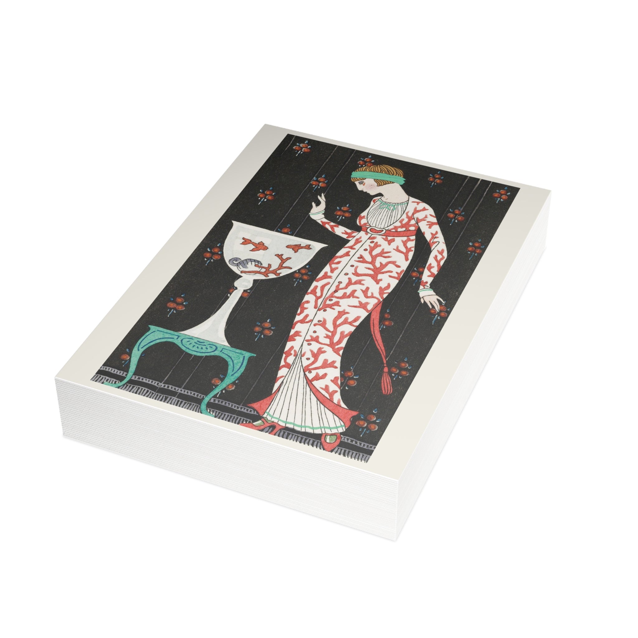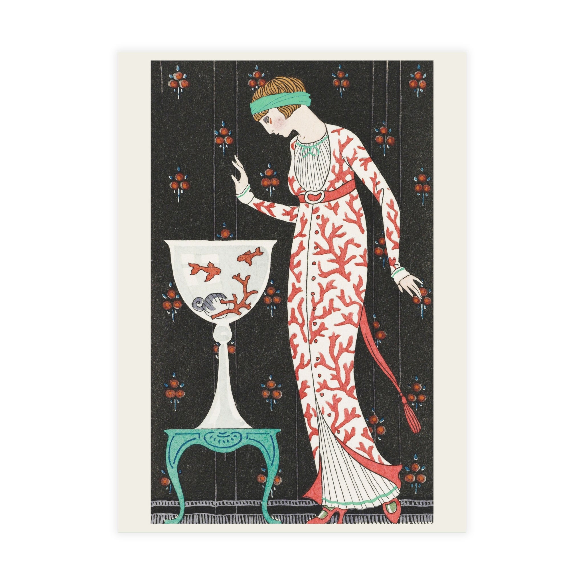 Elevate your correspondence with these exquisite postcards featuring Robe d'Intérieur en Soie Brochée, a 1913 fashion illustration by French artist George Barbier. The image portrays a woman in a luxurious silk brocade house gown adorned with a delicate red coral pattern. She stands beside a glass fishbowl containing goldfish and coral, her graceful posture echoing the elegance of the aquatic setting. A perfect reflection of Barbier’s refined Art Deco style, this artwork showcases the intricate balance between pattern, fashion, and poise.
