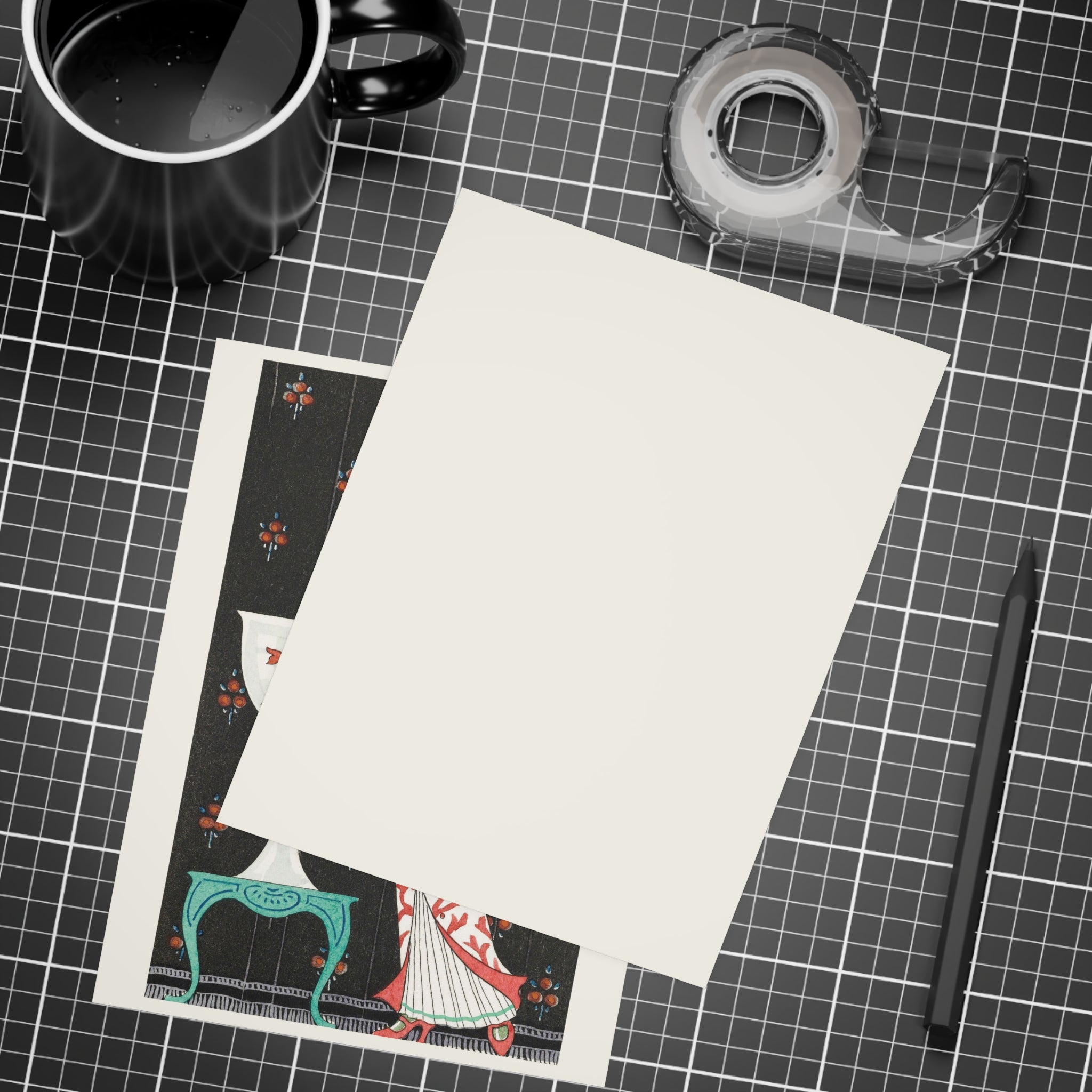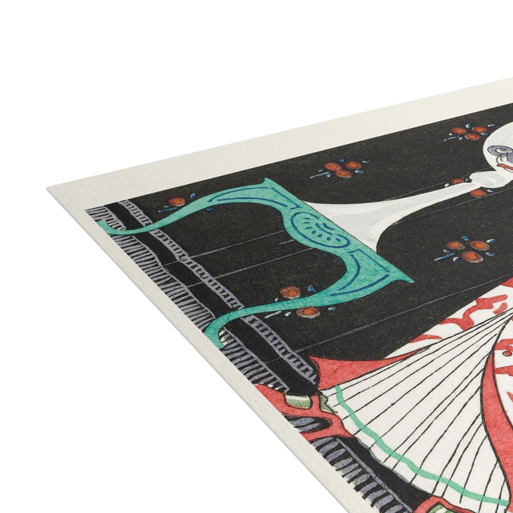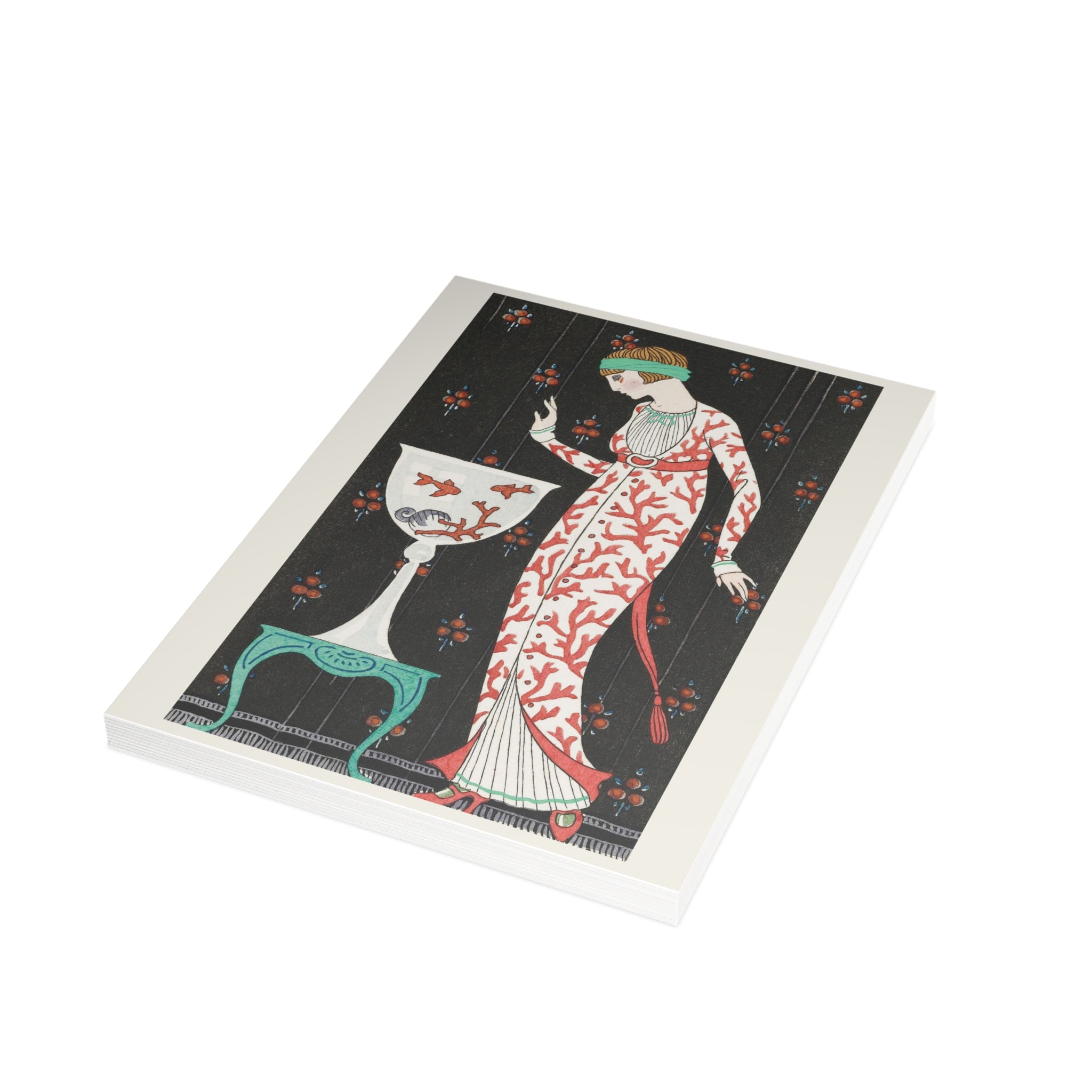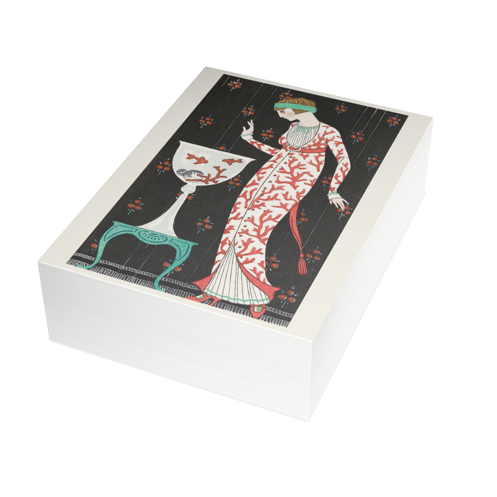 Elevate your correspondence with these exquisite postcards featuring Robe d'Intérieur en Soie Brochée, a 1913 fashion illustration by French artist George Barbier. The image portrays a woman in a luxurious silk brocade house gown adorned with a delicate red coral pattern. She stands beside a glass fishbowl containing goldfish and coral, her graceful posture echoing the elegance of the aquatic setting. A perfect reflection of Barbier’s refined Art Deco style, this artwork showcases the intricate balance between pattern, fashion, and poise.