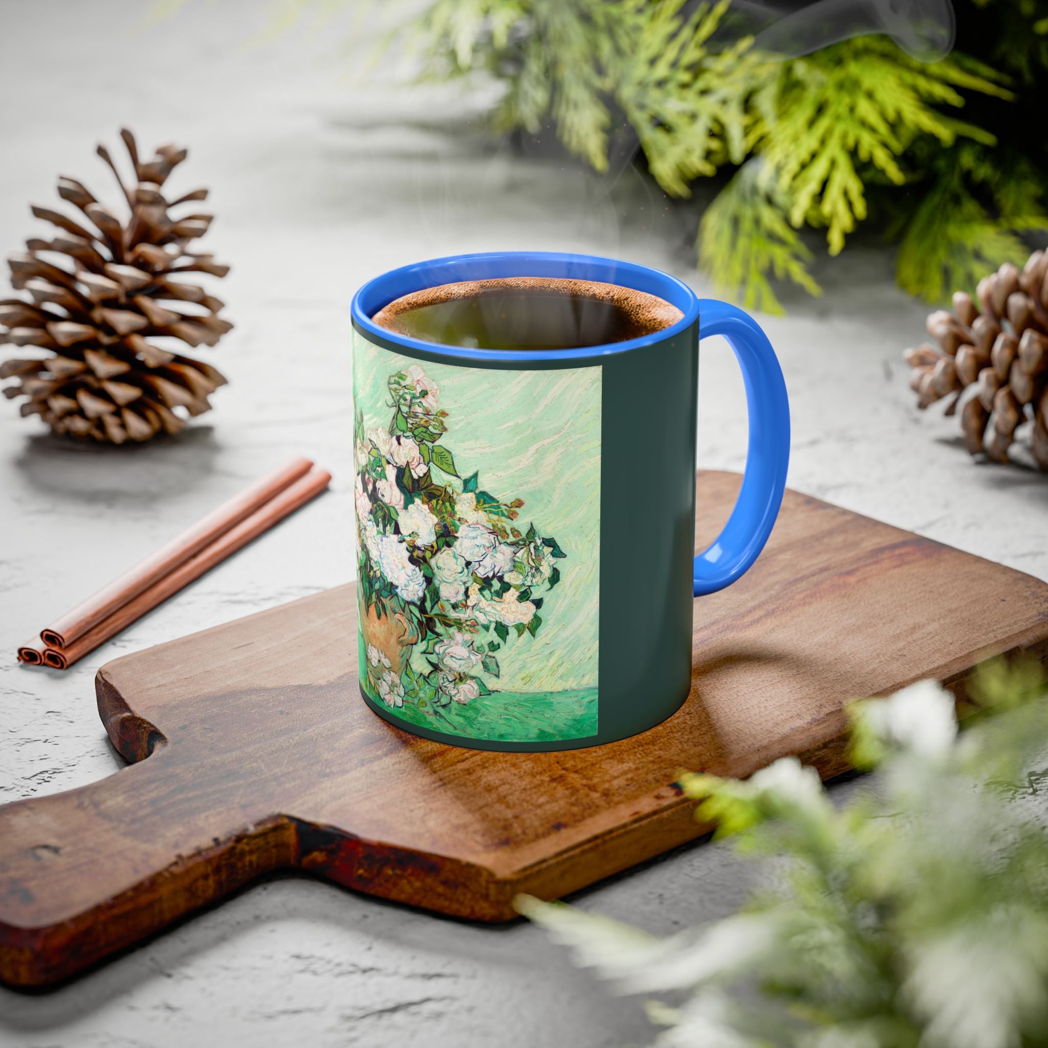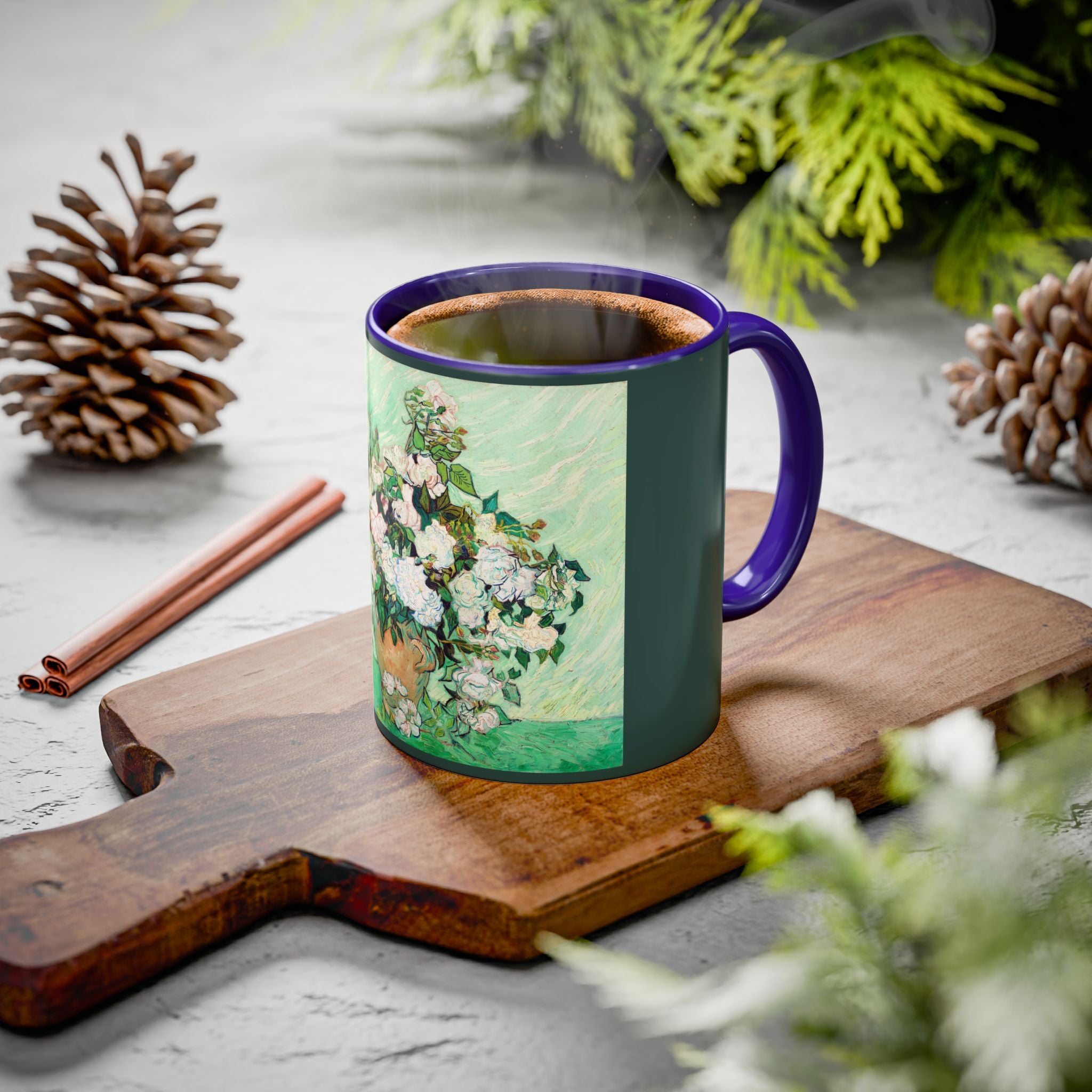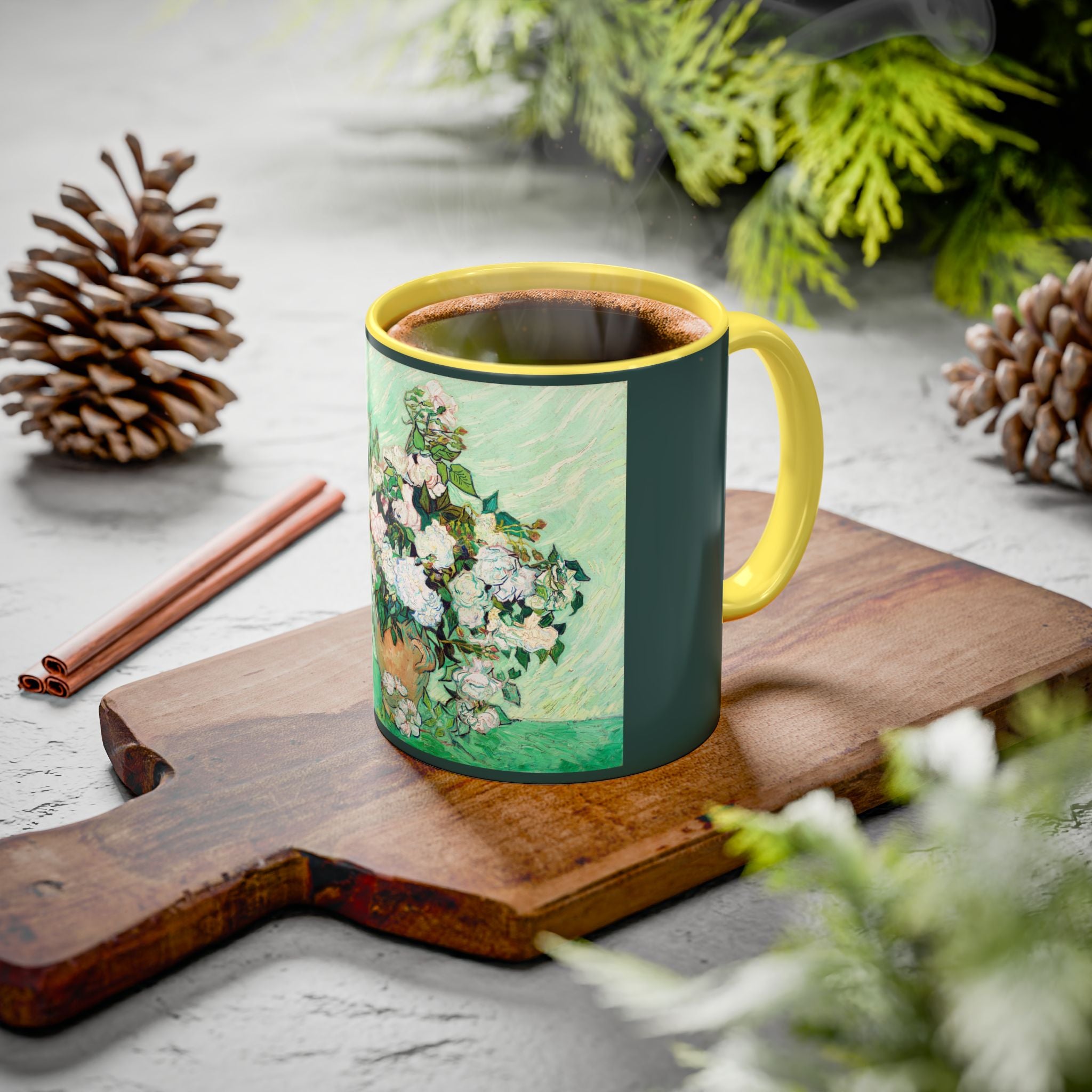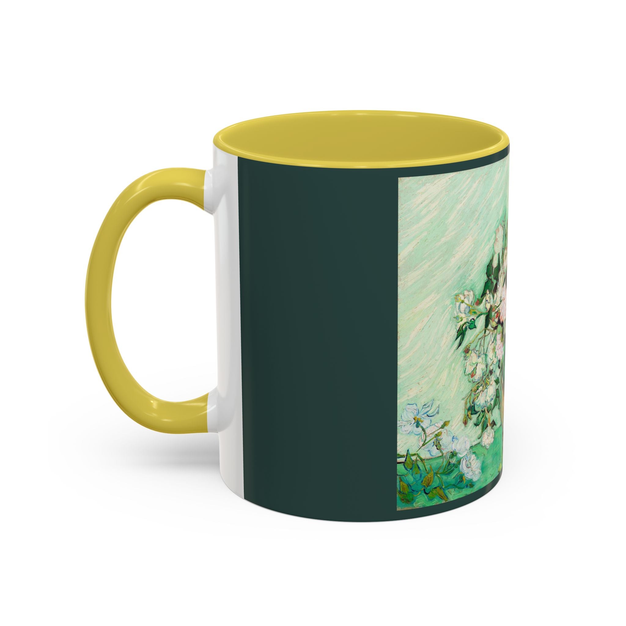 Mugs are a kitchen essential, and when infused with a personalized touch, they transform into cherished favorites. These mugs, offered in 12 vibrant color choices, can hold up to 11oz of your preferred rejuvenating beverage and feature a colored handle and interior. The glossy finish adds an elegant accent that beautifully complements the high-fidelity artwork print, making them not only a delightful addition to your kitchen but also a fantastic choice for thoughtful gifts.
