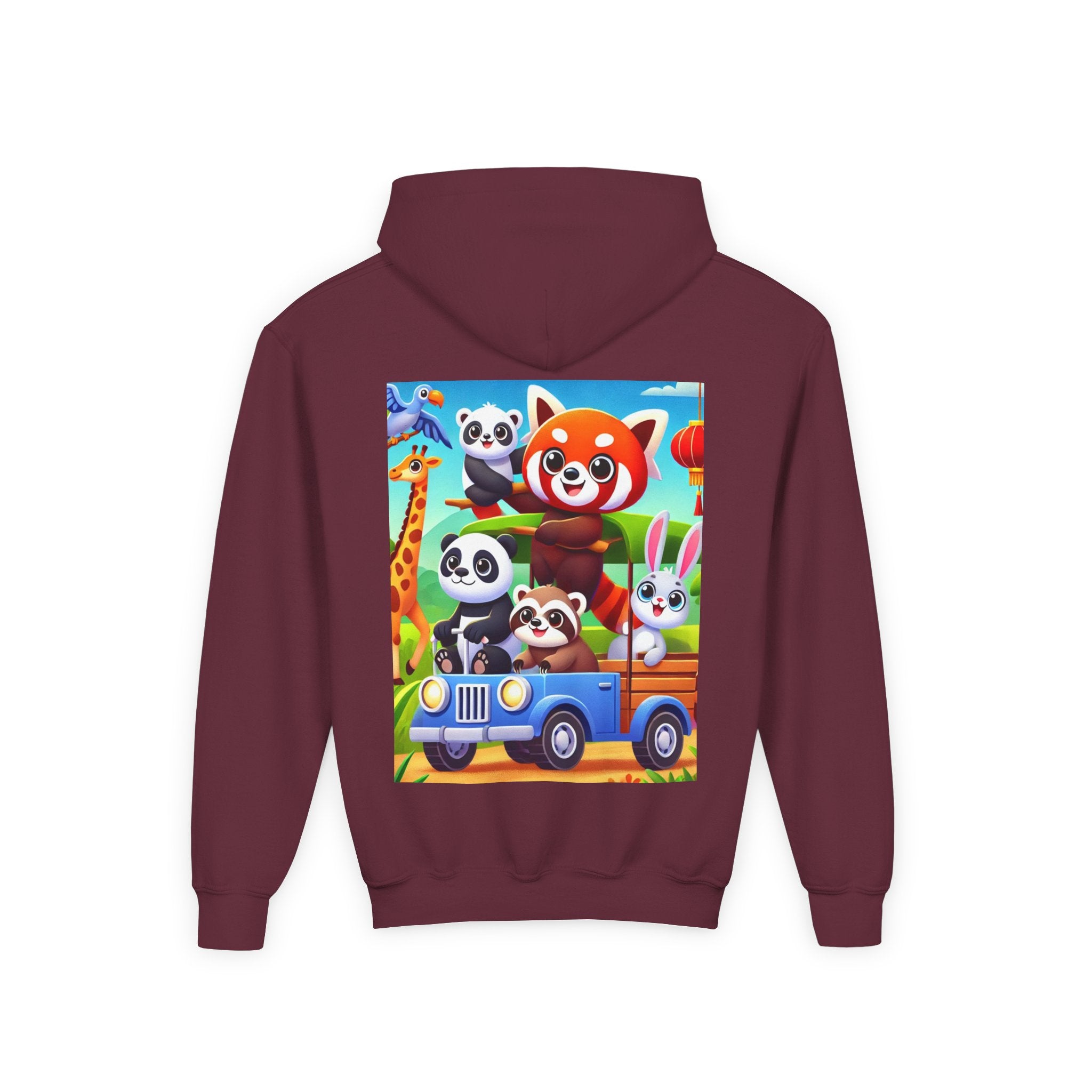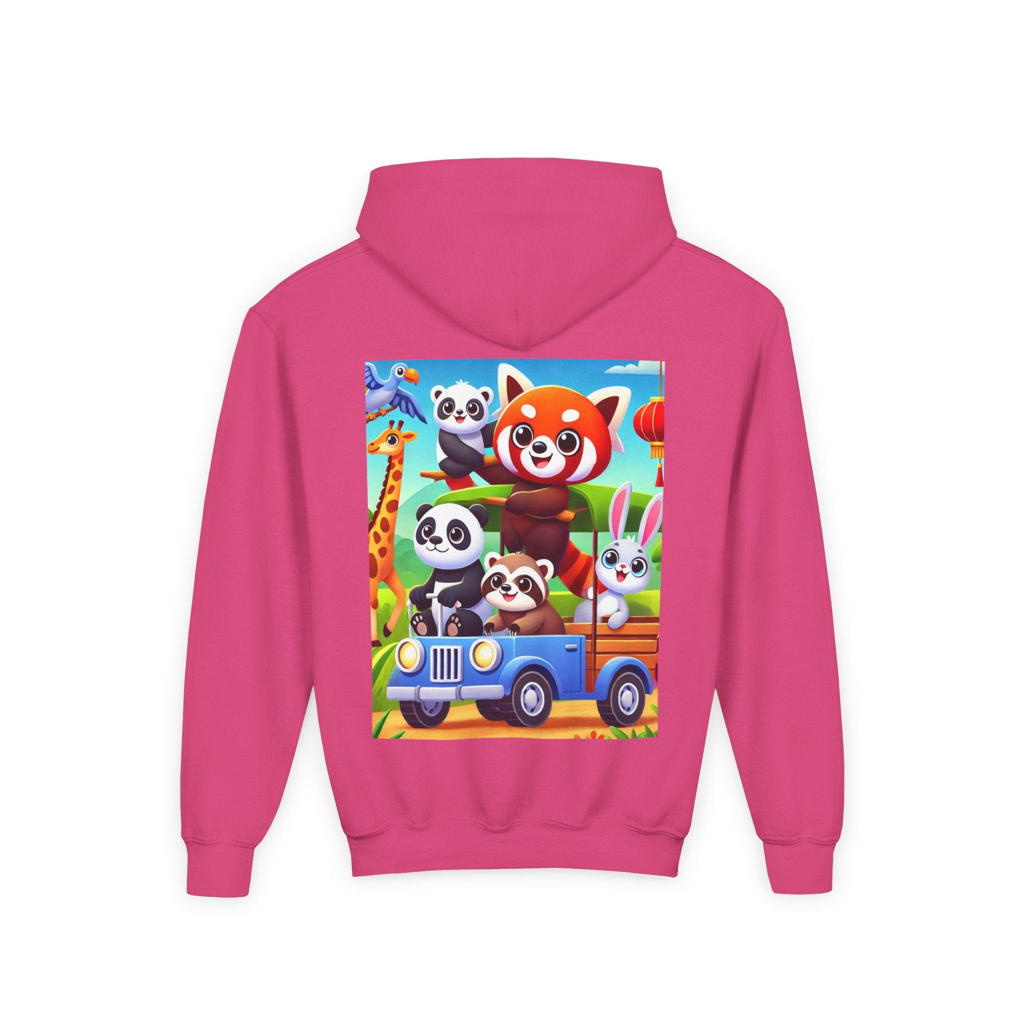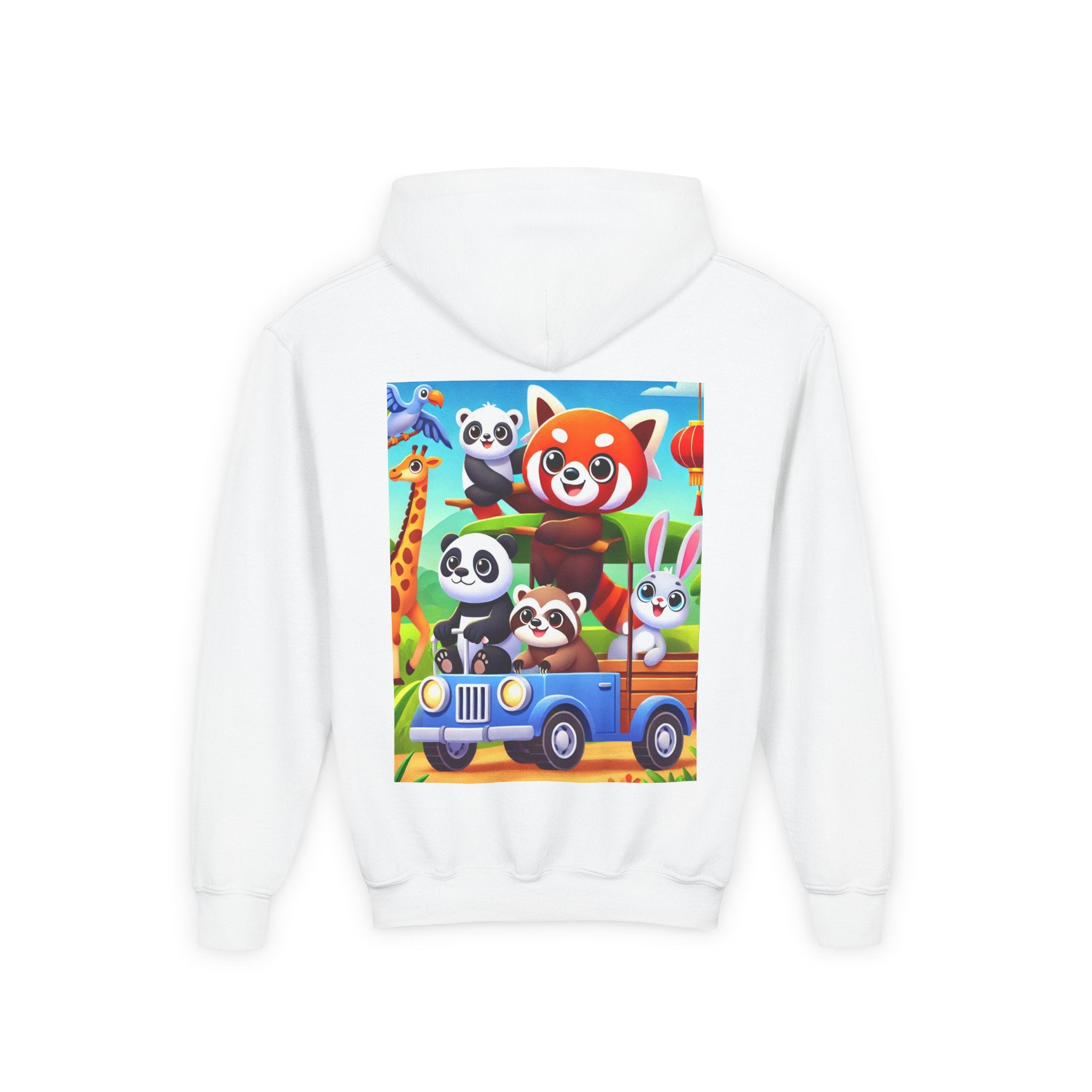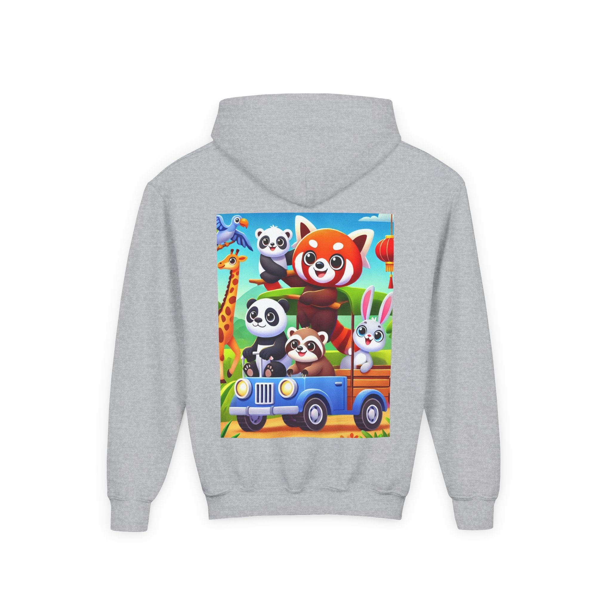 Safari Friends on the Move Youth Heavy Blend Hooded Sweatshirt brings ultra-soft, preshrunk fleece comfort to a bright, kid-friendly safari adventure. The cozy 50% cotton / 50% polyester blend feels wonderful against the skin and helps reduce lint buildup, while the artwork rolls right into the fun: a confident red panda rides up front on a playful safari vehicle, joined by smiling pandas, a curious raccoon, and a happy white bunny enjoying the trip. A friendly giraffe leans in nearby as colorful birds glide across a clear blue sky—capturing the sunny, adventurous spirit of the savanna in a clean, vibrant flat-art style.