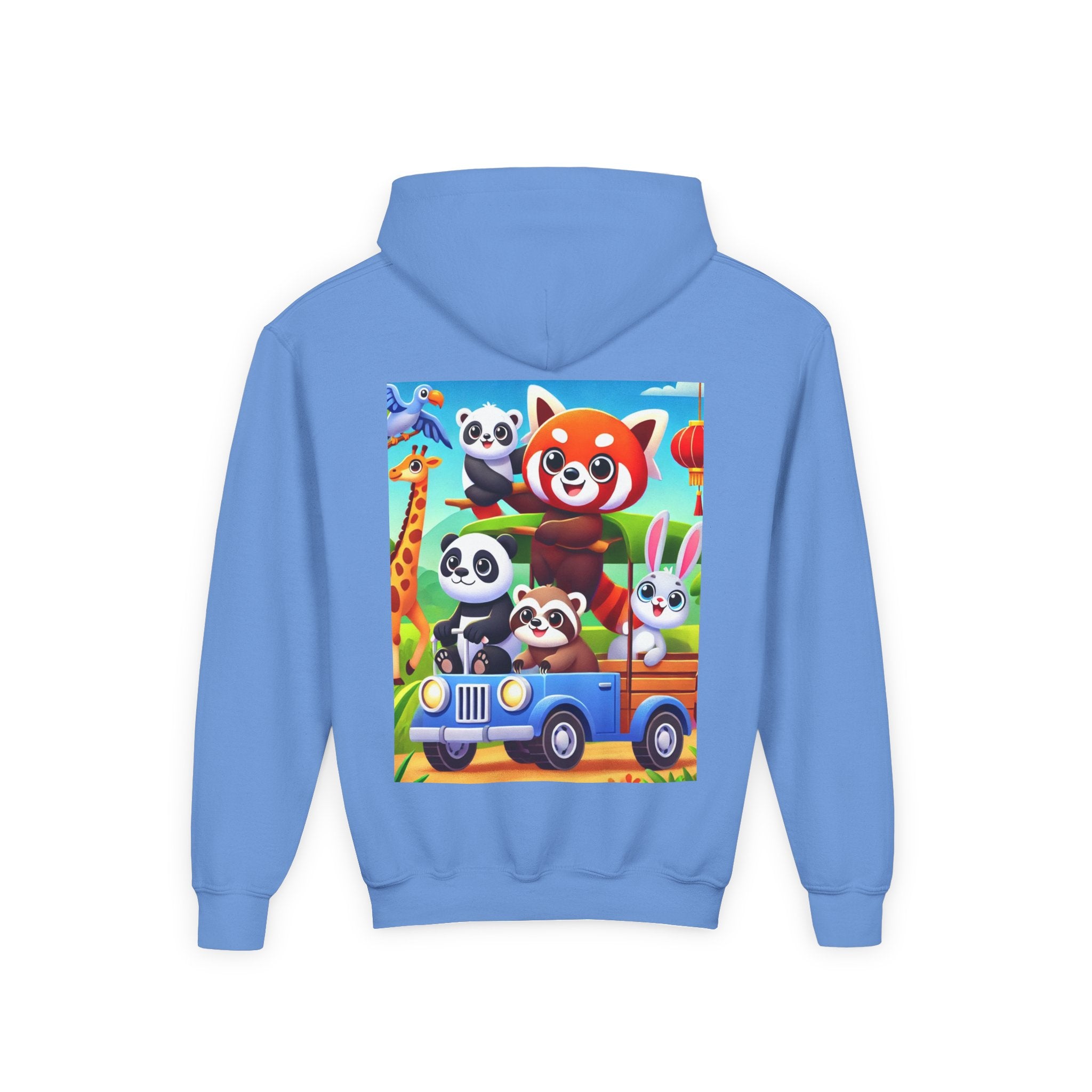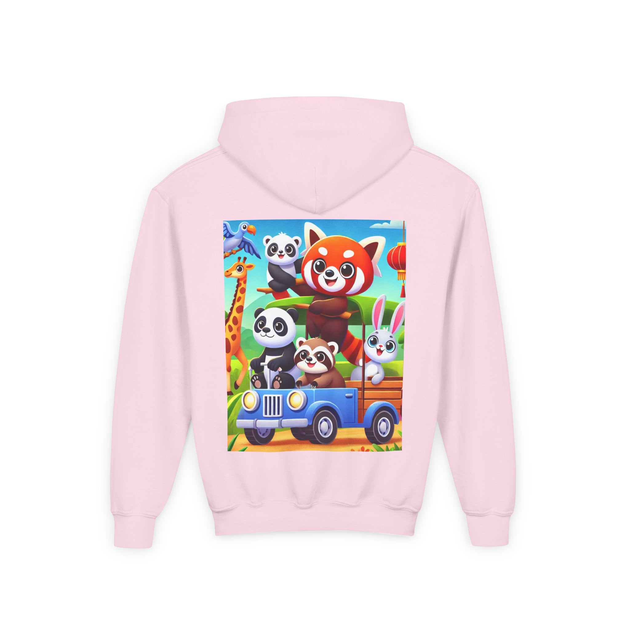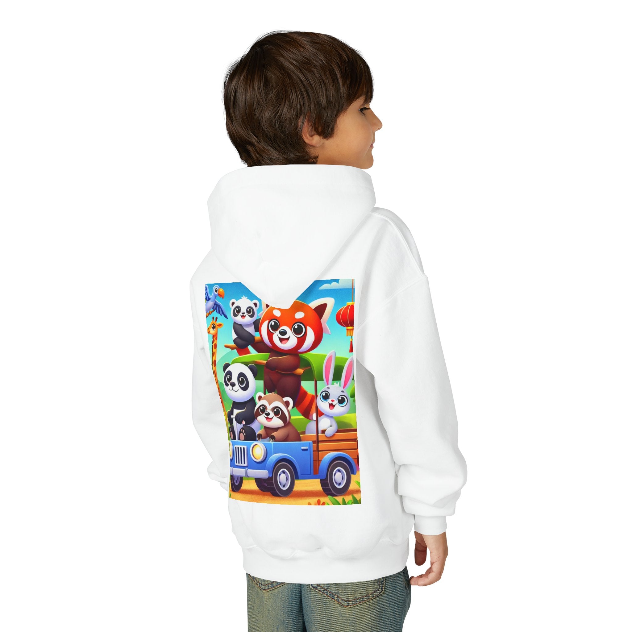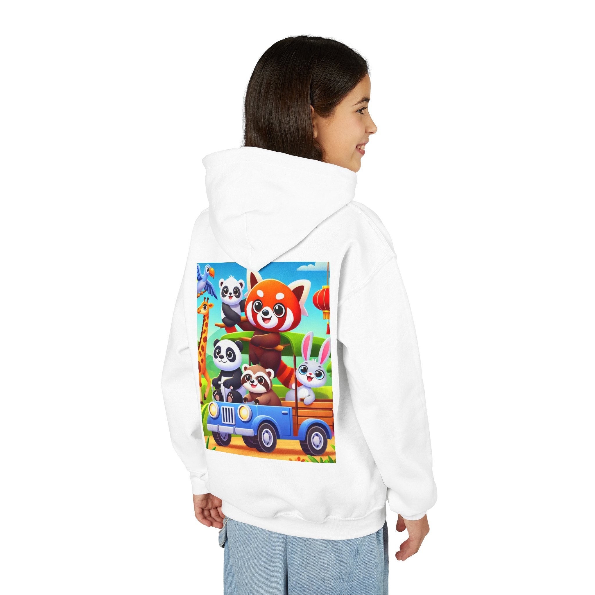 Safari Friends on the Move Youth Heavy Blend Hooded Sweatshirt brings ultra-soft, preshrunk fleece comfort to a bright, kid-friendly safari adventure. The cozy 50% cotton / 50% polyester blend feels wonderful against the skin and helps reduce lint buildup, while the artwork rolls right into the fun: a confident red panda rides up front on a playful safari vehicle, joined by smiling pandas, a curious raccoon, and a happy white bunny enjoying the trip. A friendly giraffe leans in nearby as colorful birds glide across a clear blue sky—capturing the sunny, adventurous spirit of the savanna in a clean, vibrant flat-art style.