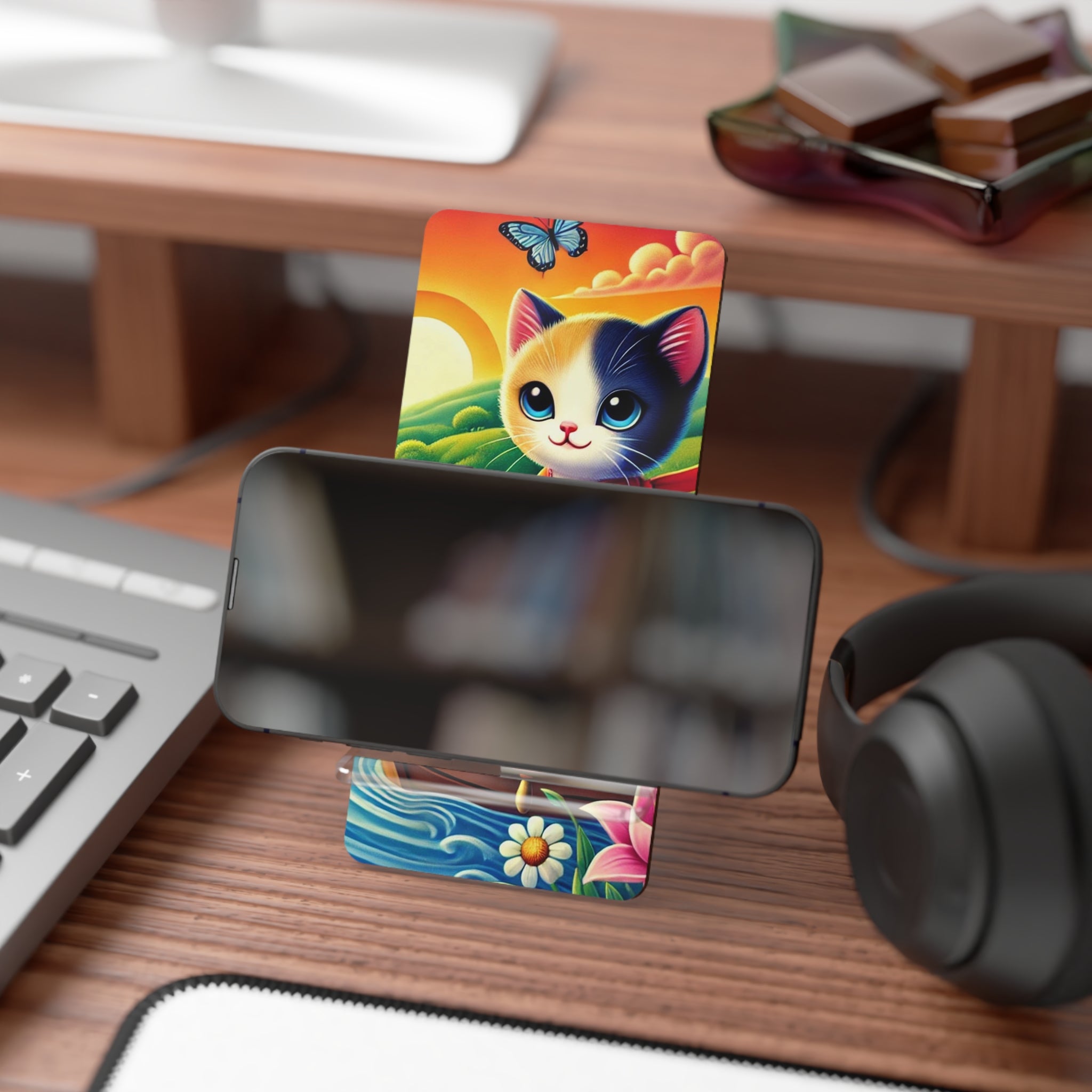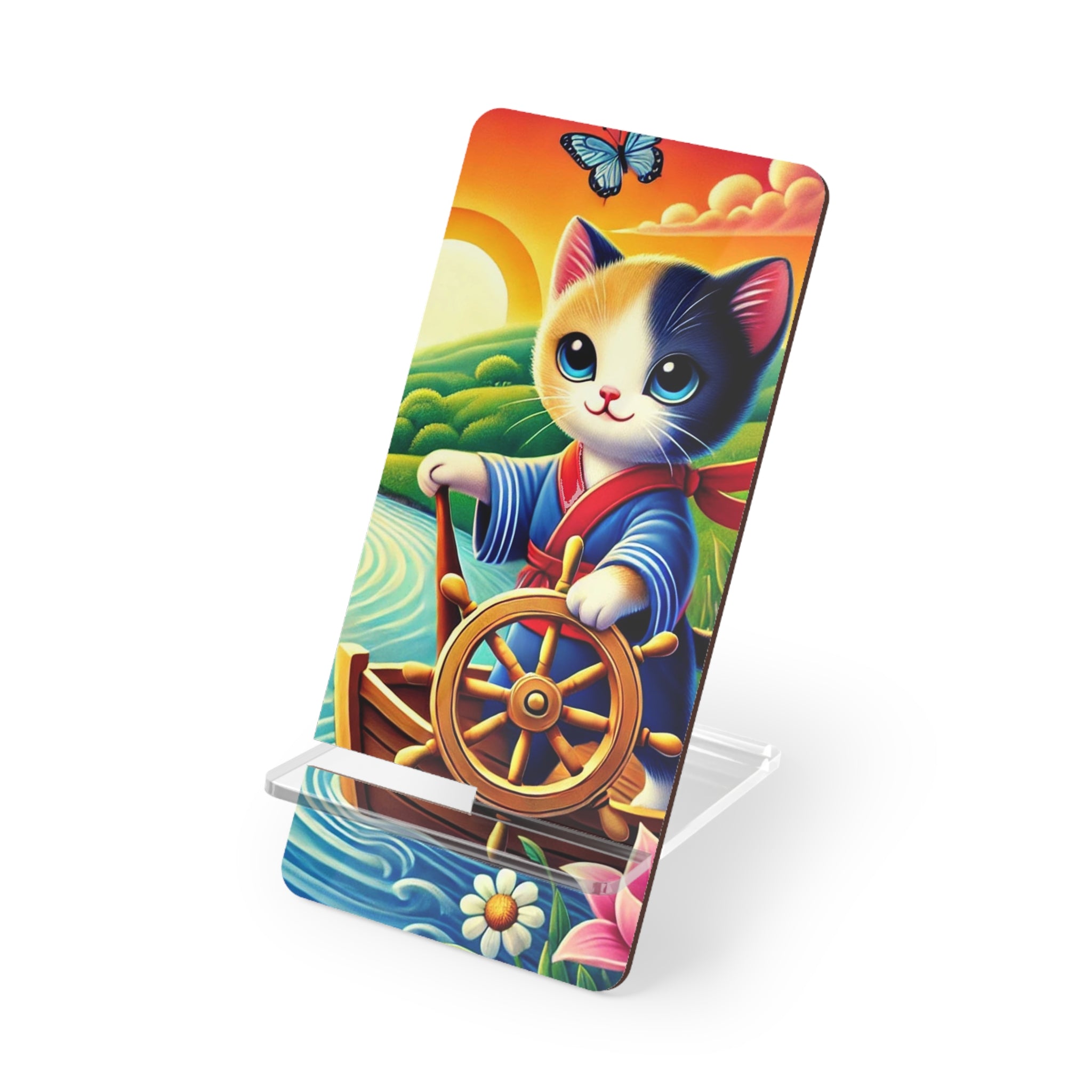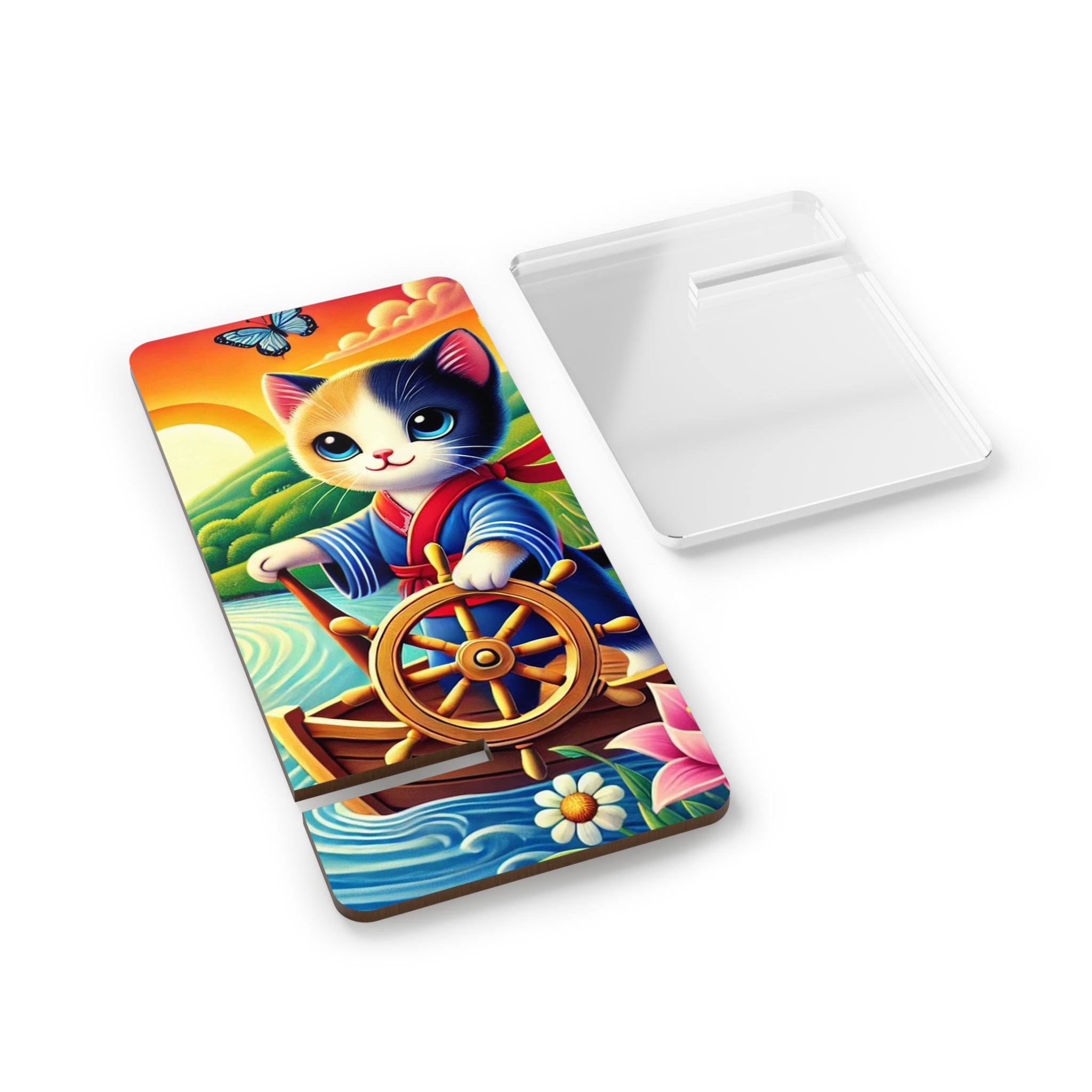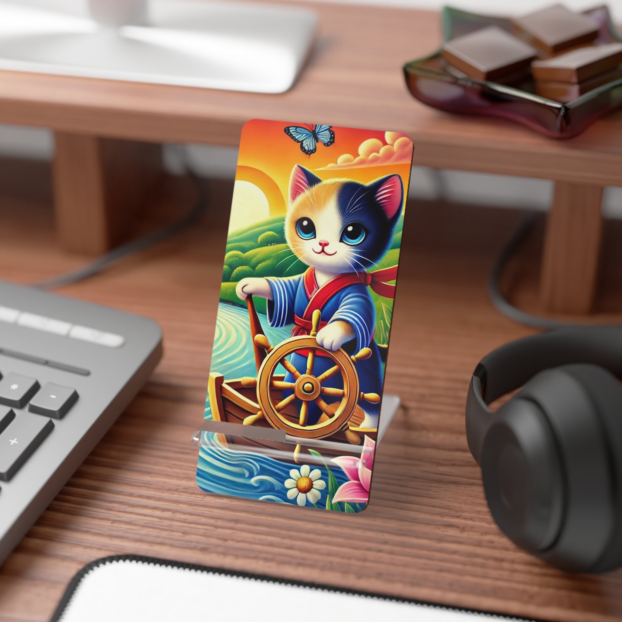 Add a splash of whimsy to your workspace or travel essentials with the Sailor Kitten’s River Adventure Mobile Display Stand for Smartphones. This functional yet artistic stand is perfect for hands-free browsing, video calls, or watching your favorite content. The sturdy hardboard panel features a delightful illustration of a confident kitten in a sailor's kimono, expertly steering a tiny boat down a vibrant, enchanting winding river. The scene bursts with lush landscapes, playful ripples, and colorful flora, brought to life with bold outlines and vivid colors that capture a sense of adventure and wonder.