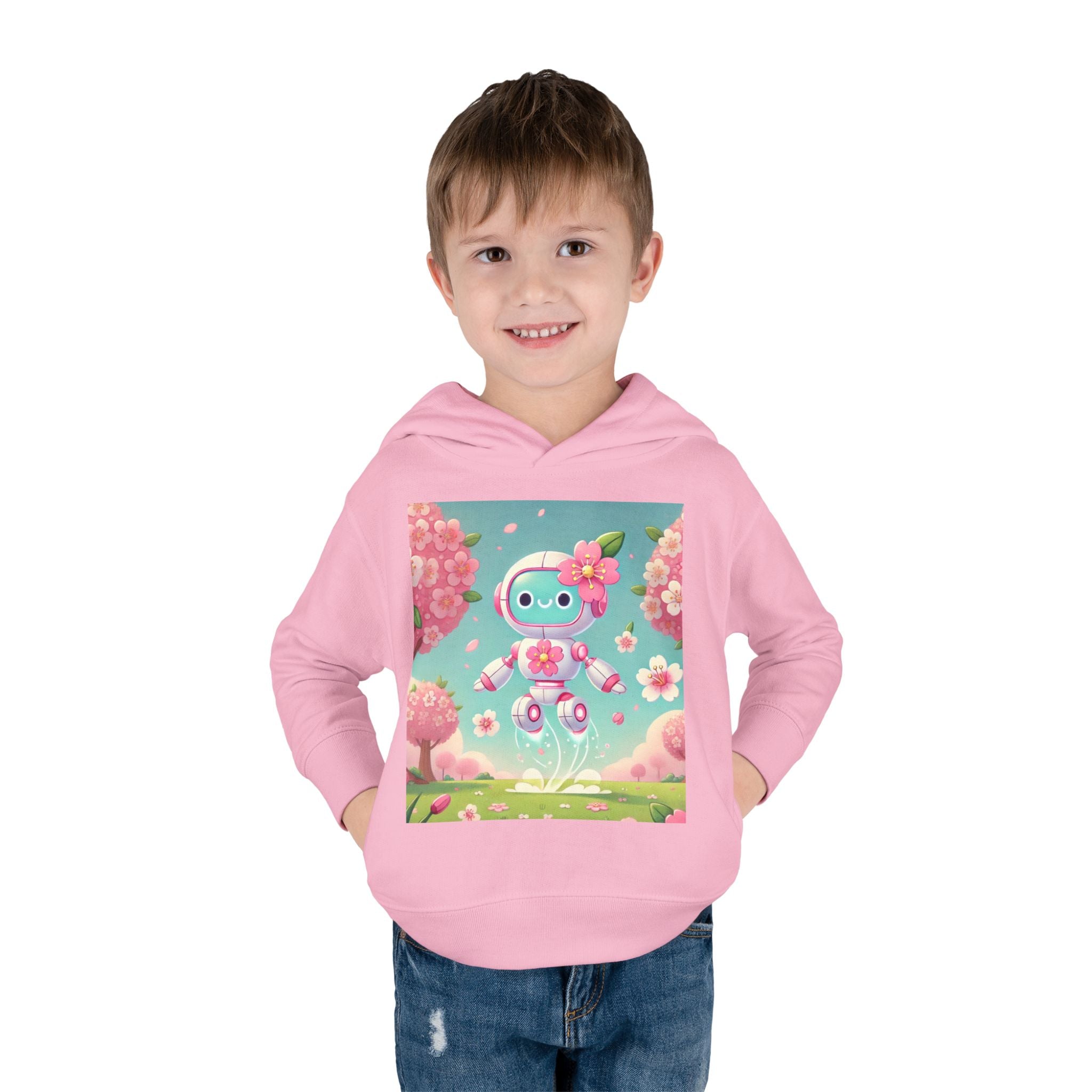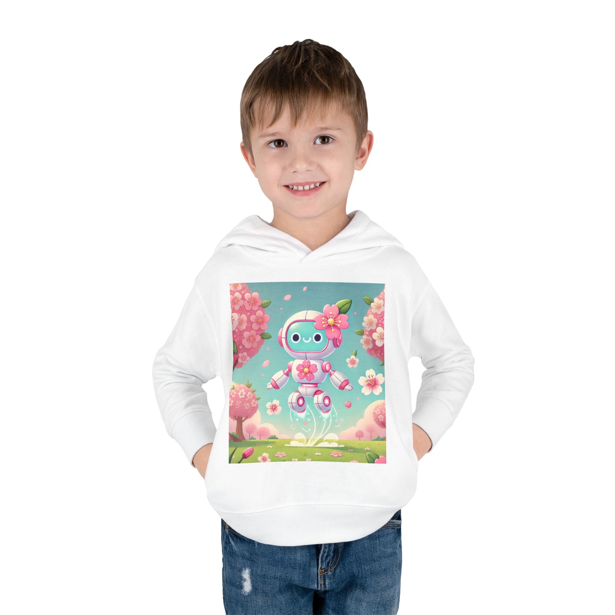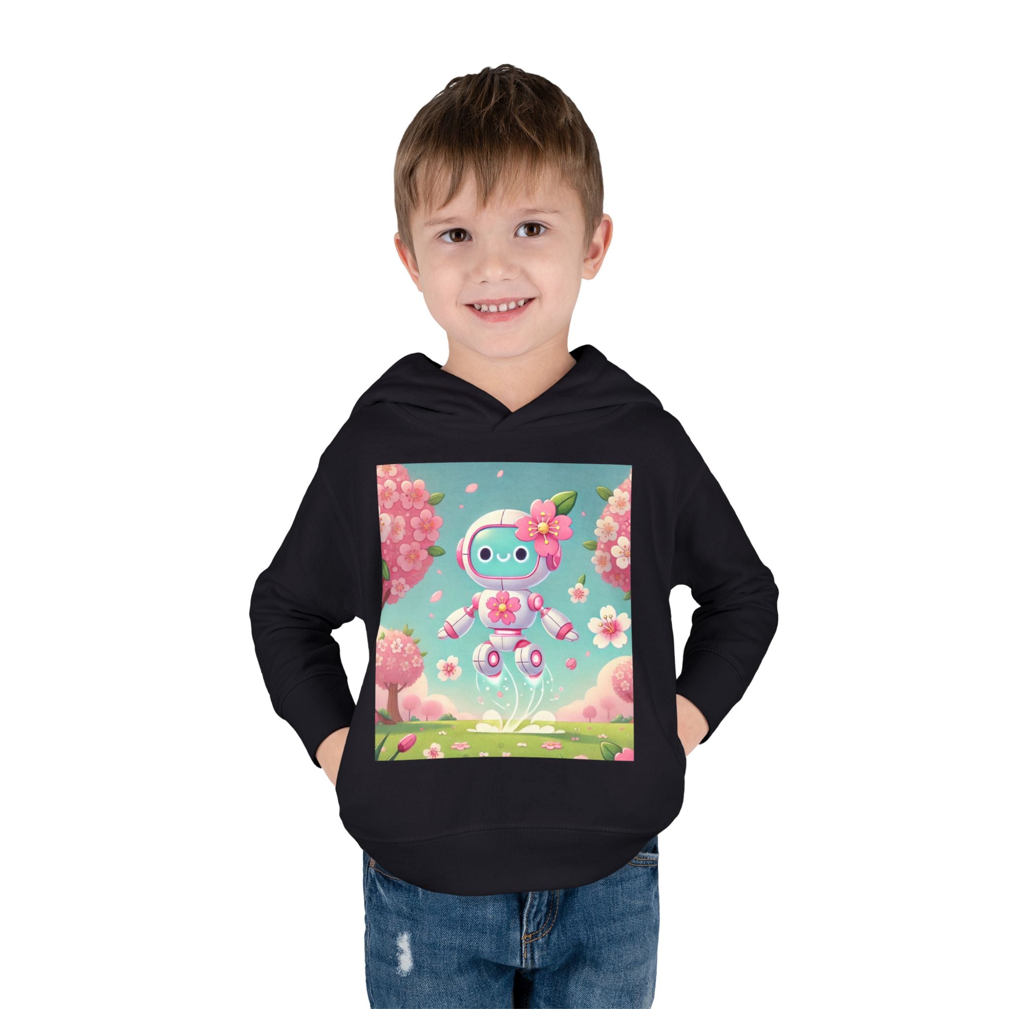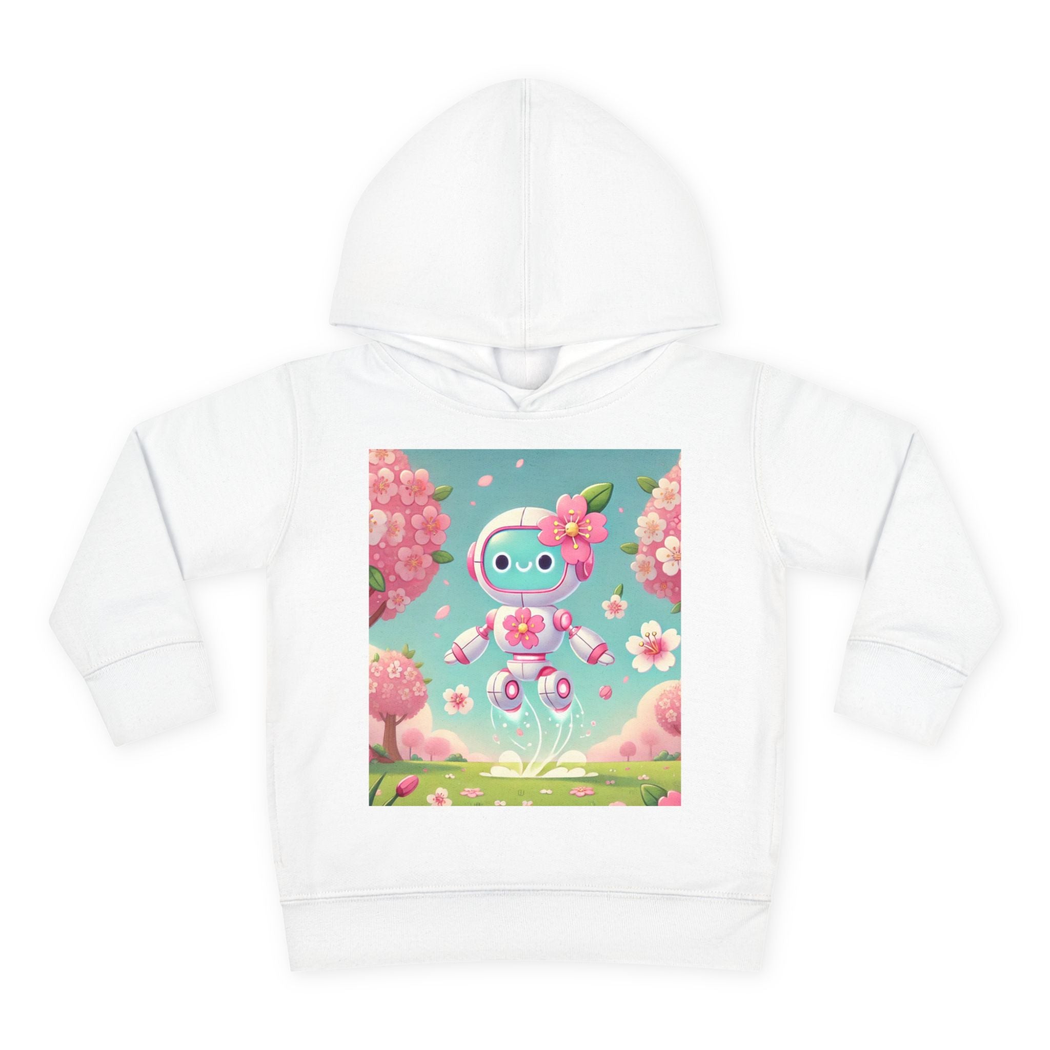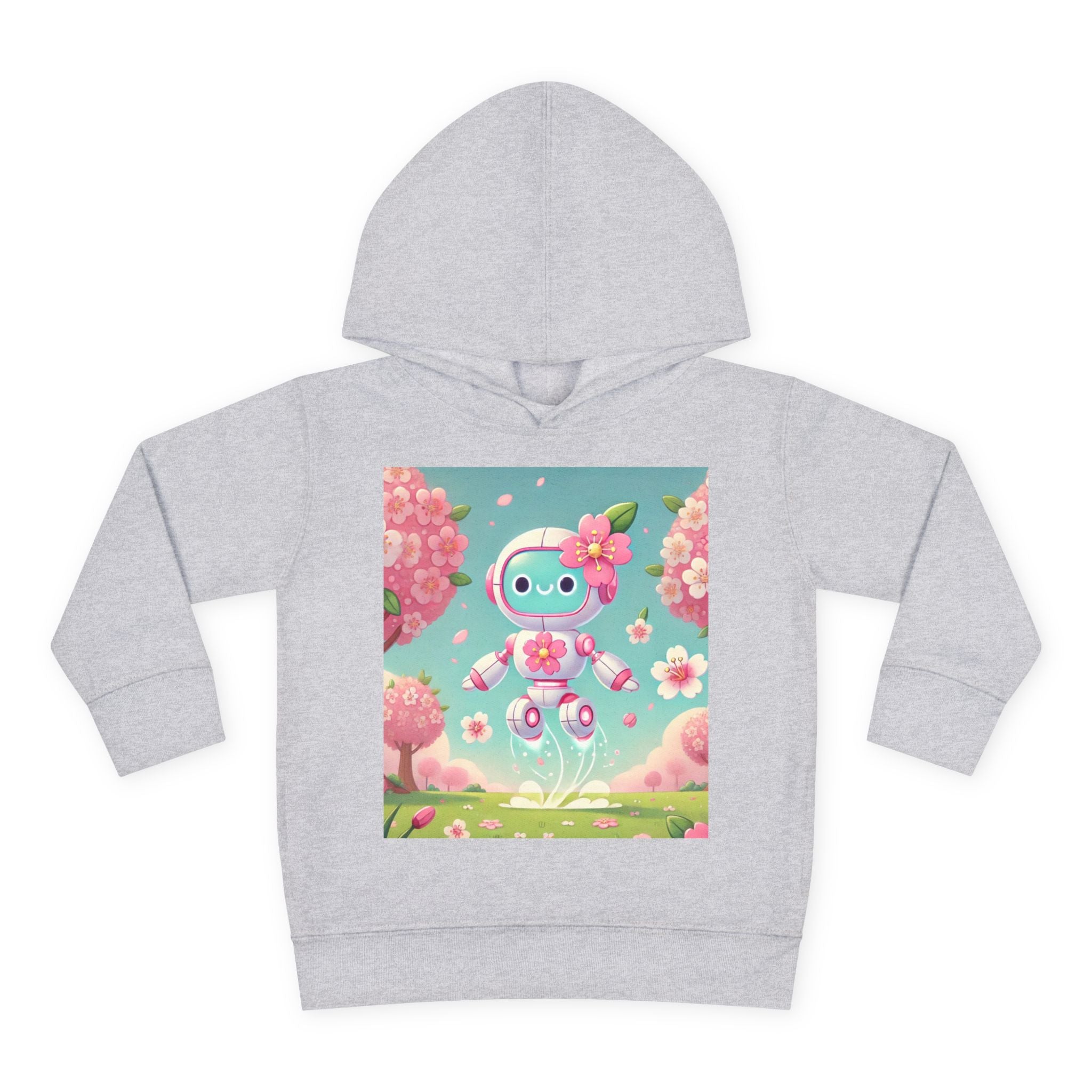 The hoodie features Sakura Sentinel, a heartwarming design where a gentle robot fairy swings gracefully on a flower vine beneath a sky of cherry blossoms. Surrounded by a dreamy forest full of vibrant blooms, this charming scene bridges the magical world of nature with imaginative tech-inspired wonder. A perfect blend of soft fantasy and futuristic charm for your little dreamer.