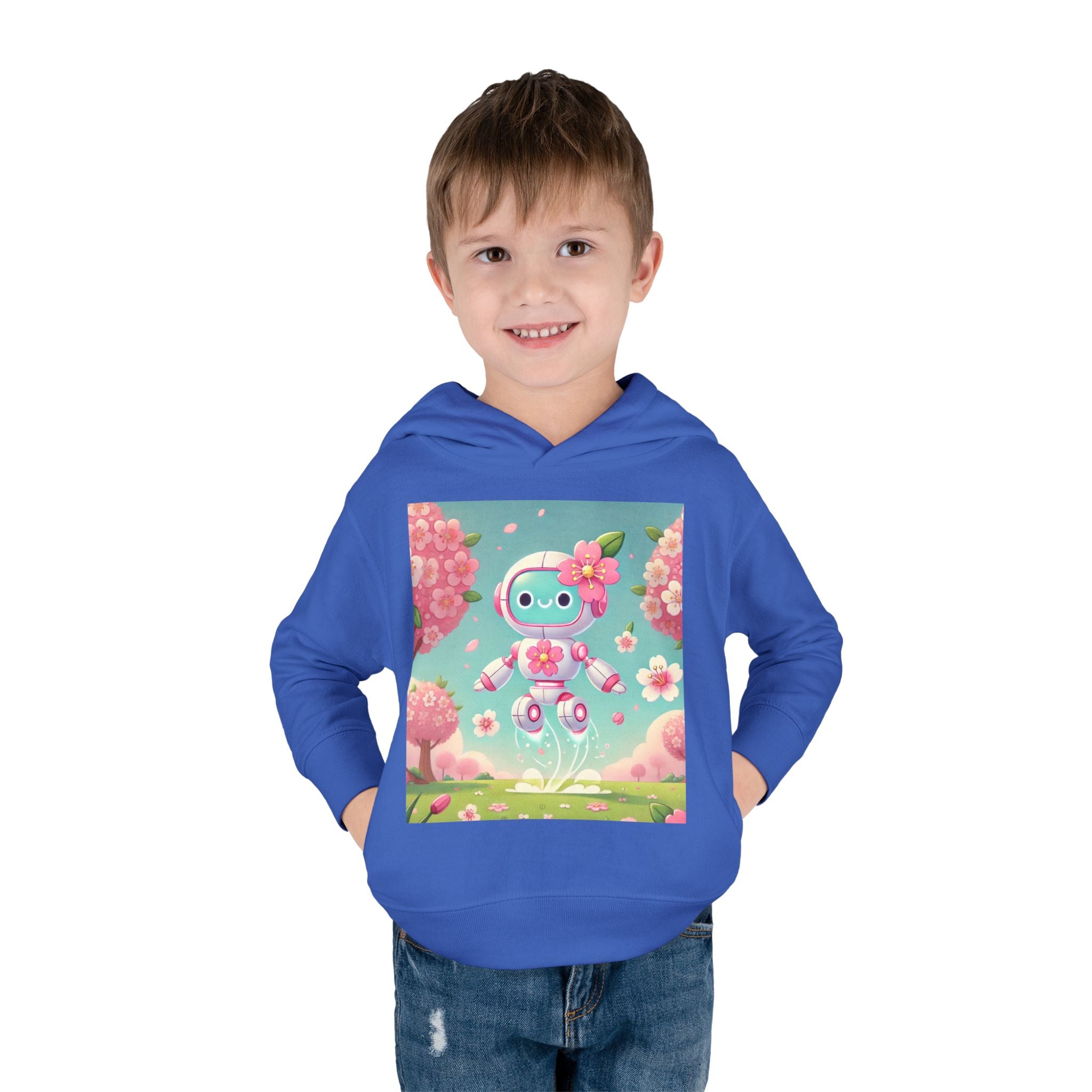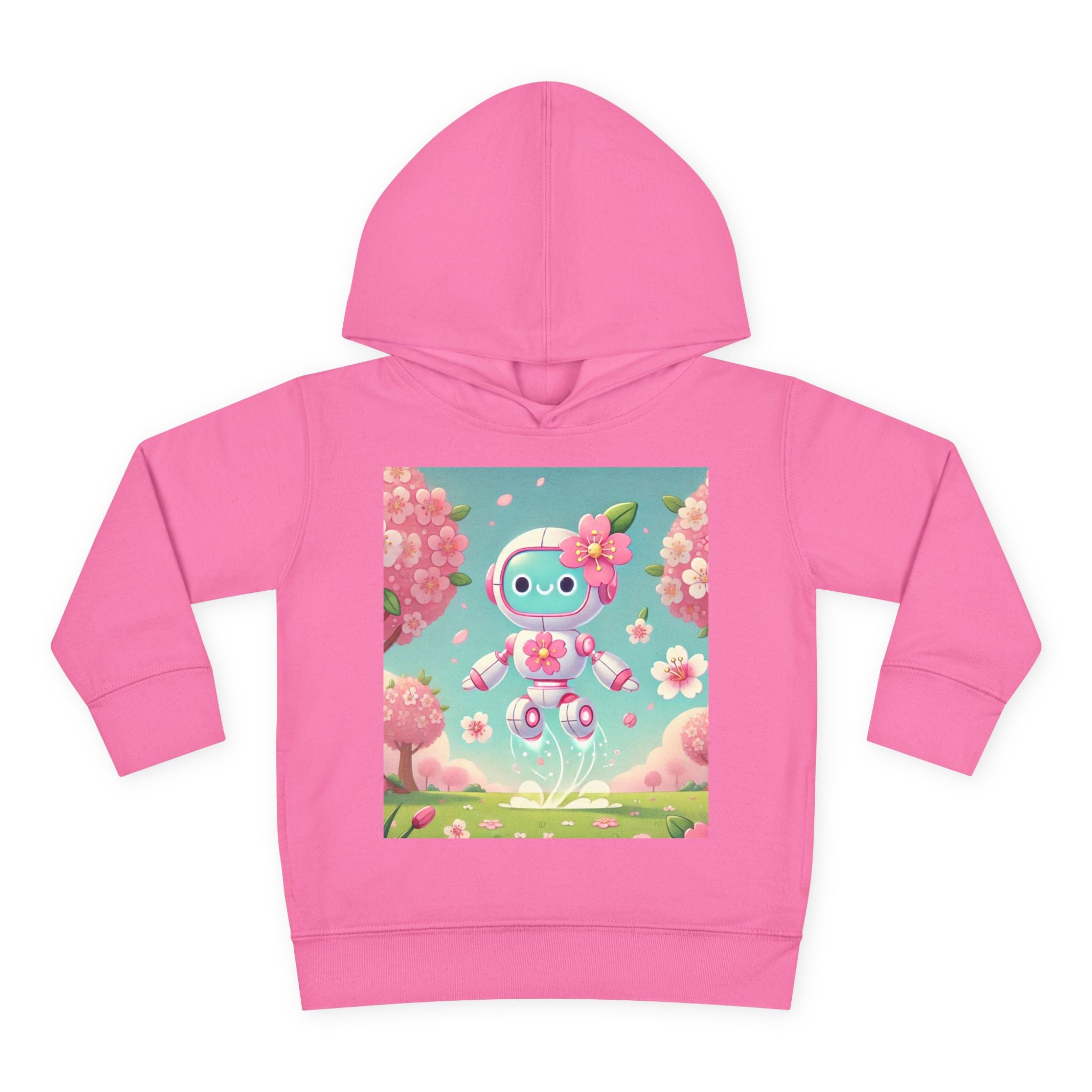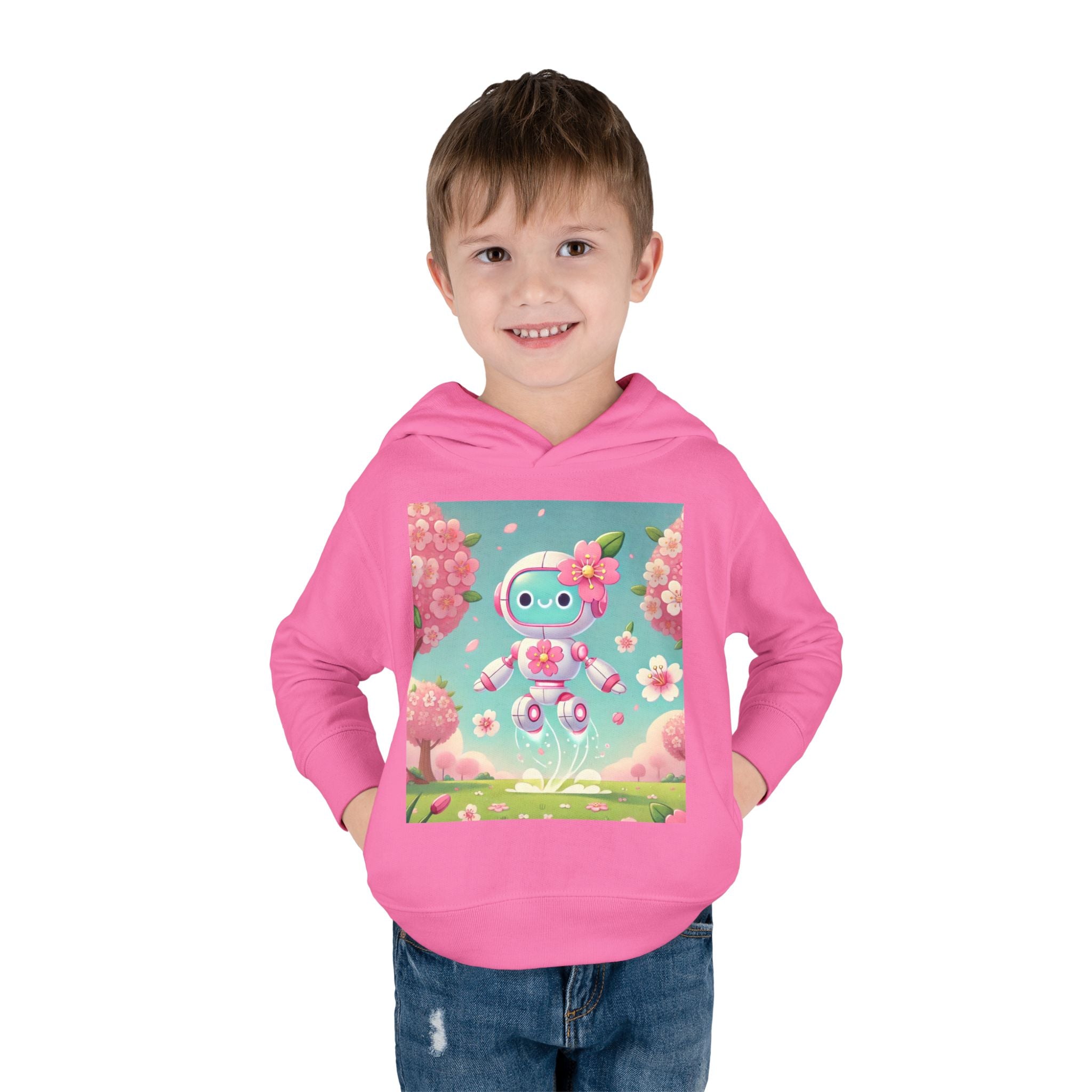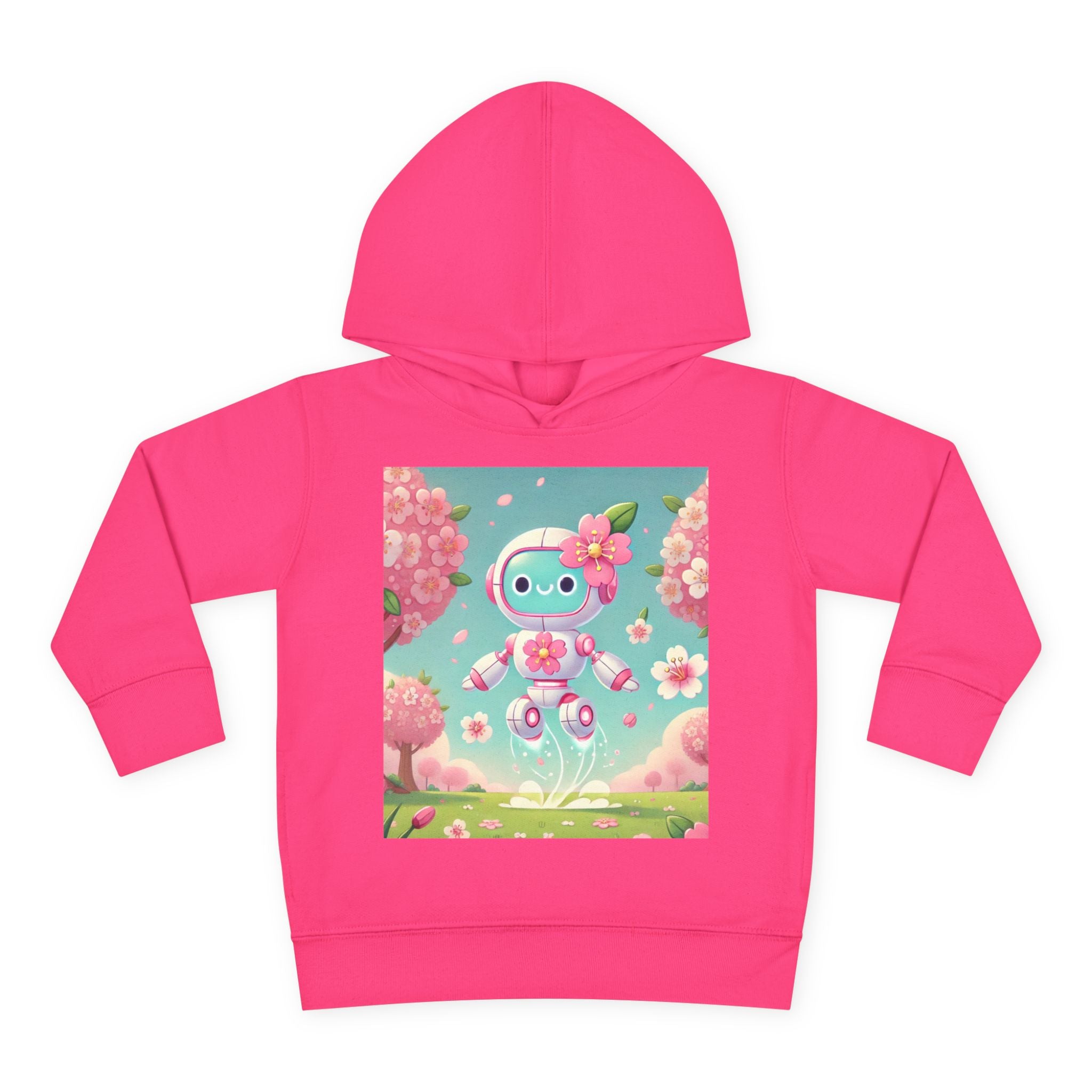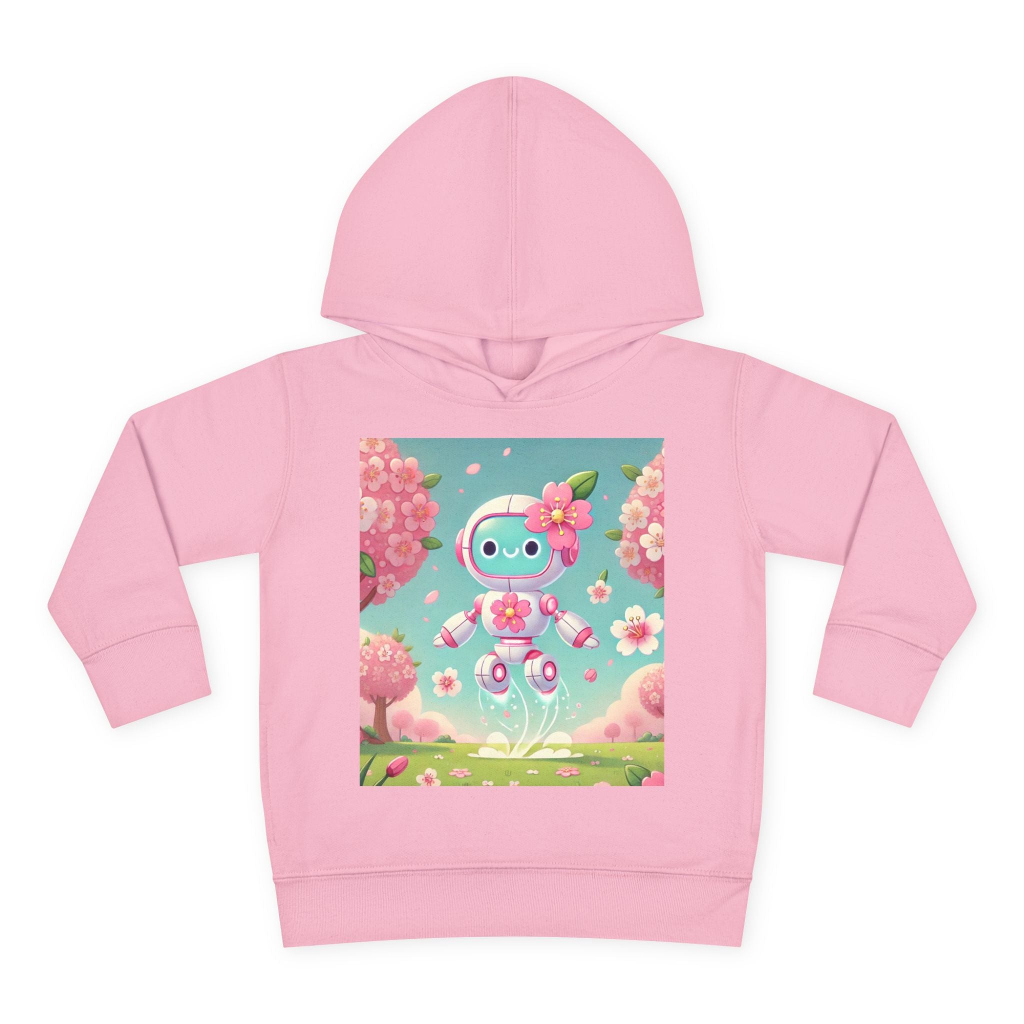 The hoodie features Sakura Sentinel, a heartwarming design where a gentle robot fairy swings gracefully on a flower vine beneath a sky of cherry blossoms. Surrounded by a dreamy forest full of vibrant blooms, this charming scene bridges the magical world of nature with imaginative tech-inspired wonder. A perfect blend of soft fantasy and futuristic charm for your little dreamer.