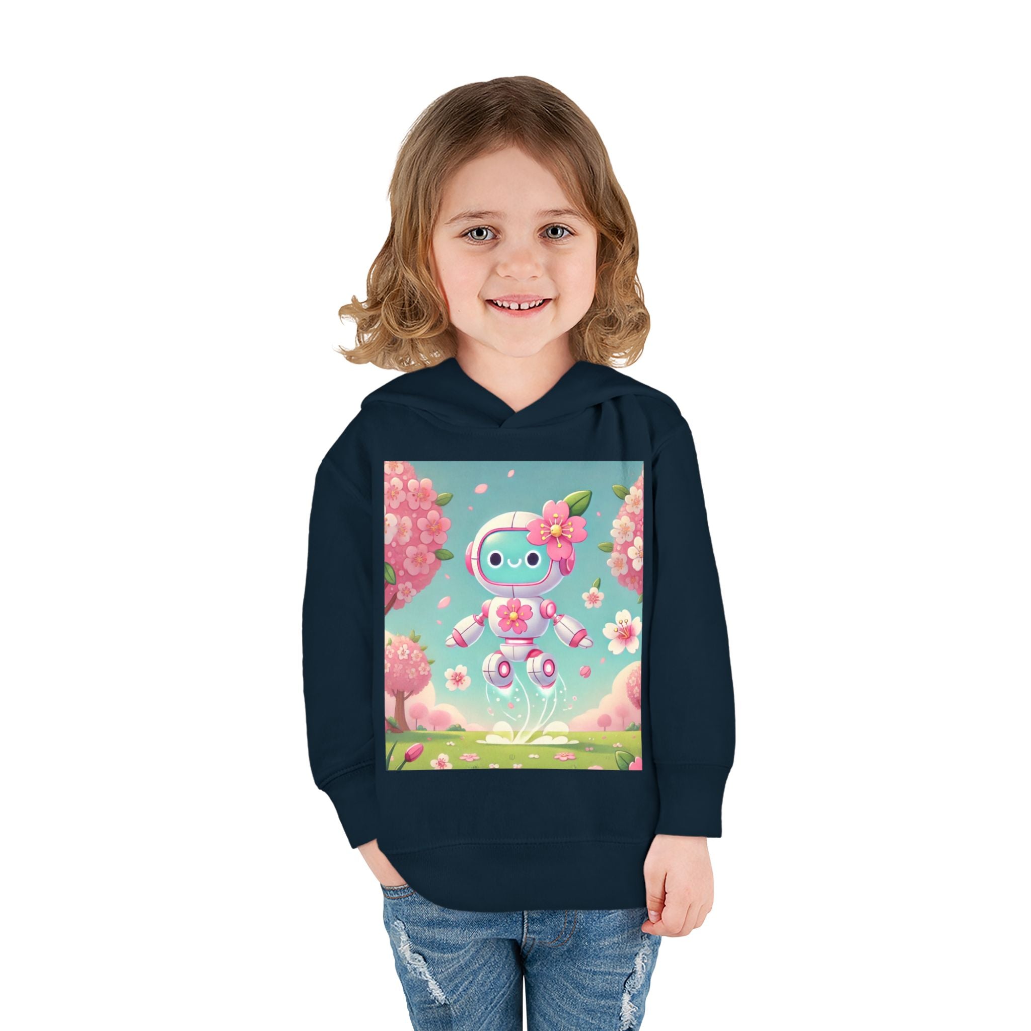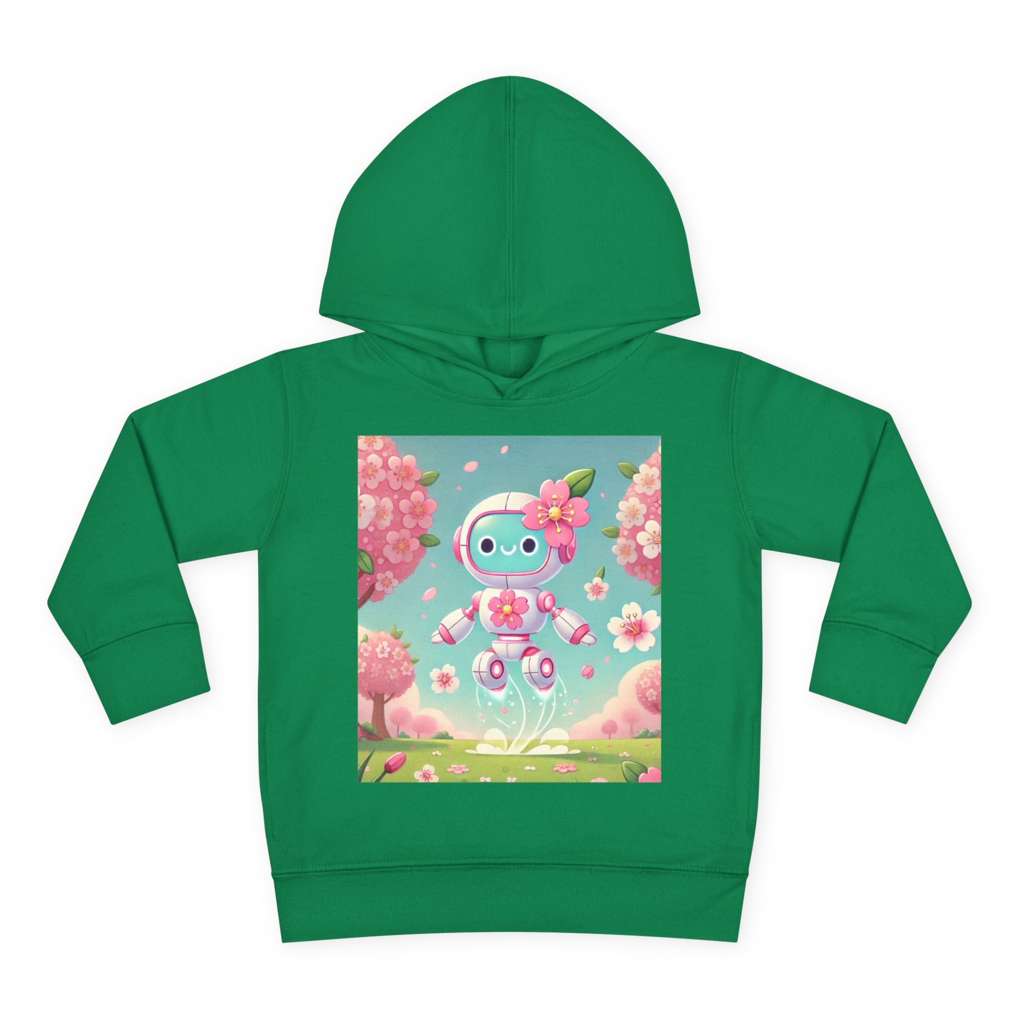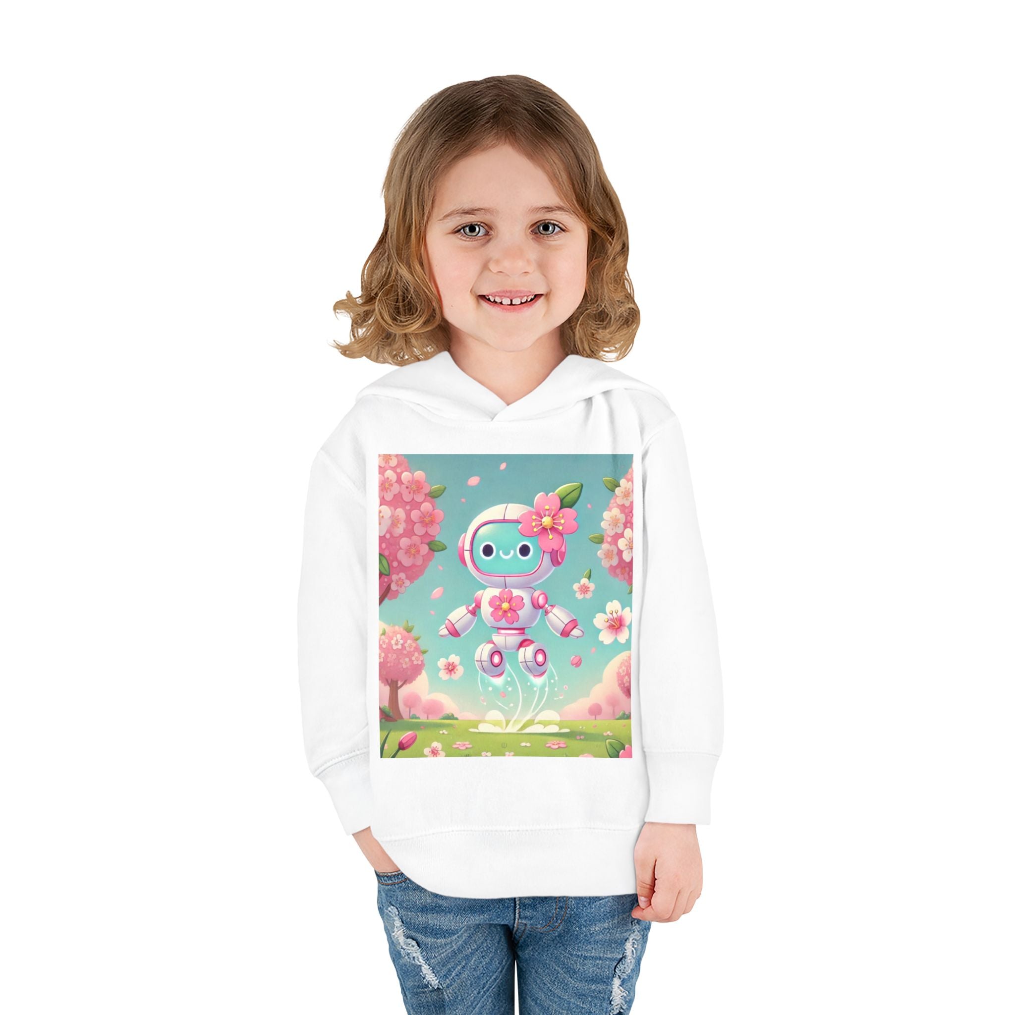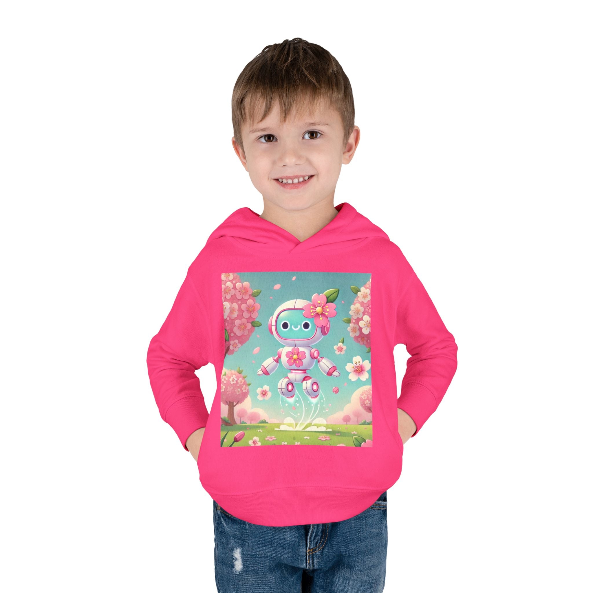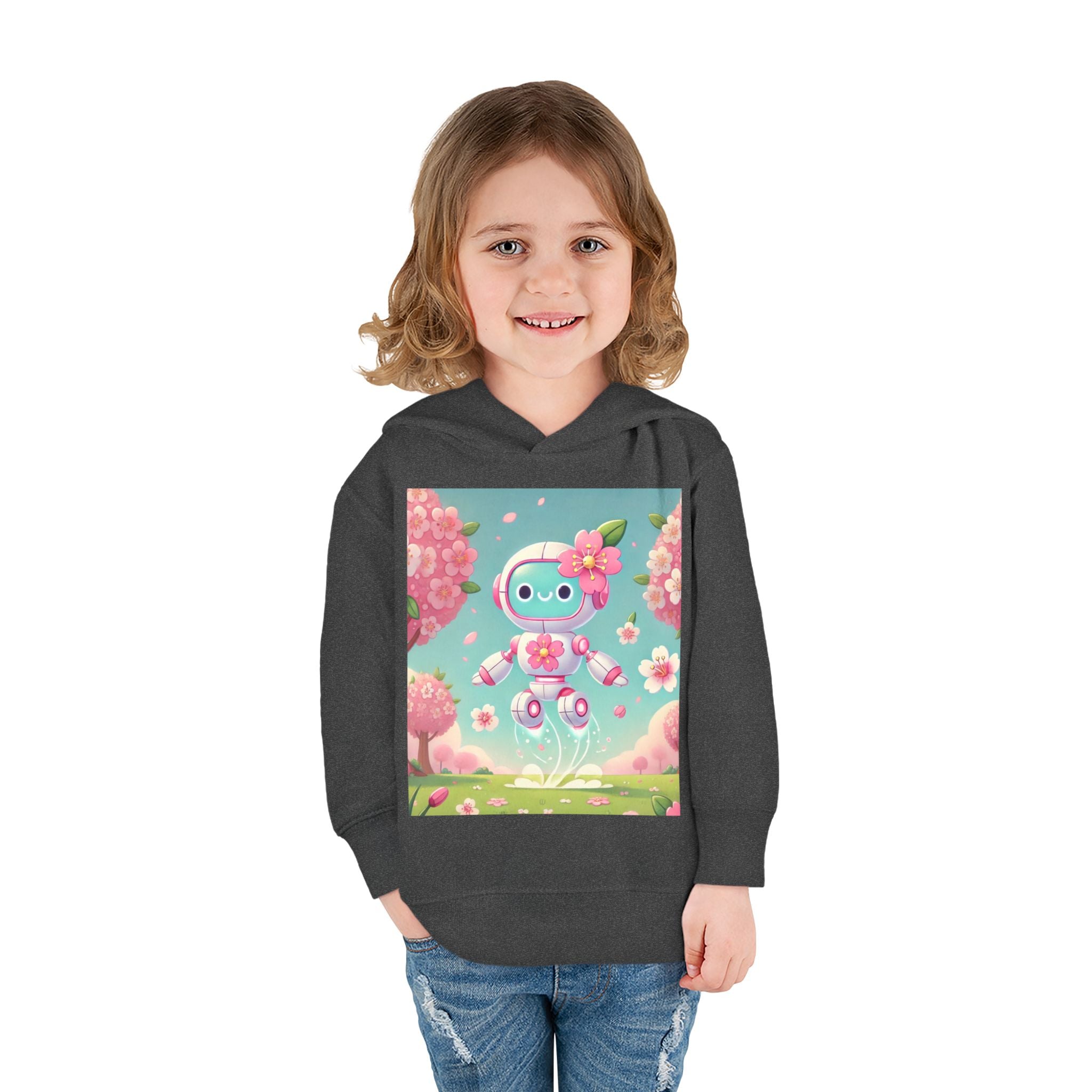 The hoodie features Sakura Sentinel, a heartwarming design where a gentle robot fairy swings gracefully on a flower vine beneath a sky of cherry blossoms. Surrounded by a dreamy forest full of vibrant blooms, this charming scene bridges the magical world of nature with imaginative tech-inspired wonder. A perfect blend of soft fantasy and futuristic charm for your little dreamer.