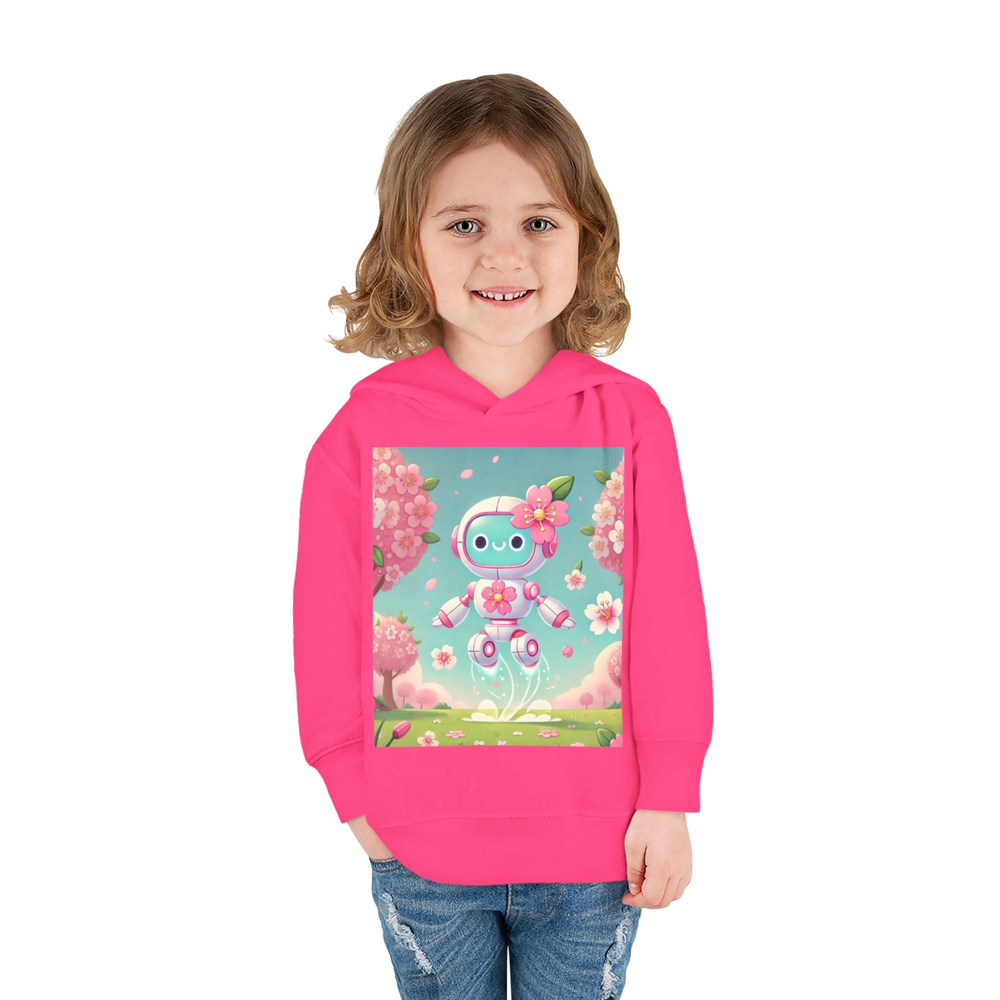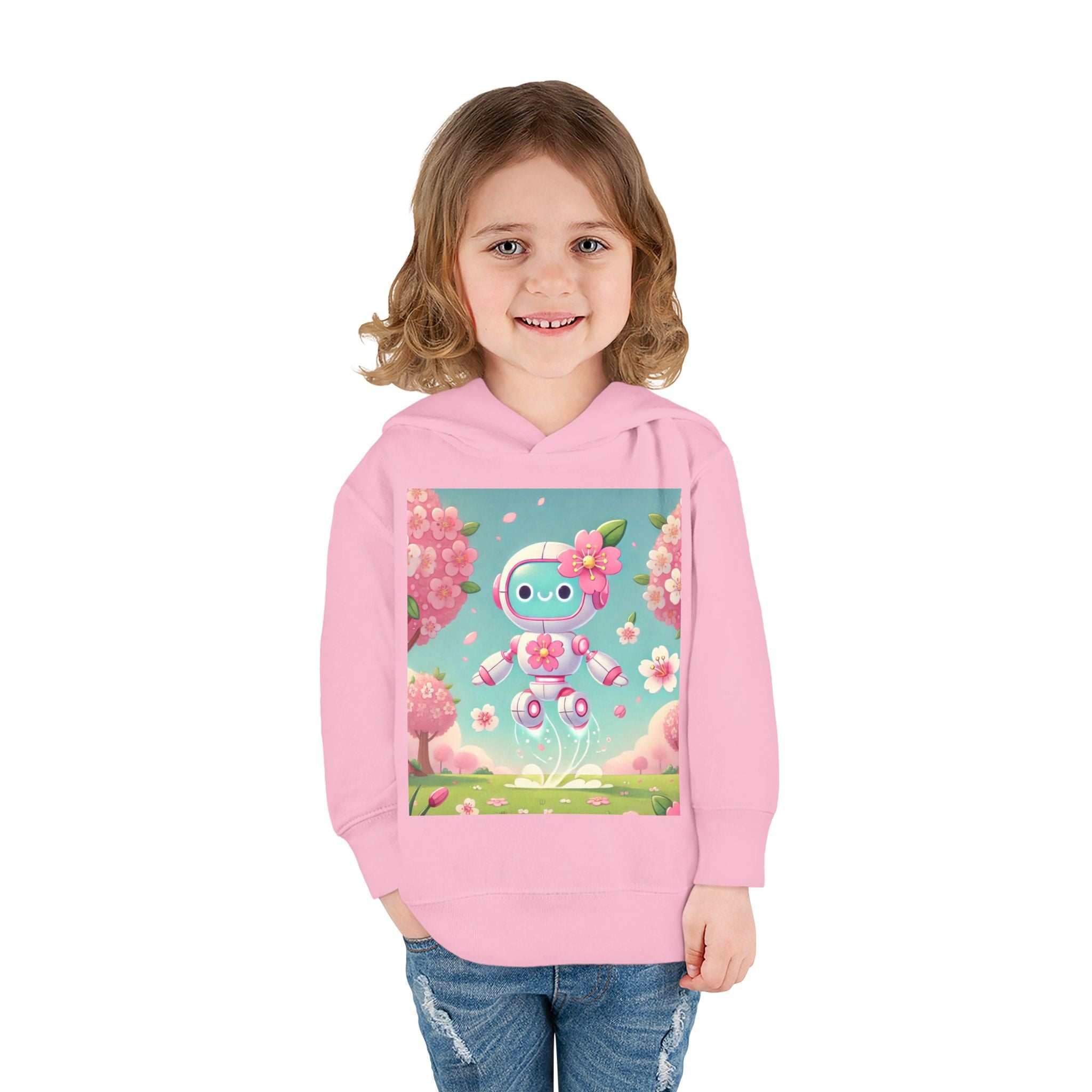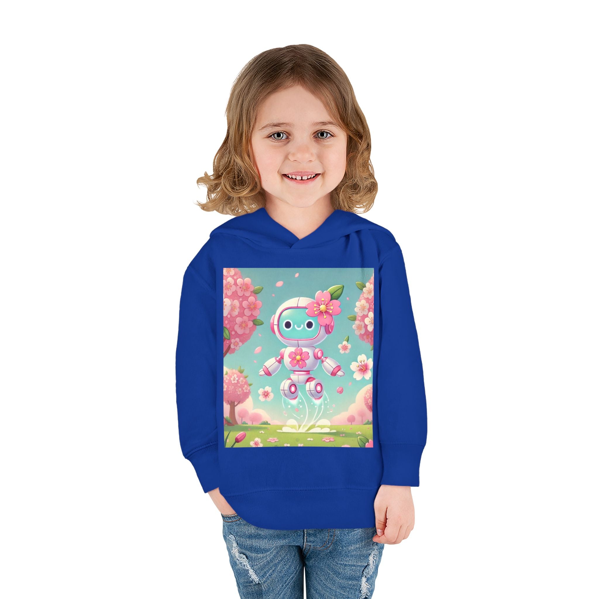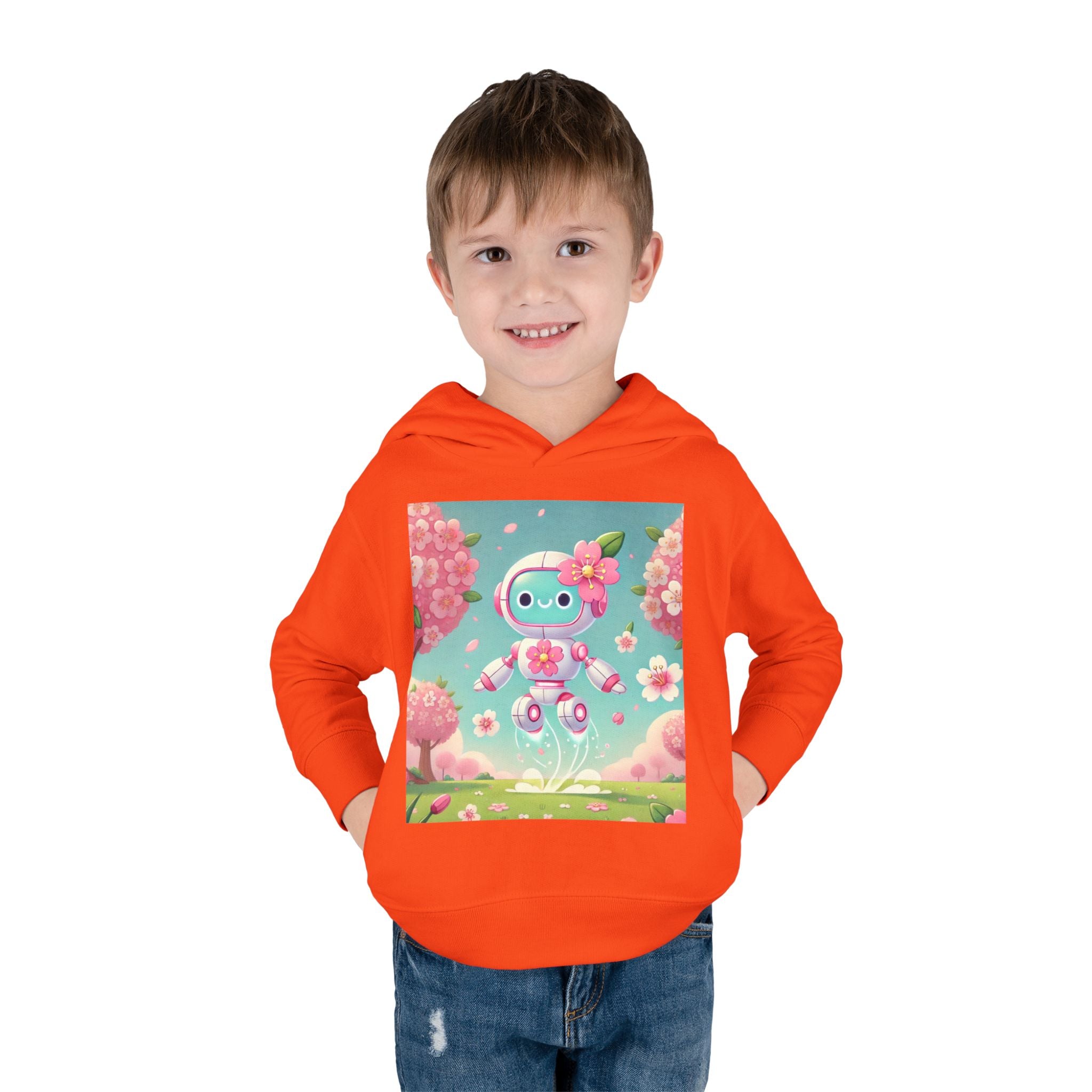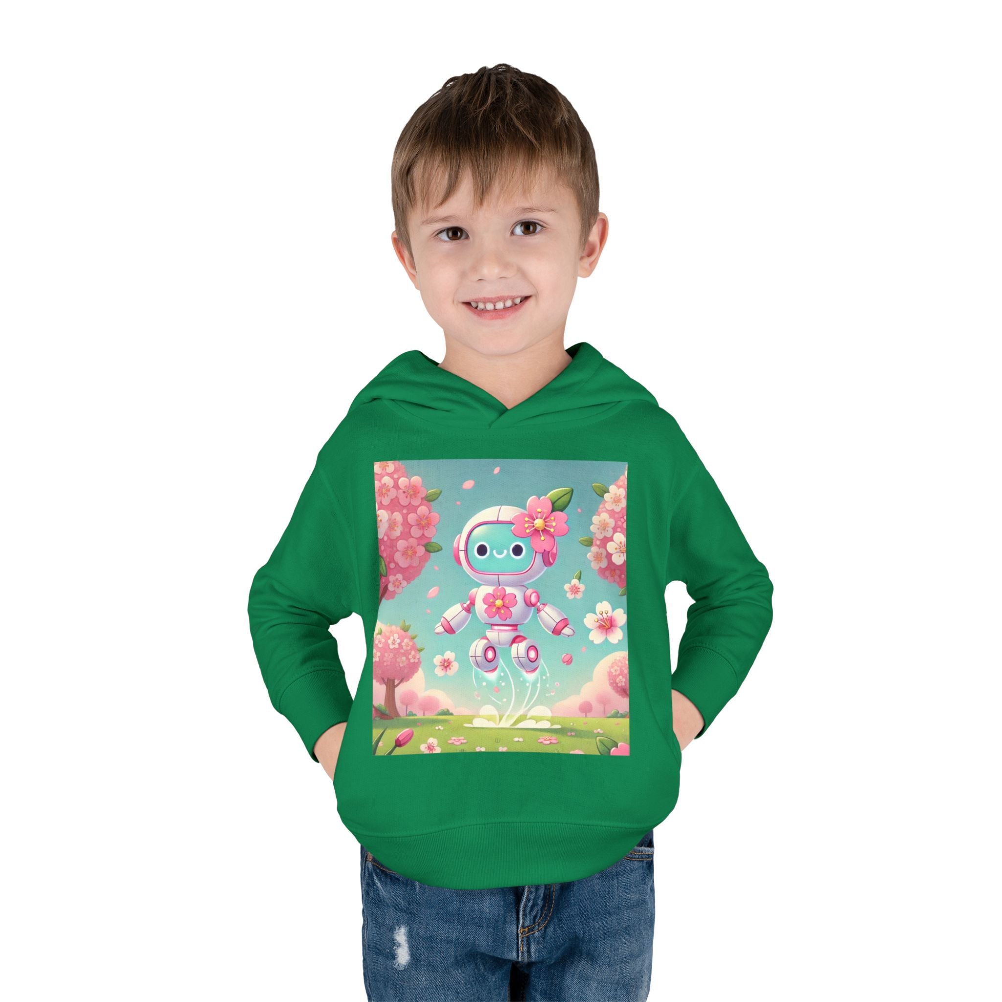The hoodie features Sakura Sentinel, a heartwarming design where a gentle robot fairy swings gracefully on a flower vine beneath a sky of cherry blossoms. Surrounded by a dreamy forest full of vibrant blooms, this charming scene bridges the magical world of nature with imaginative tech-inspired wonder. A perfect blend of soft fantasy and futuristic charm for your little dreamer.