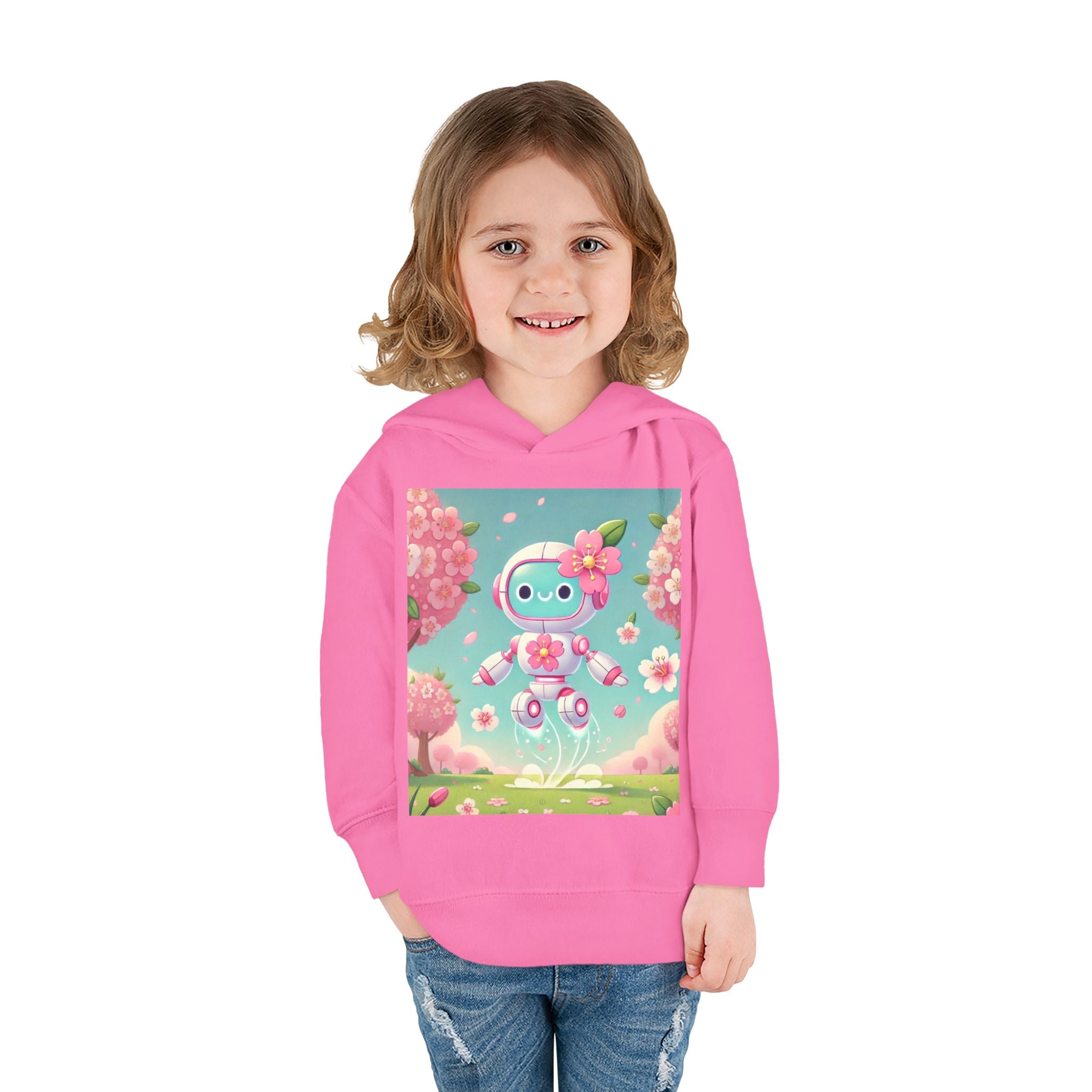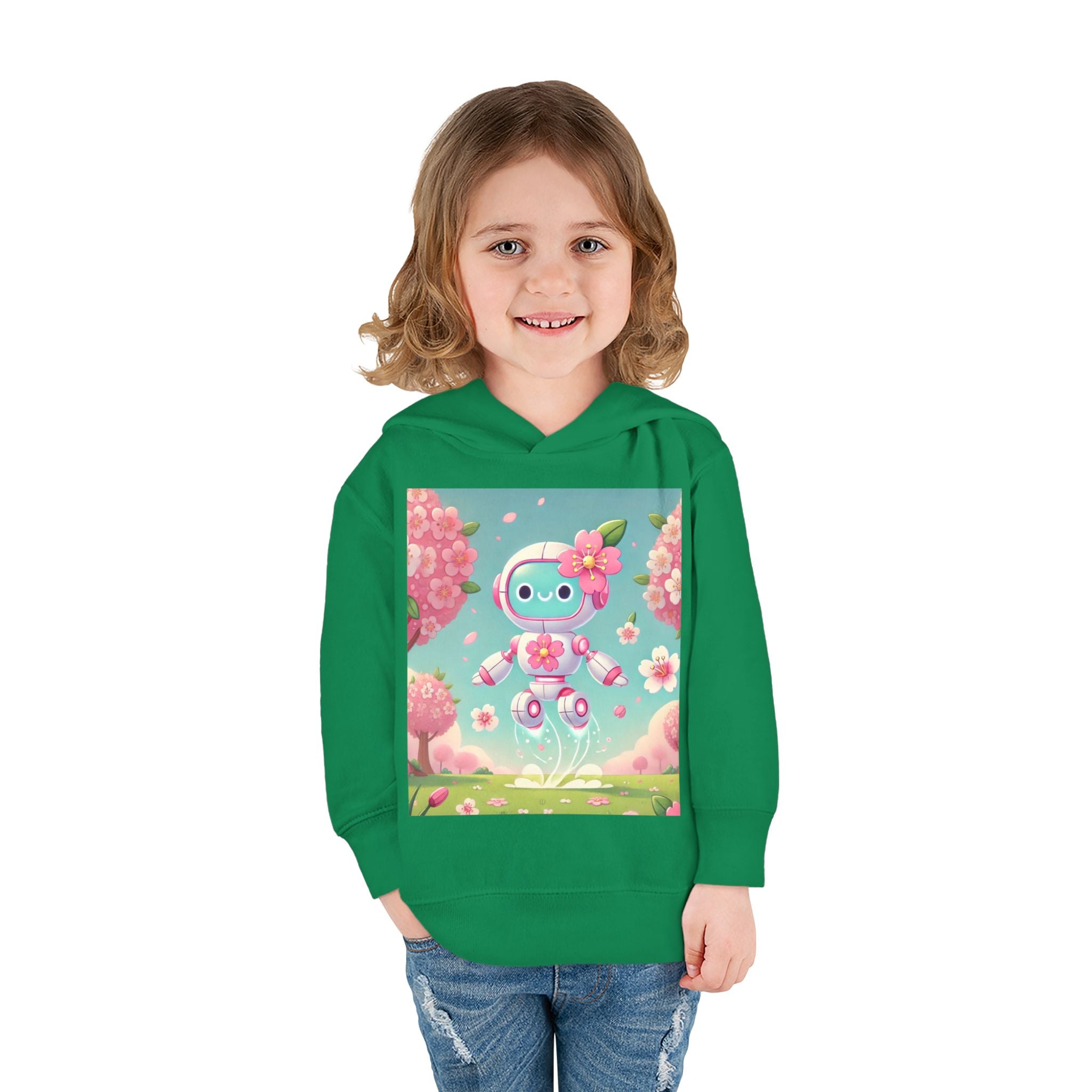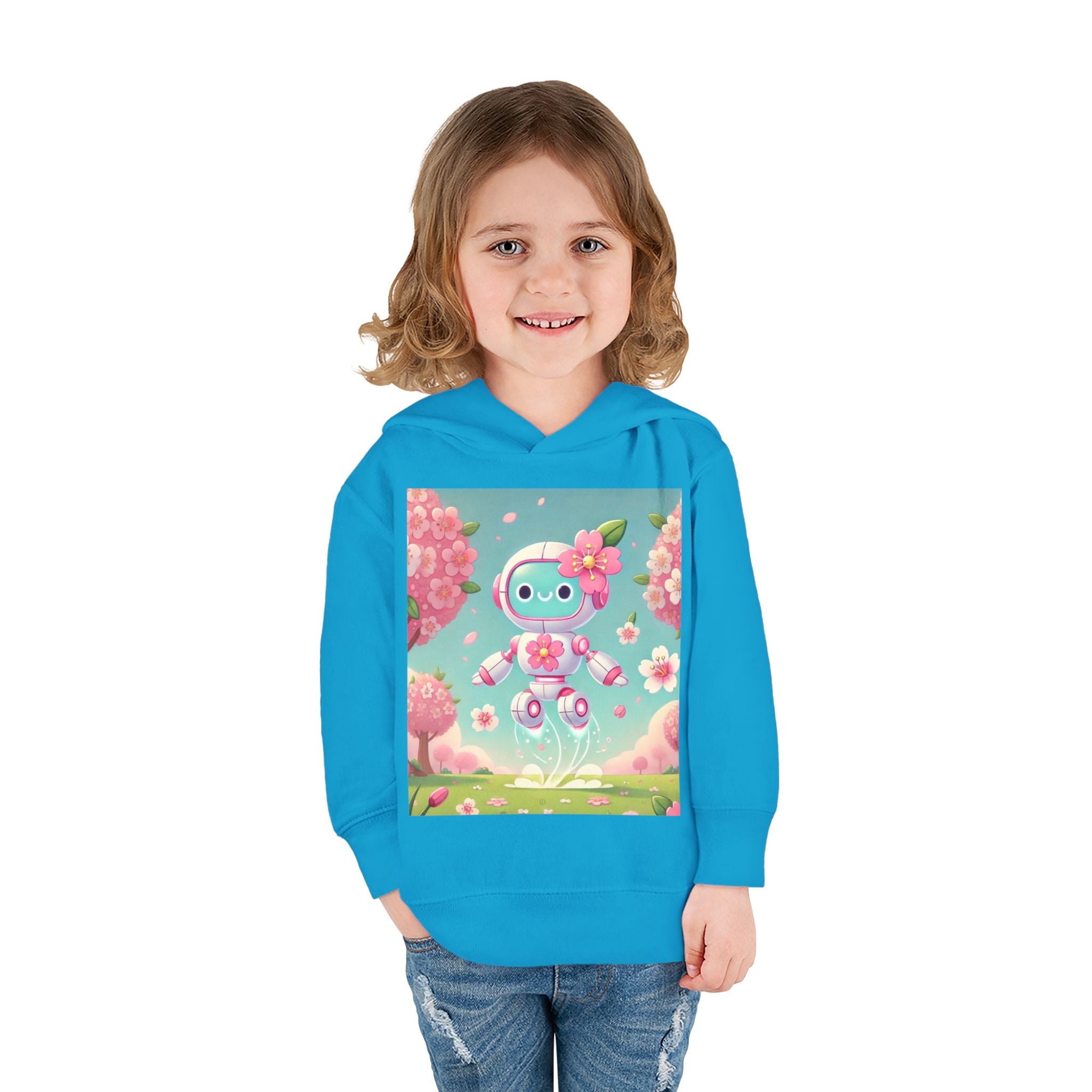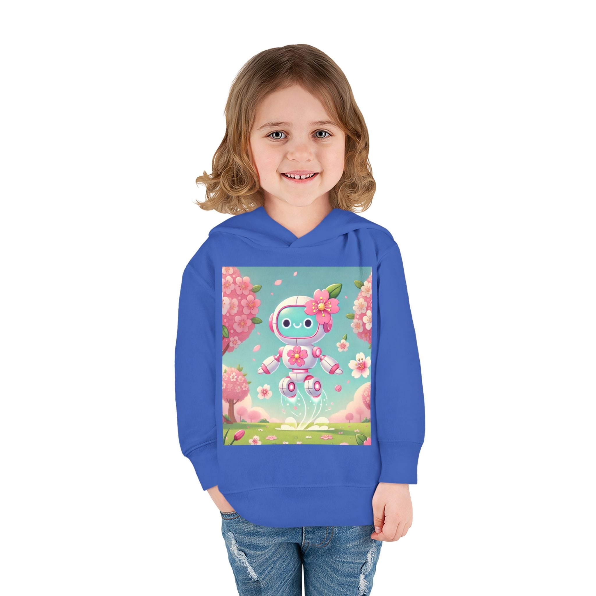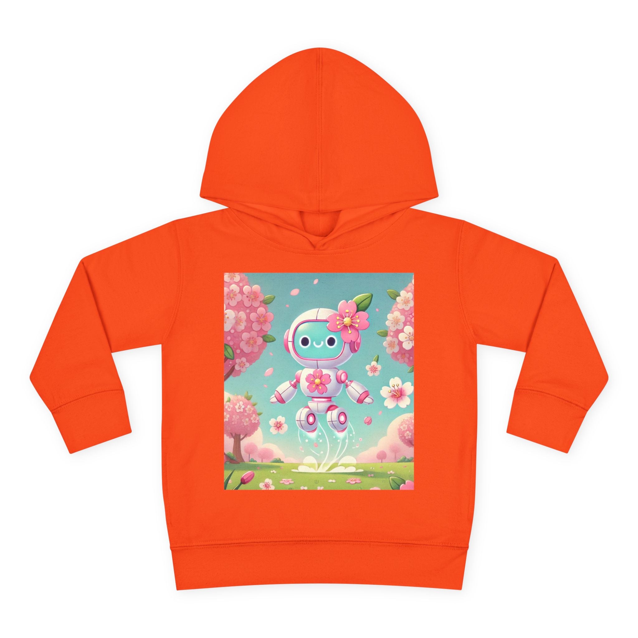 The hoodie features Sakura Sentinel, a heartwarming design where a gentle robot fairy swings gracefully on a flower vine beneath a sky of cherry blossoms. Surrounded by a dreamy forest full of vibrant blooms, this charming scene bridges the magical world of nature with imaginative tech-inspired wonder. A perfect blend of soft fantasy and futuristic charm for your little dreamer.