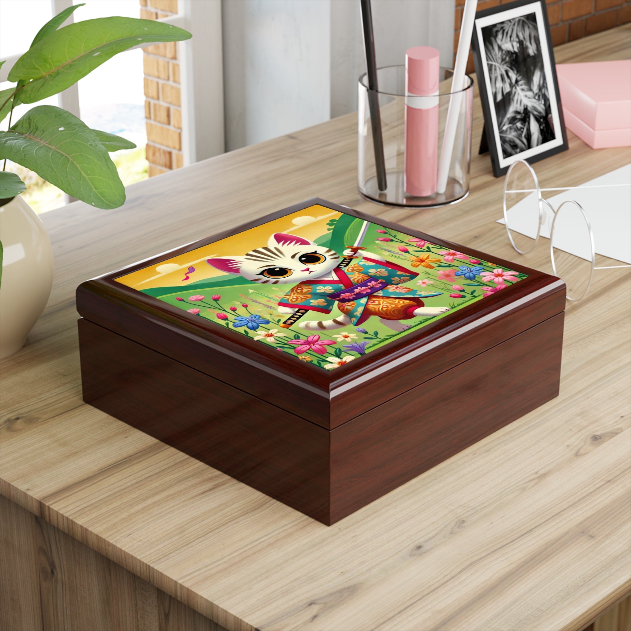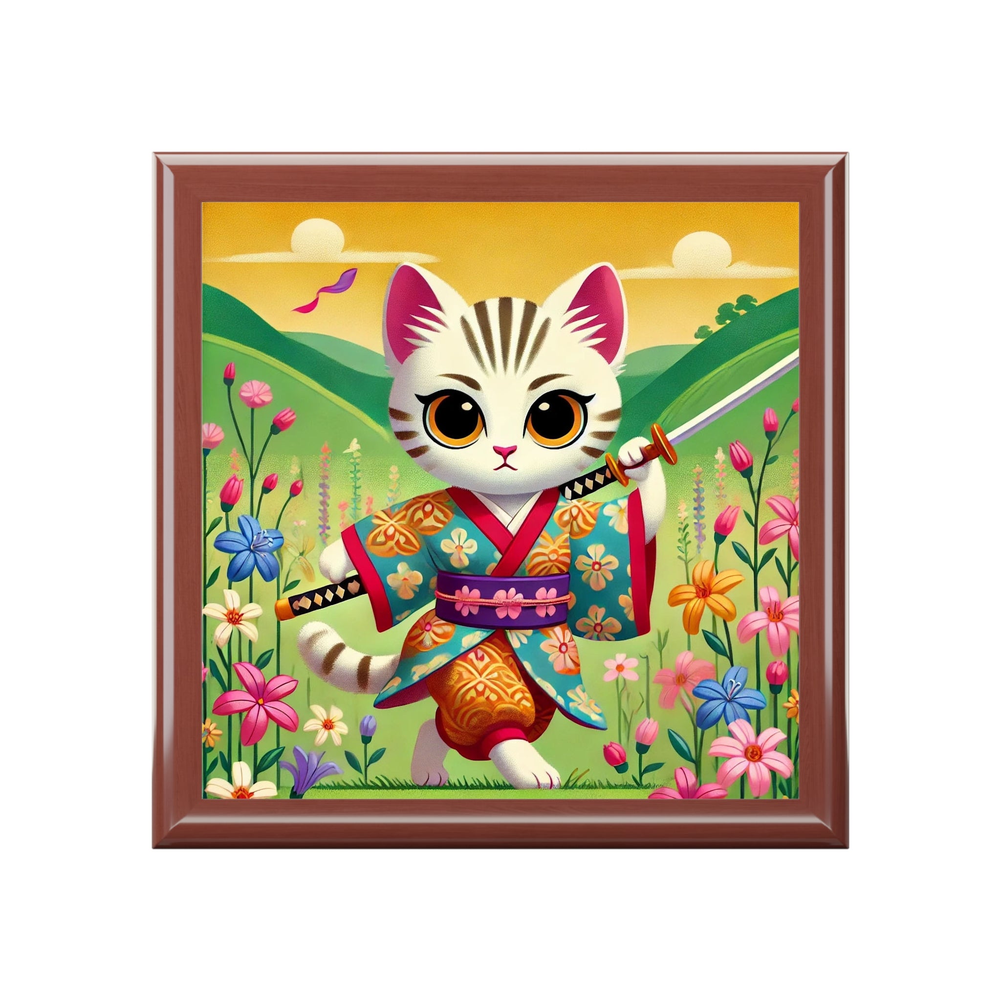 Samurai Kitten Jewelry Box turns your everyday storage into a playful little legend. On the glossy ceramic tile lid, a bold kitten dressed in a beautifully patterned kimono strides confidently through a serene landscape, wooden sword in paw. The whimsical illustration blends traditional samurai motifs with charming feline mischief, making this jewelry box feel like a tiny storybook scene perched on your dresser or nightstand.