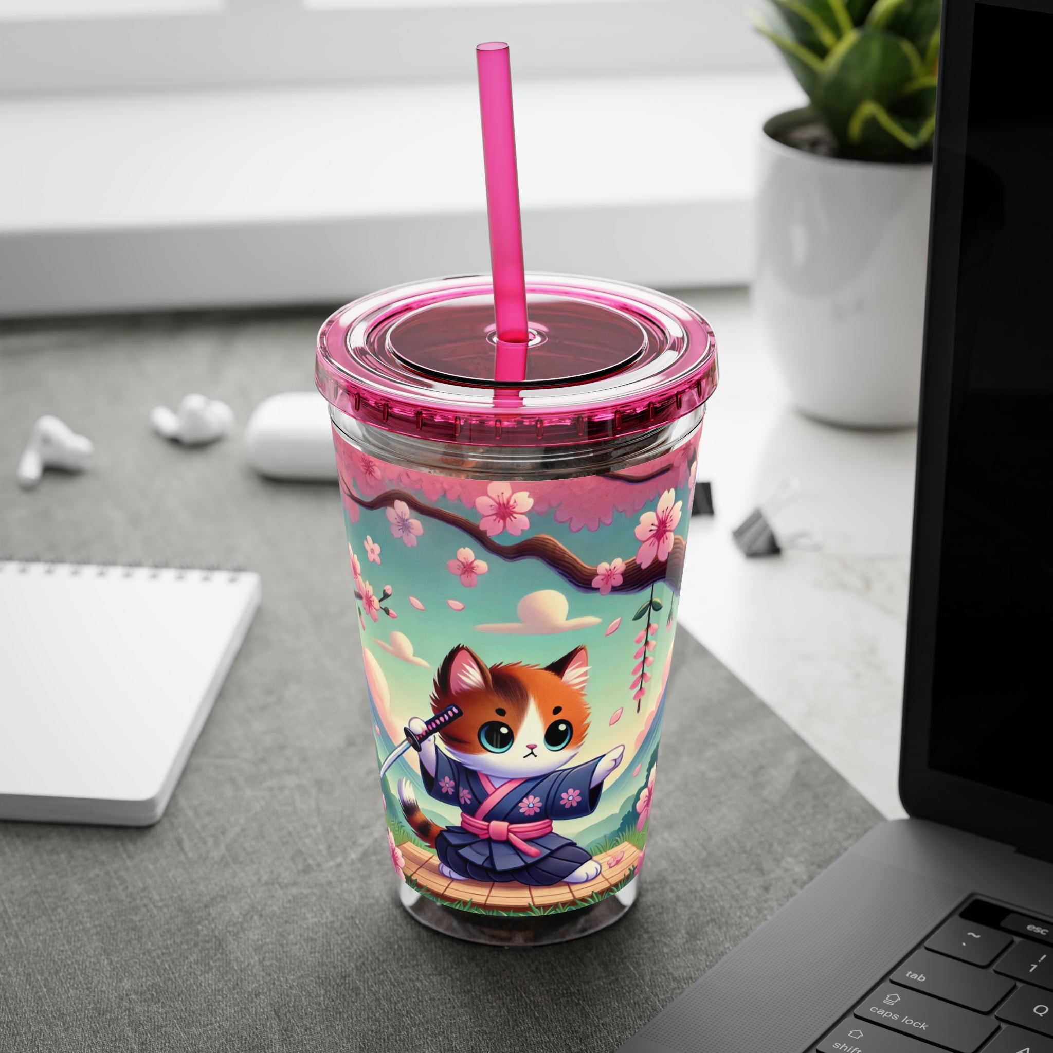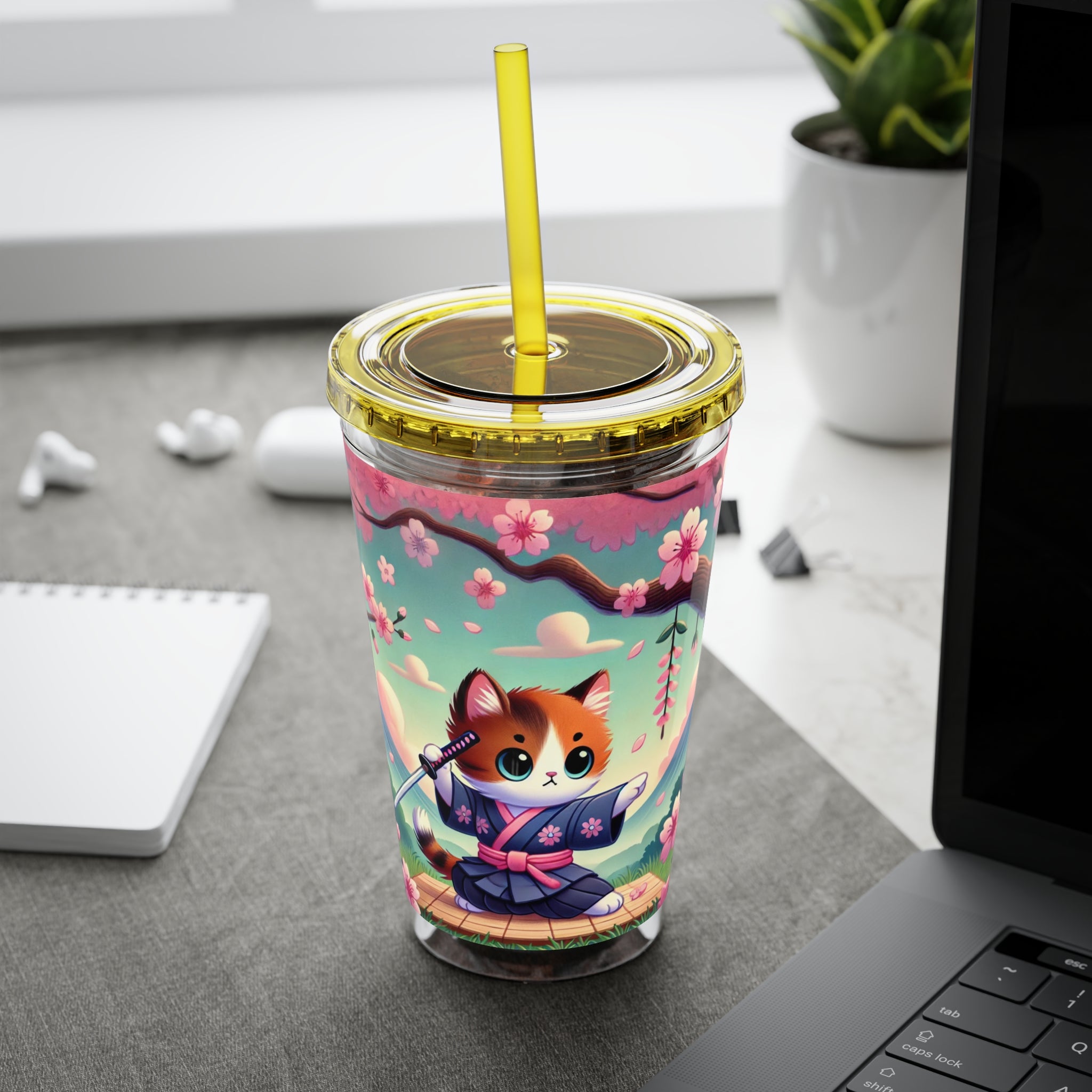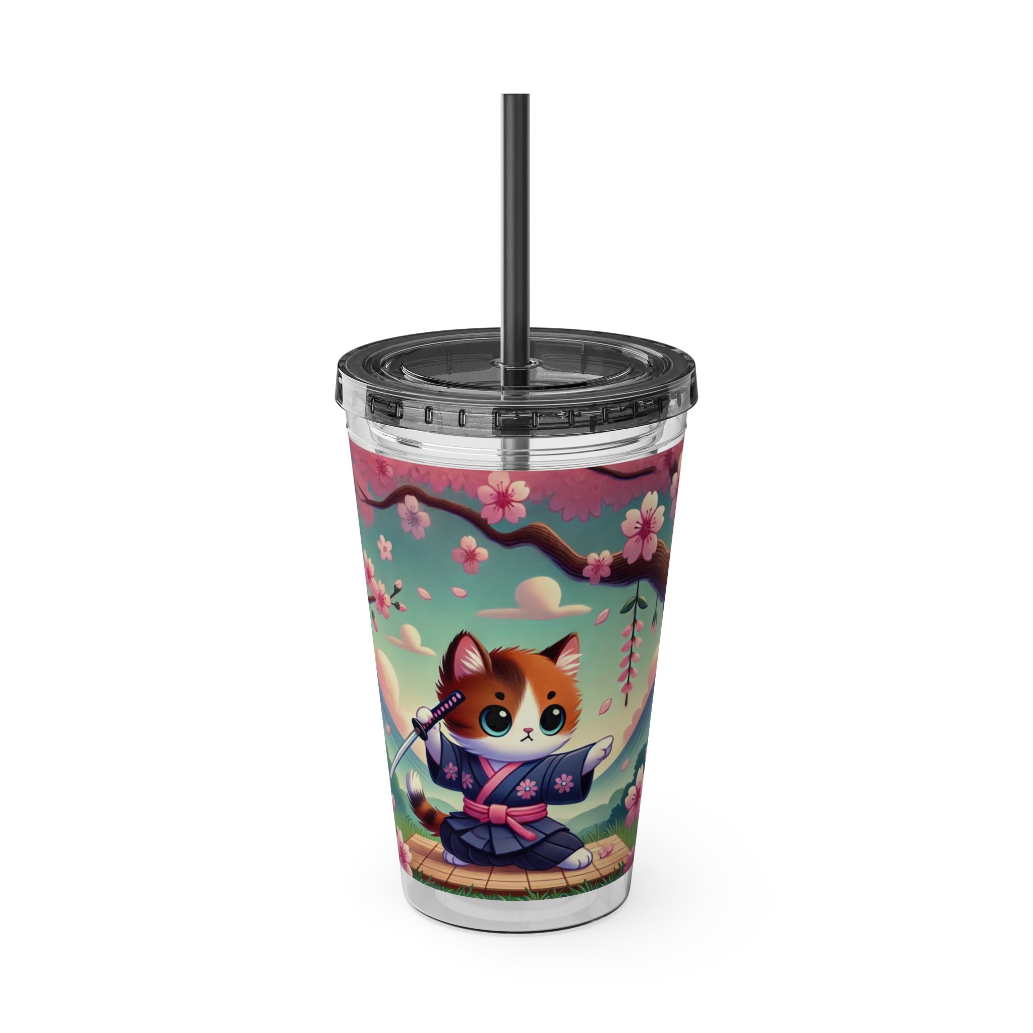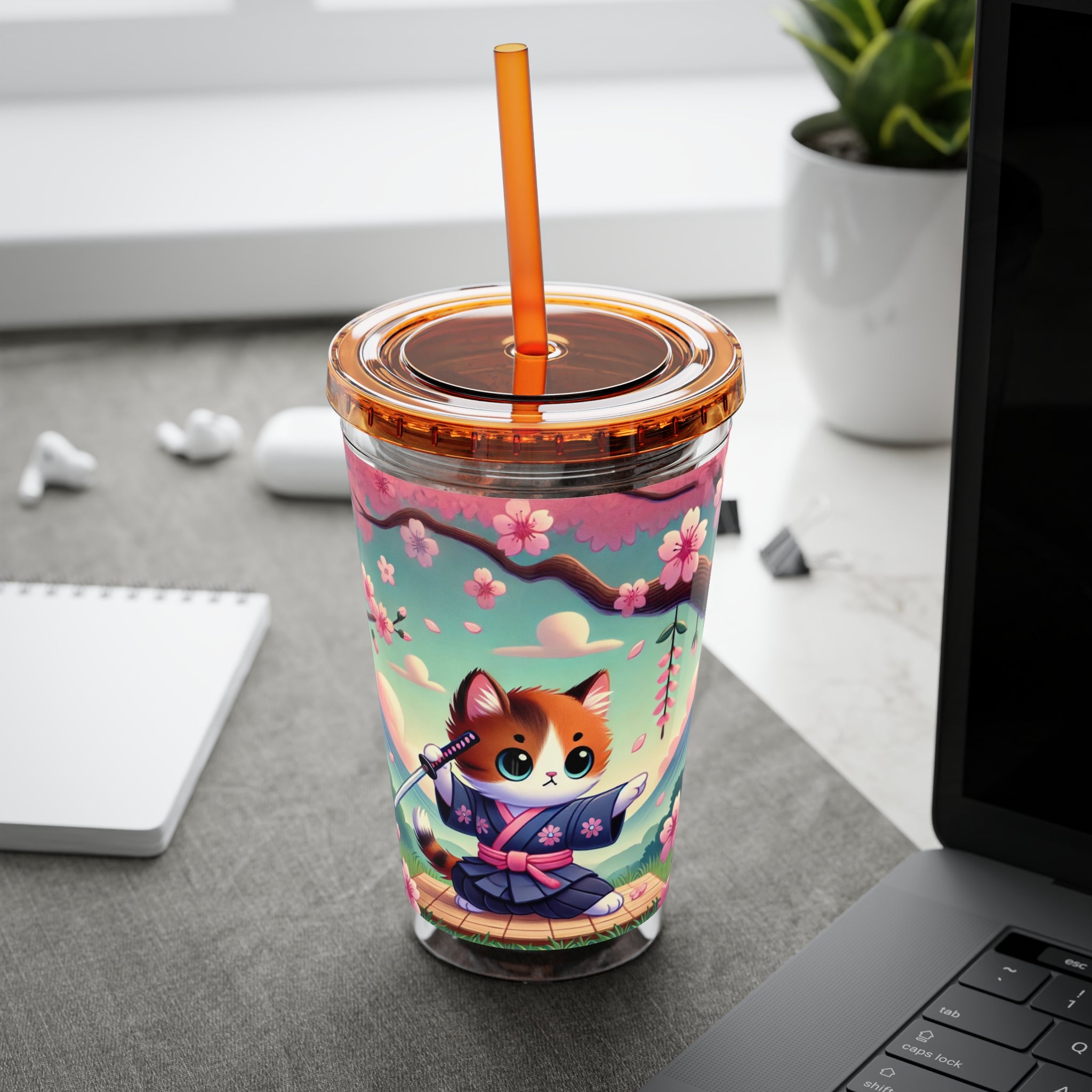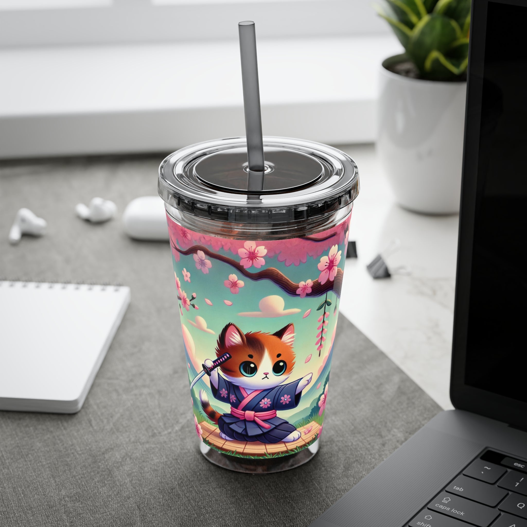 Stay refreshed in style with the Samurai Kitten Sunsplash Tumbler. Featuring a whimsical artwork of a skilled kitten dressed in a traditional samurai kimono, gracefully practicing precise sword techniques under a blooming cherry blossom tree, this design blends strength with serenity. Soft pink petals drift through the air, adding a peaceful yet dynamic touch to this everyday essential.