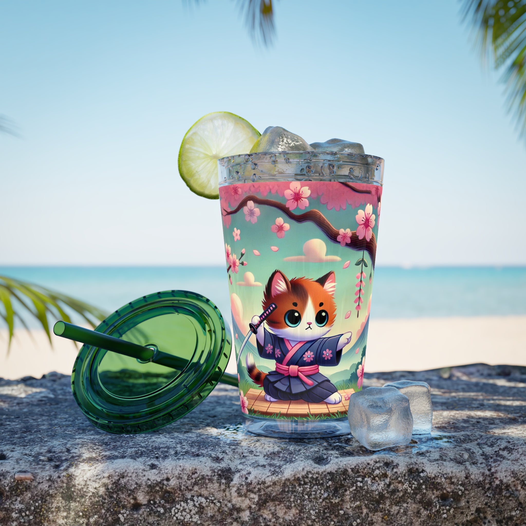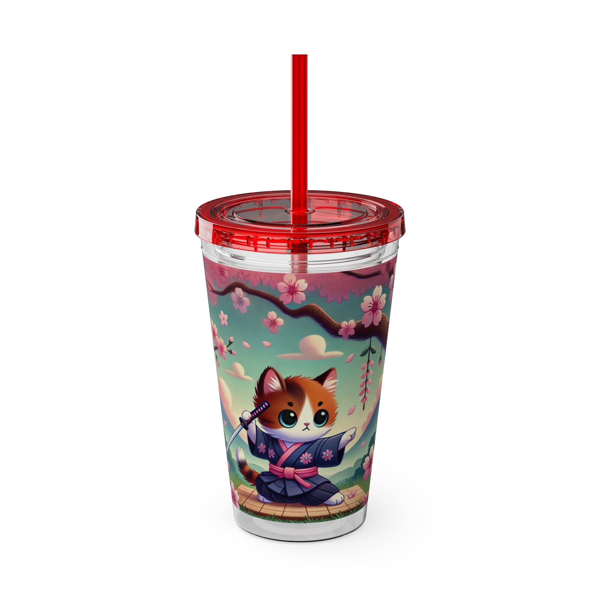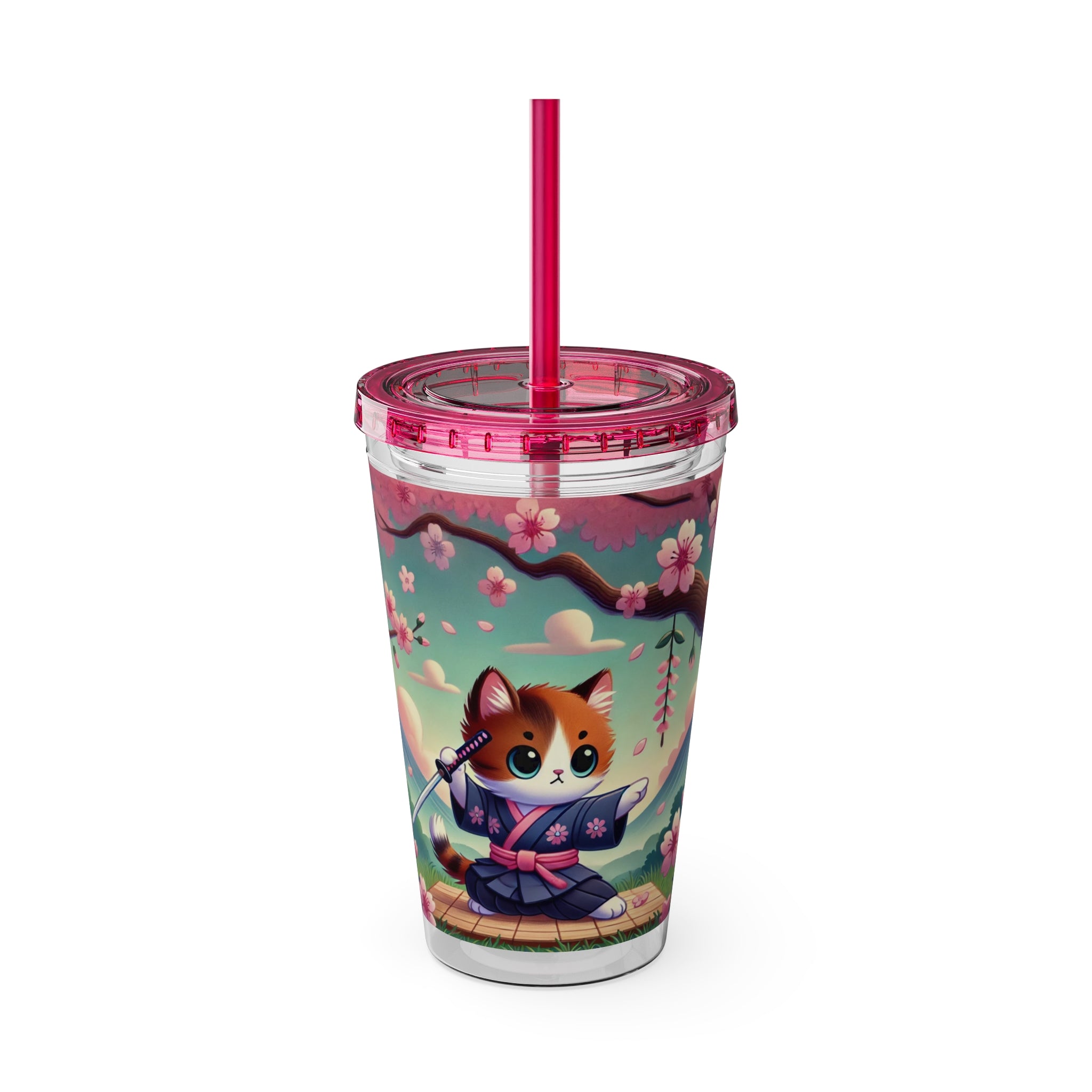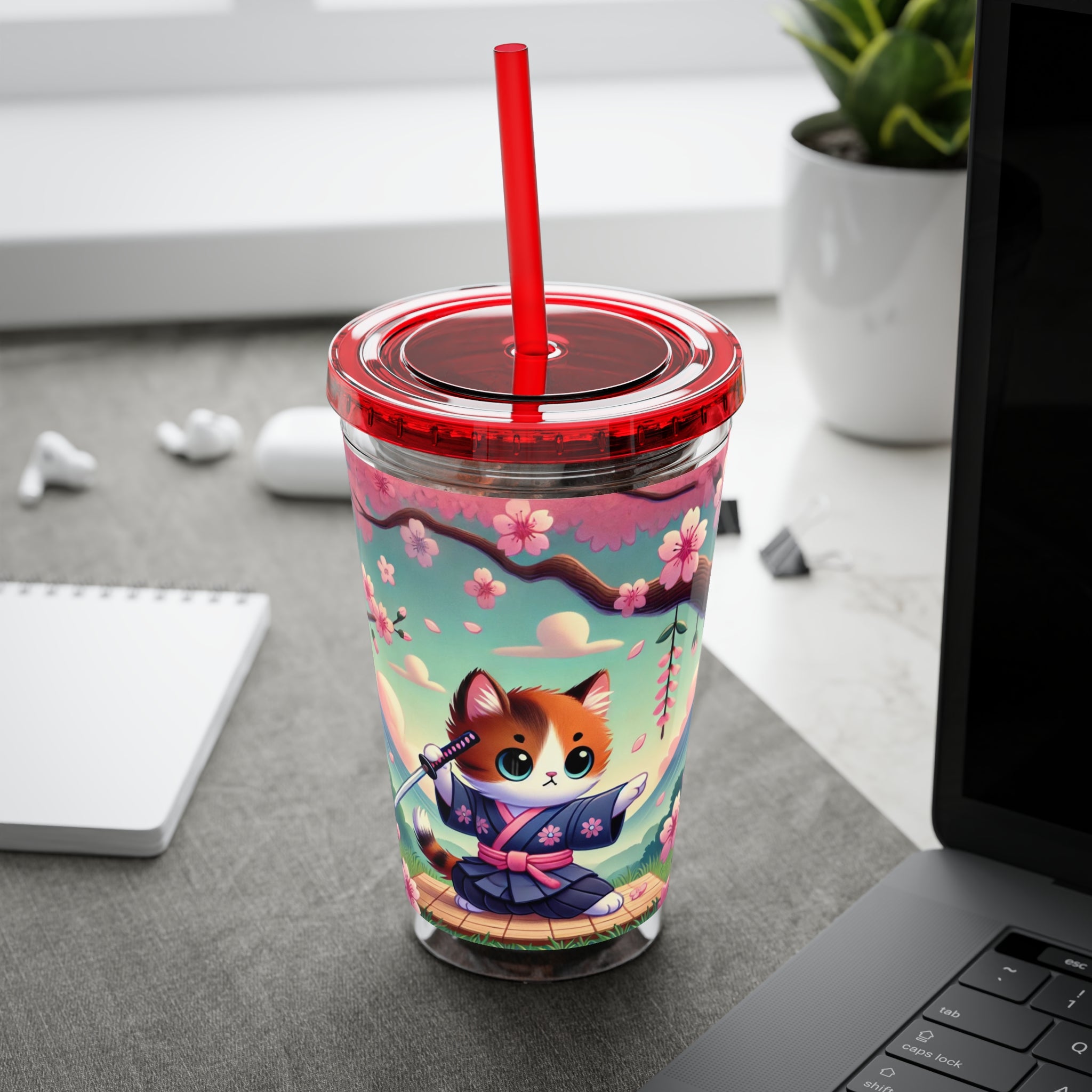 Stay refreshed in style with the Samurai Kitten Sunsplash Tumbler. Featuring a whimsical artwork of a skilled kitten dressed in a traditional samurai kimono, gracefully practicing precise sword techniques under a blooming cherry blossom tree, this design blends strength with serenity. Soft pink petals drift through the air, adding a peaceful yet dynamic touch to this everyday essential.