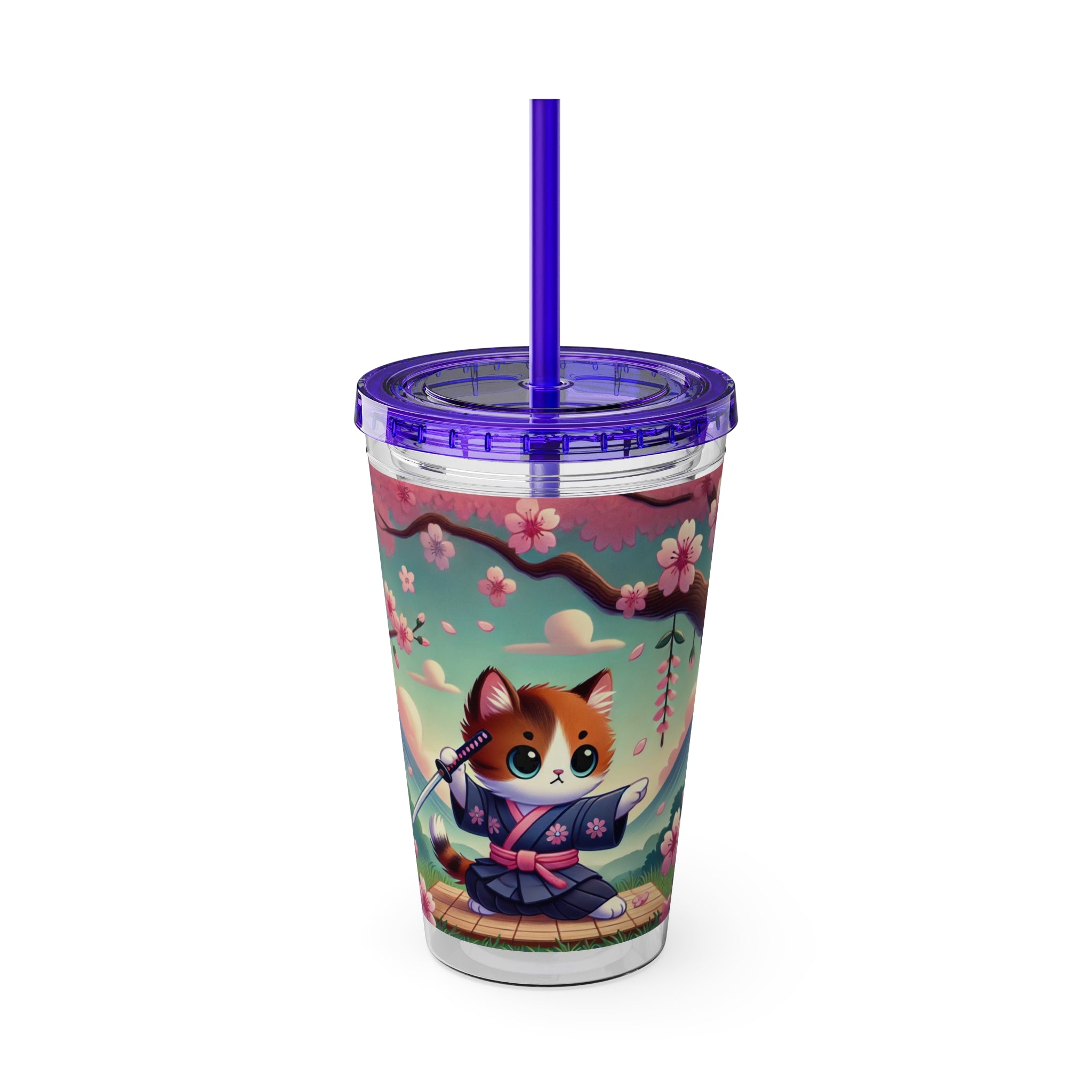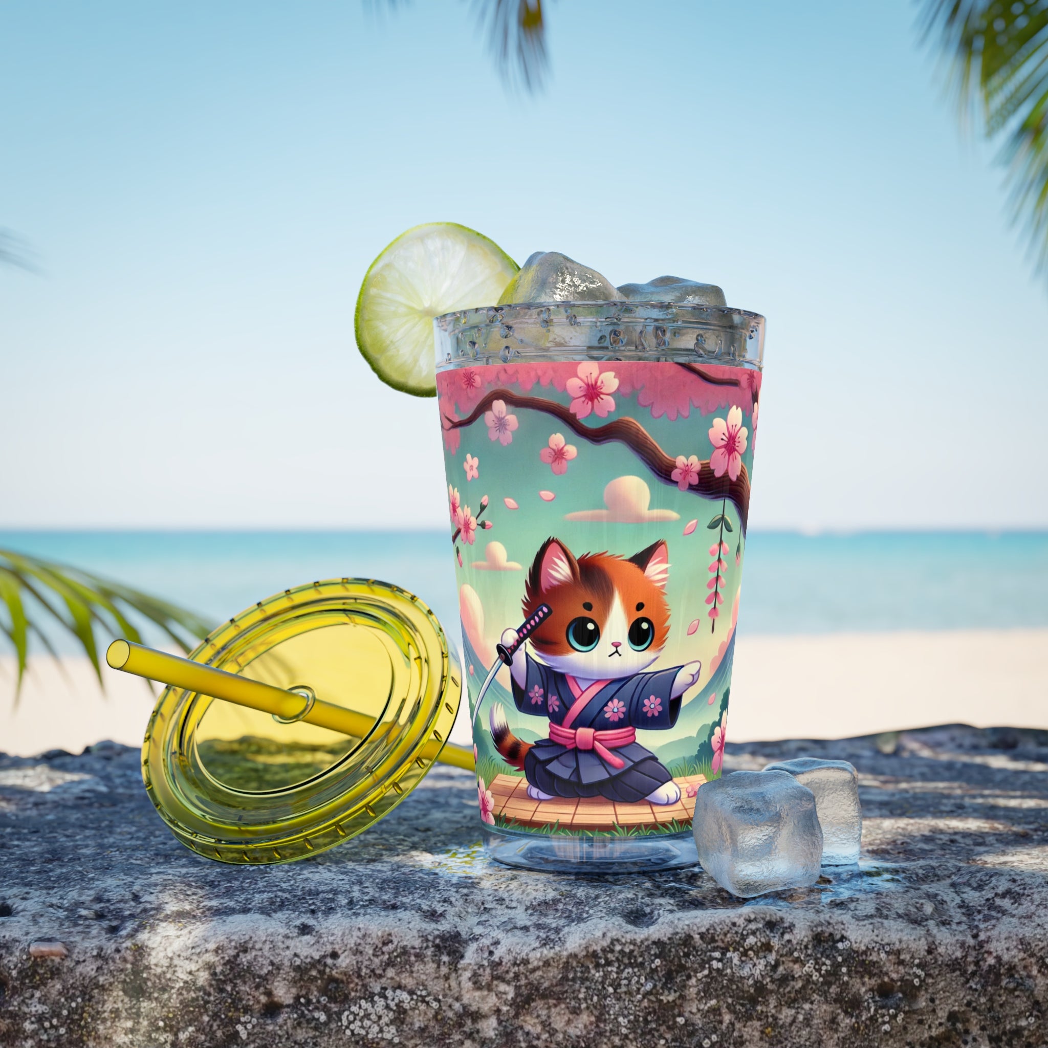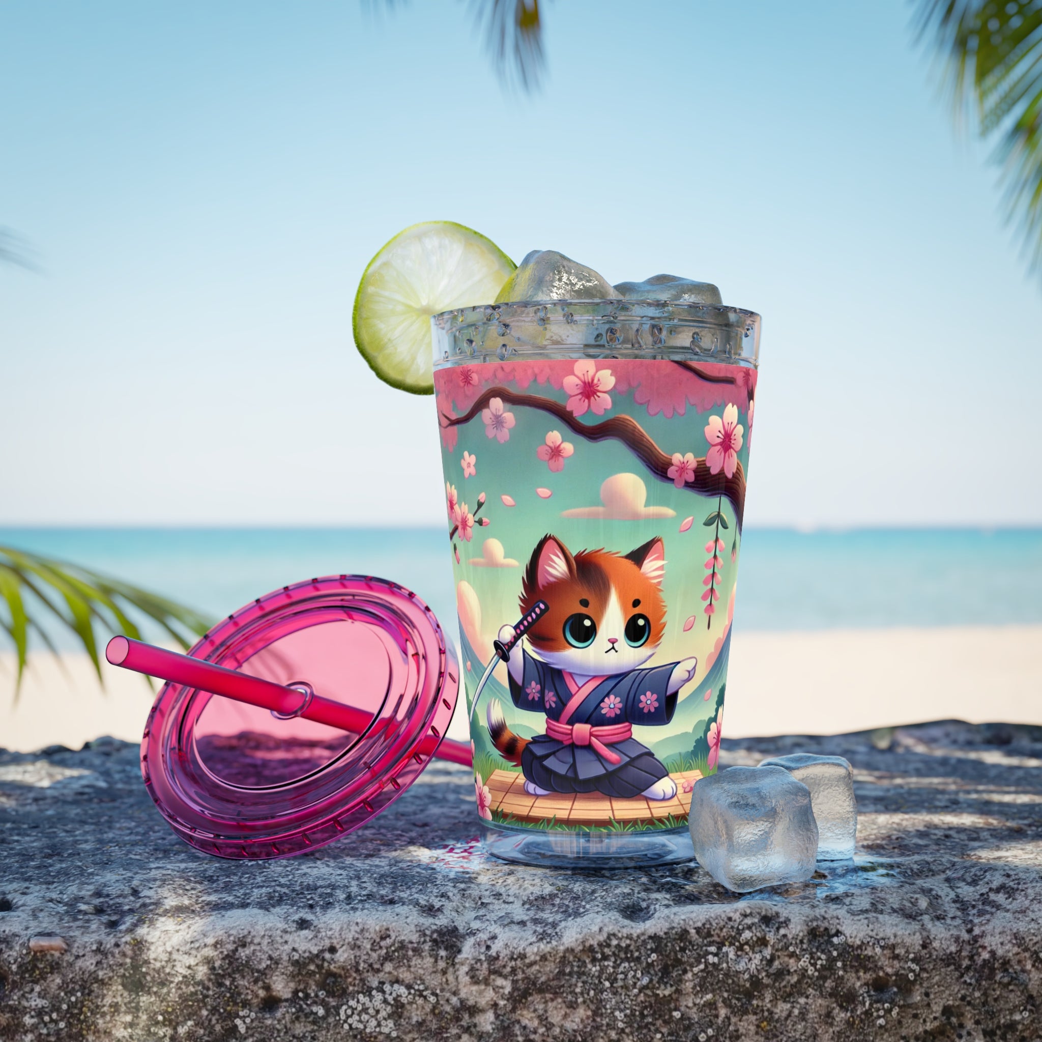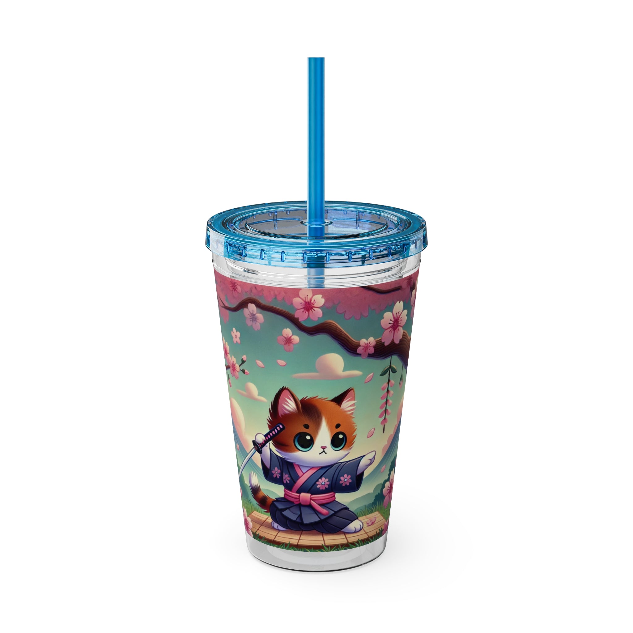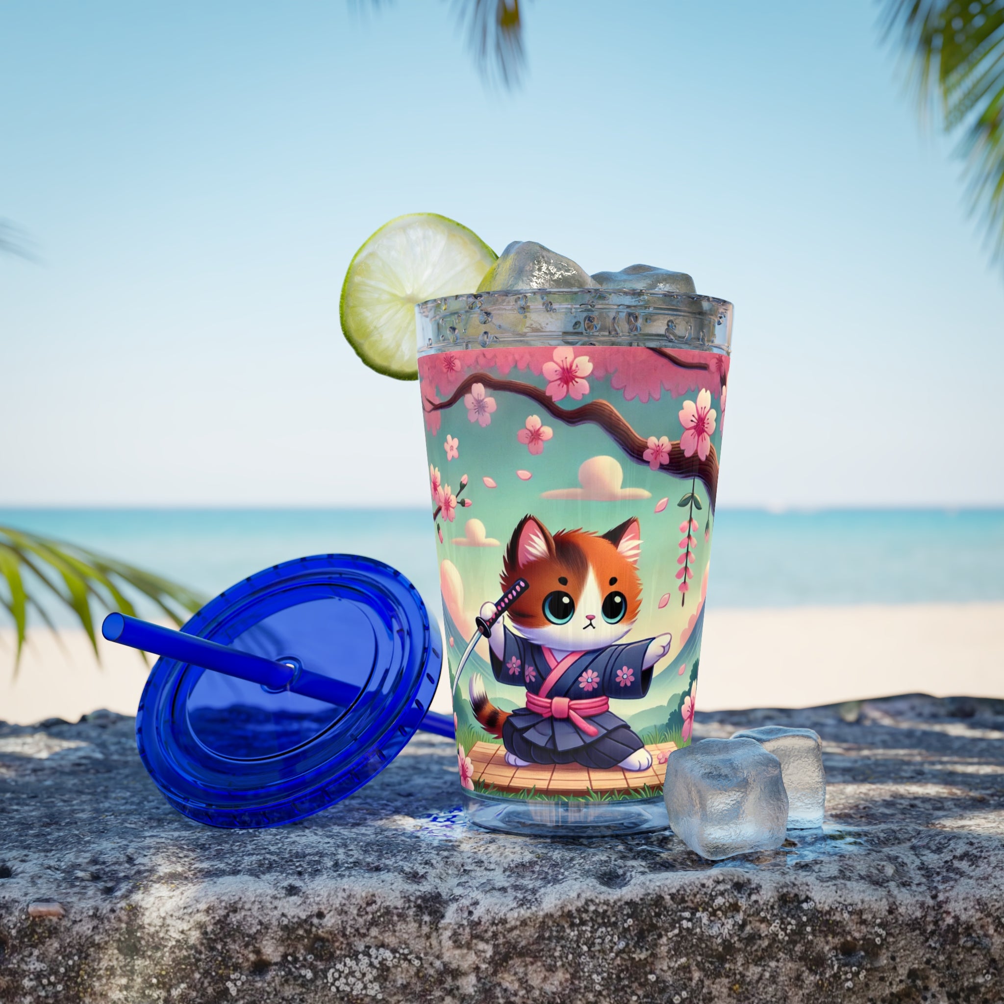 Stay refreshed in style with the Samurai Kitten Sunsplash Tumbler. Featuring a whimsical artwork of a skilled kitten dressed in a traditional samurai kimono, gracefully practicing precise sword techniques under a blooming cherry blossom tree, this design blends strength with serenity. Soft pink petals drift through the air, adding a peaceful yet dynamic touch to this everyday essential.