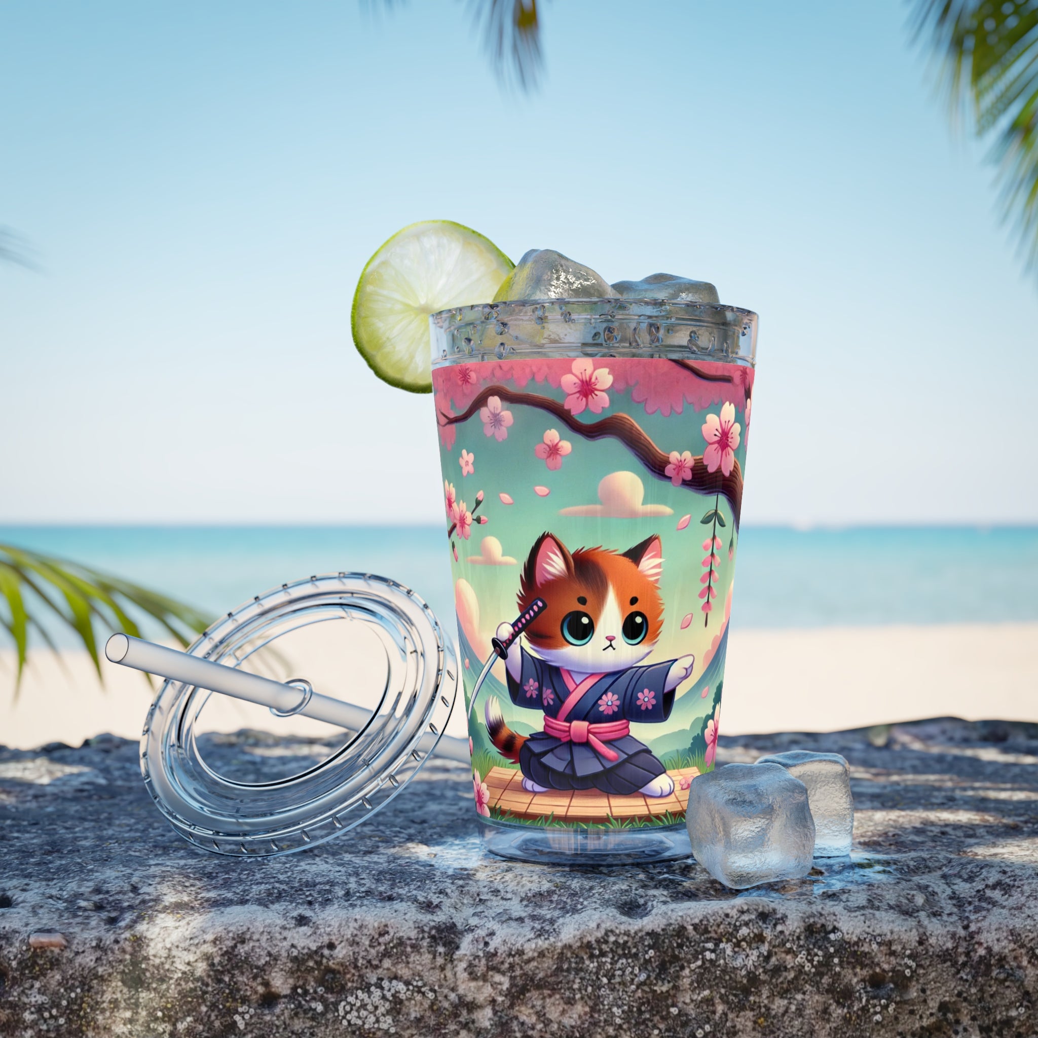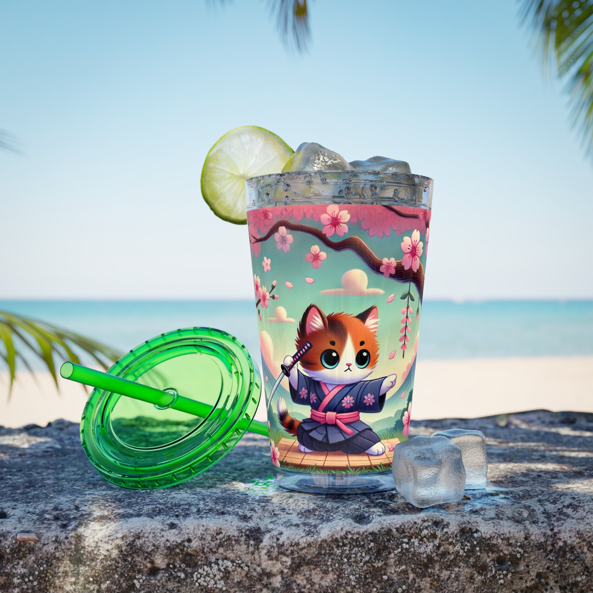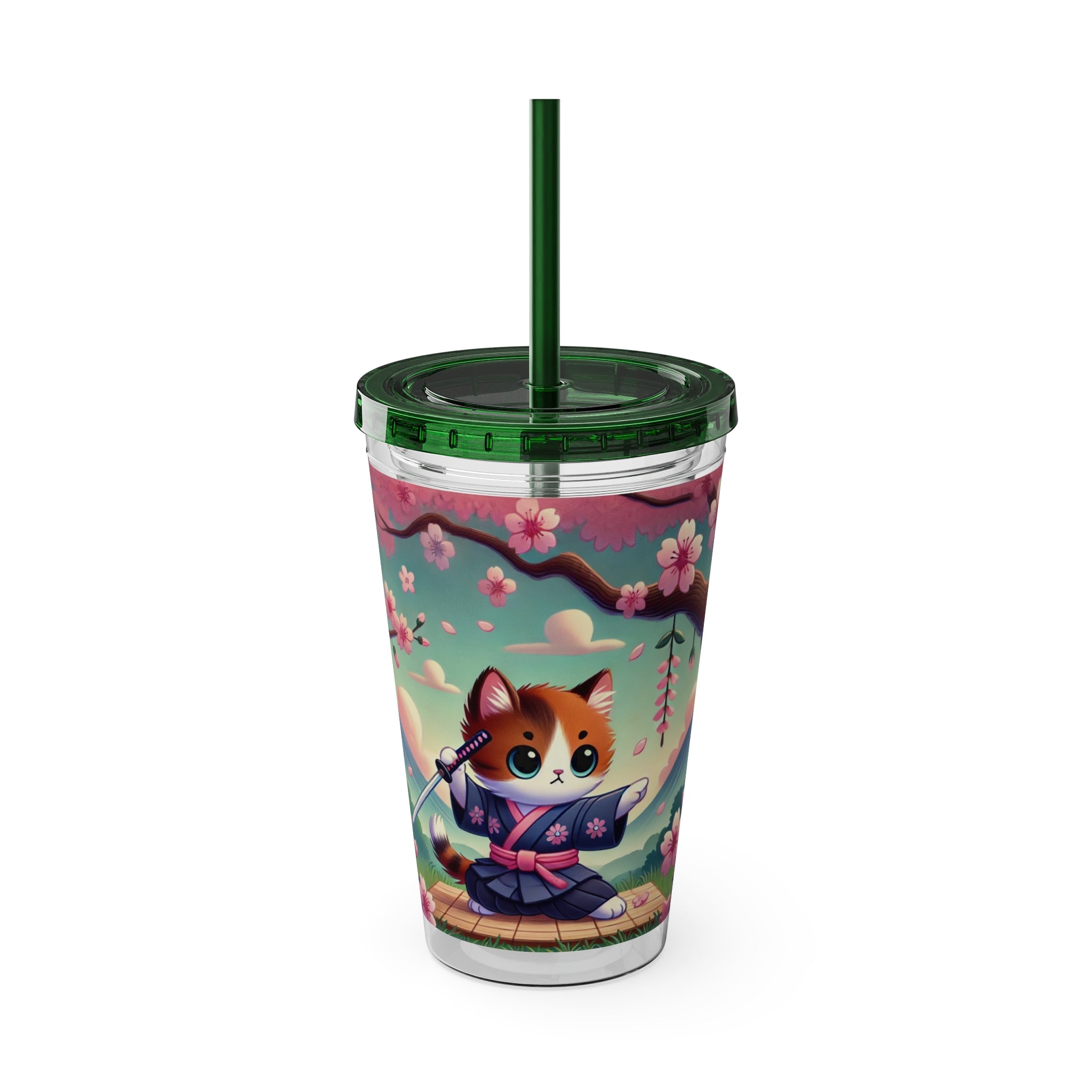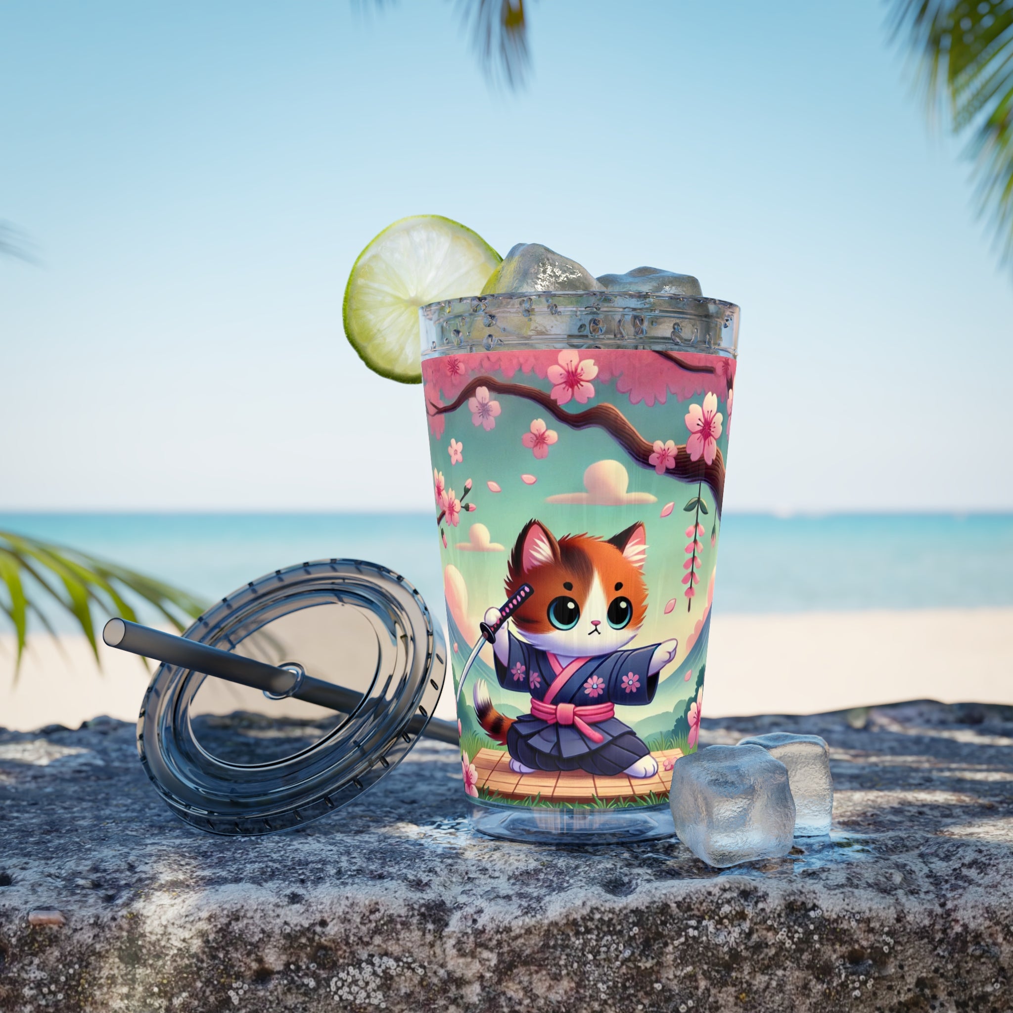 Stay refreshed in style with the Samurai Kitten Sunsplash Tumbler. Featuring a whimsical artwork of a skilled kitten dressed in a traditional samurai kimono, gracefully practicing precise sword techniques under a blooming cherry blossom tree, this design blends strength with serenity. Soft pink petals drift through the air, adding a peaceful yet dynamic touch to this everyday essential.