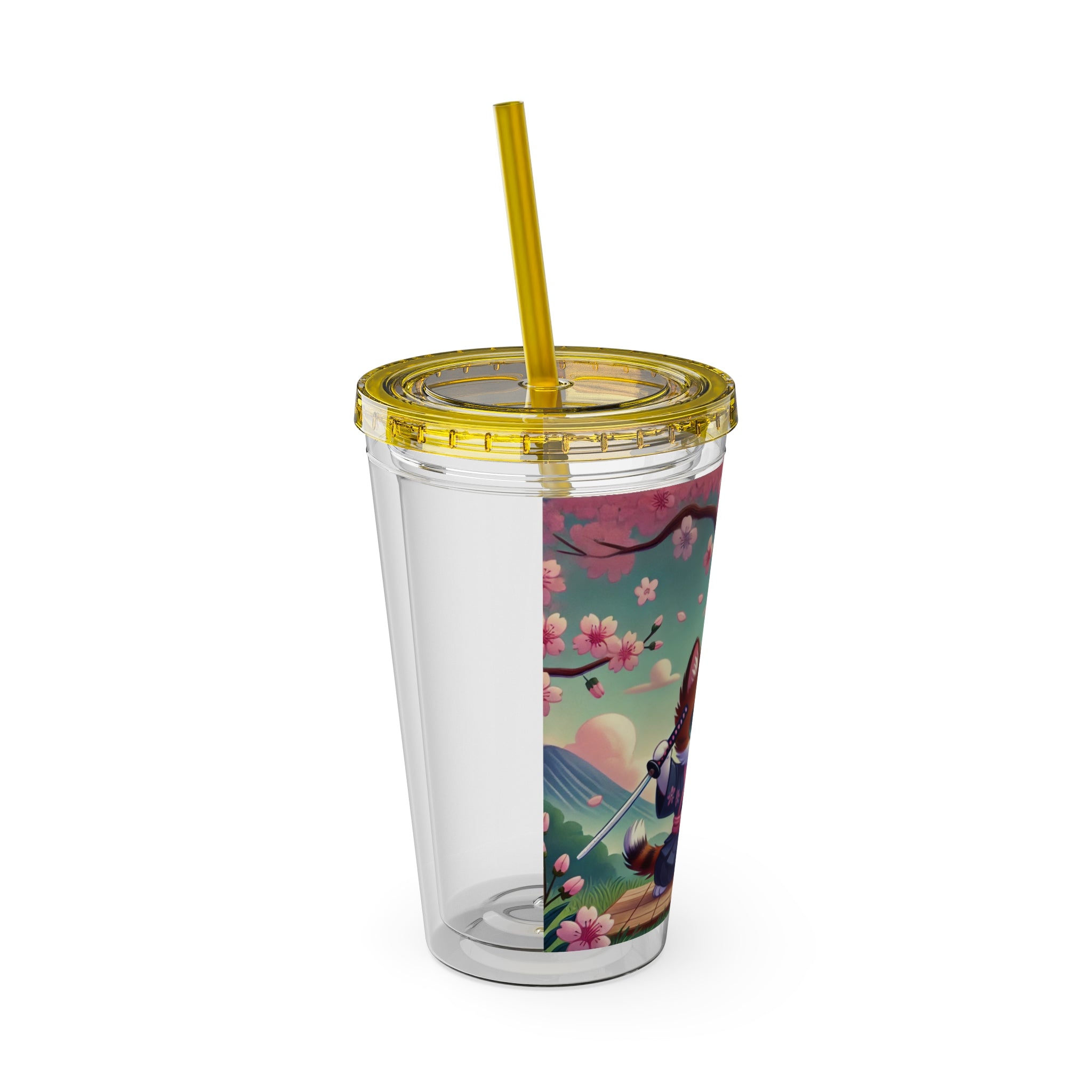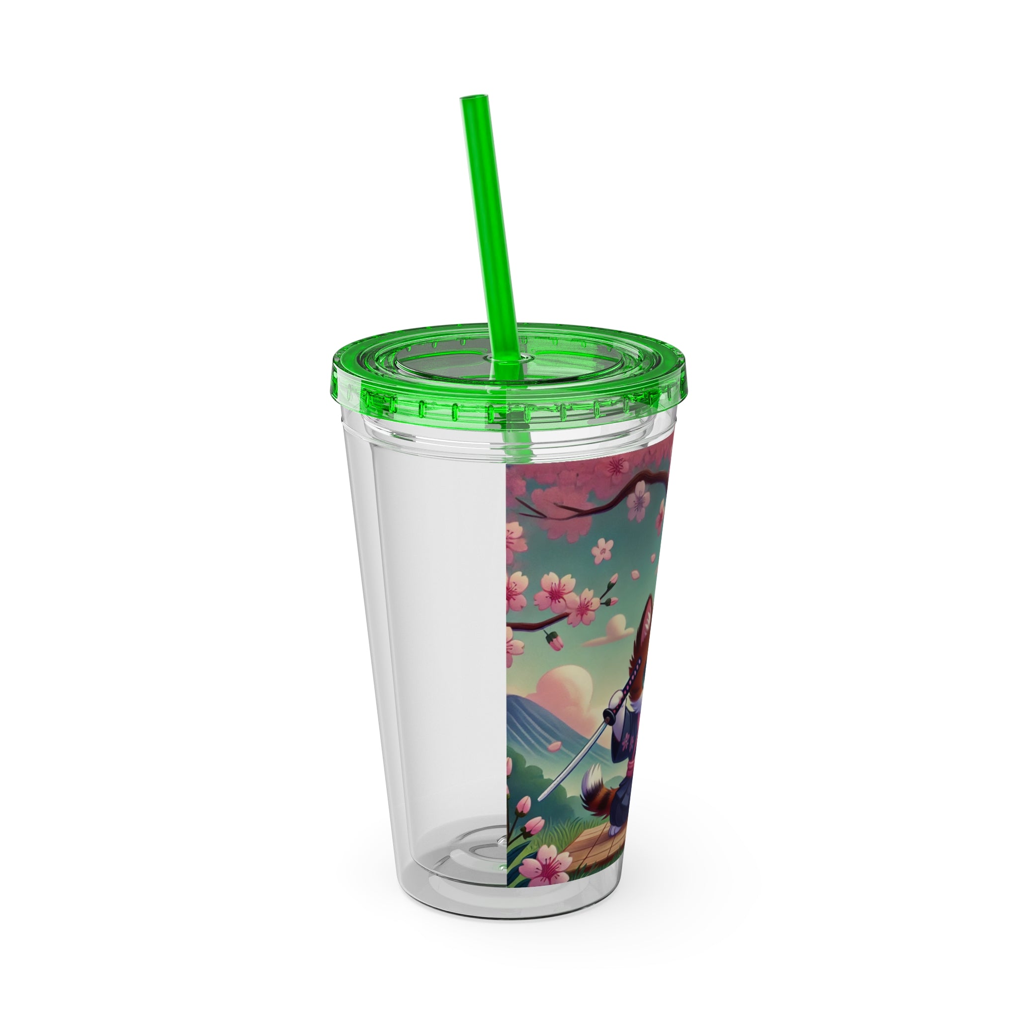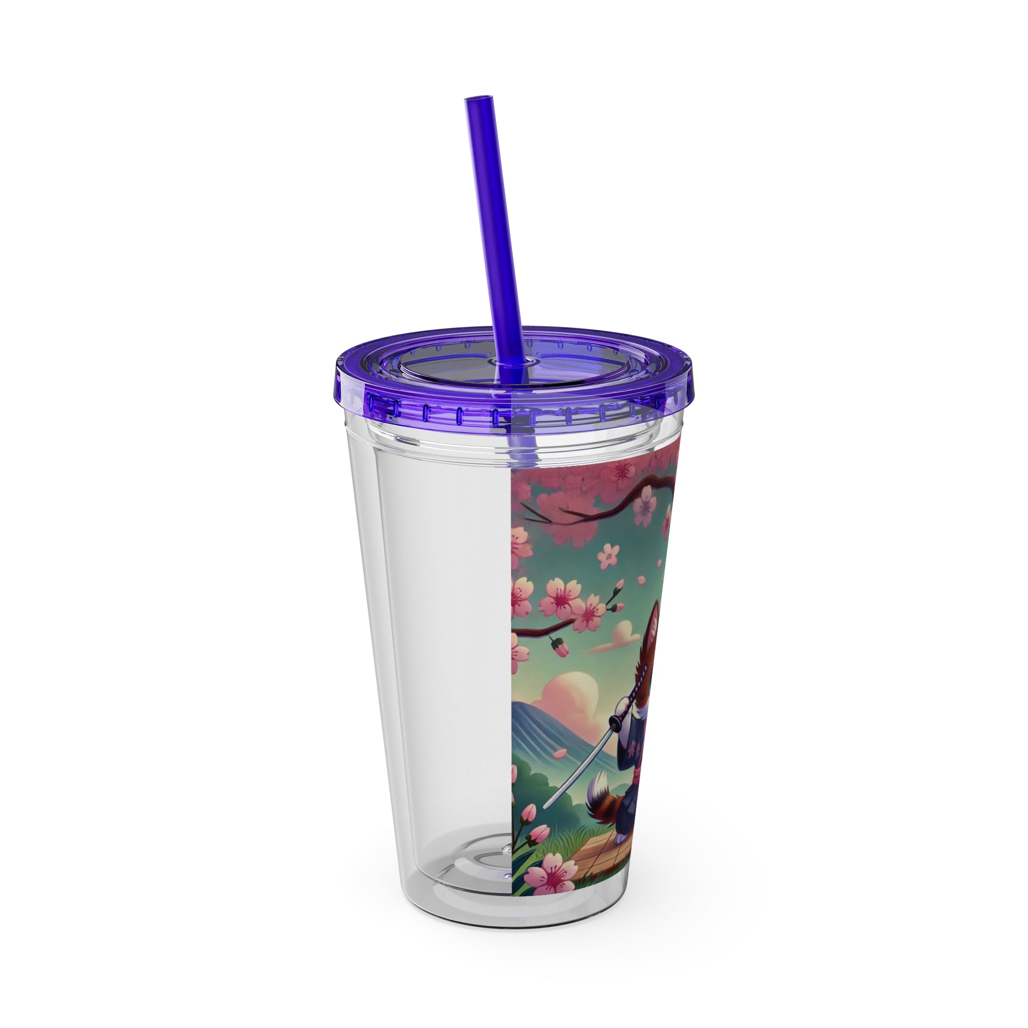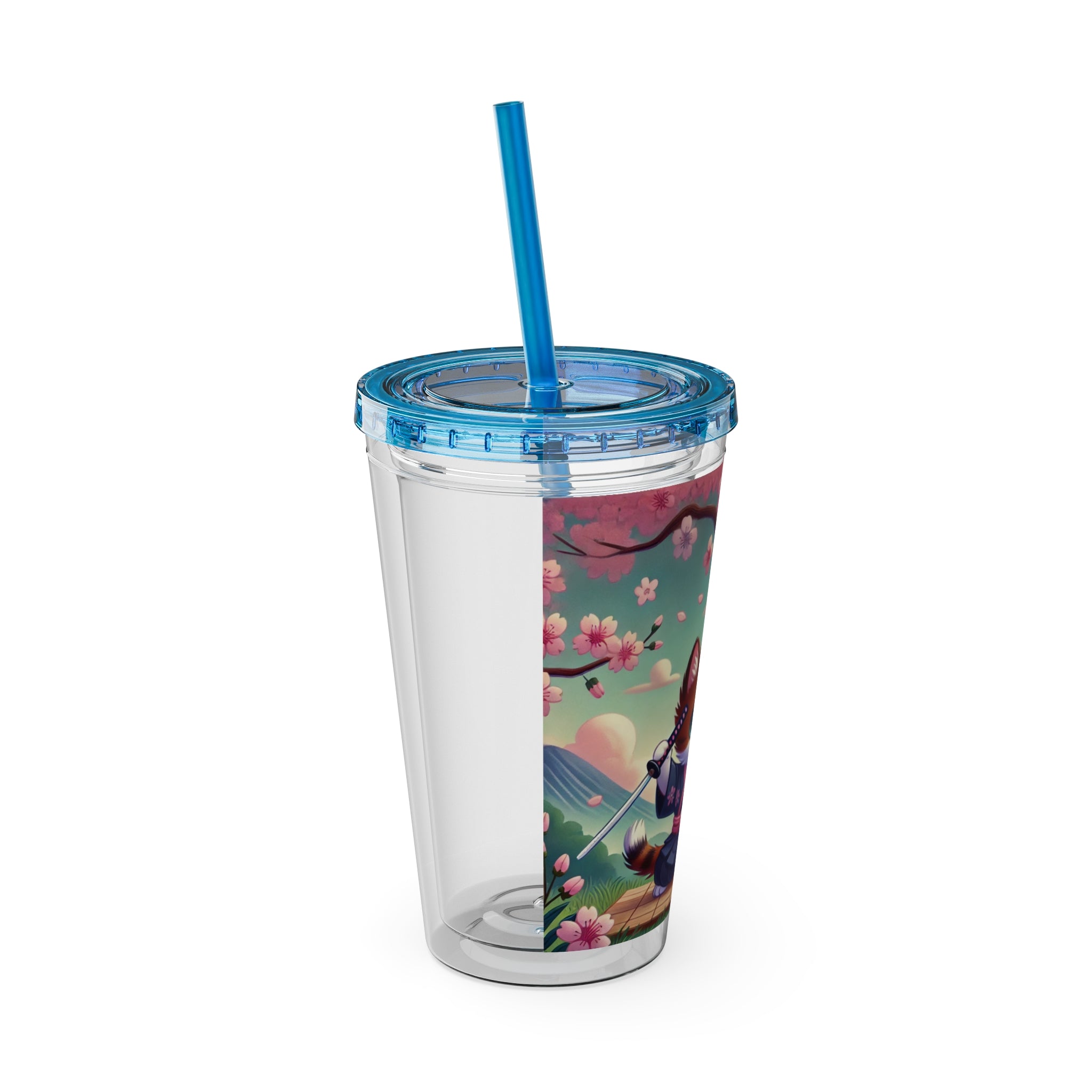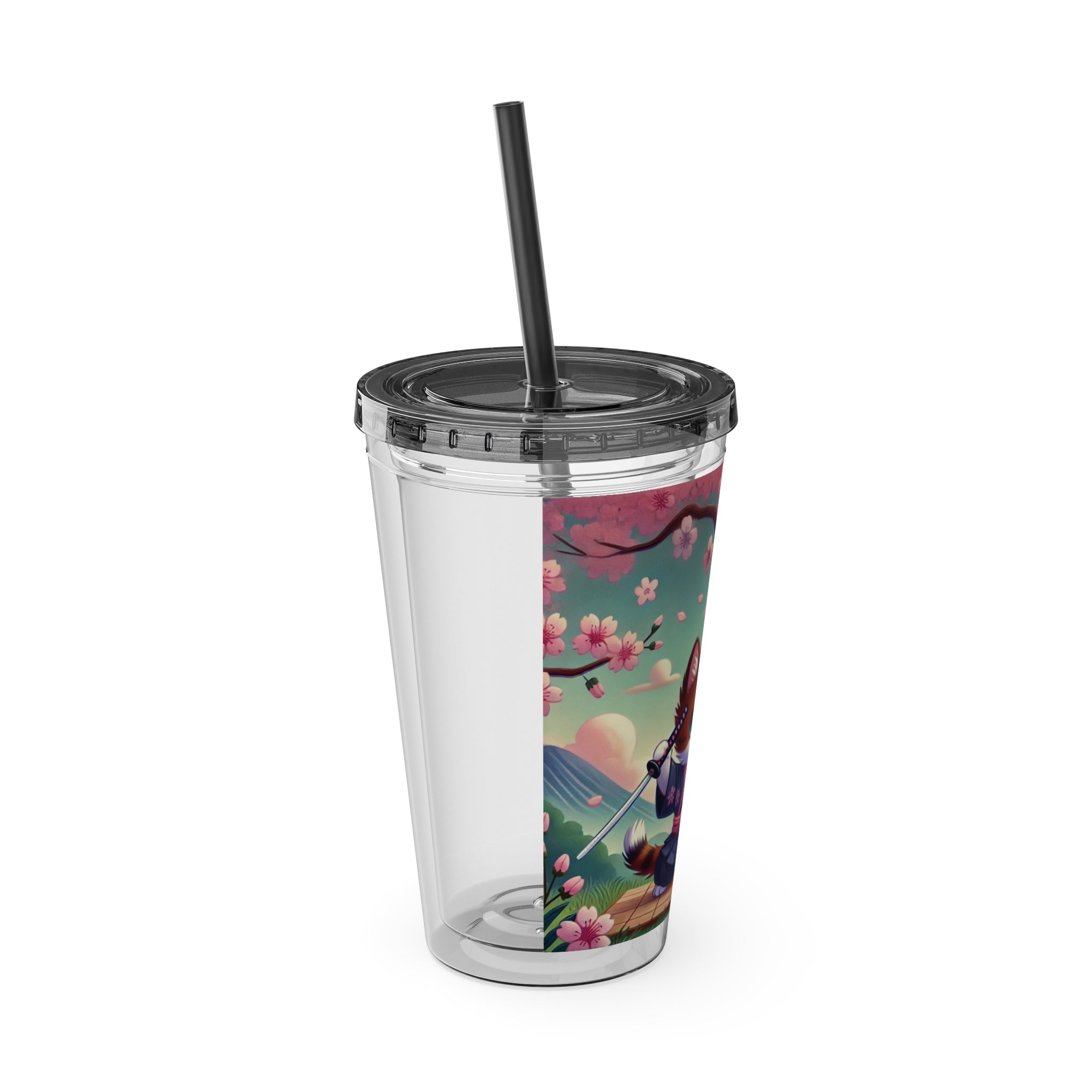 Stay refreshed in style with the Samurai Kitten Sunsplash Tumbler. Featuring a whimsical artwork of a skilled kitten dressed in a traditional samurai kimono, gracefully practicing precise sword techniques under a blooming cherry blossom tree, this design blends strength with serenity. Soft pink petals drift through the air, adding a peaceful yet dynamic touch to this everyday essential.