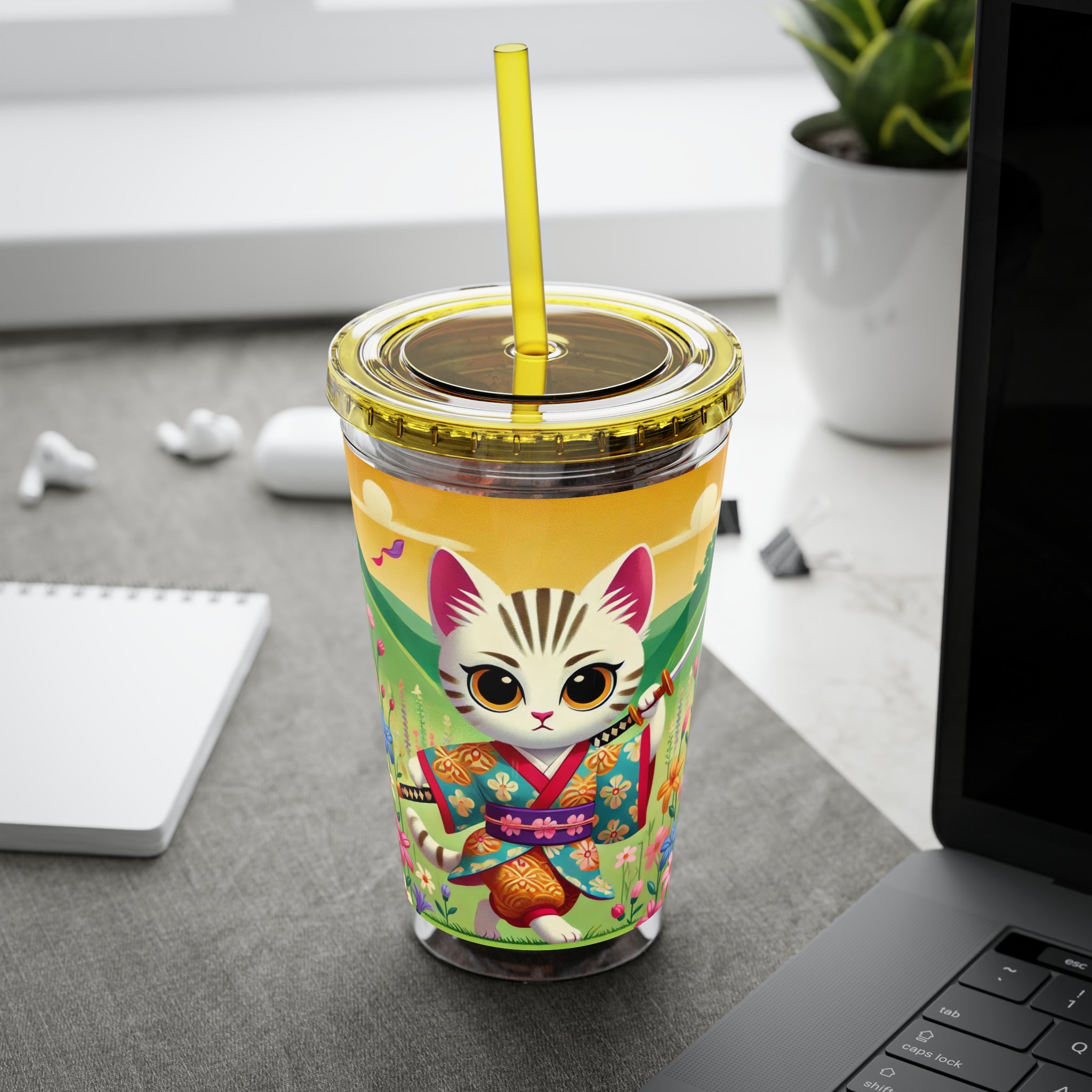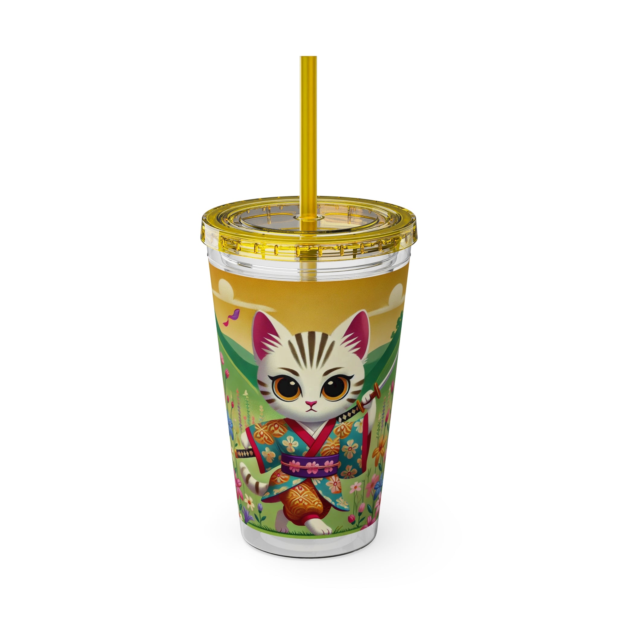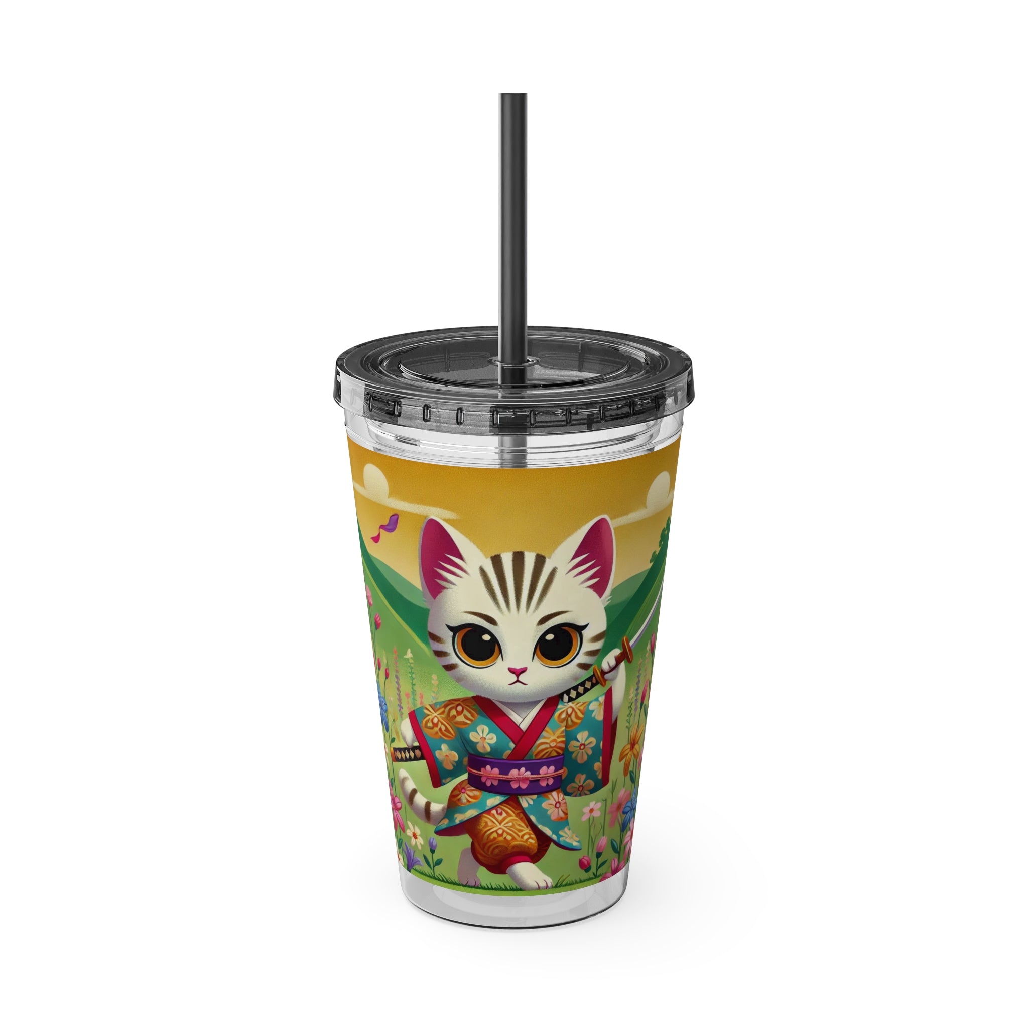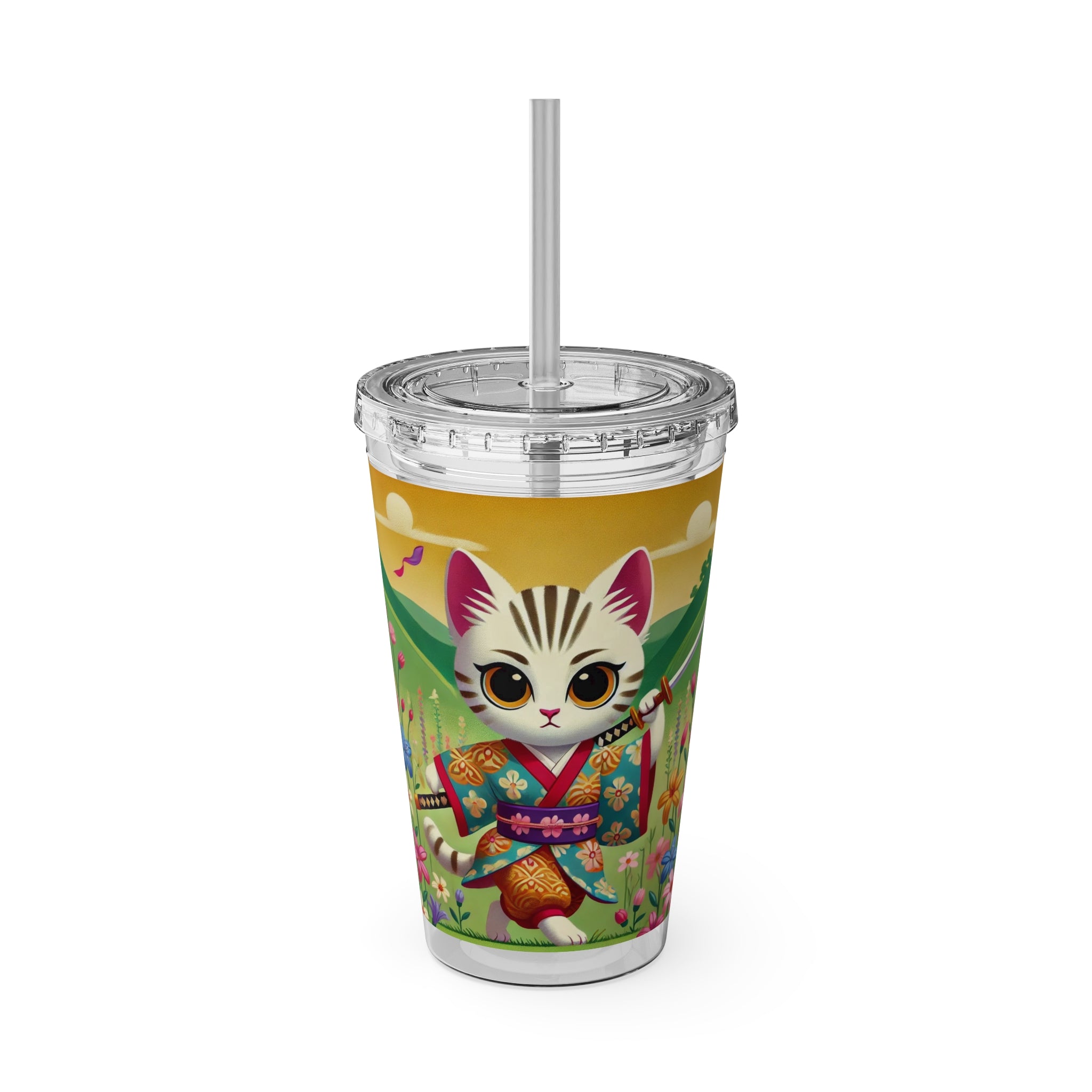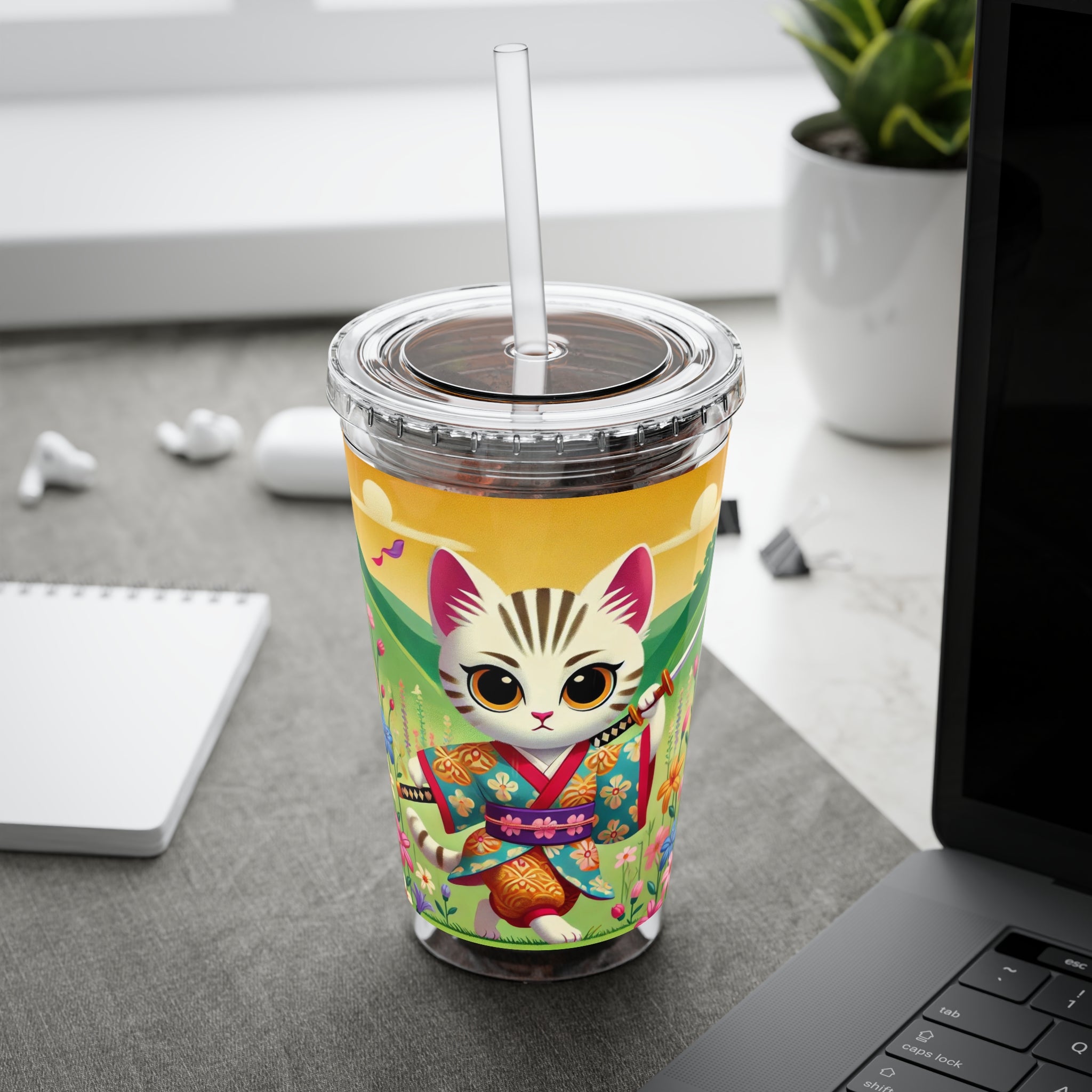 Stay hydrated in style with the Samurai Kitten sunsplash tumbler, featuring a whimsical illustration of a bold kitten dressed in a beautifully patterned kimono, wielding a stylish wooden sword while confidently striding through a serene landscape. This charming design blends elegance and adventure with playful charm, making every sip a little more delightful.