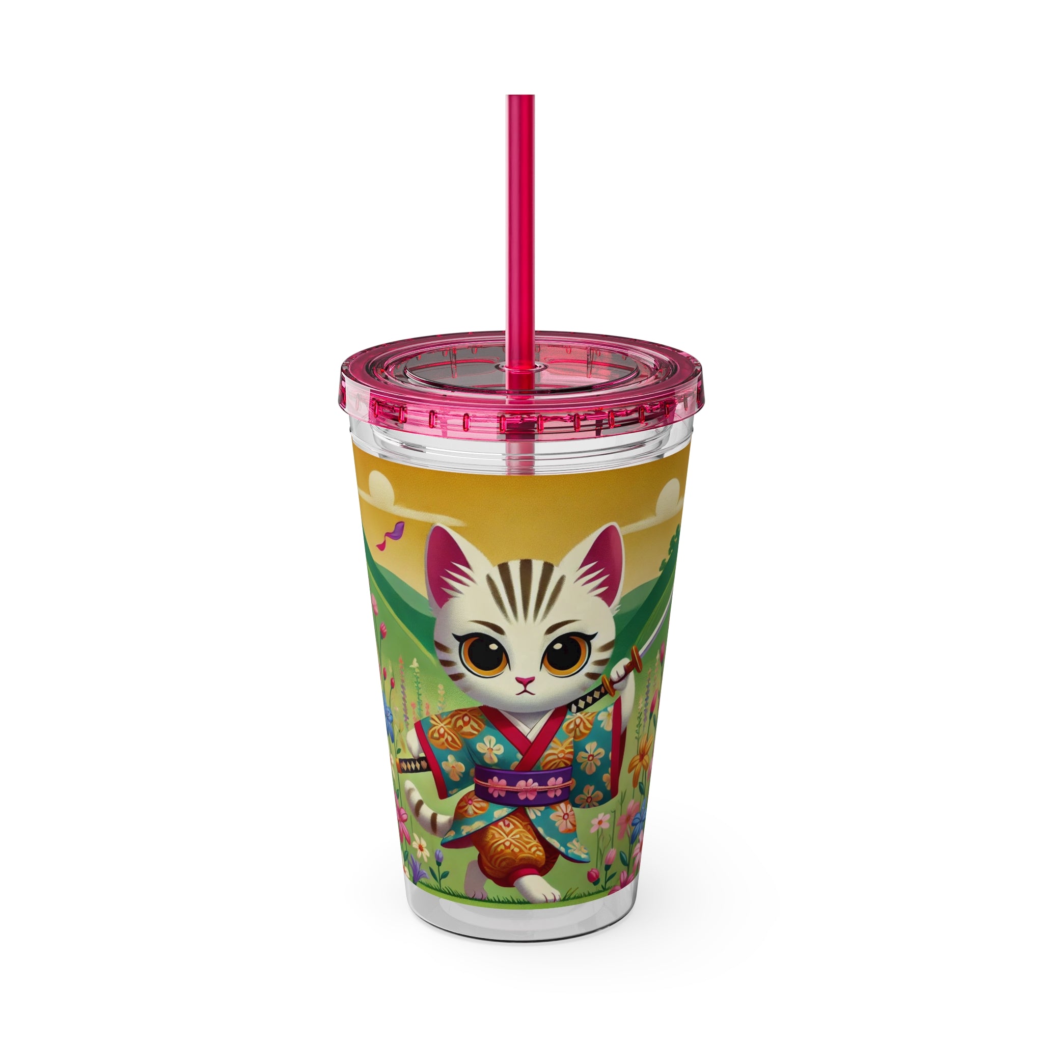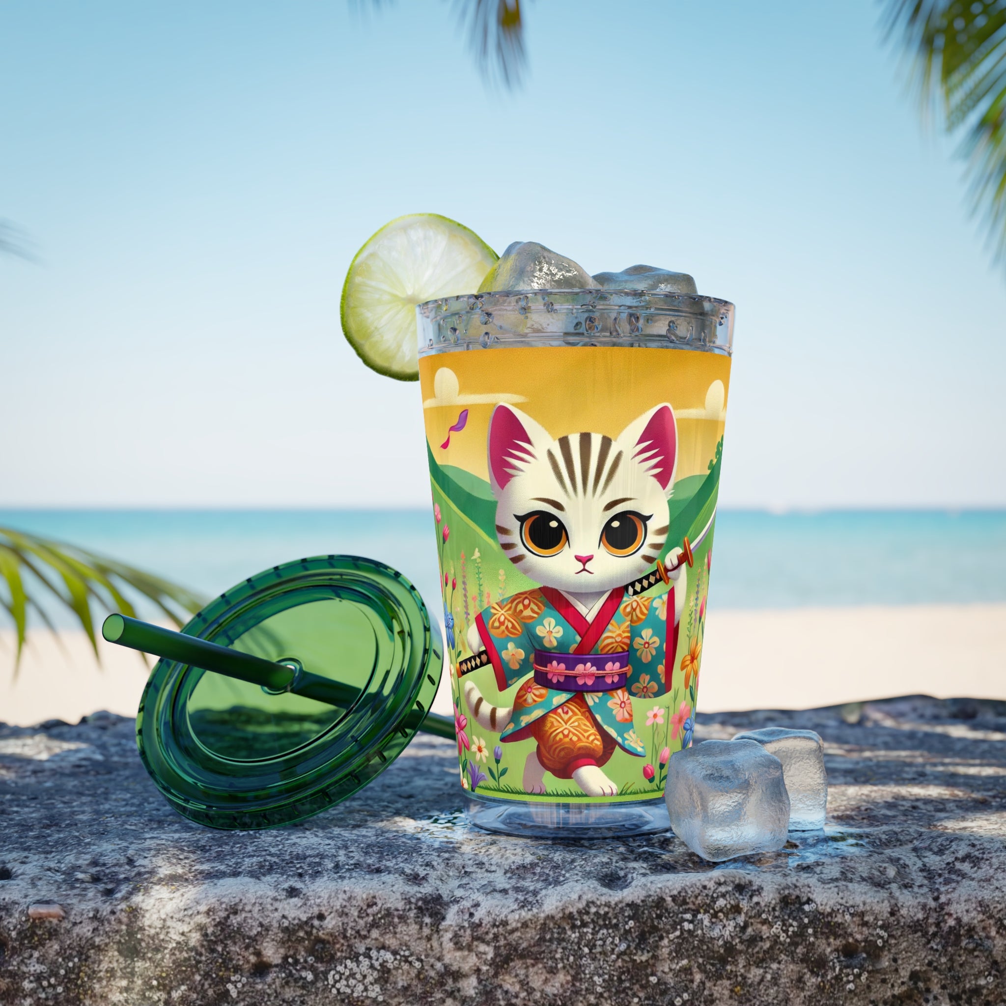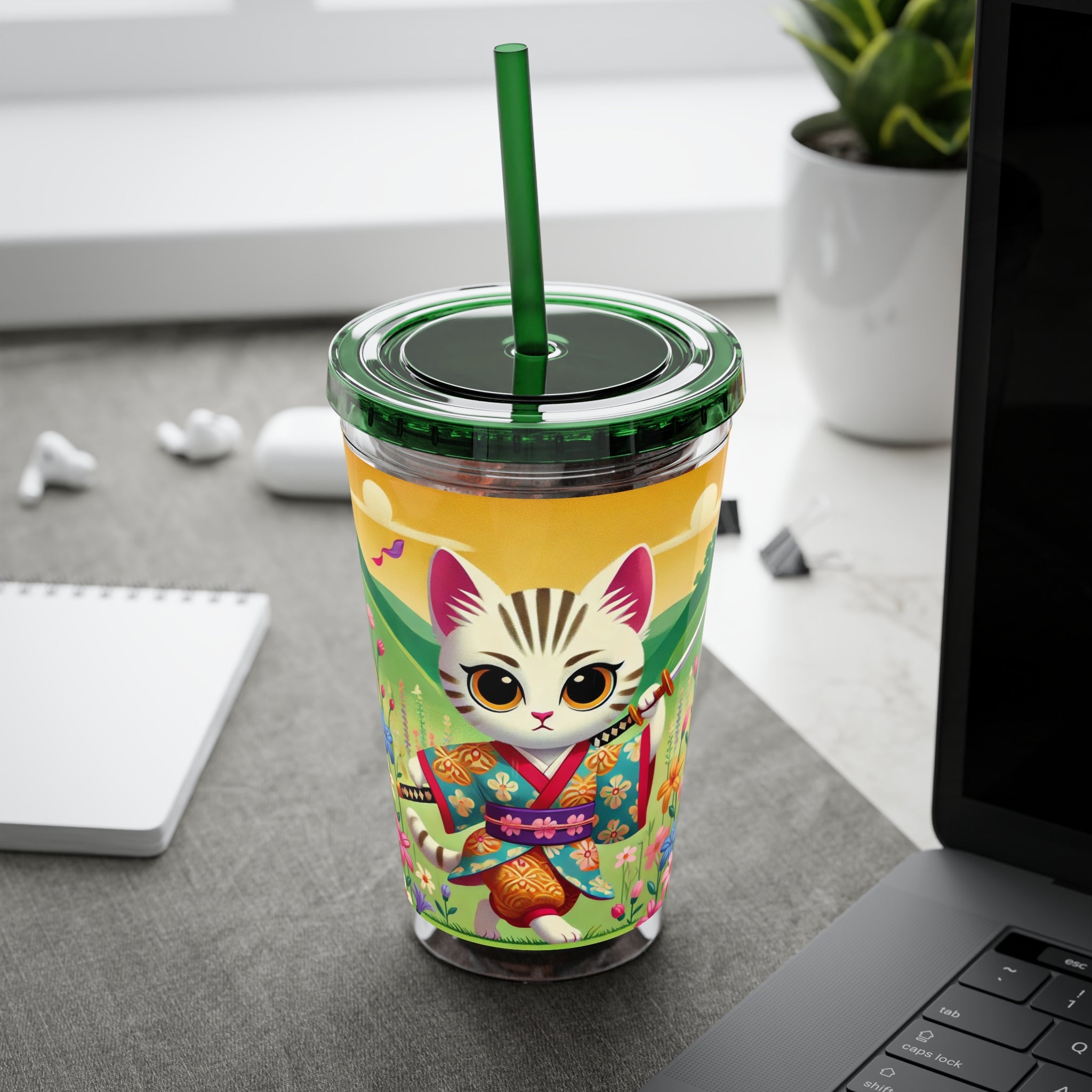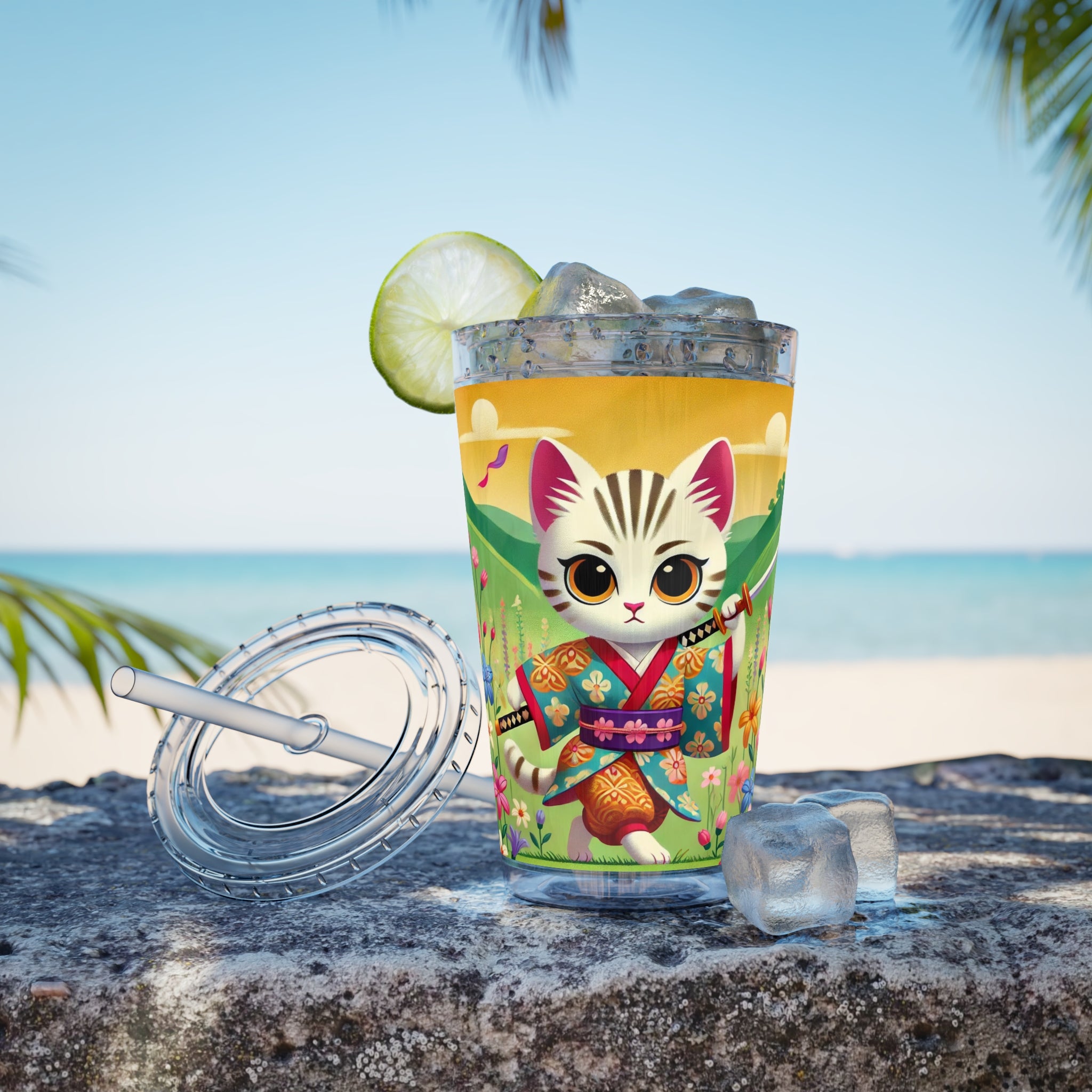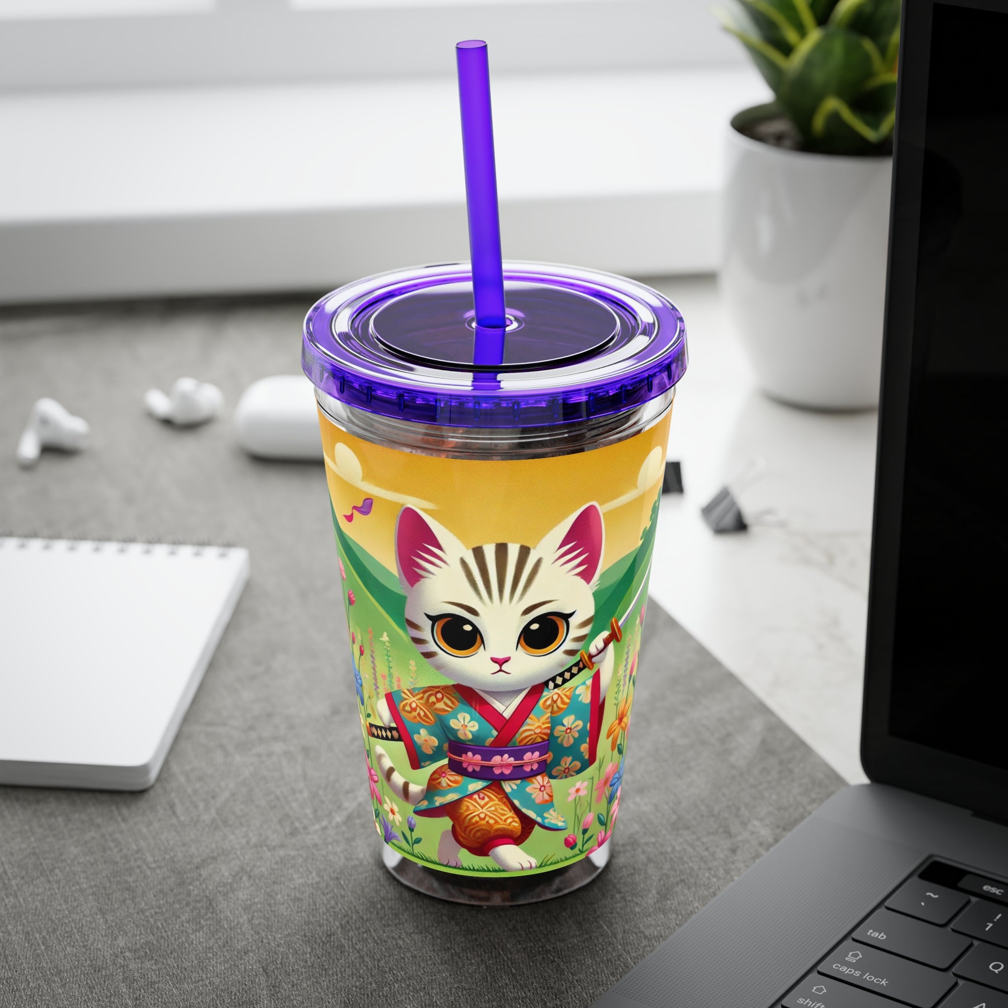 Stay hydrated in style with the Samurai Kitten sunsplash tumbler, featuring a whimsical illustration of a bold kitten dressed in a beautifully patterned kimono, wielding a stylish wooden sword while confidently striding through a serene landscape. This charming design blends elegance and adventure with playful charm, making every sip a little more delightful.