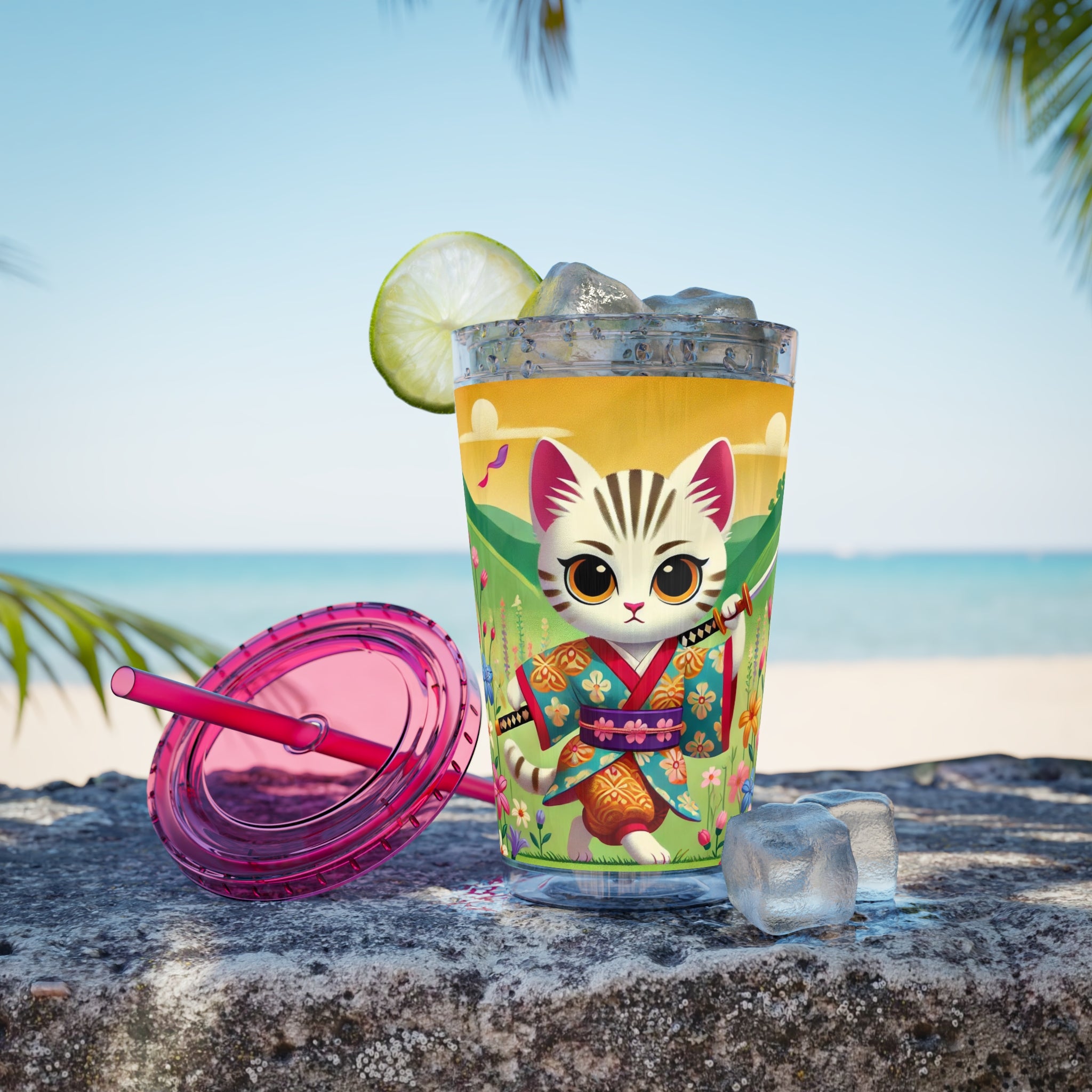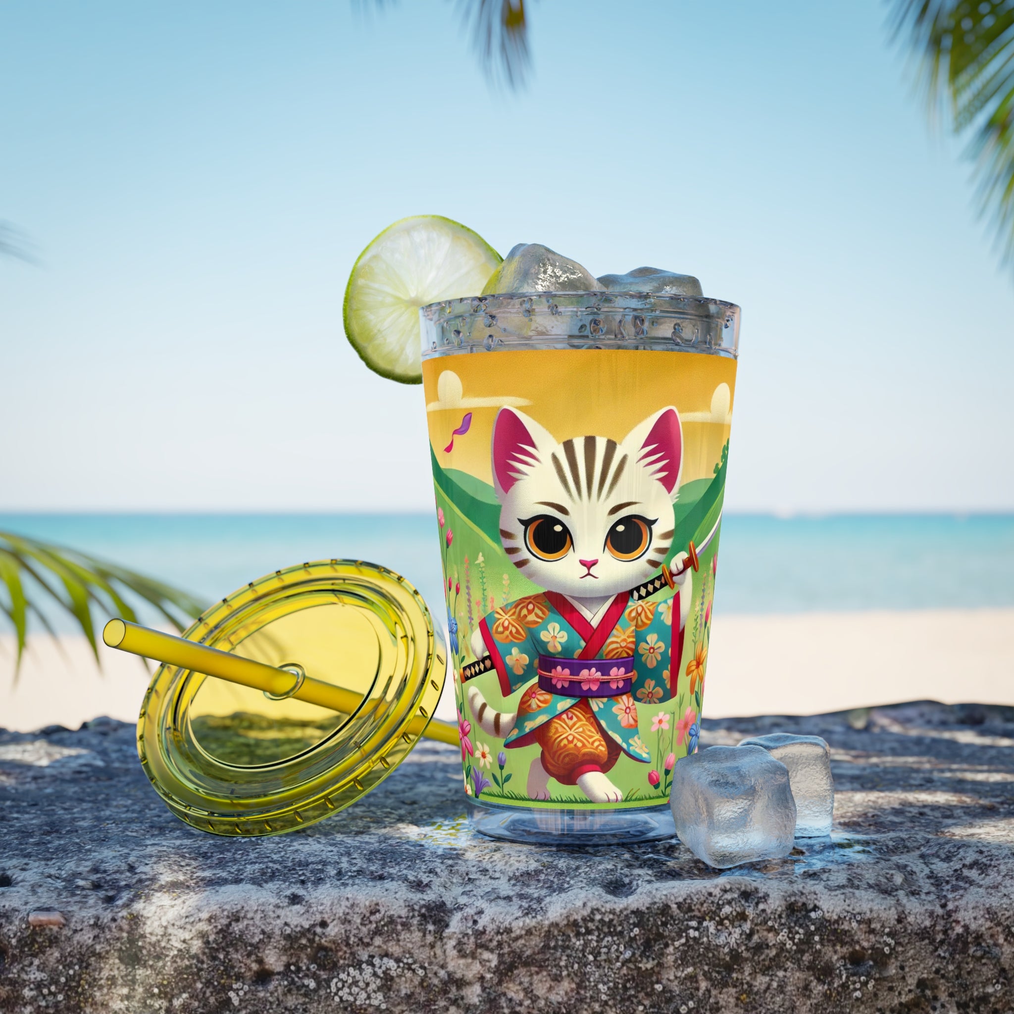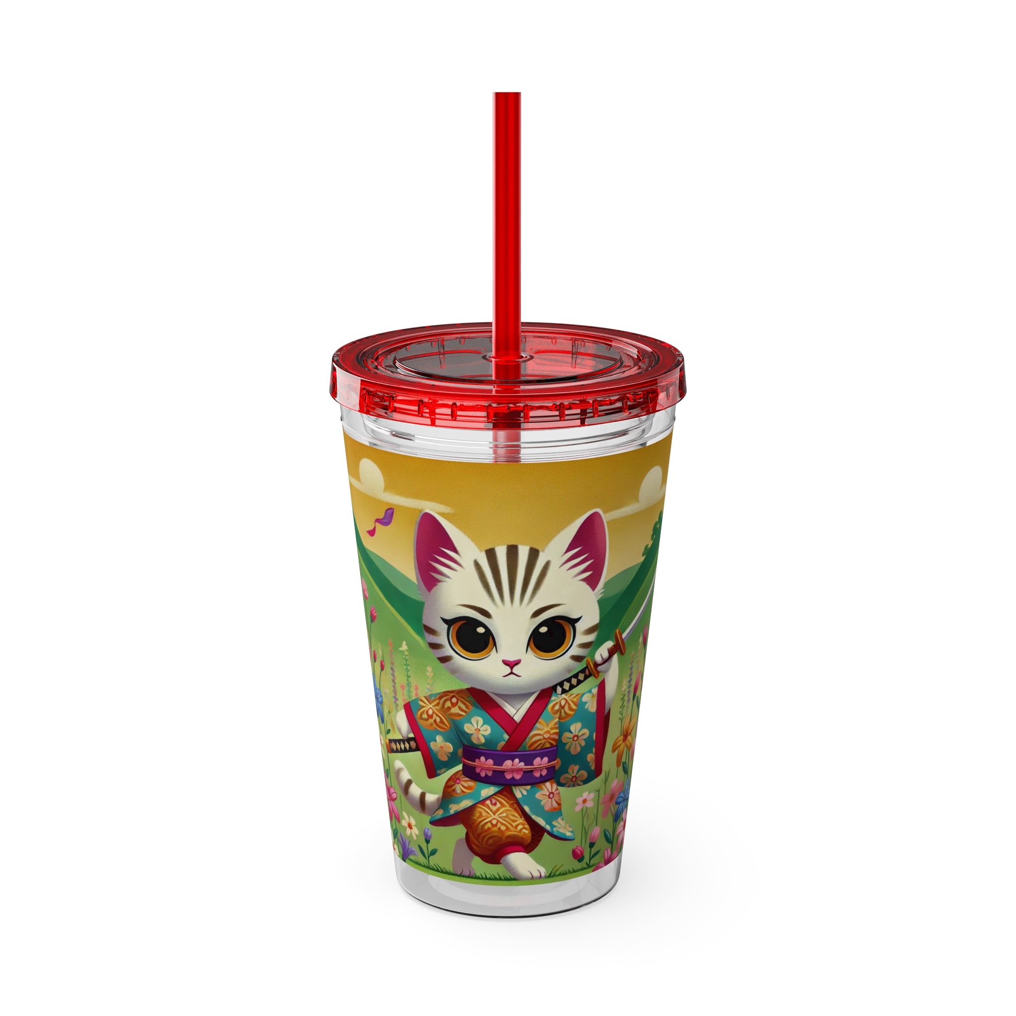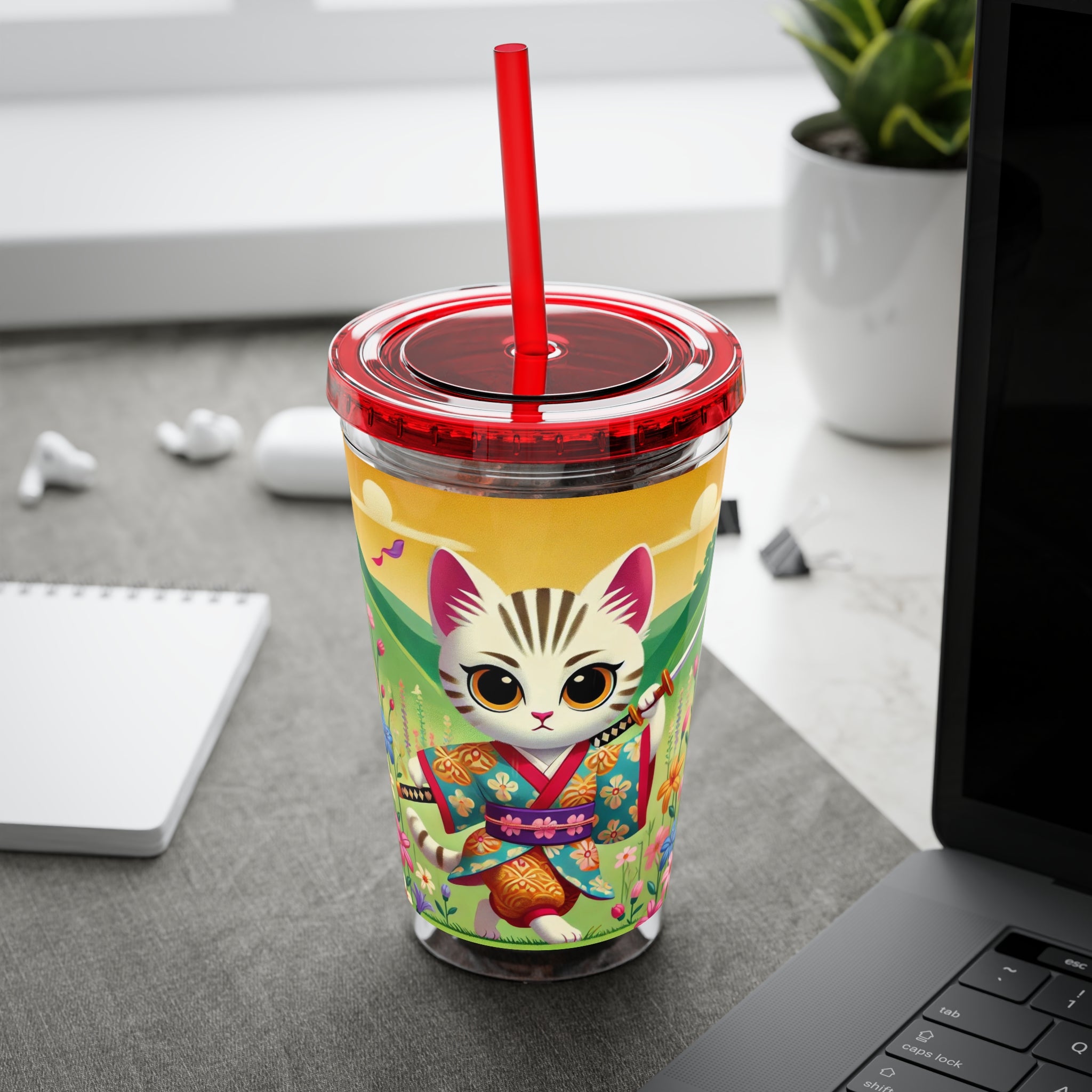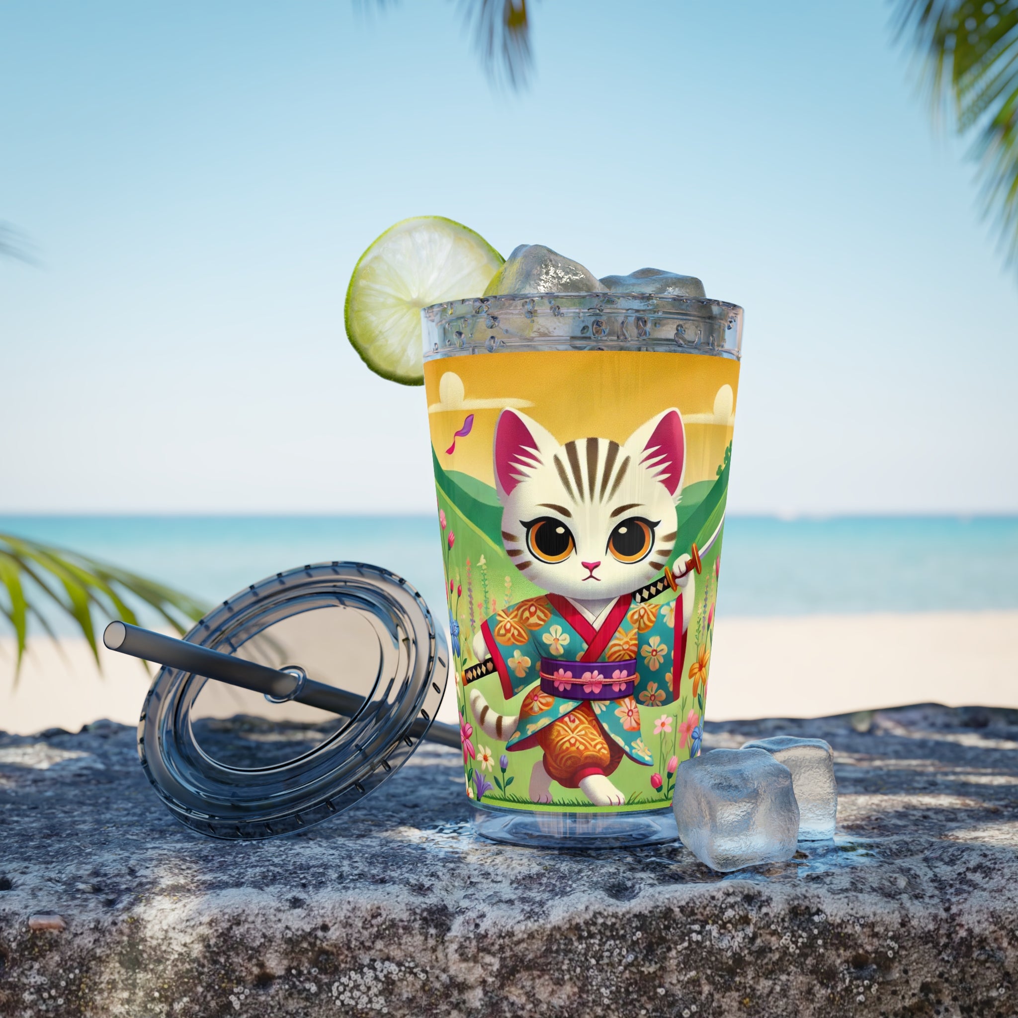 Stay hydrated in style with the Samurai Kitten sunsplash tumbler, featuring a whimsical illustration of a bold kitten dressed in a beautifully patterned kimono, wielding a stylish wooden sword while confidently striding through a serene landscape. This charming design blends elegance and adventure with playful charm, making every sip a little more delightful.