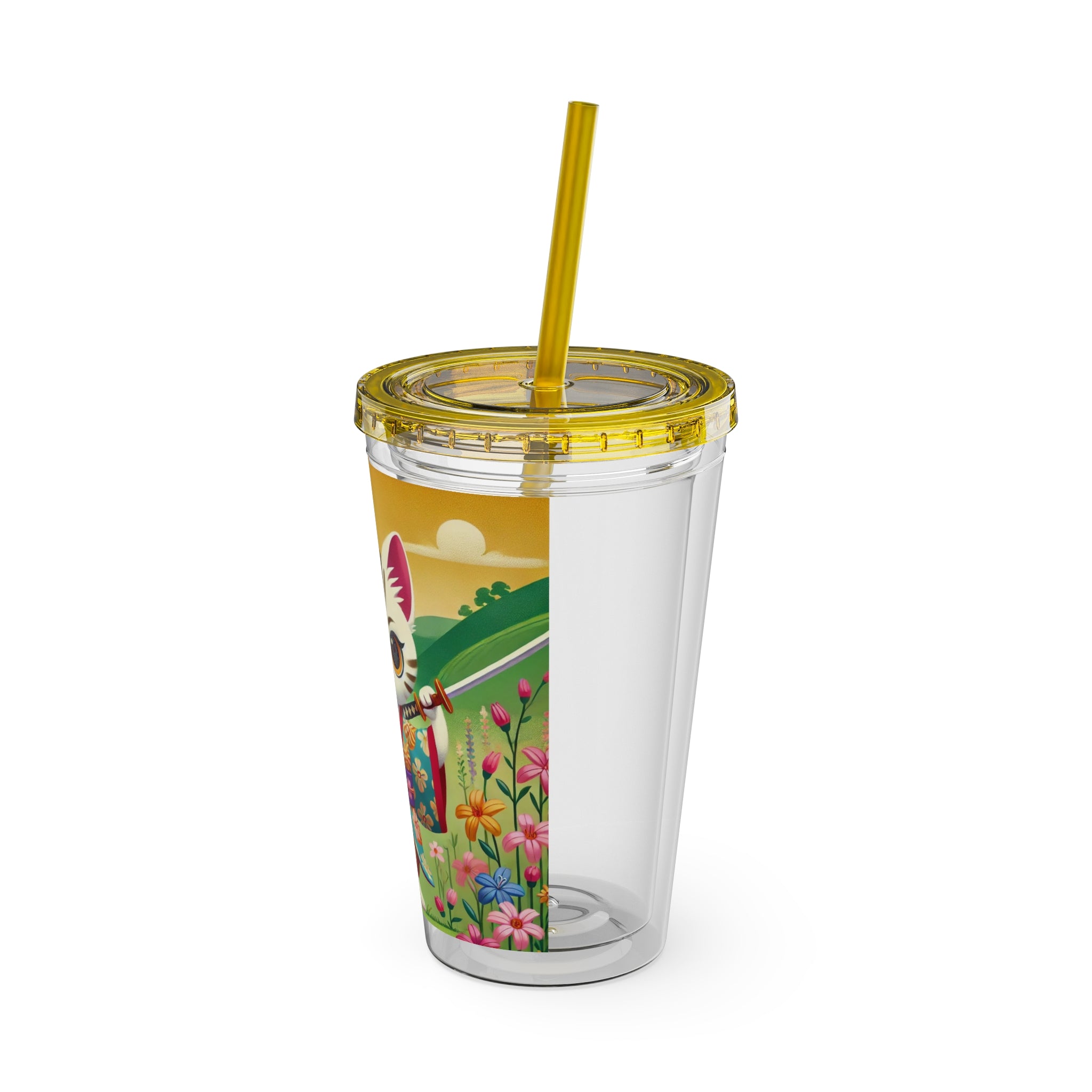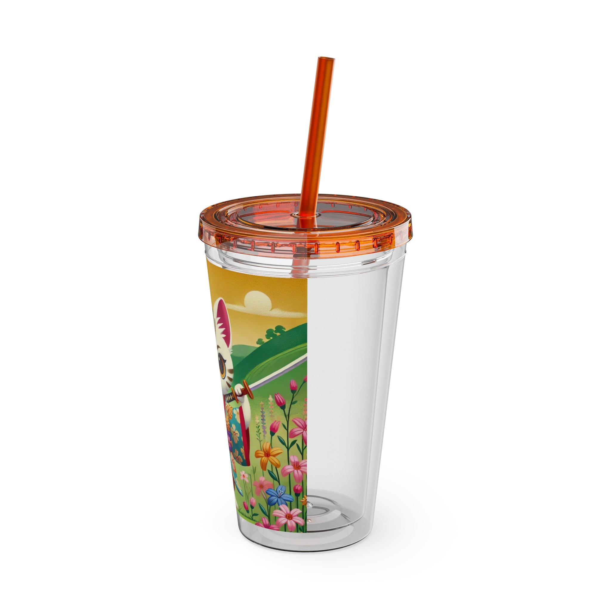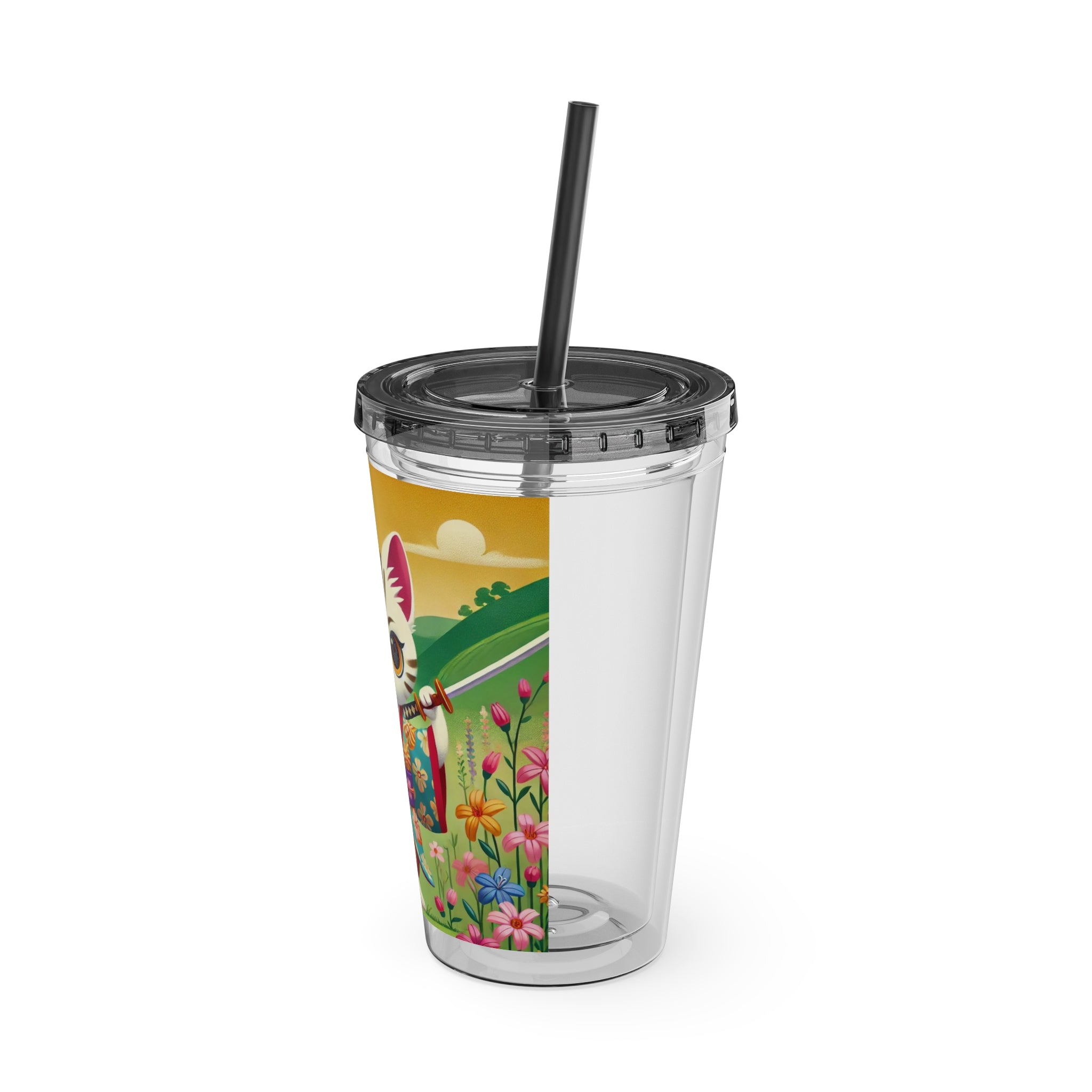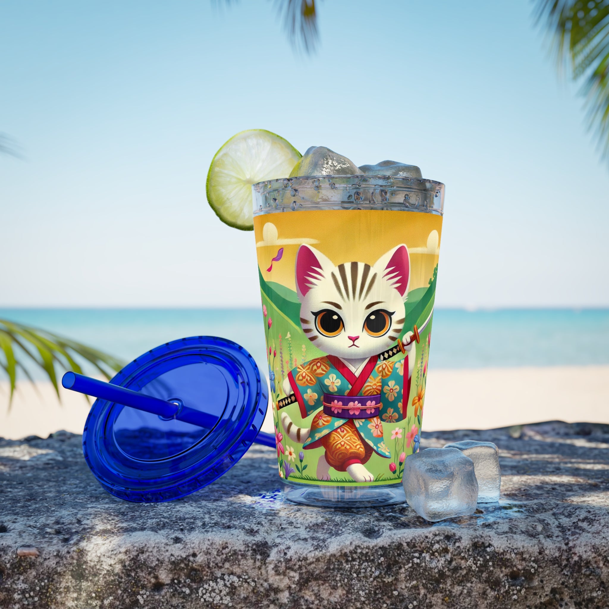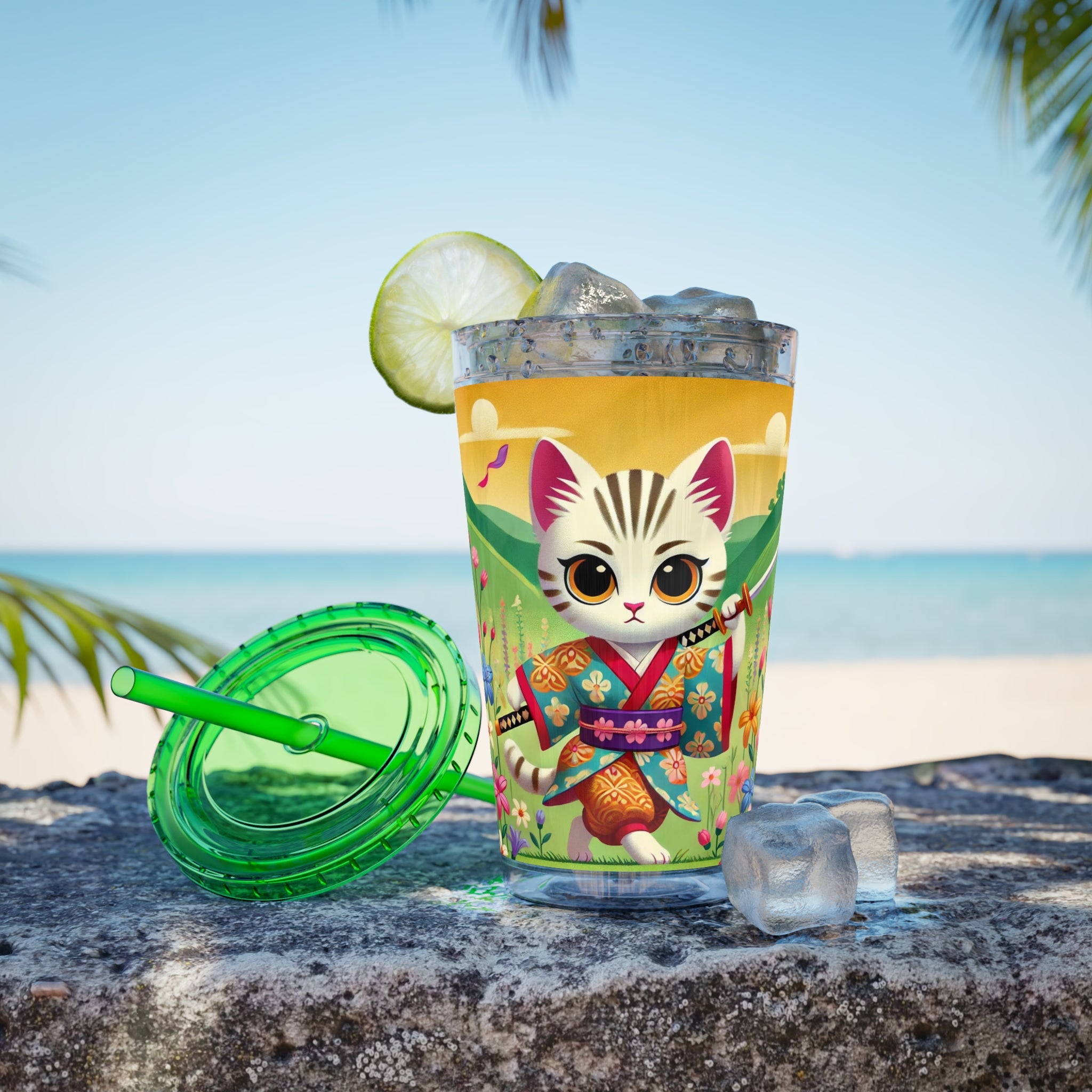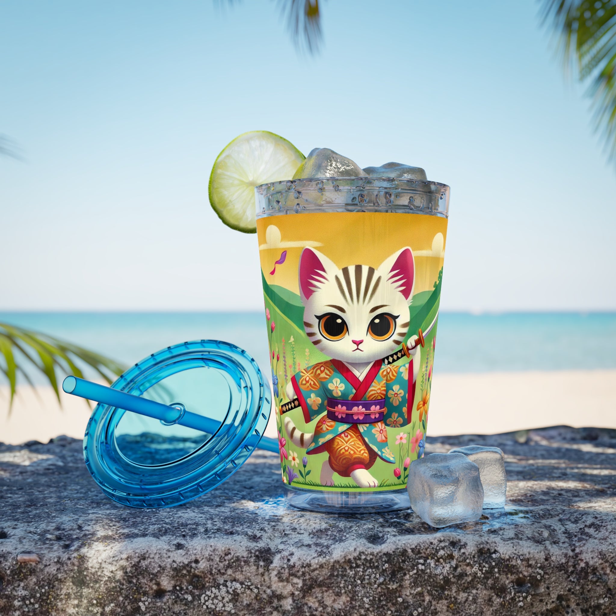 Stay hydrated in style with the Samurai Kitten sunsplash tumbler, featuring a whimsical illustration of a bold kitten dressed in a beautifully patterned kimono, wielding a stylish wooden sword while confidently striding through a serene landscape. This charming design blends elegance and adventure with playful charm, making every sip a little more delightful.
