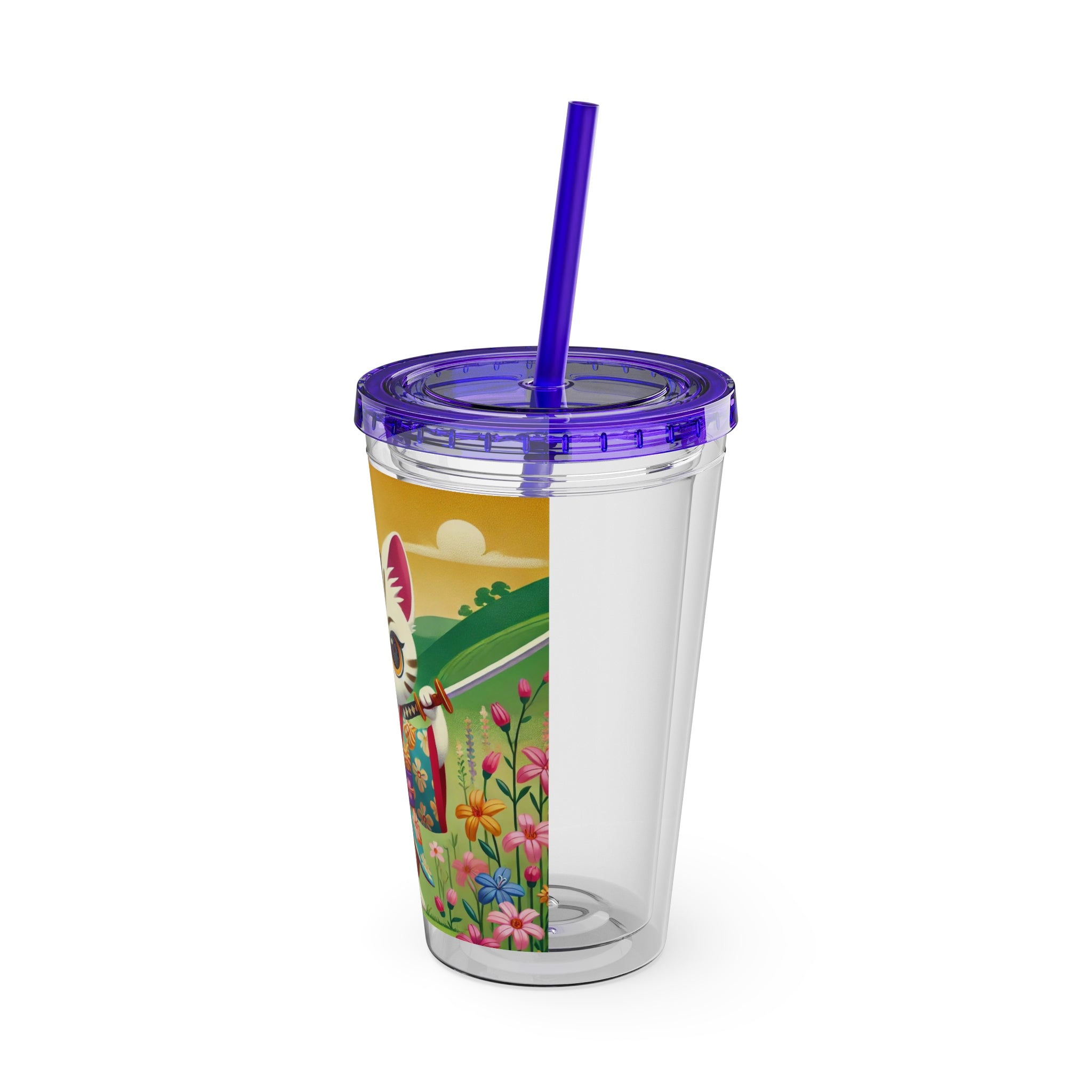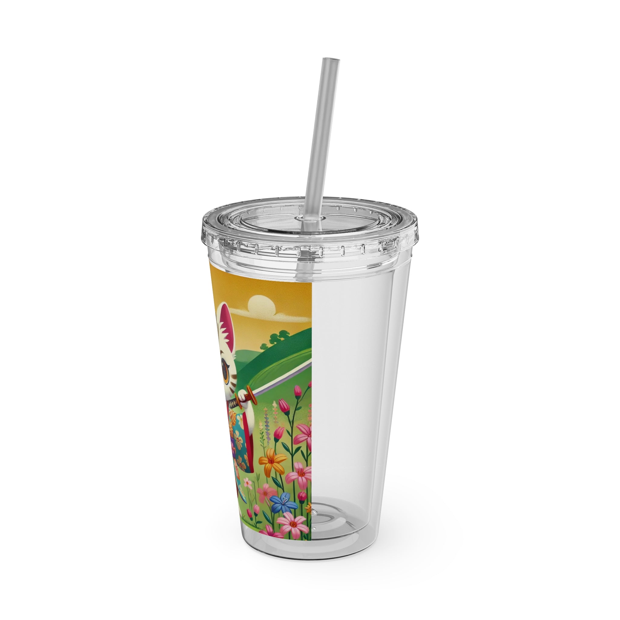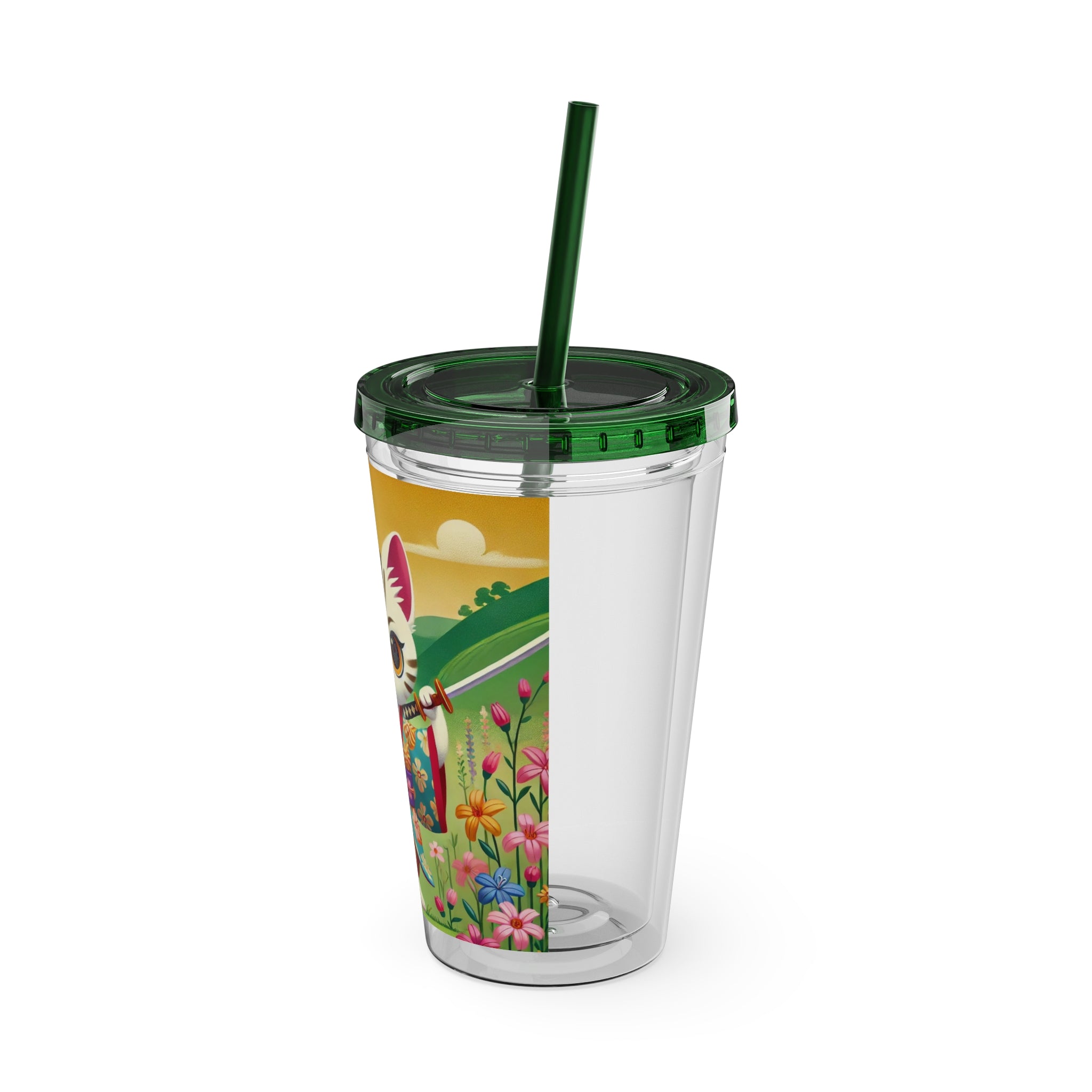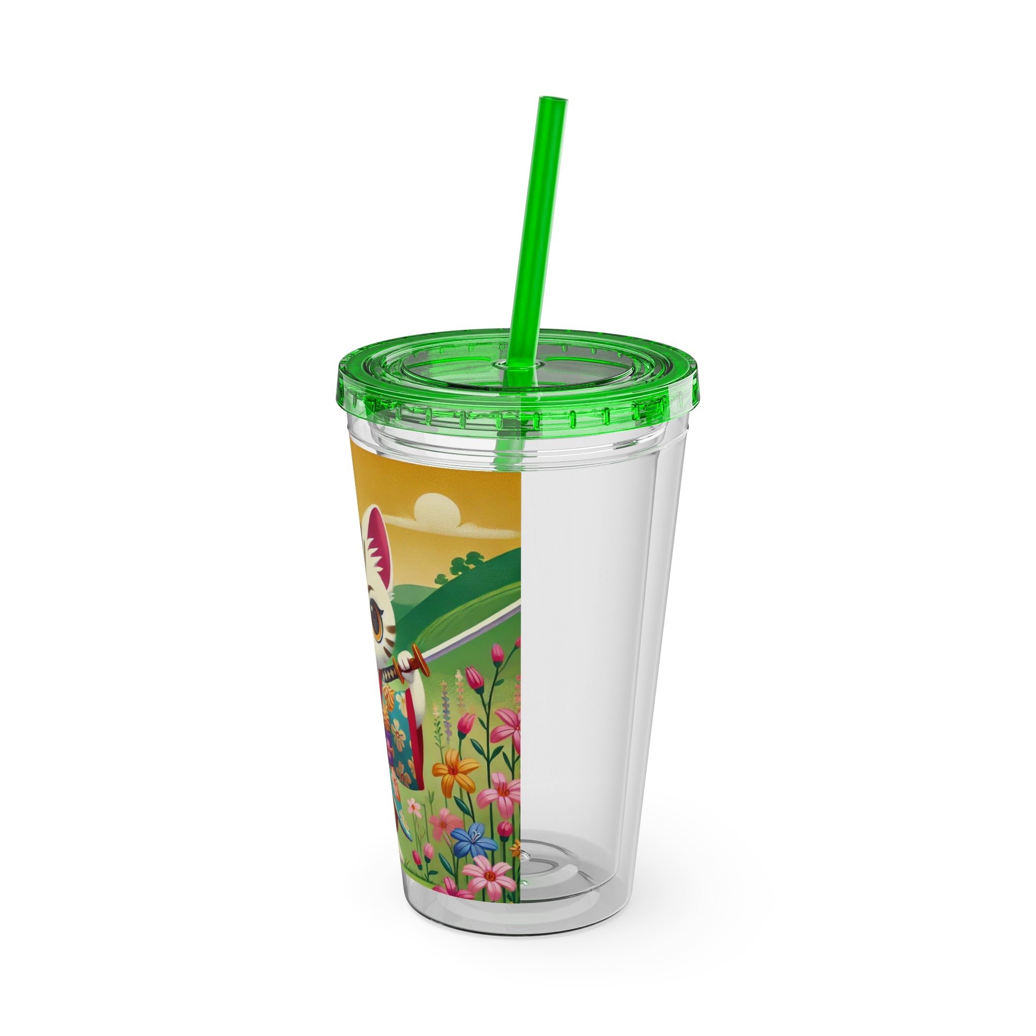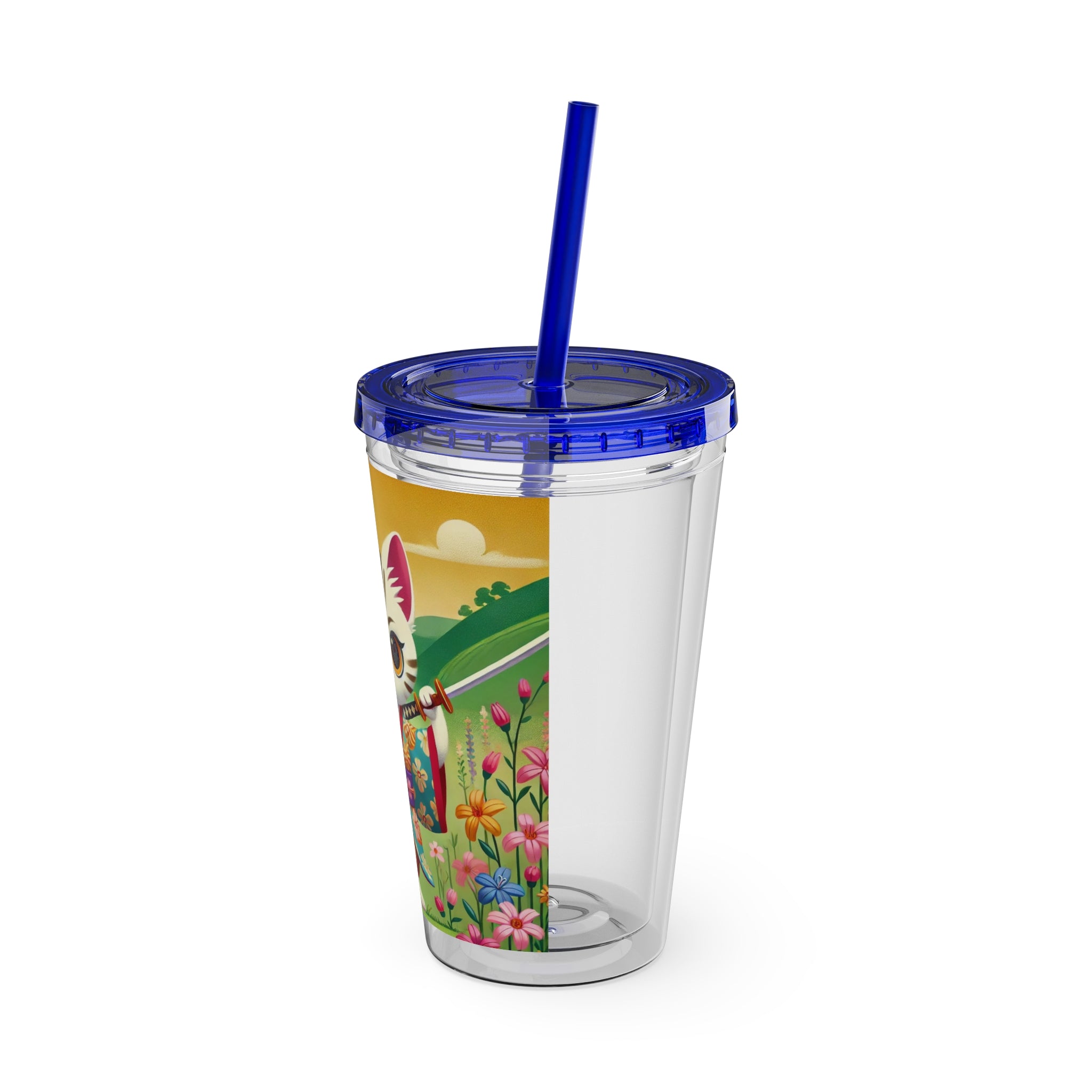 Stay hydrated in style with the Samurai Kitten sunsplash tumbler, featuring a whimsical illustration of a bold kitten dressed in a beautifully patterned kimono, wielding a stylish wooden sword while confidently striding through a serene landscape. This charming design blends elegance and adventure with playful charm, making every sip a little more delightful.
