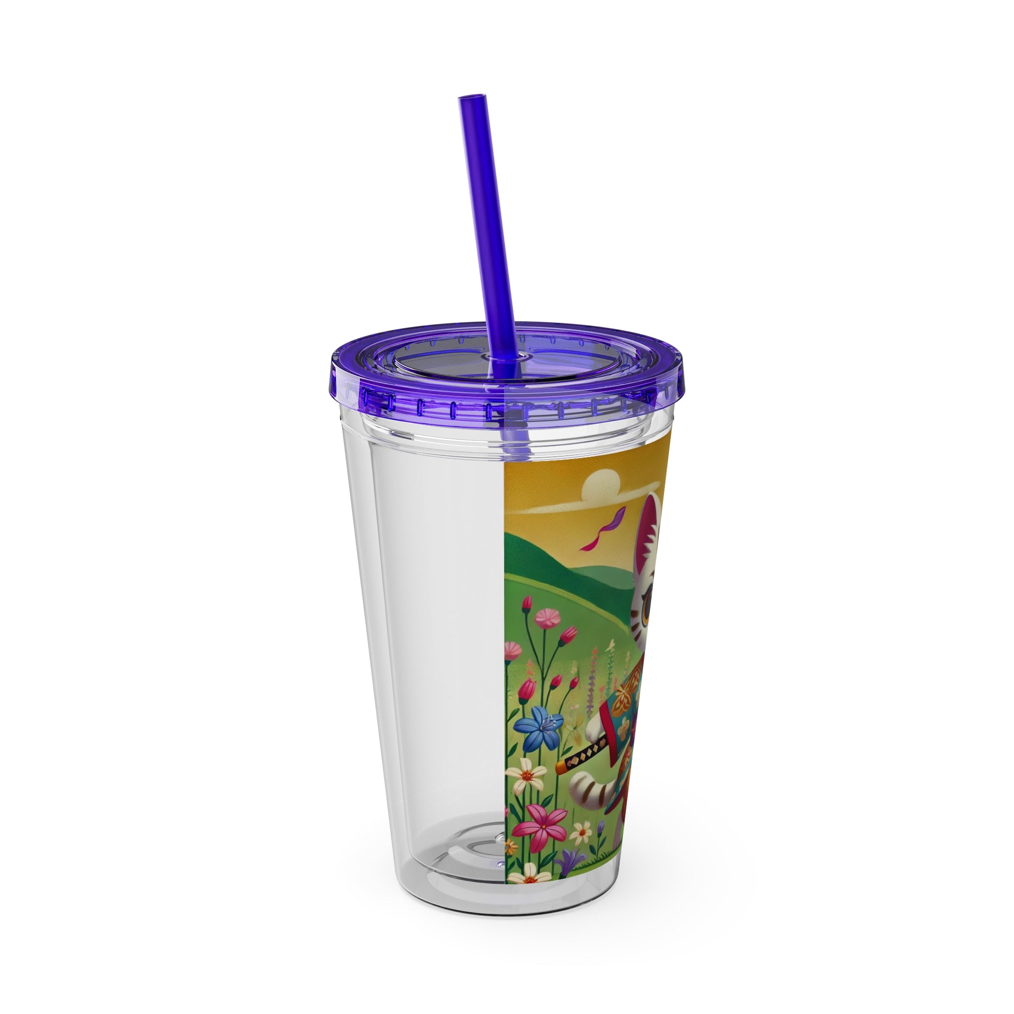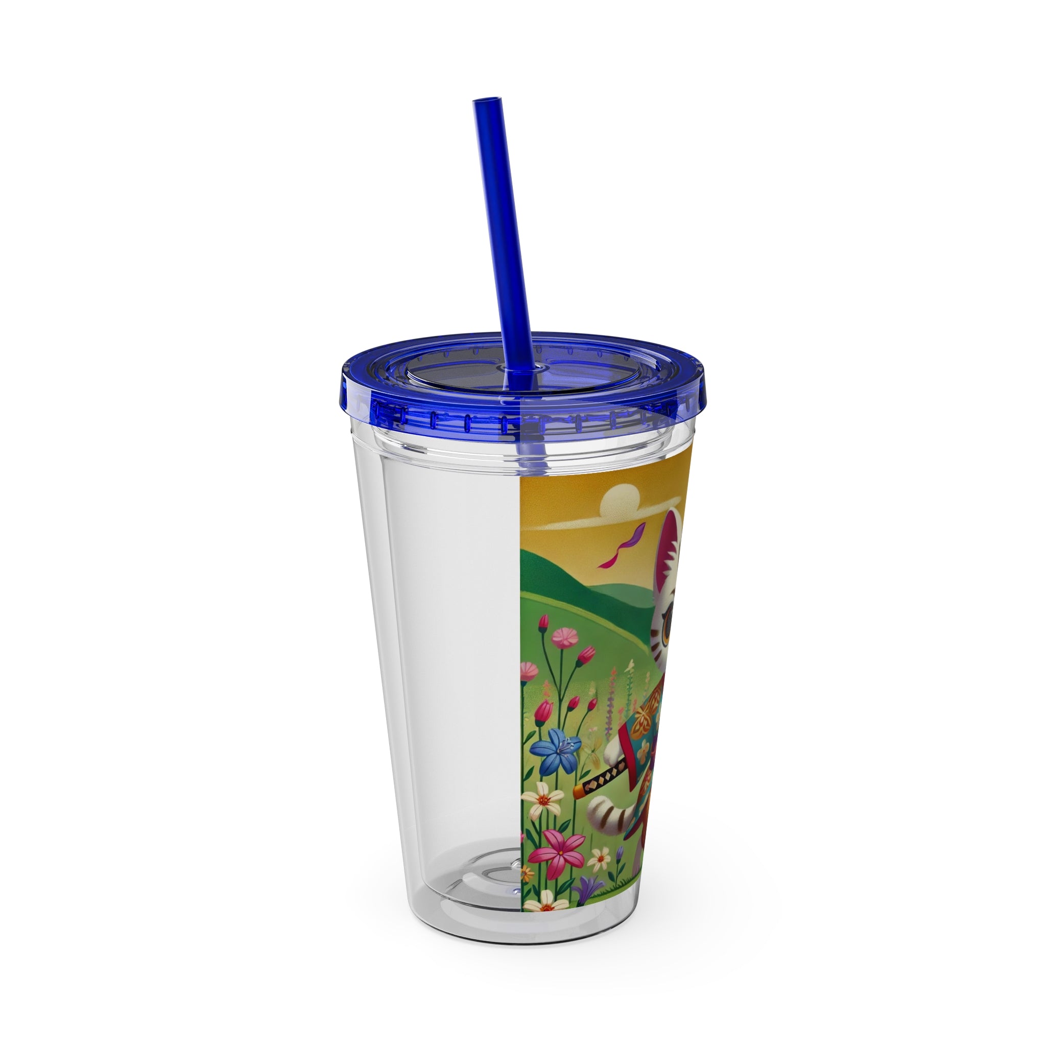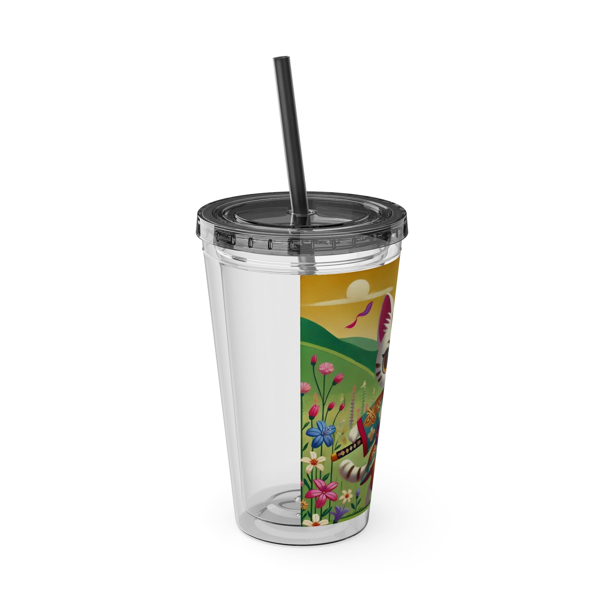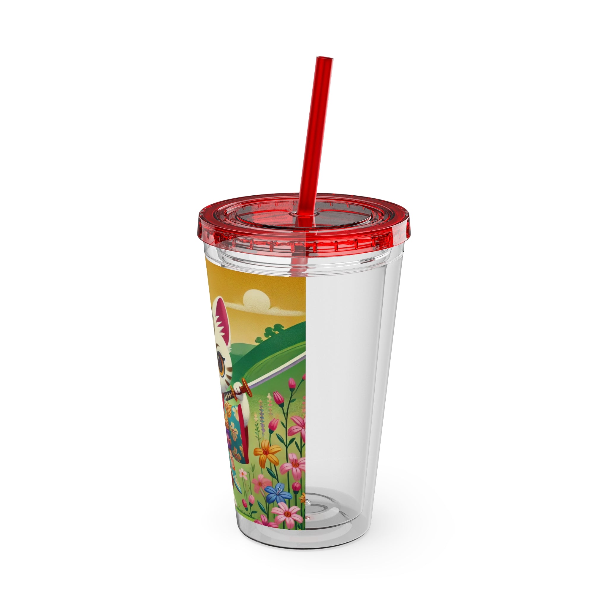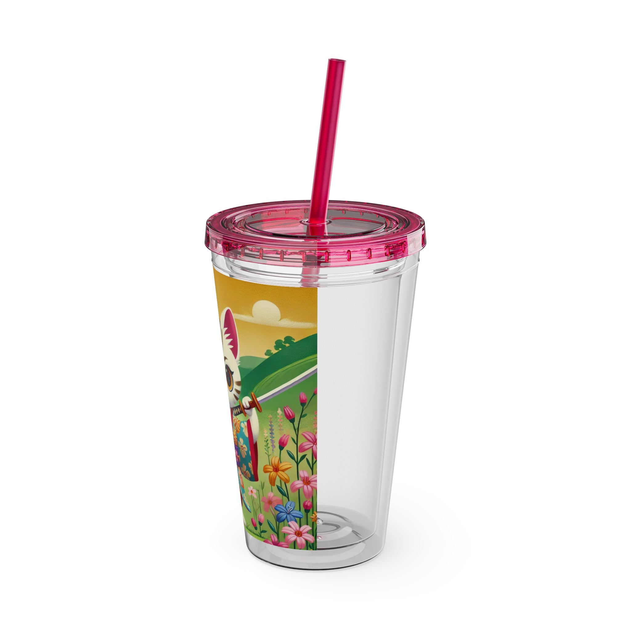 Stay hydrated in style with the Samurai Kitten sunsplash tumbler, featuring a whimsical illustration of a bold kitten dressed in a beautifully patterned kimono, wielding a stylish wooden sword while confidently striding through a serene landscape. This charming design blends elegance and adventure with playful charm, making every sip a little more delightful.