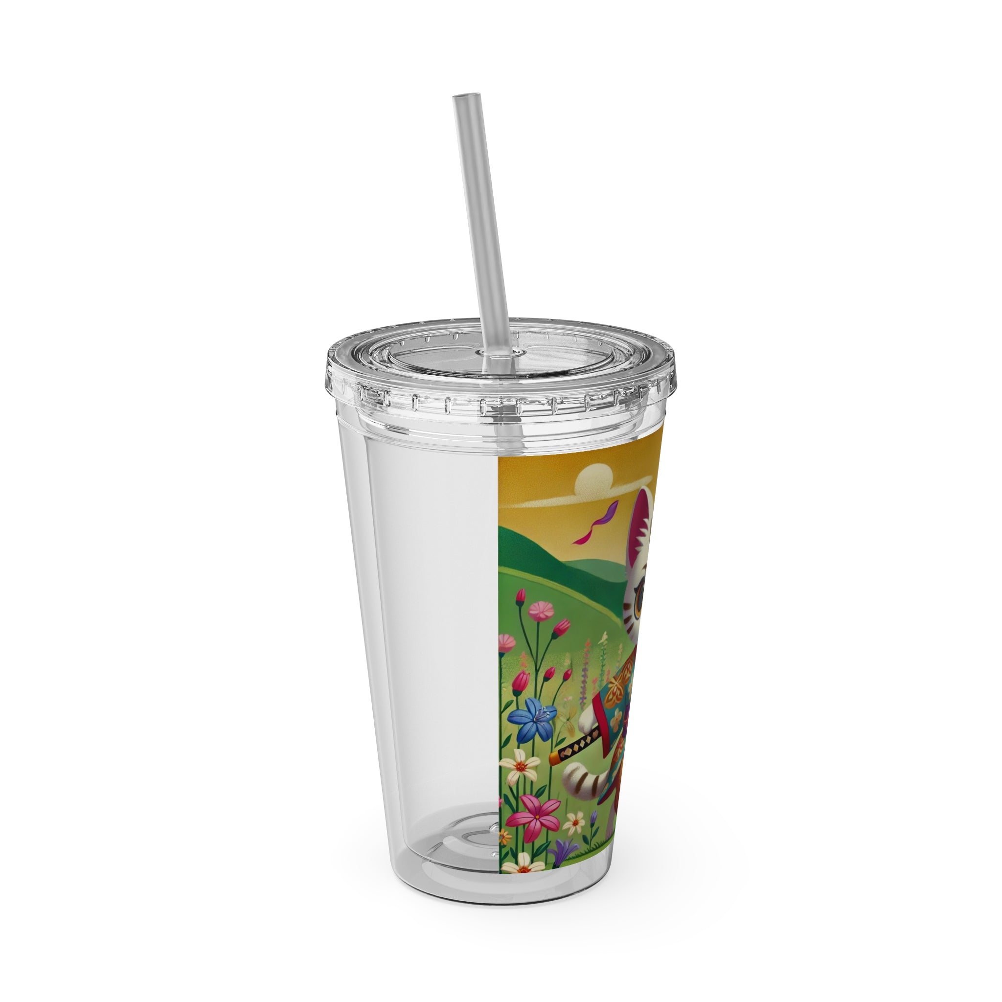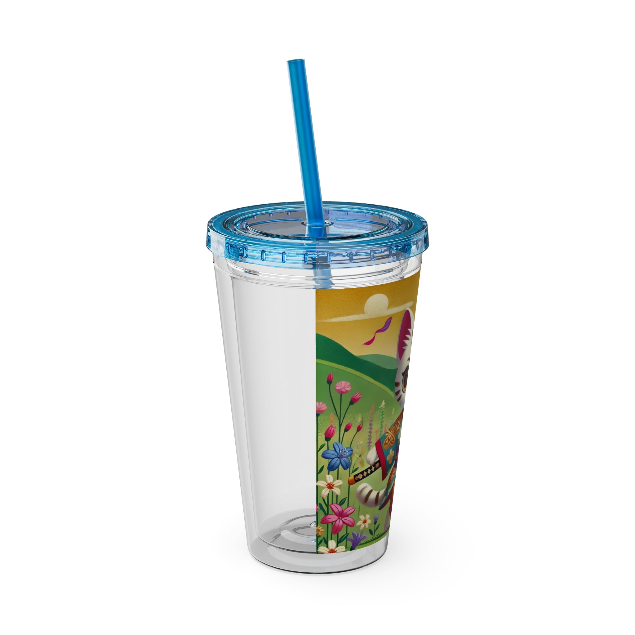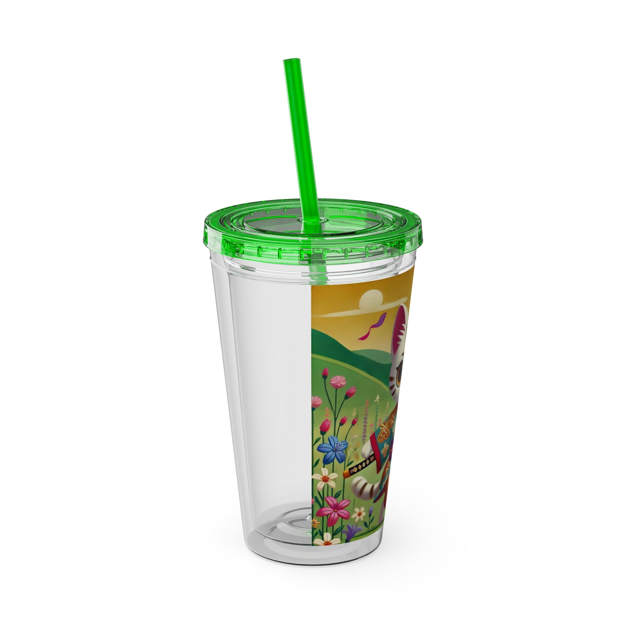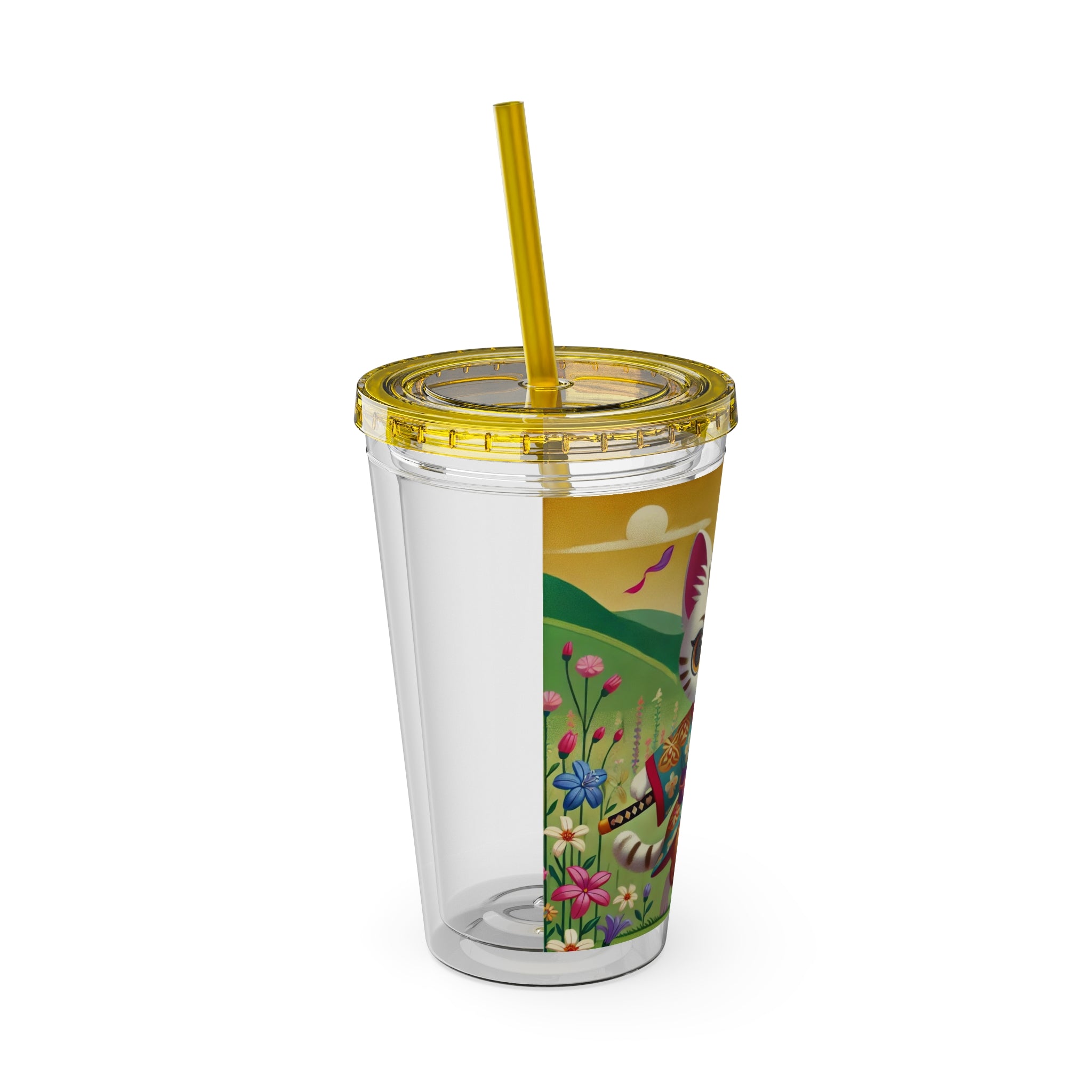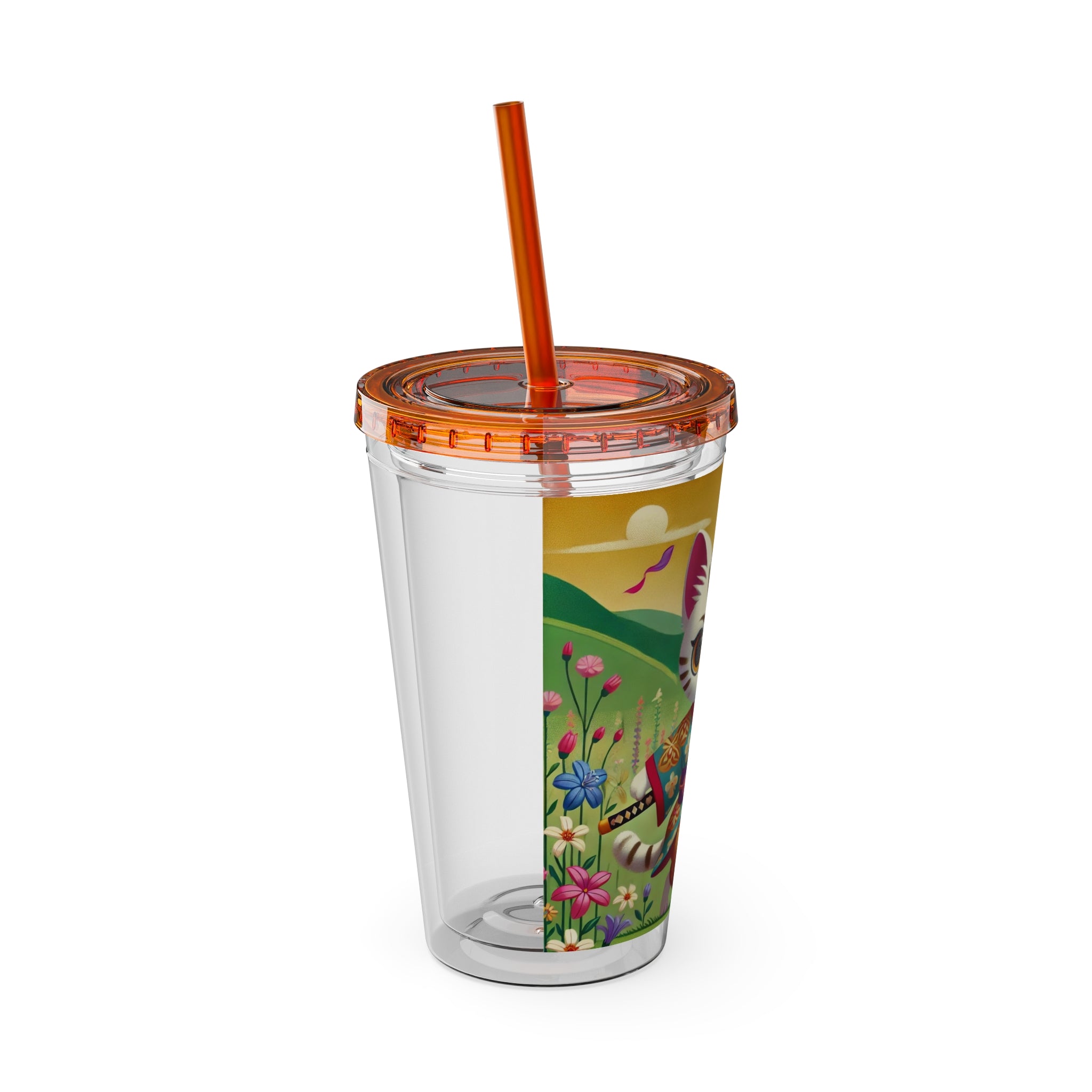 Stay hydrated in style with the Samurai Kitten sunsplash tumbler, featuring a whimsical illustration of a bold kitten dressed in a beautifully patterned kimono, wielding a stylish wooden sword while confidently striding through a serene landscape. This charming design blends elegance and adventure with playful charm, making every sip a little more delightful.