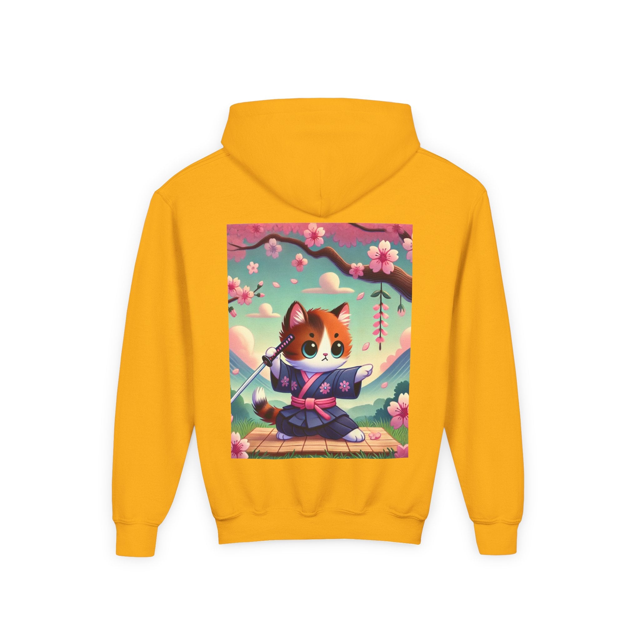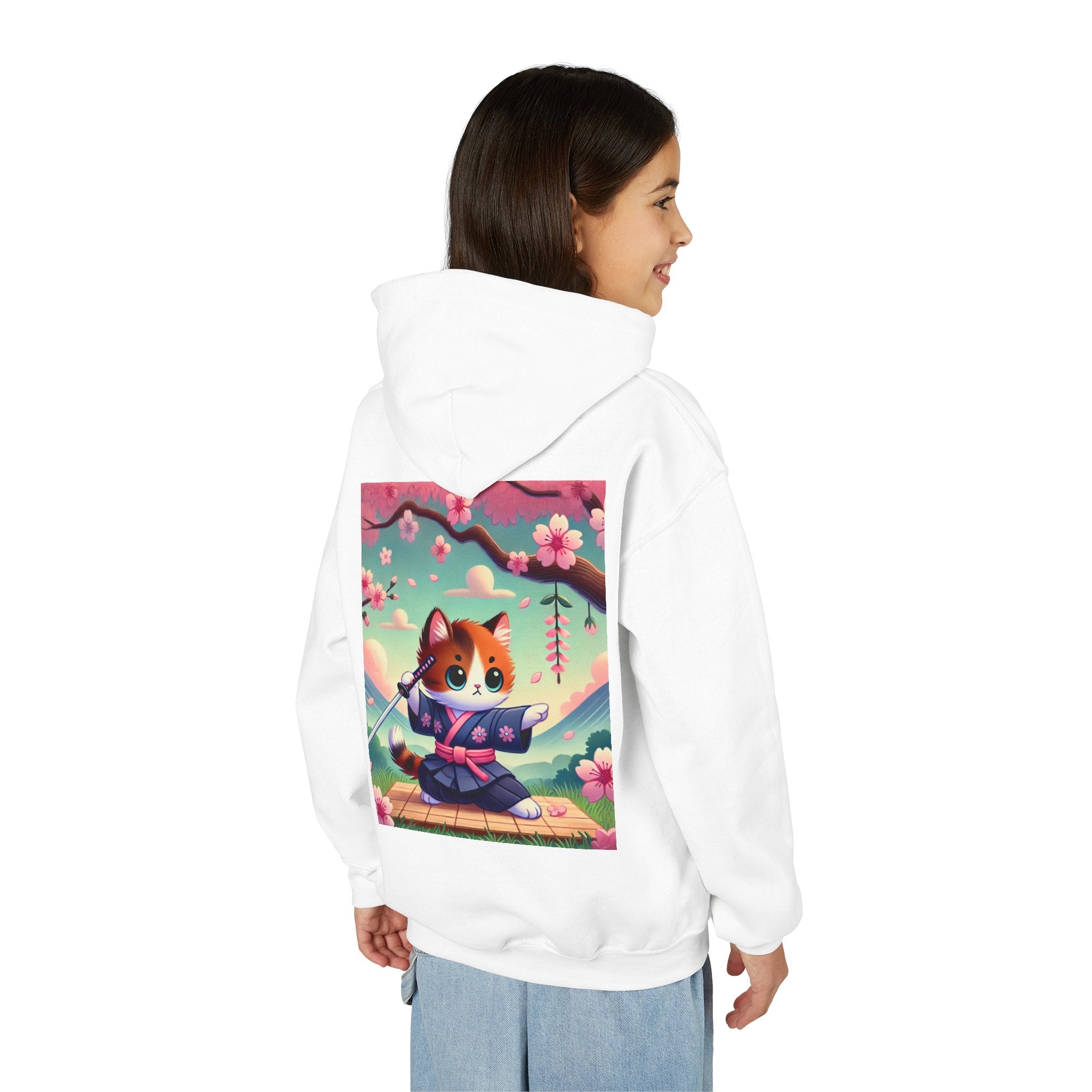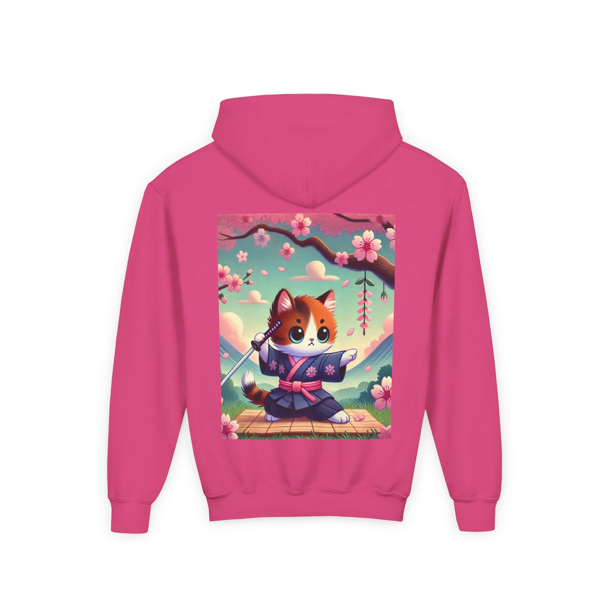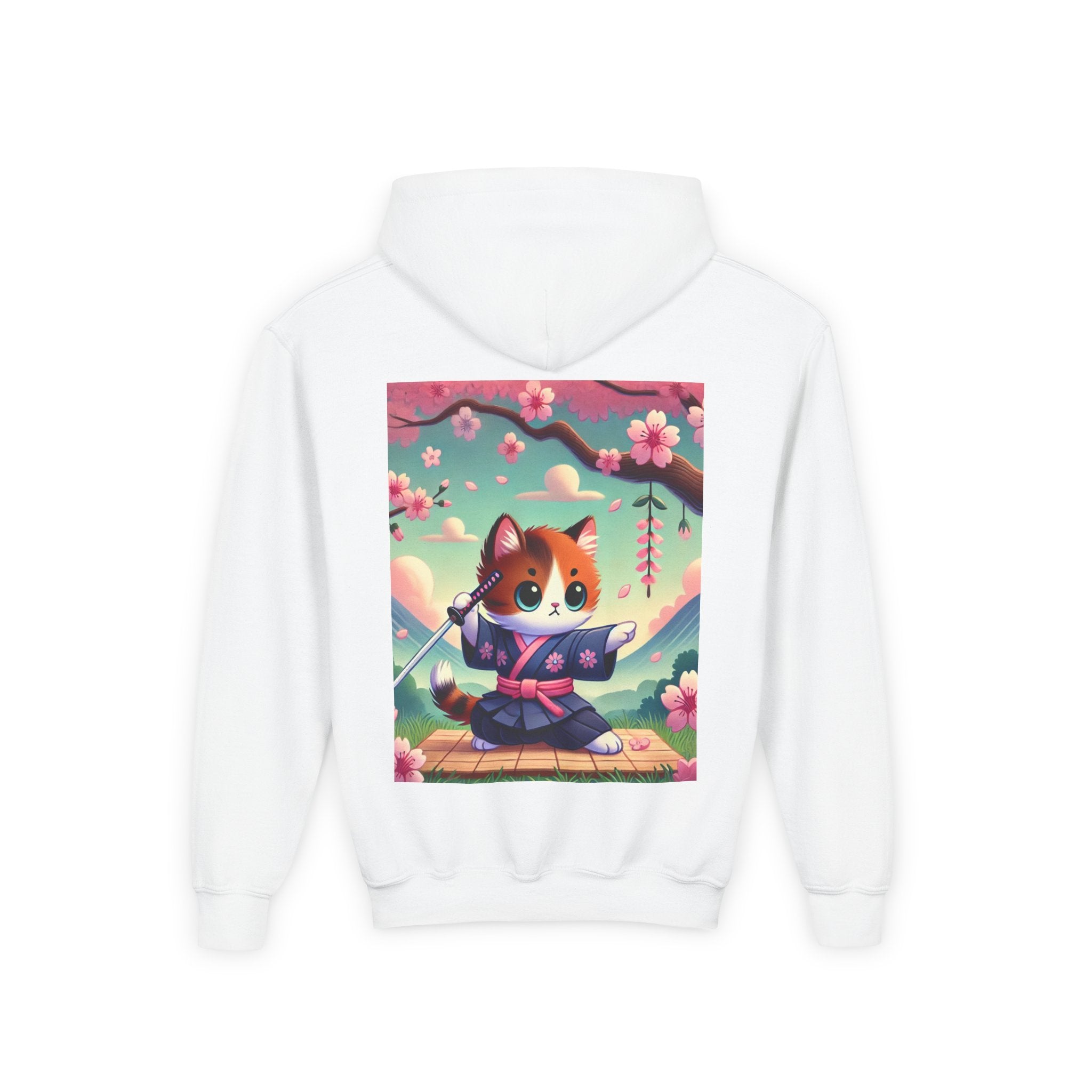 Samurai Kitten Youth Heavy Blend Hooded Sweatshirt brings together comfort, imagination, and timeless artistry. Made from ultra-soft, preshrunk fleece, this hoodie feels cozy and smooth while minimizing lint buildup for everyday wear. The 50/50 cotton-polyester blend offers a perfect balance of warmth and durability, featuring a handy kangaroo pocket and a twill-reinforced neck for lasting structure. Please note: due to the fabric properties, the White color variant may appear slightly off-white.