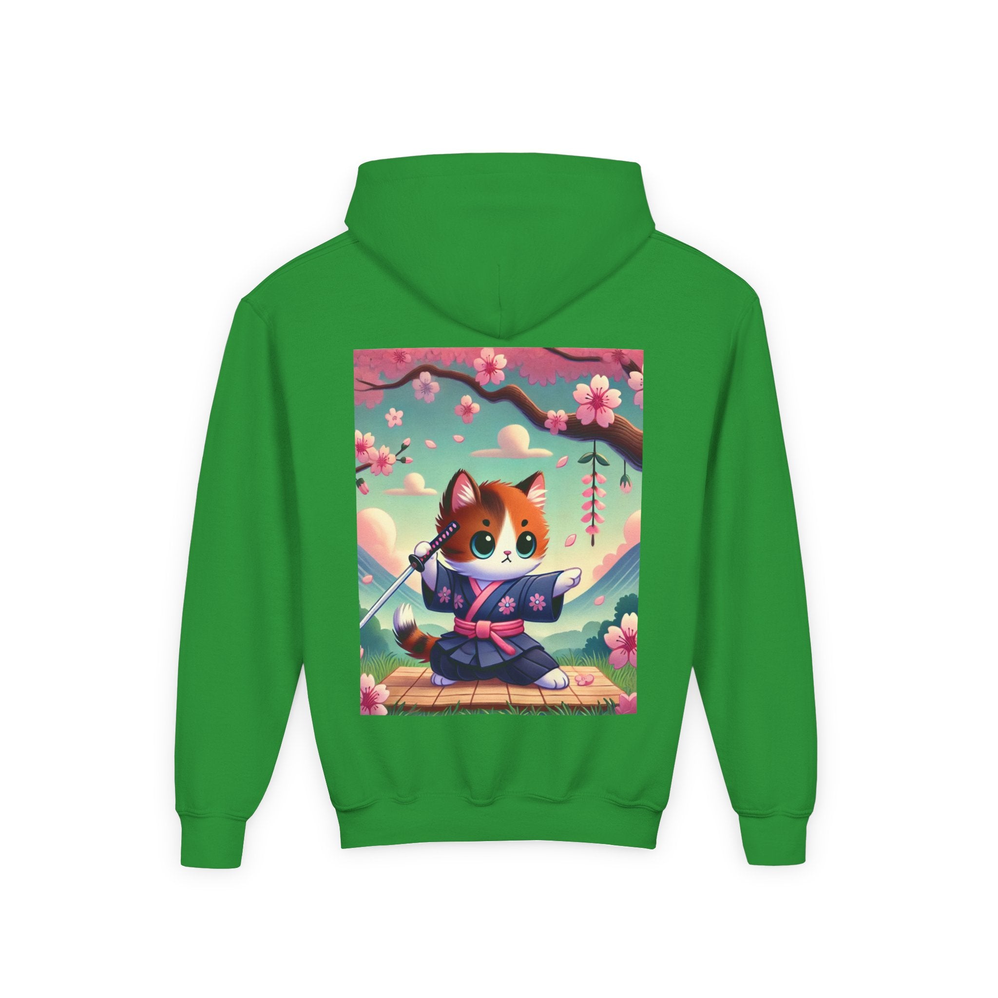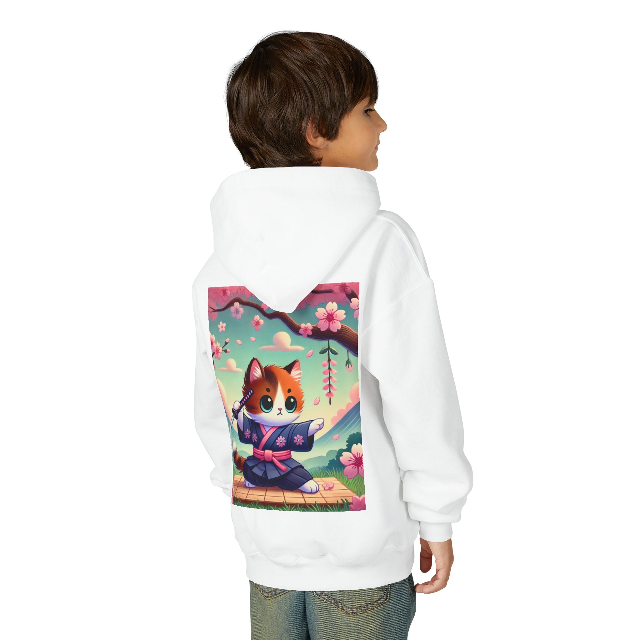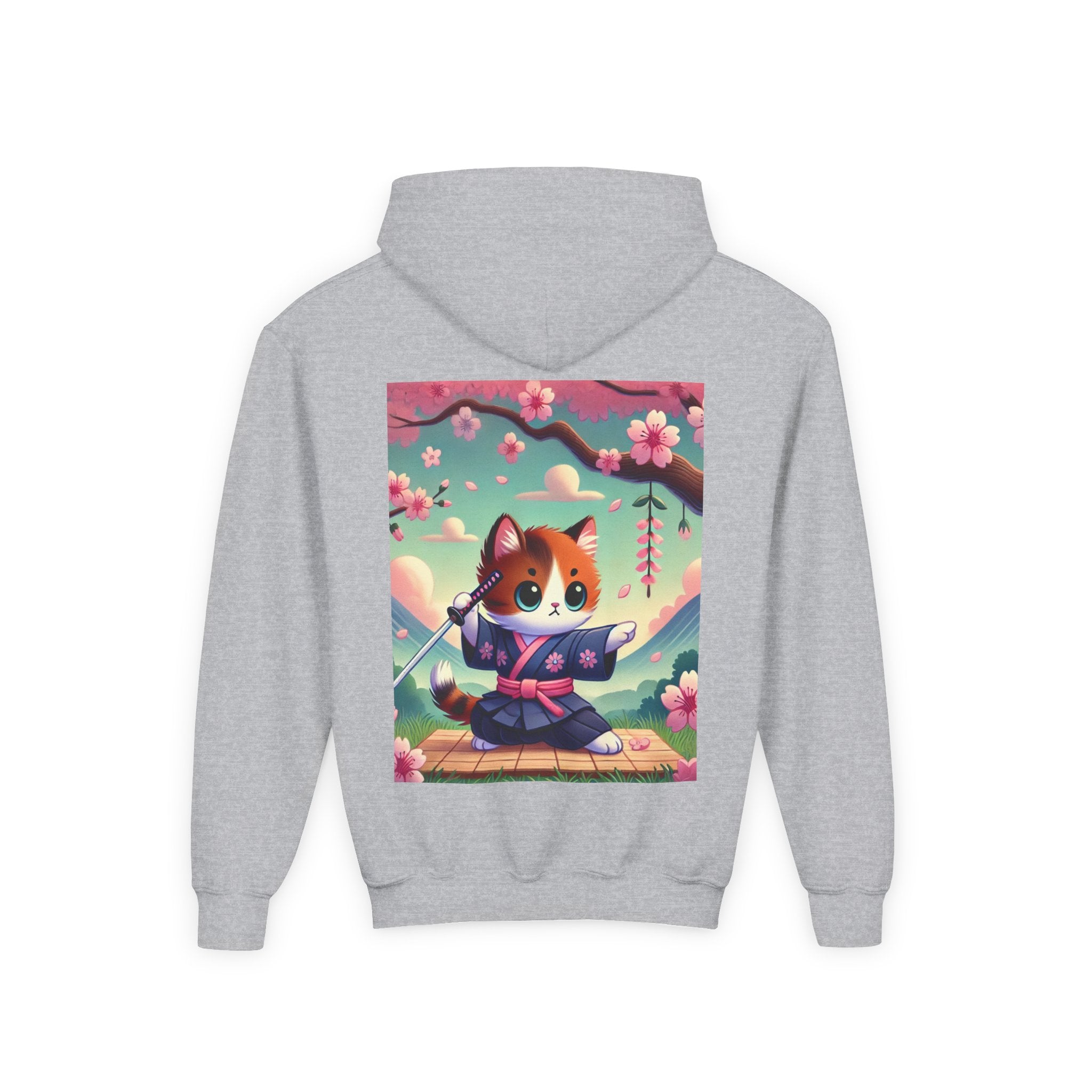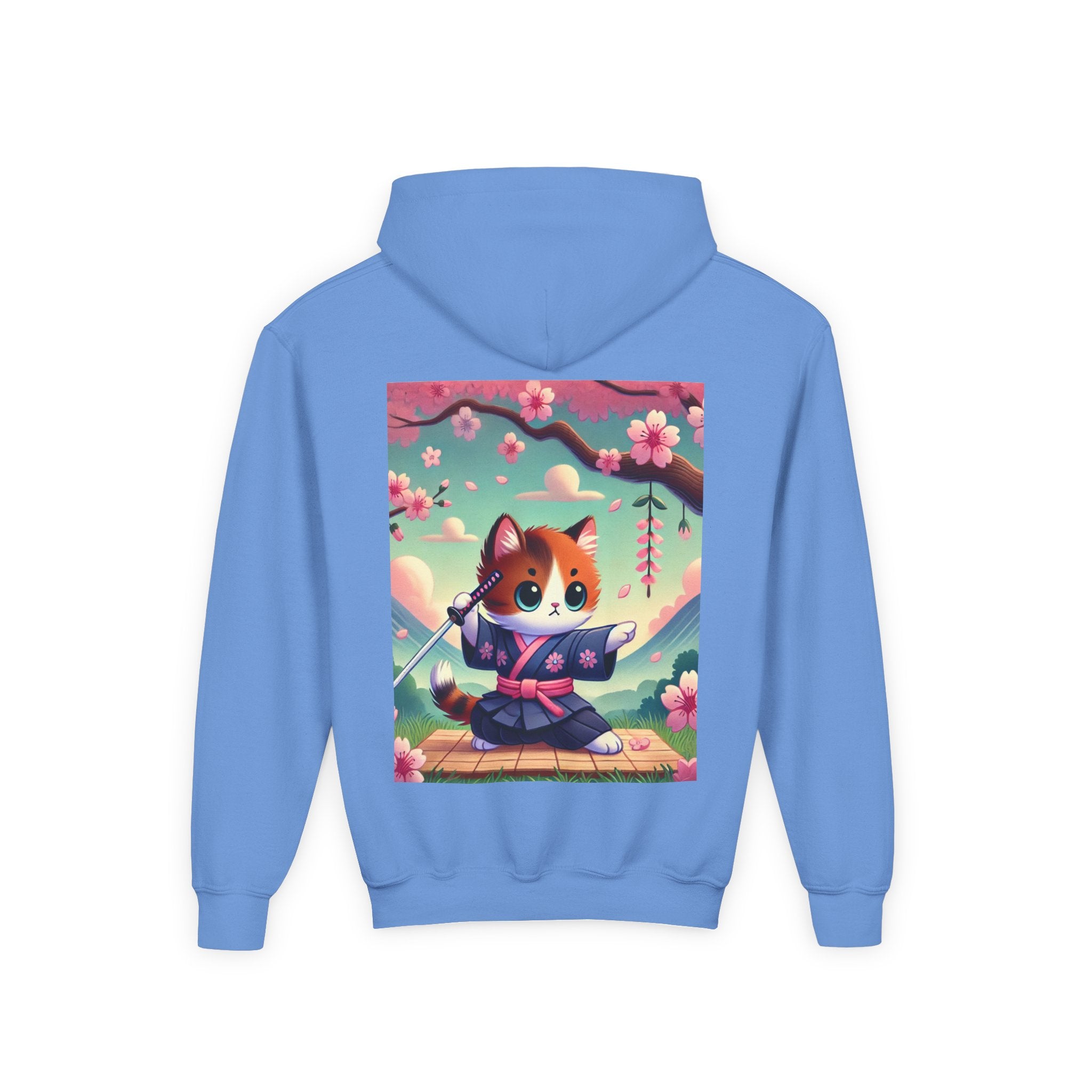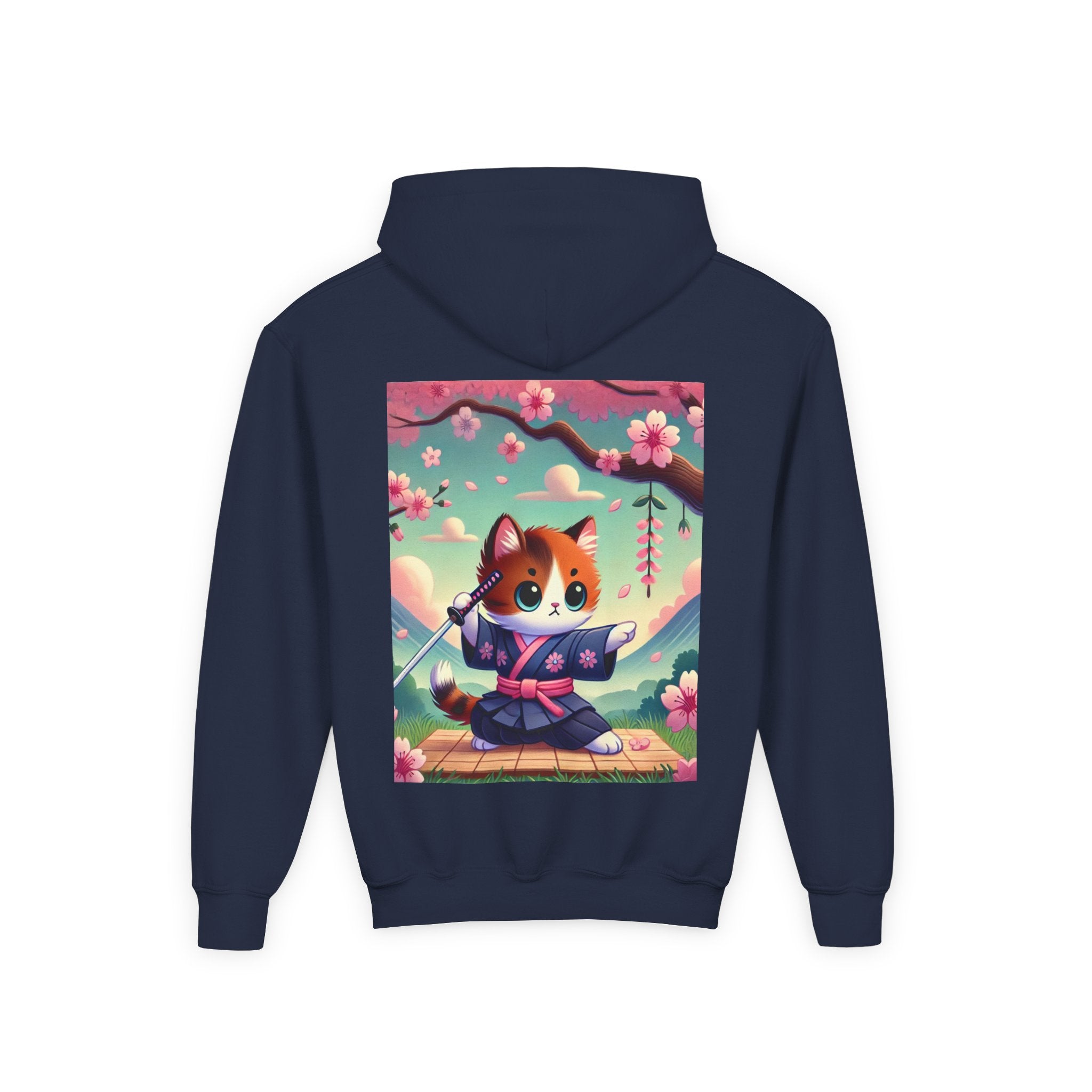 Samurai Kitten Youth Heavy Blend Hooded Sweatshirt brings together comfort, imagination, and timeless artistry. Made from ultra-soft, preshrunk fleece, this hoodie feels cozy and smooth while minimizing lint buildup for everyday wear. The 50/50 cotton-polyester blend offers a perfect balance of warmth and durability, featuring a handy kangaroo pocket and a twill-reinforced neck for lasting structure. Please note: due to the fabric properties, the White color variant may appear slightly off-white.