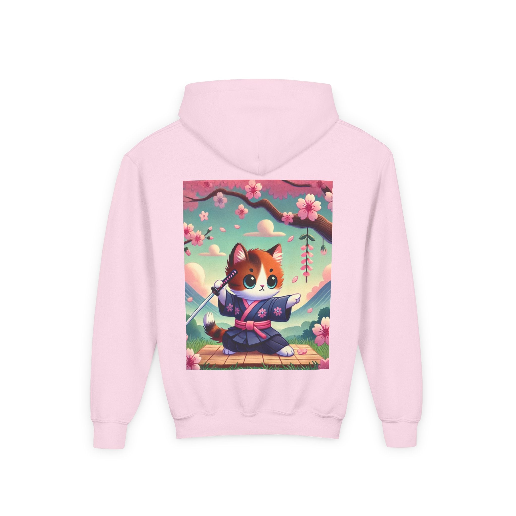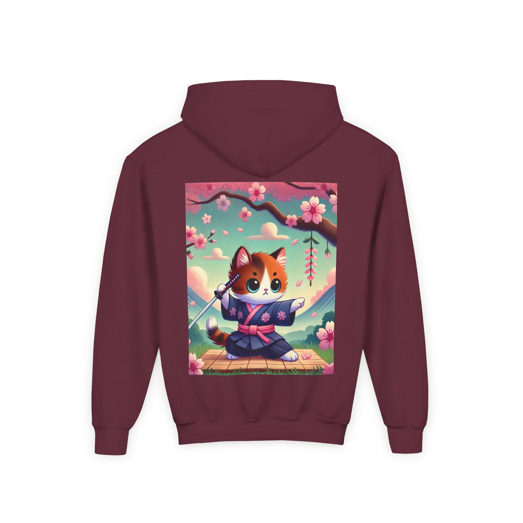 This whimsical and elegant design features a skilled kitten dressed in a traditional samurai kimono, gracefully practicing sword techniques beneath a blooming cherry blossom tree. Soft pink petals swirl through the air, creating a serene and poetic scene that captures the spirit of discipline, balance, and beauty. A perfect blend of artistry and charm, this hoodie celebrates focus and imagination with a touch of feline grace.