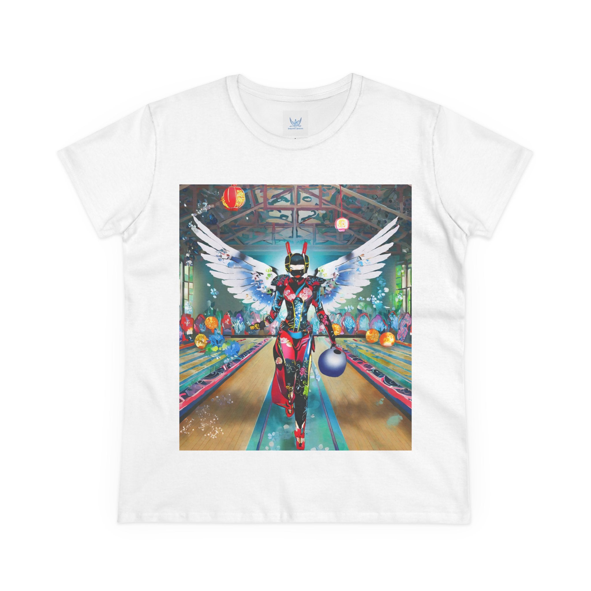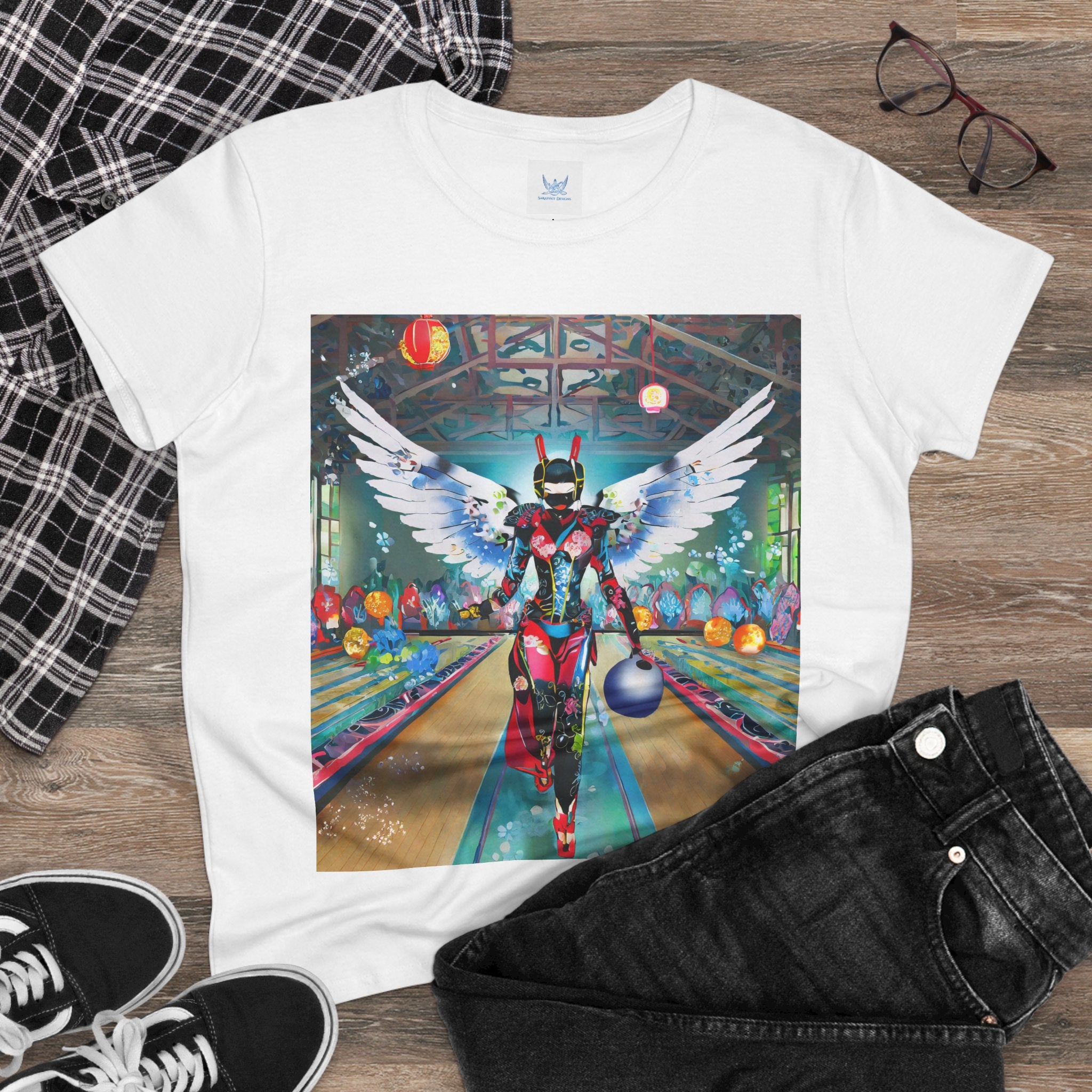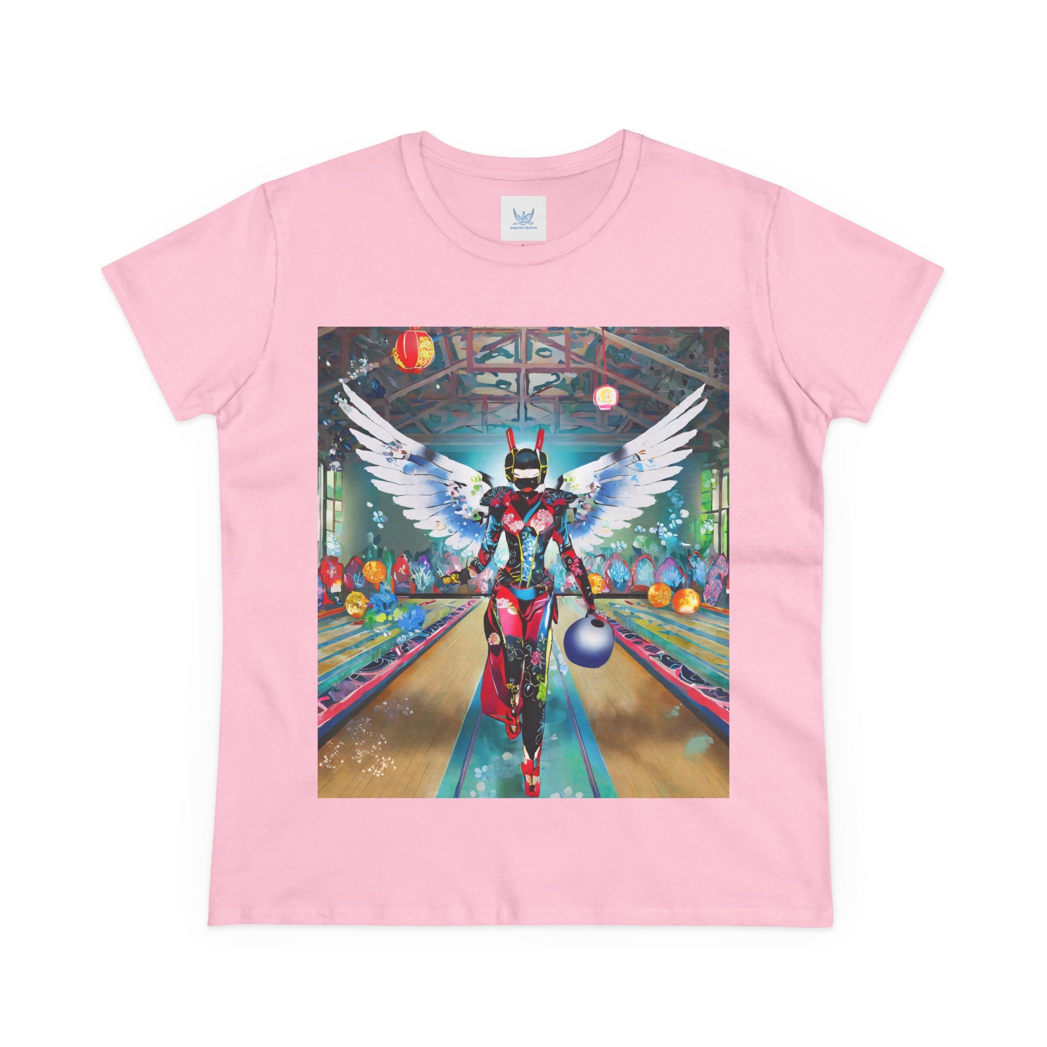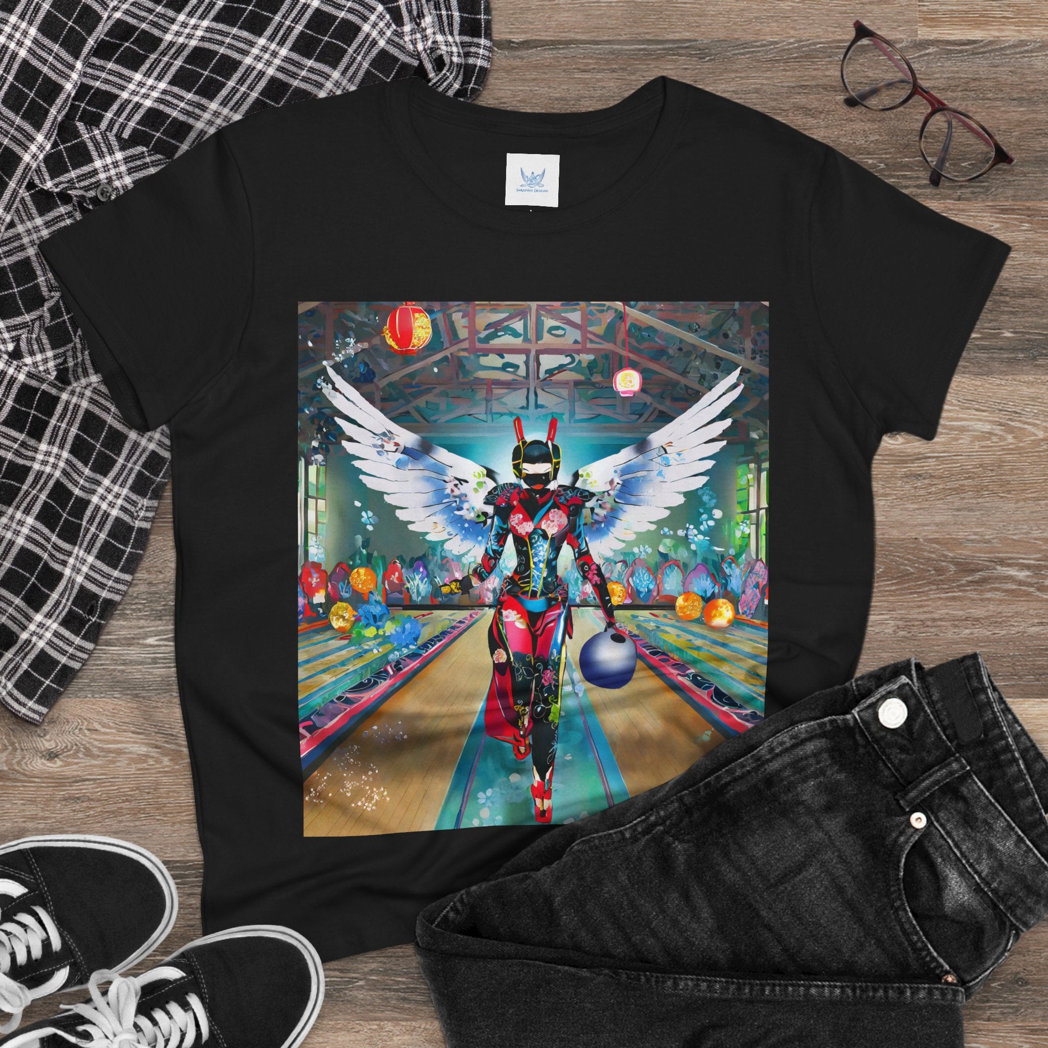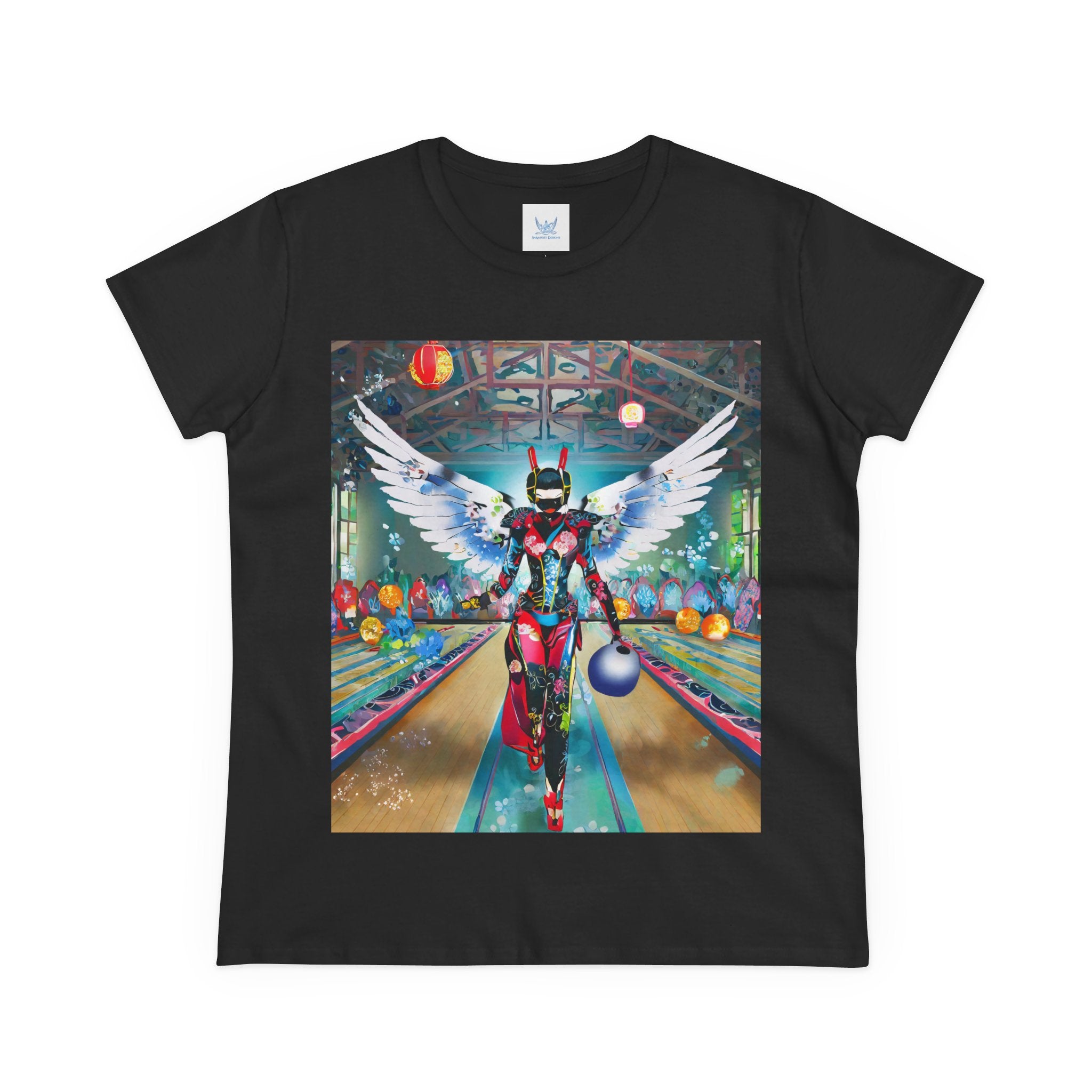 The artwork showcases high fashion cyber punk samurai robot angels confidently striding down a neon-lit bowling lane, ball in hand, in a futuristic bowling alley. Glowing wings, intricate armor, and vibrant cyber details create a dynamic scene that blends sport, sci-fi, and celestial energy into a striking piece of wearable art.