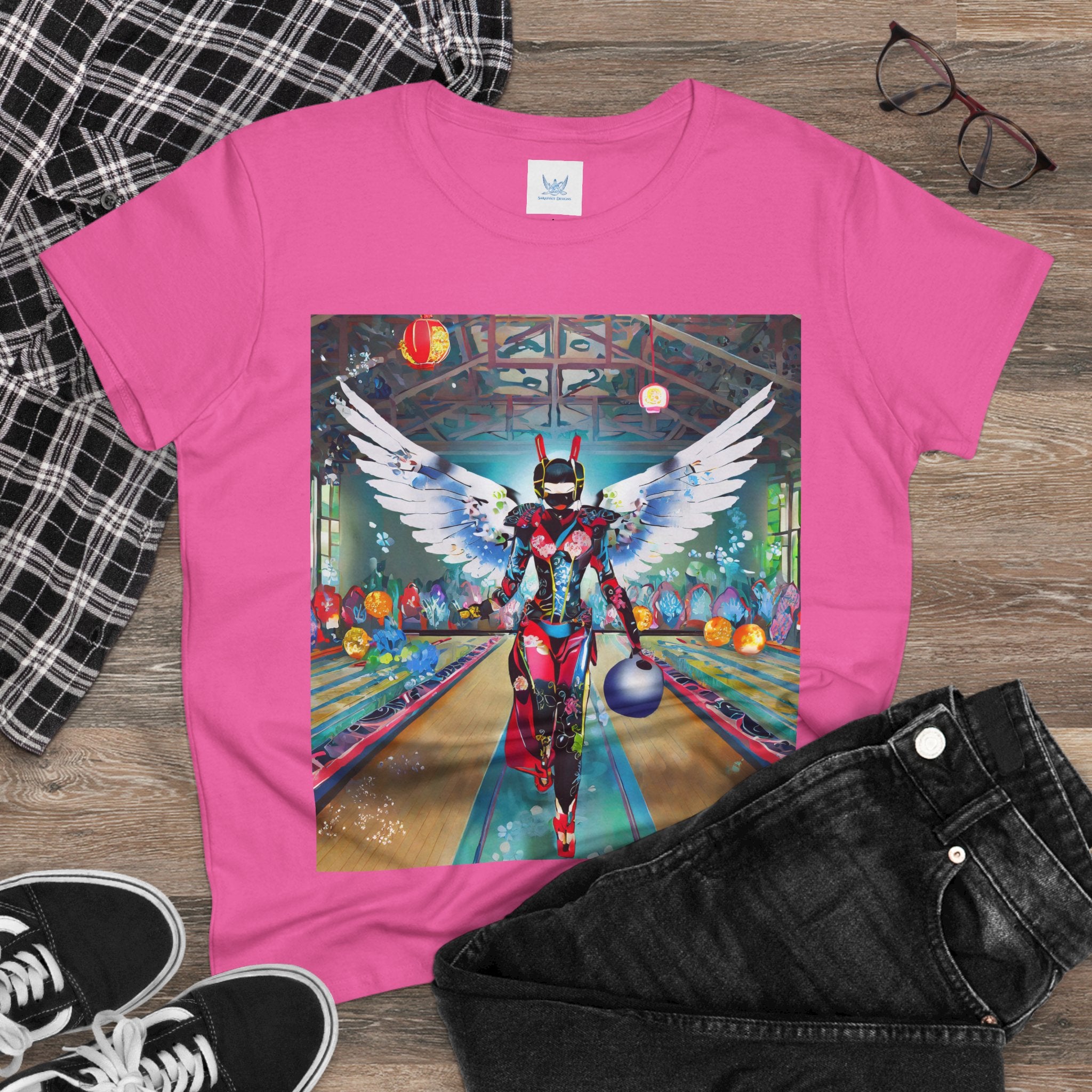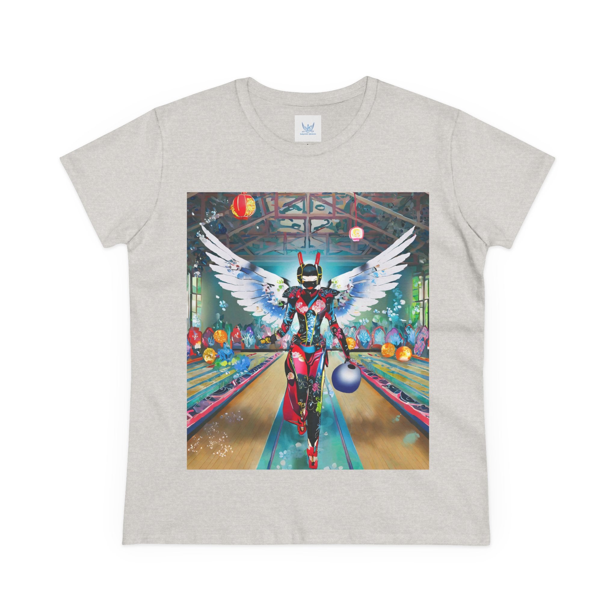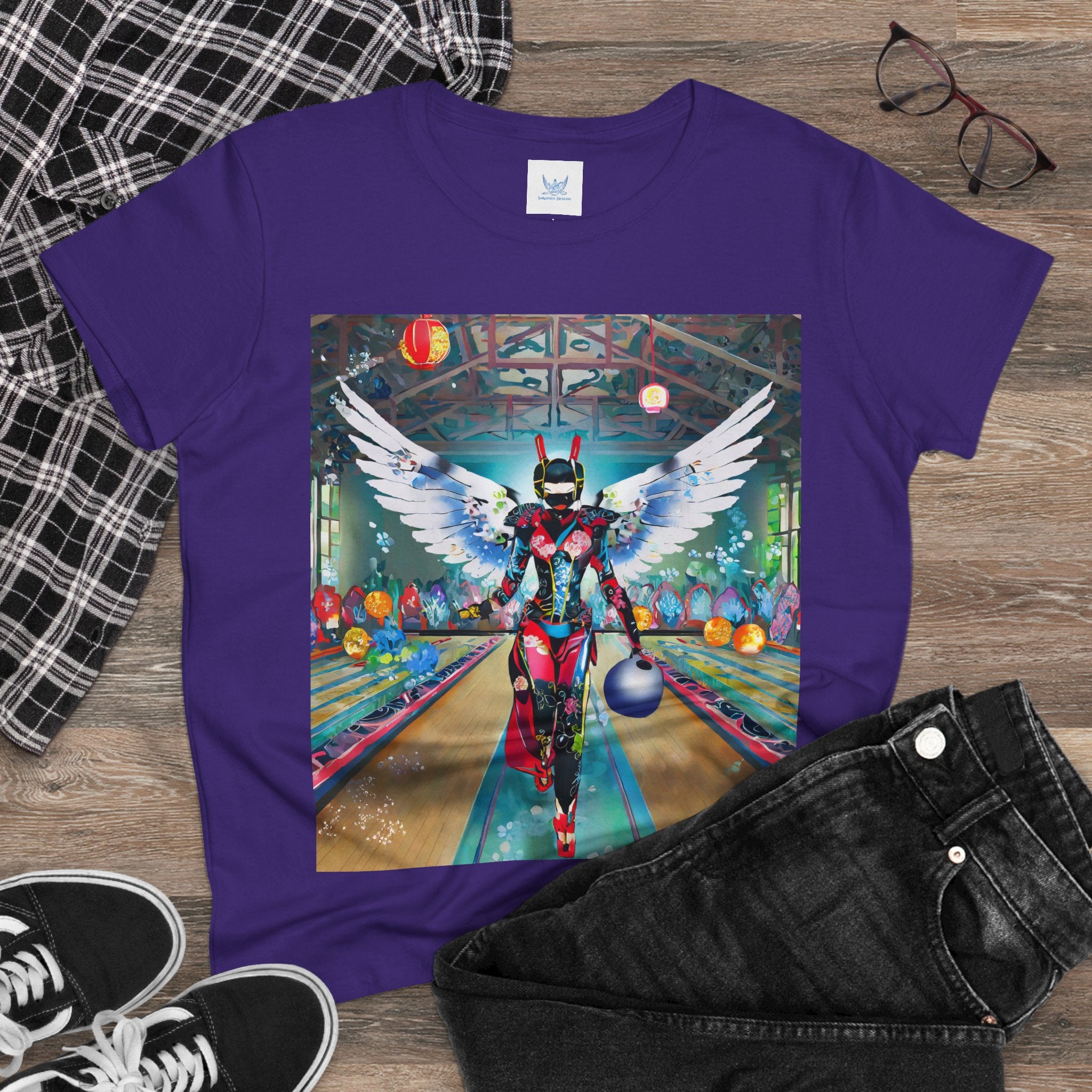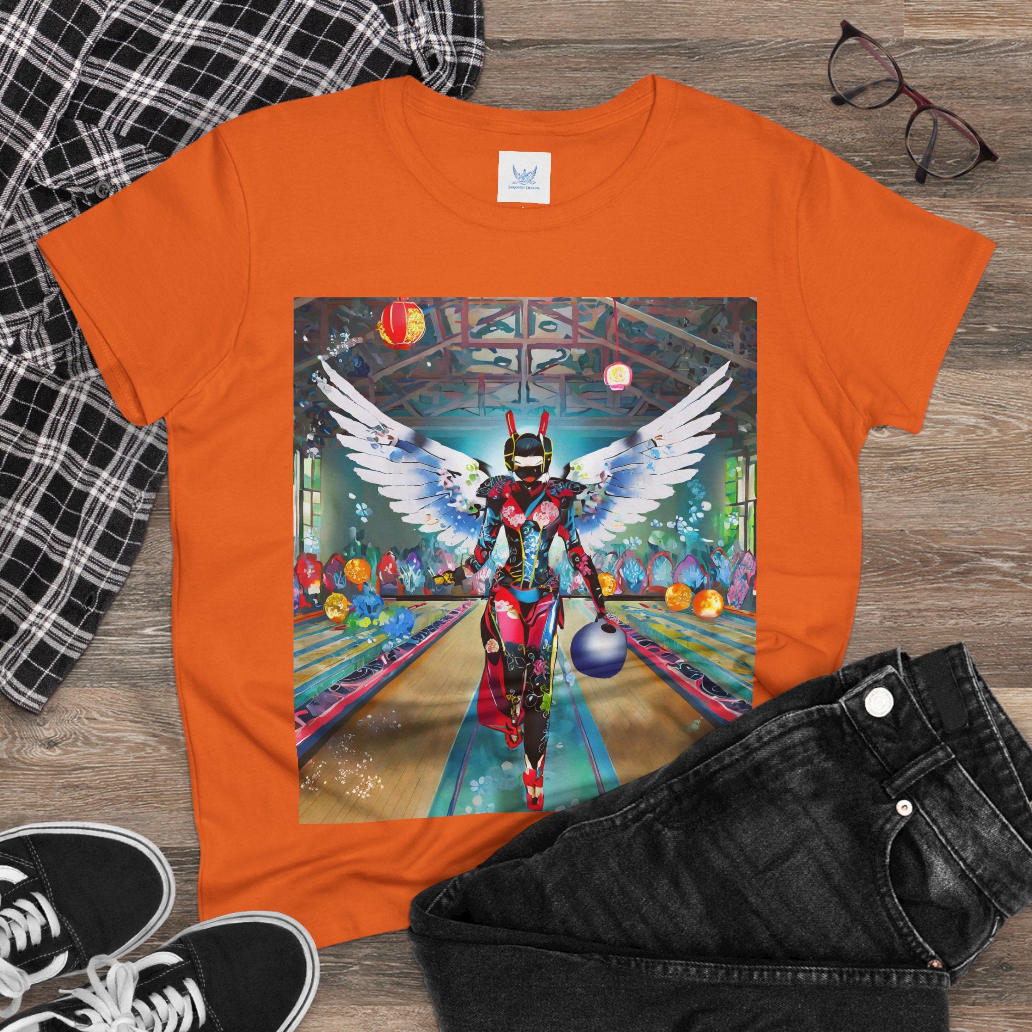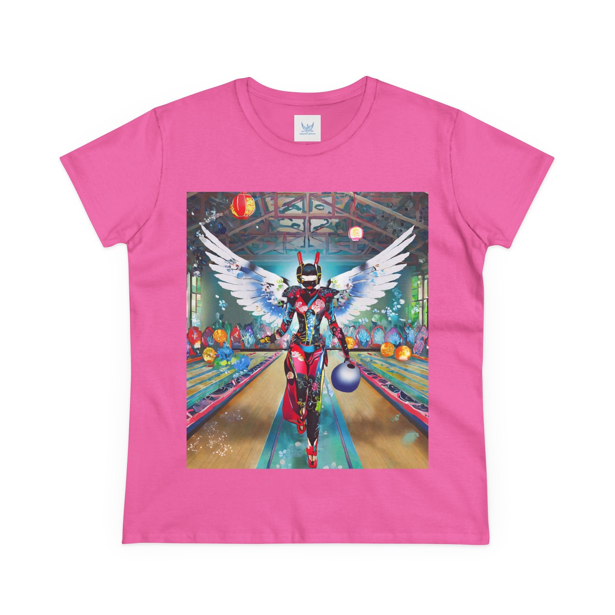 The artwork showcases high fashion cyber punk samurai robot angels confidently striding down a neon-lit bowling lane, ball in hand, in a futuristic bowling alley. Glowing wings, intricate armor, and vibrant cyber details create a dynamic scene that blends sport, sci-fi, and celestial energy into a striking piece of wearable art.