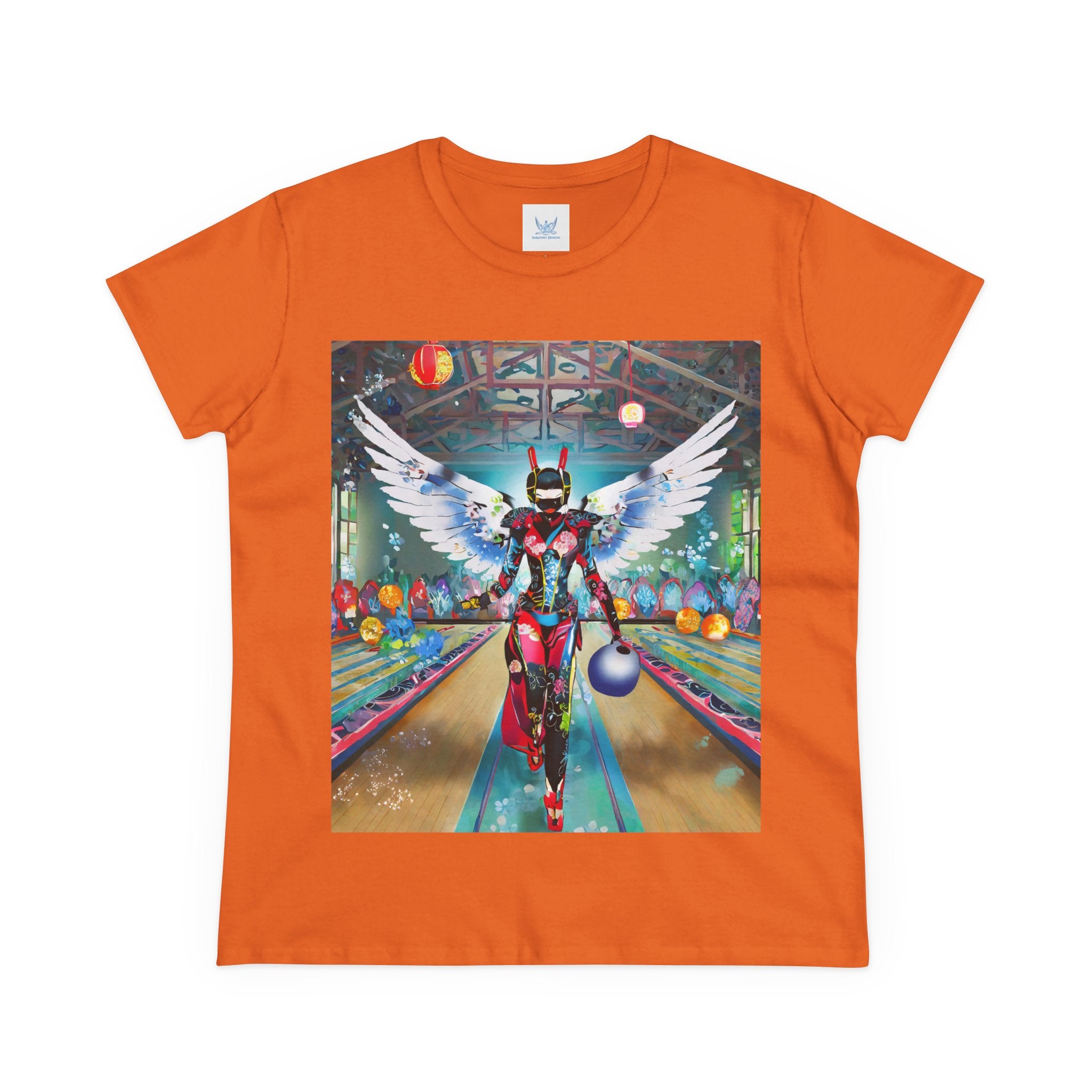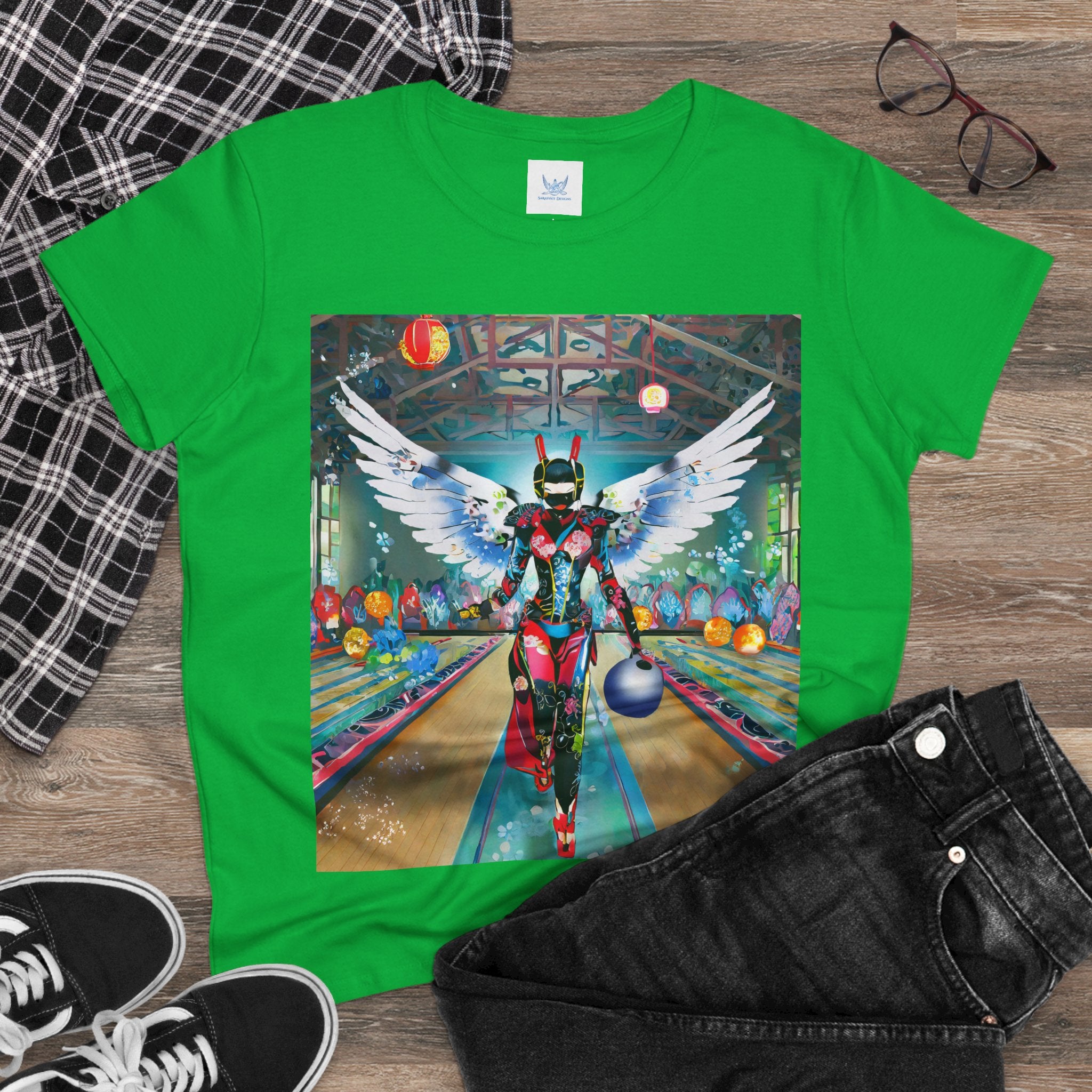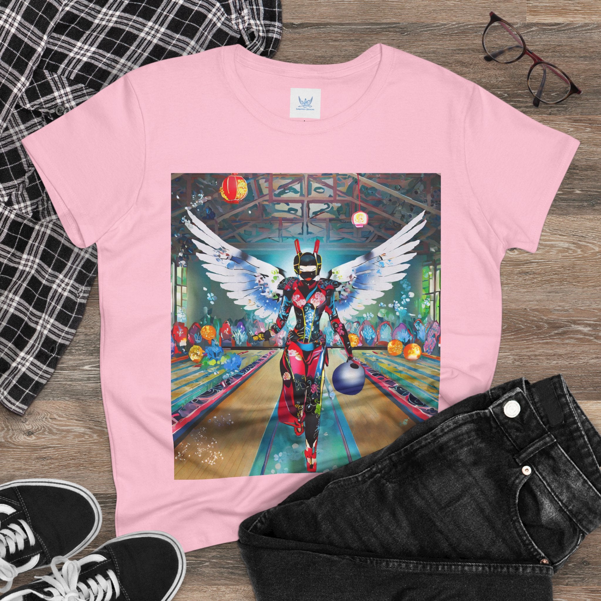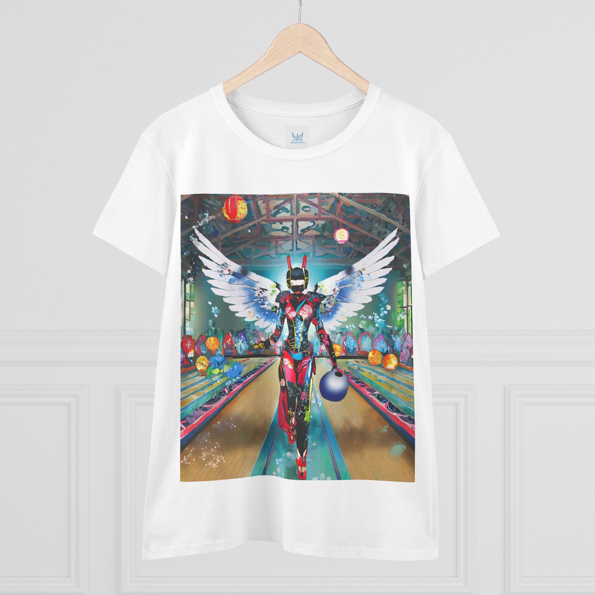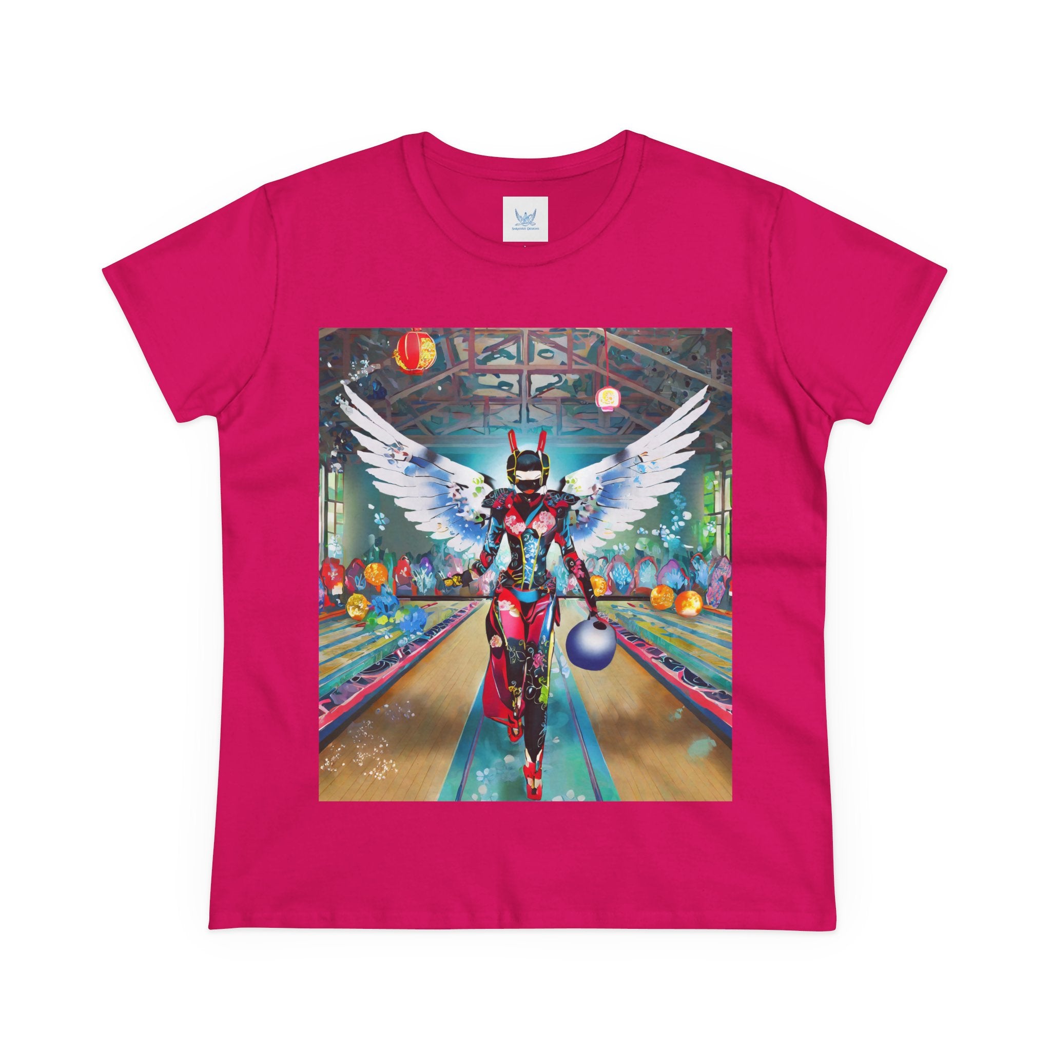 The artwork showcases high fashion cyber punk samurai robot angels confidently striding down a neon-lit bowling lane, ball in hand, in a futuristic bowling alley. Glowing wings, intricate armor, and vibrant cyber details create a dynamic scene that blends sport, sci-fi, and celestial energy into a striking piece of wearable art.