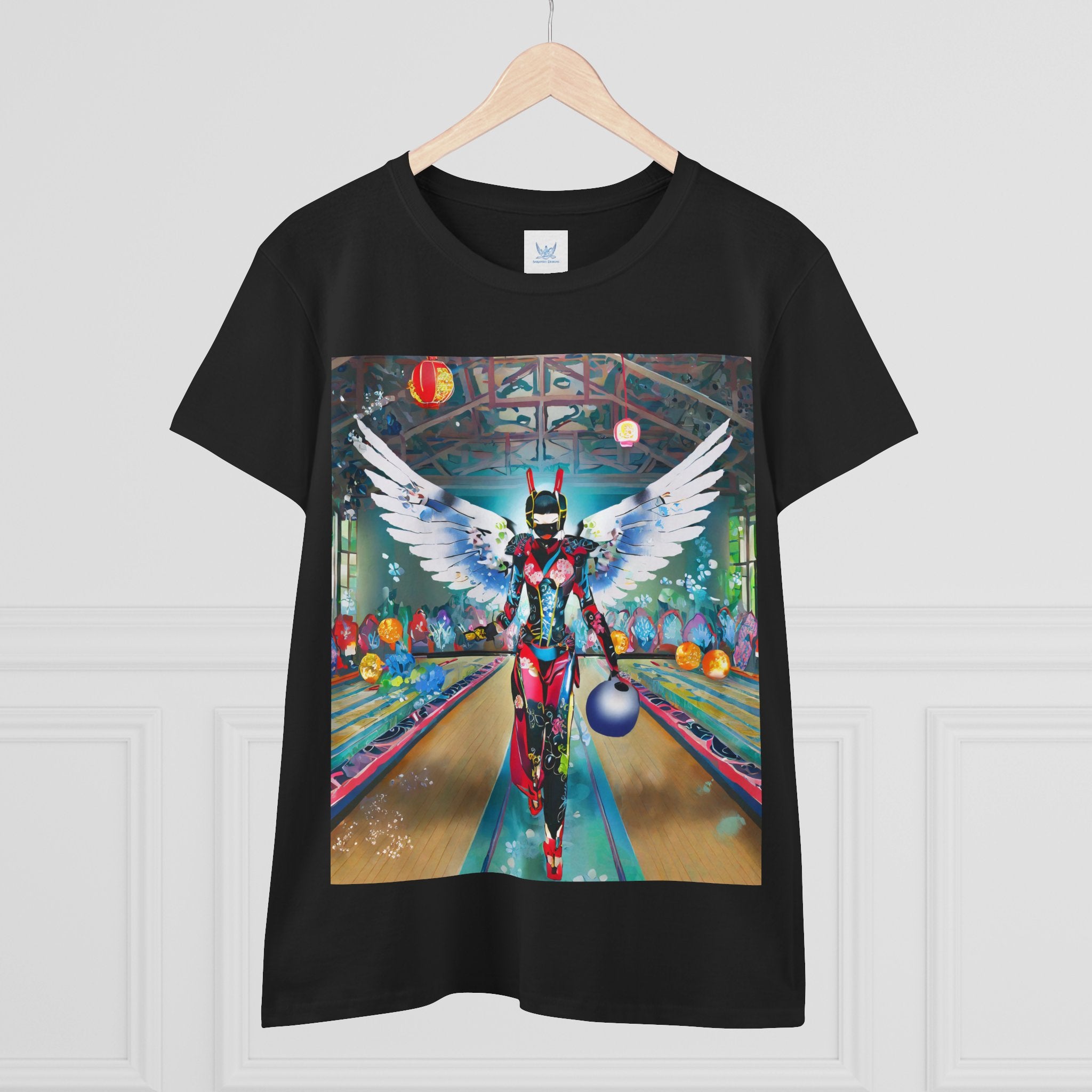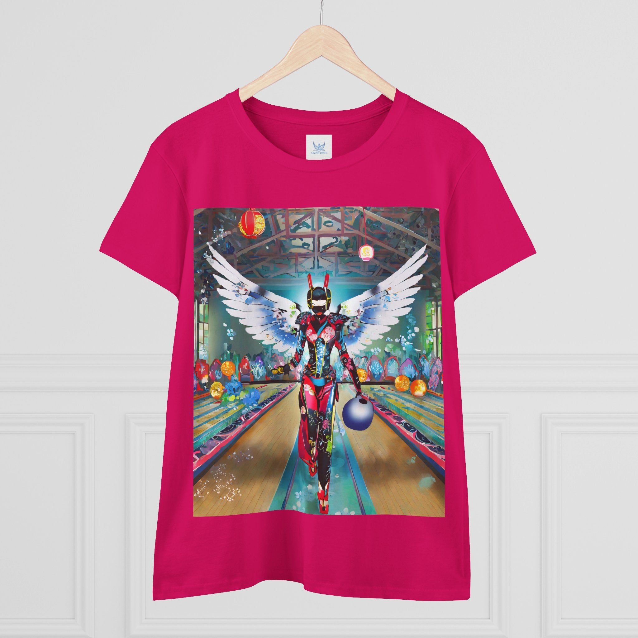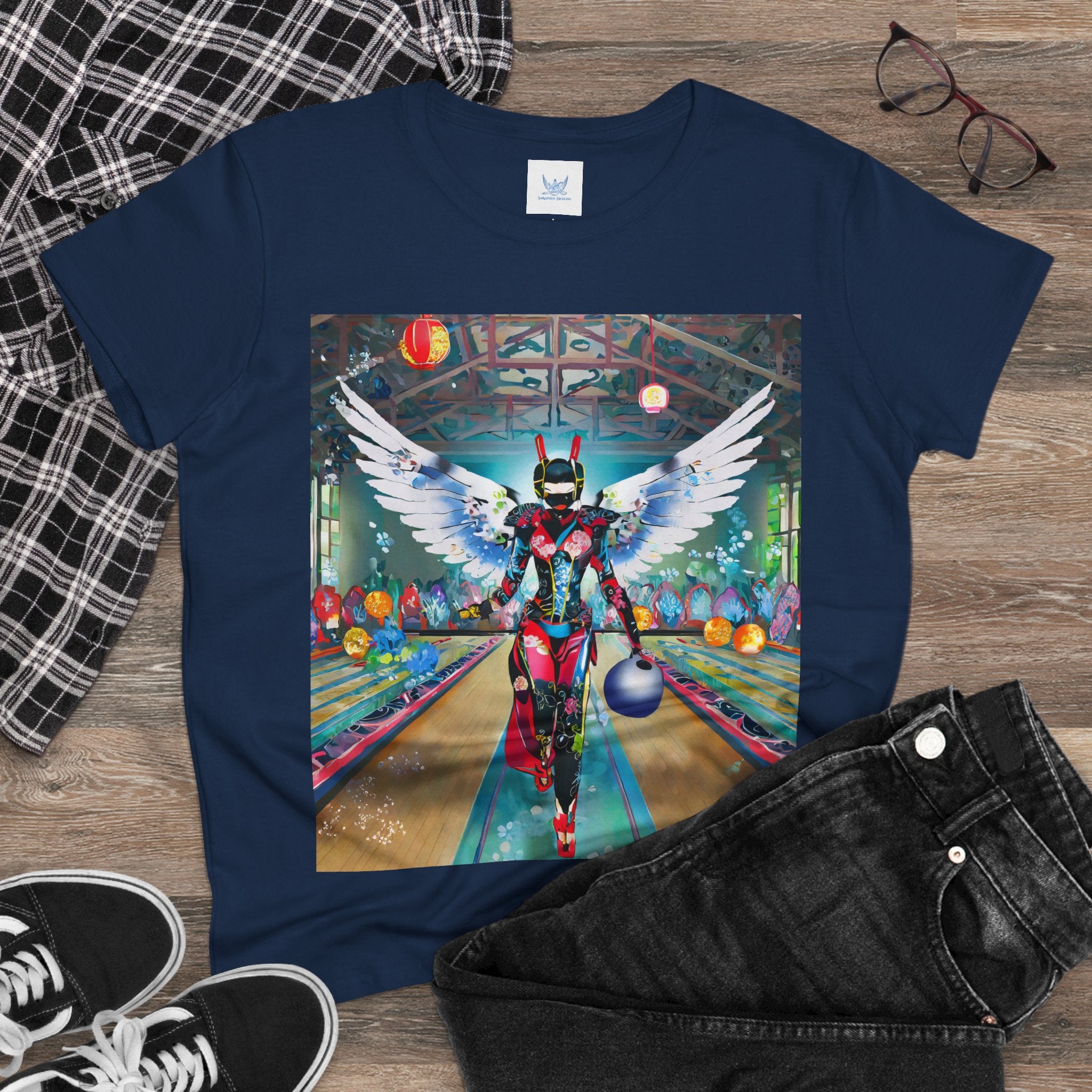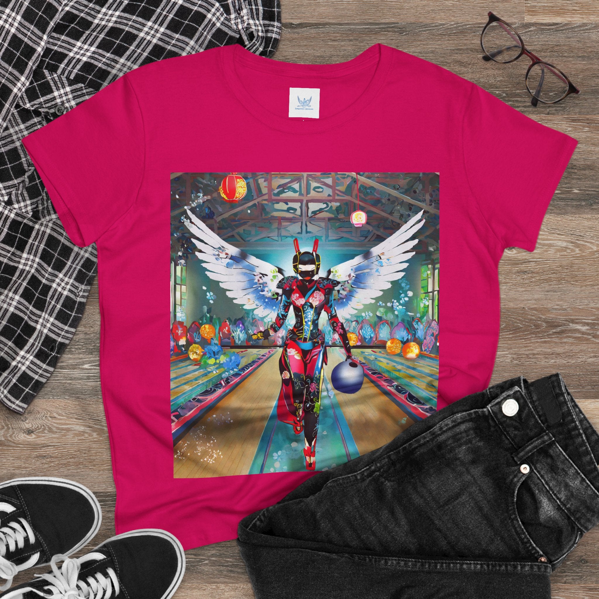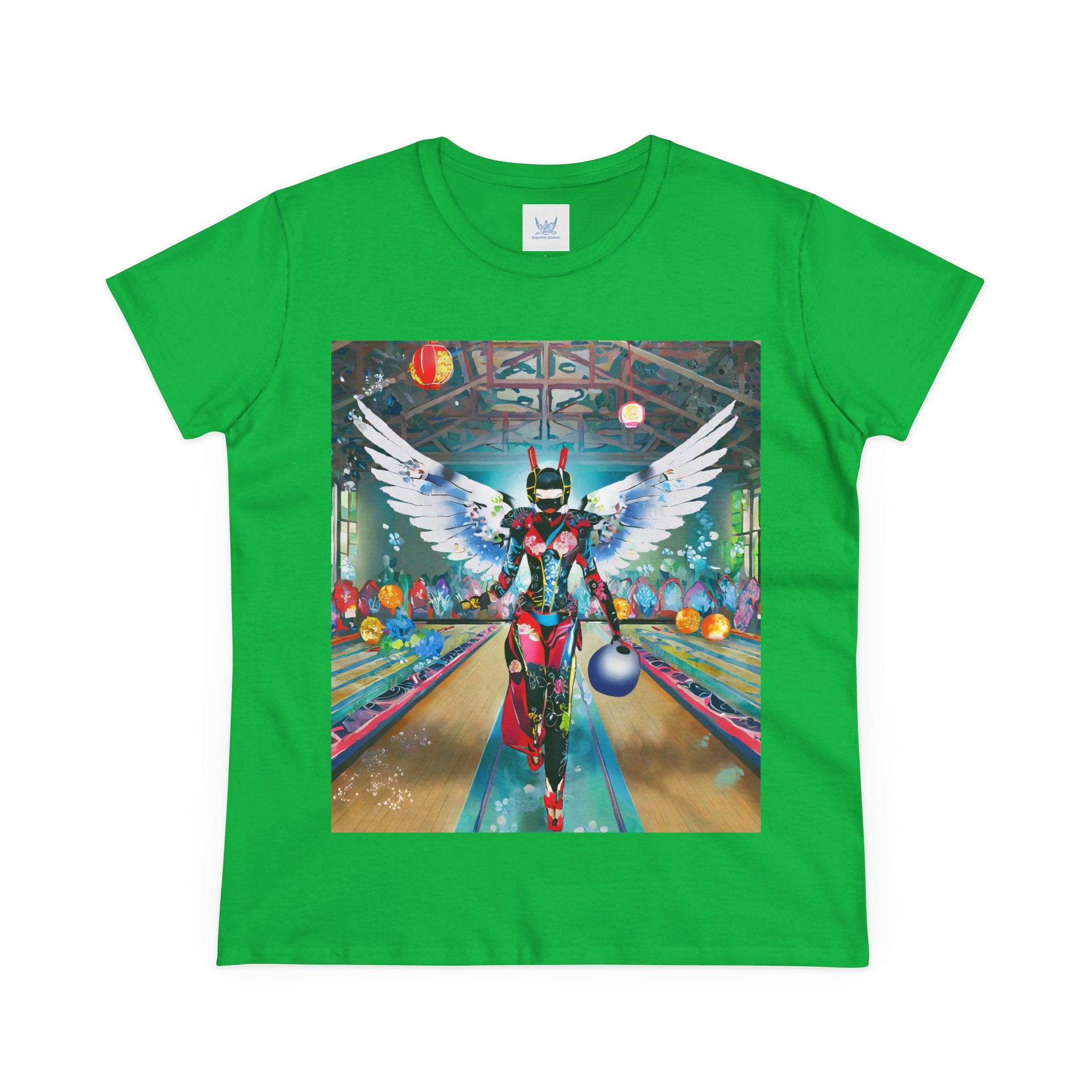 The artwork showcases high fashion cyber punk samurai robot angels confidently striding down a neon-lit bowling lane, ball in hand, in a futuristic bowling alley. Glowing wings, intricate armor, and vibrant cyber details create a dynamic scene that blends sport, sci-fi, and celestial energy into a striking piece of wearable art.