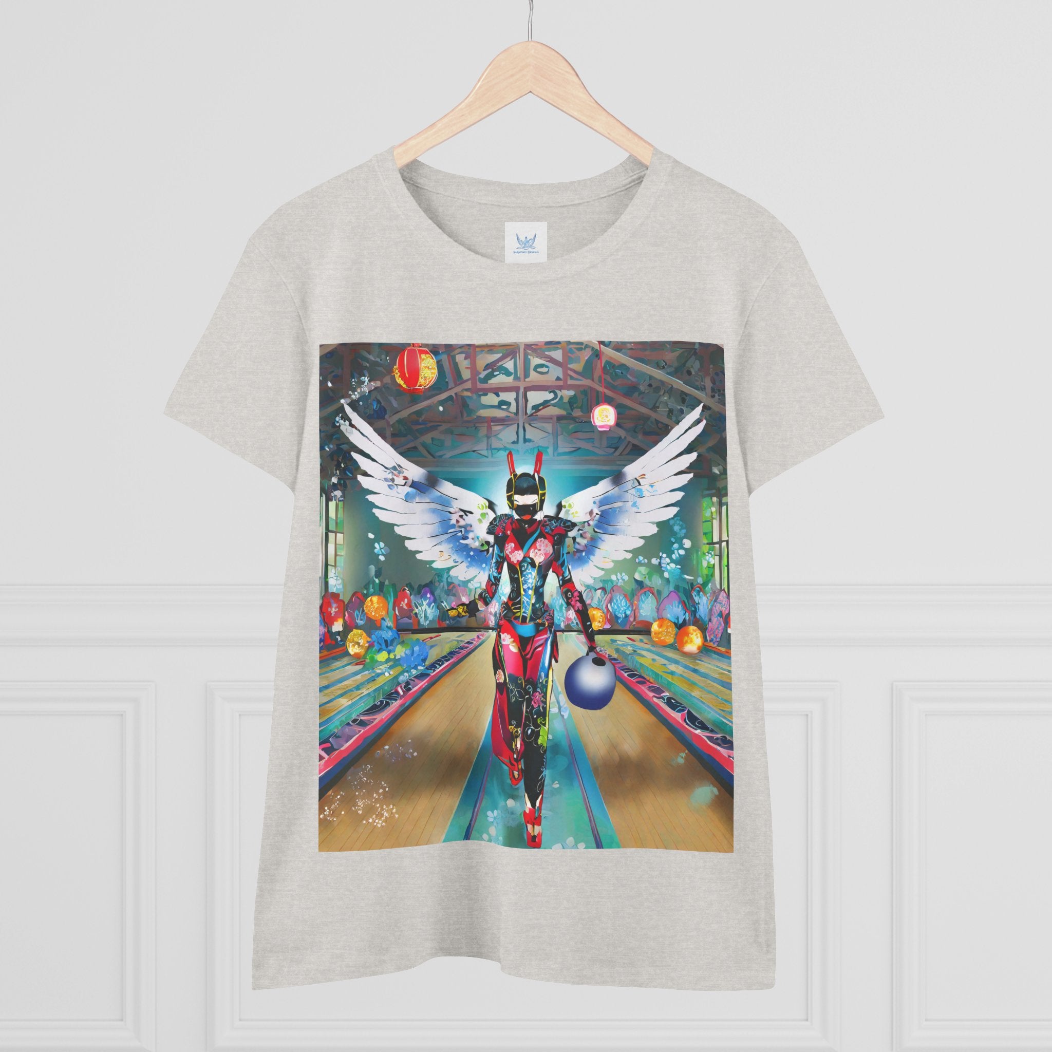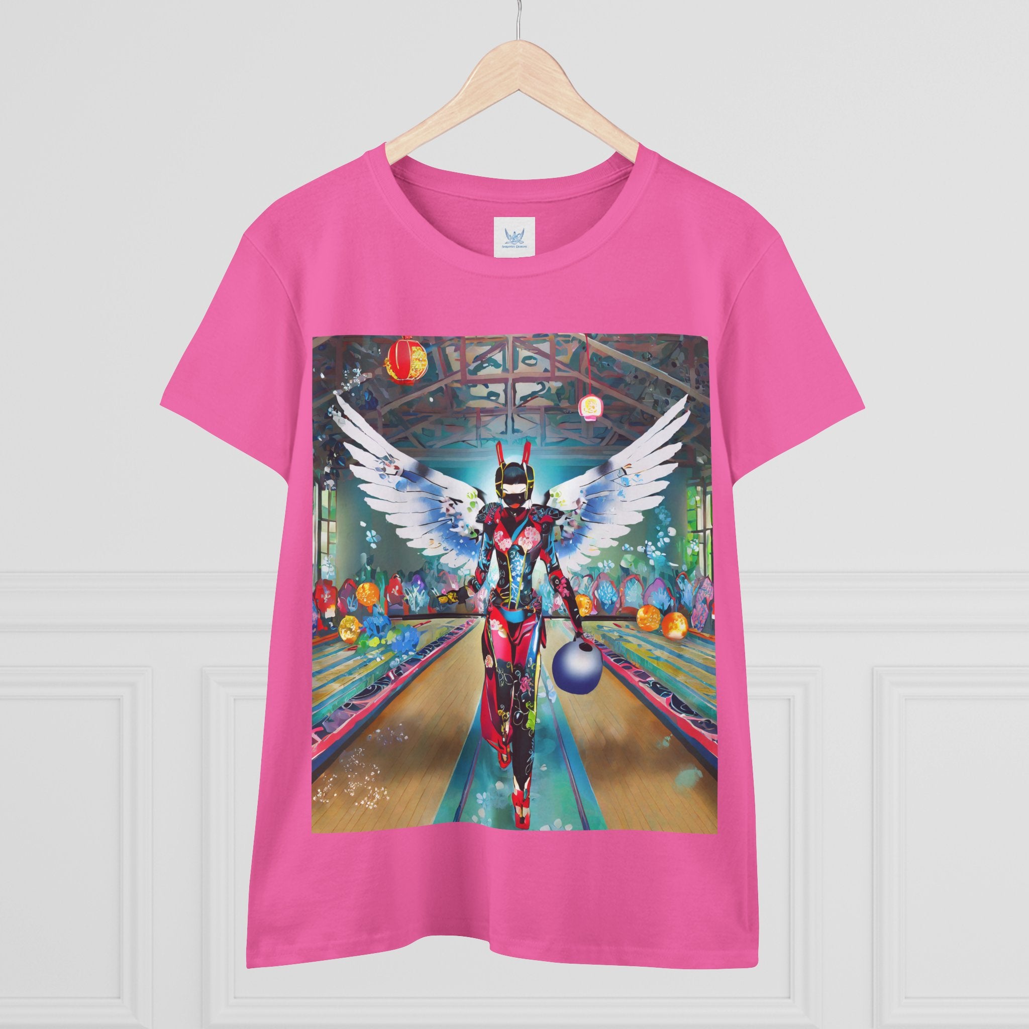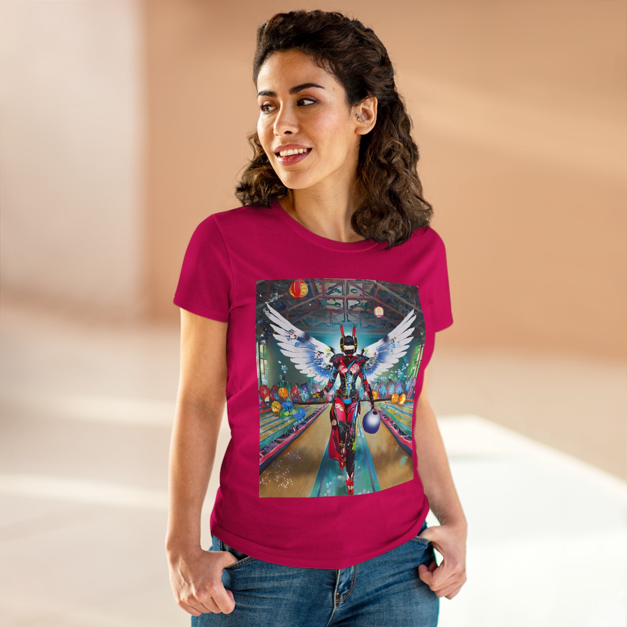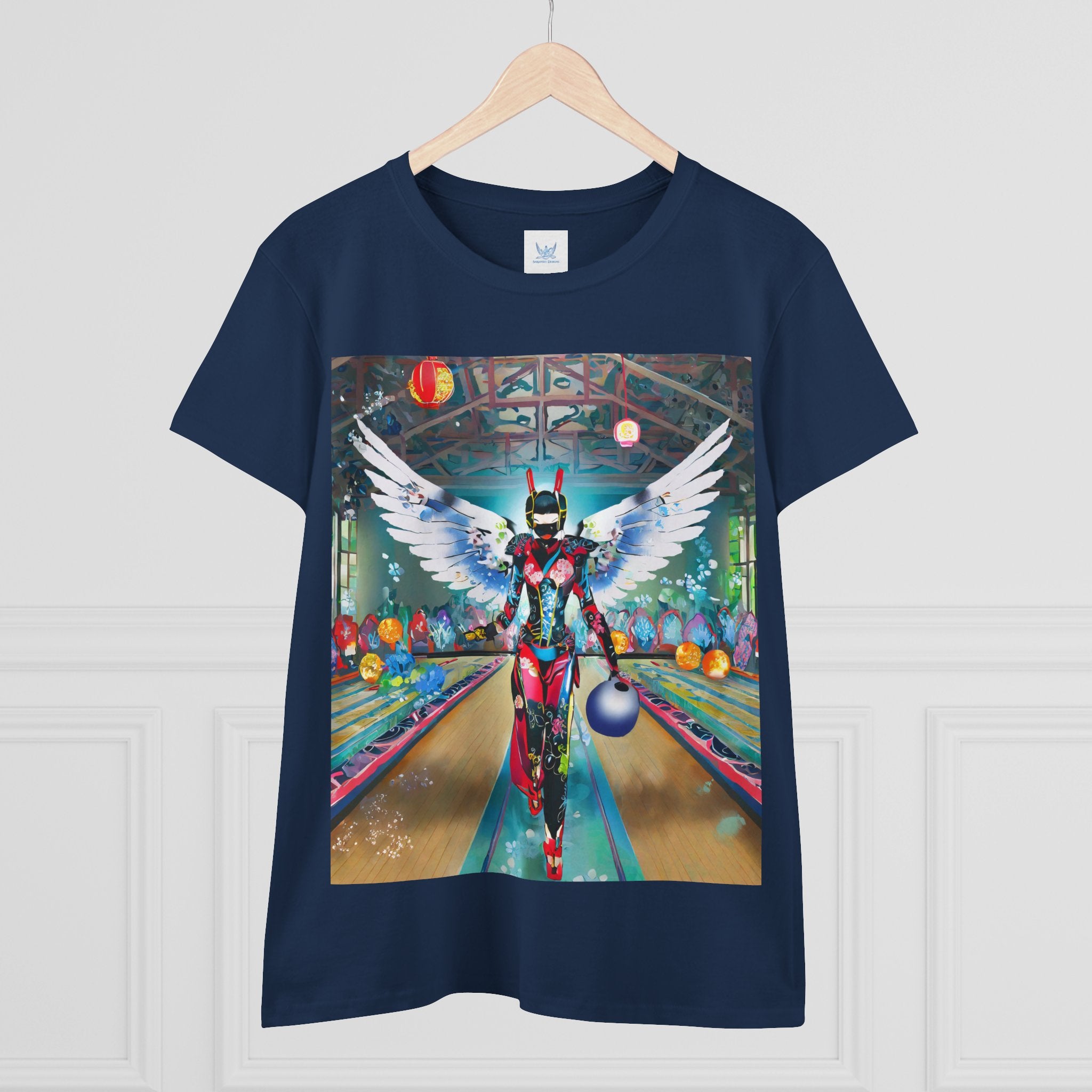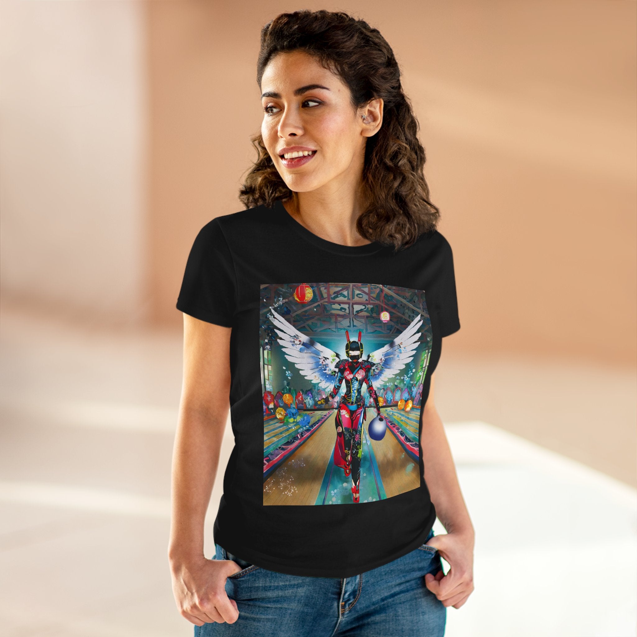The artwork showcases high fashion cyber punk samurai robot angels confidently striding down a neon-lit bowling lane, ball in hand, in a futuristic bowling alley. Glowing wings, intricate armor, and vibrant cyber details create a dynamic scene that blends sport, sci-fi, and celestial energy into a striking piece of wearable art.