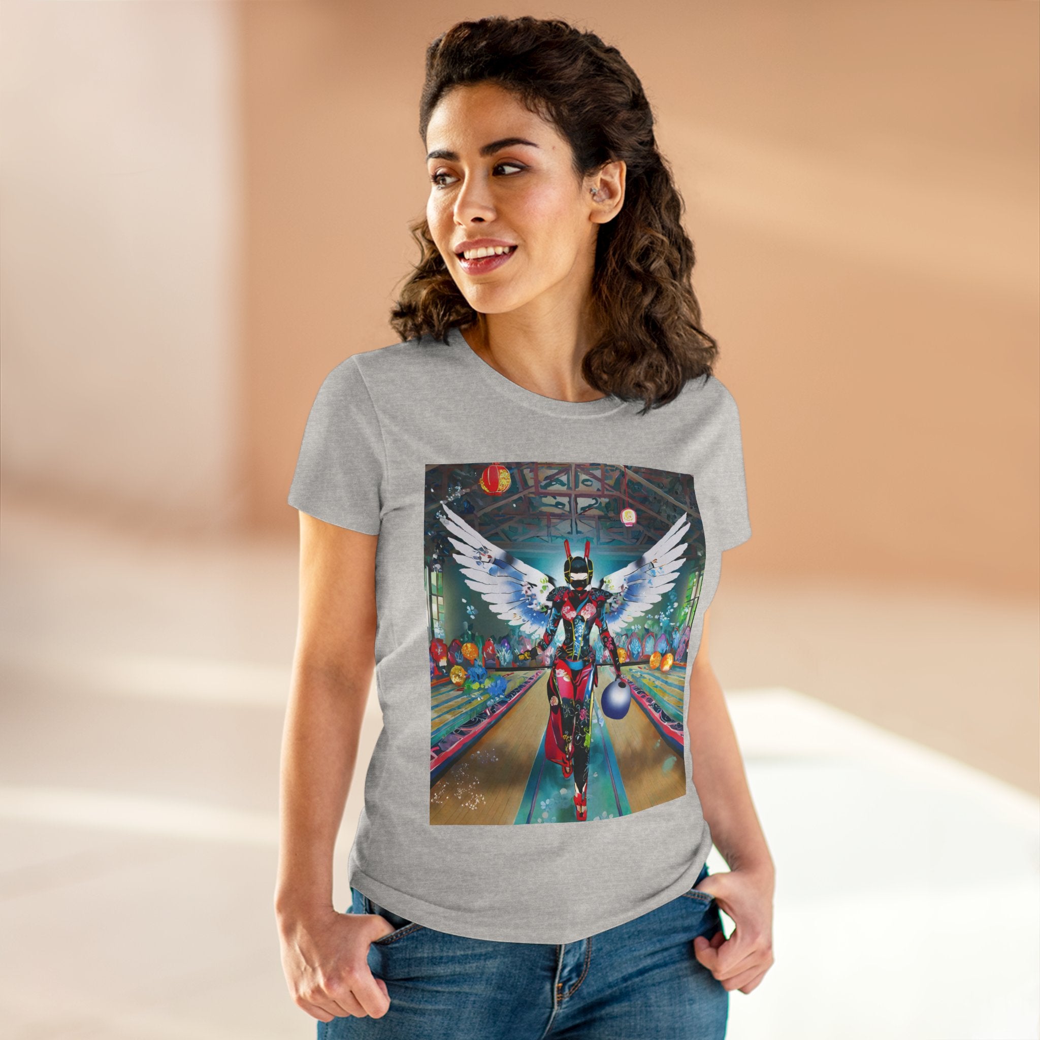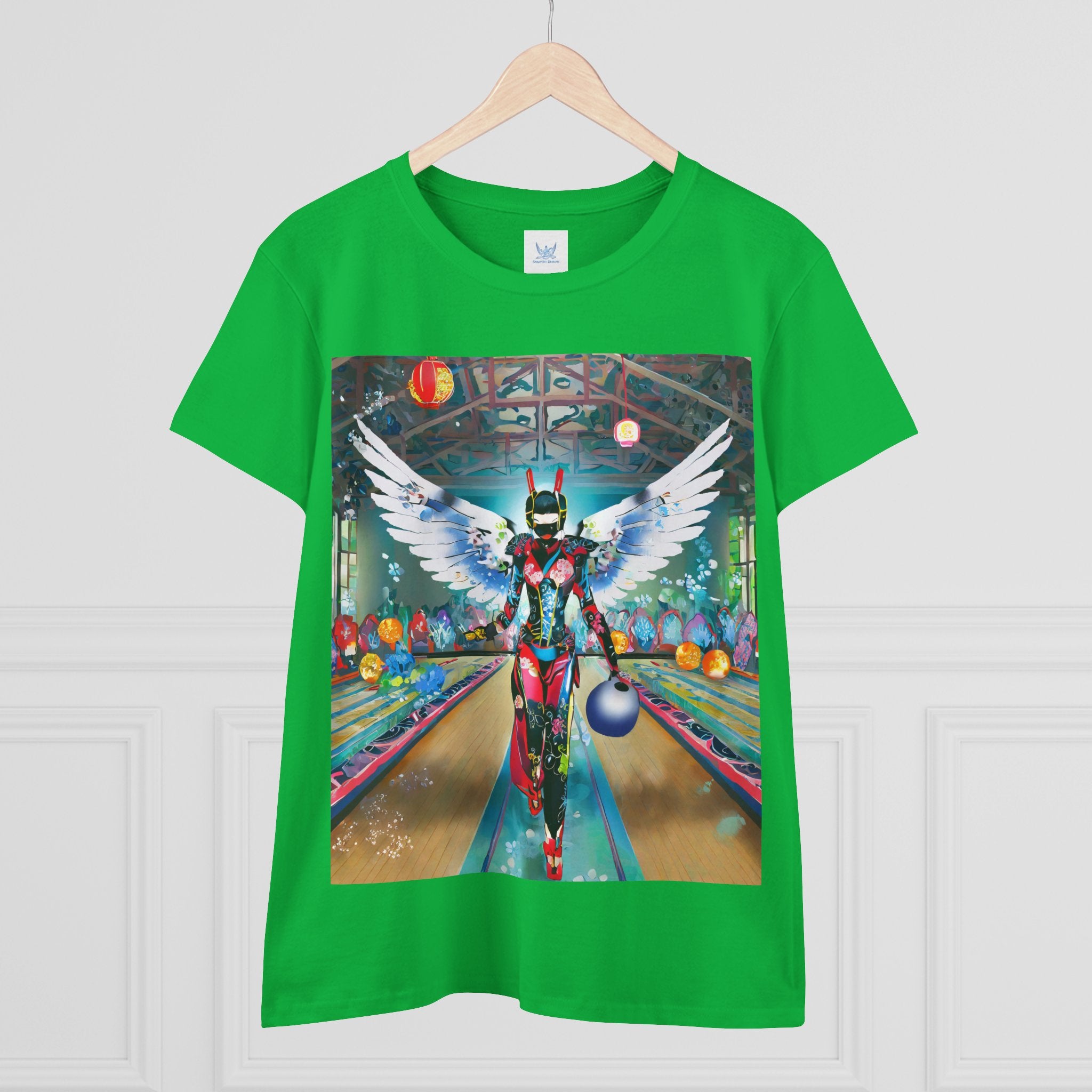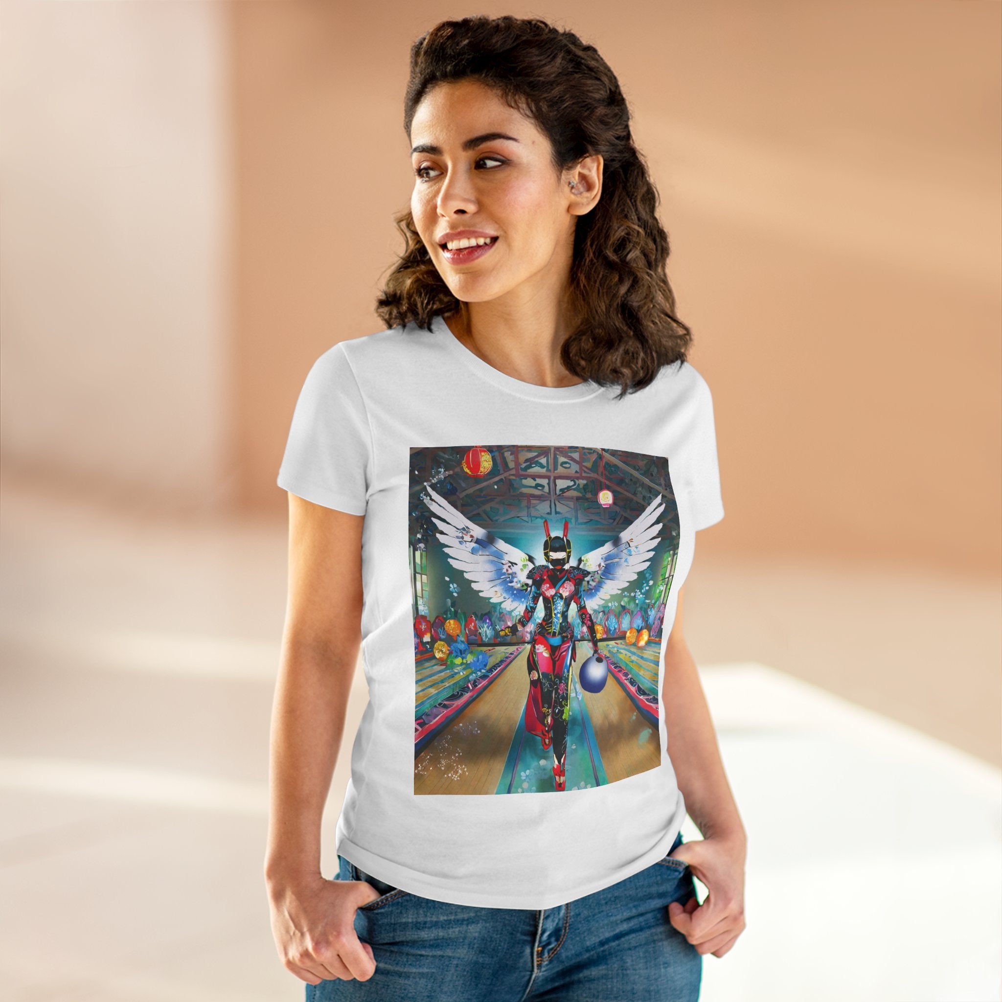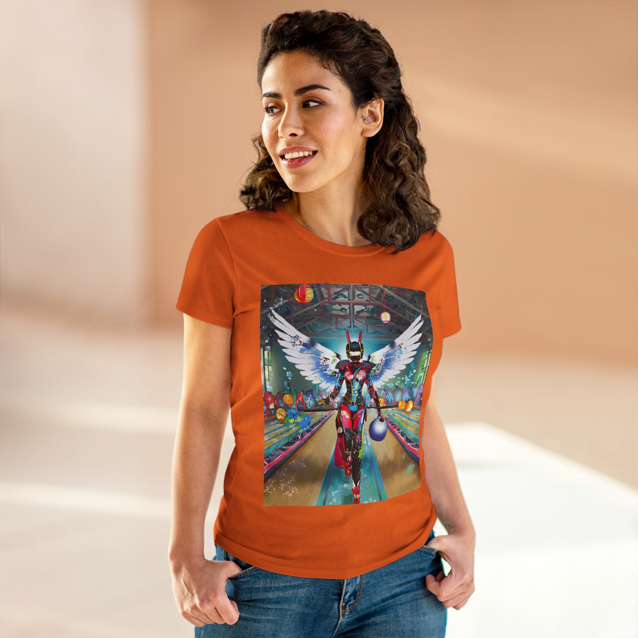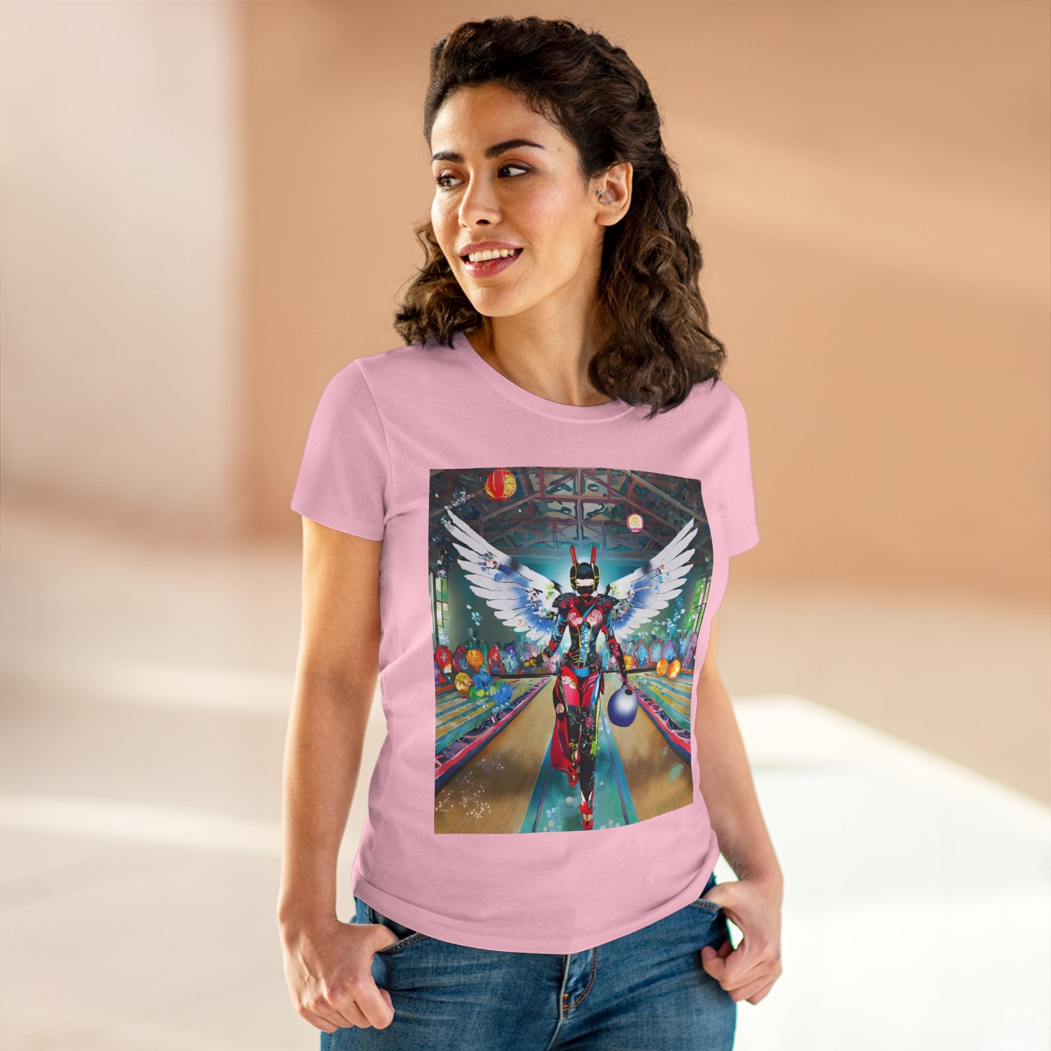 The artwork showcases high fashion cyber punk samurai robot angels confidently striding down a neon-lit bowling lane, ball in hand, in a futuristic bowling alley. Glowing wings, intricate armor, and vibrant cyber details create a dynamic scene that blends sport, sci-fi, and celestial energy into a striking piece of wearable art.