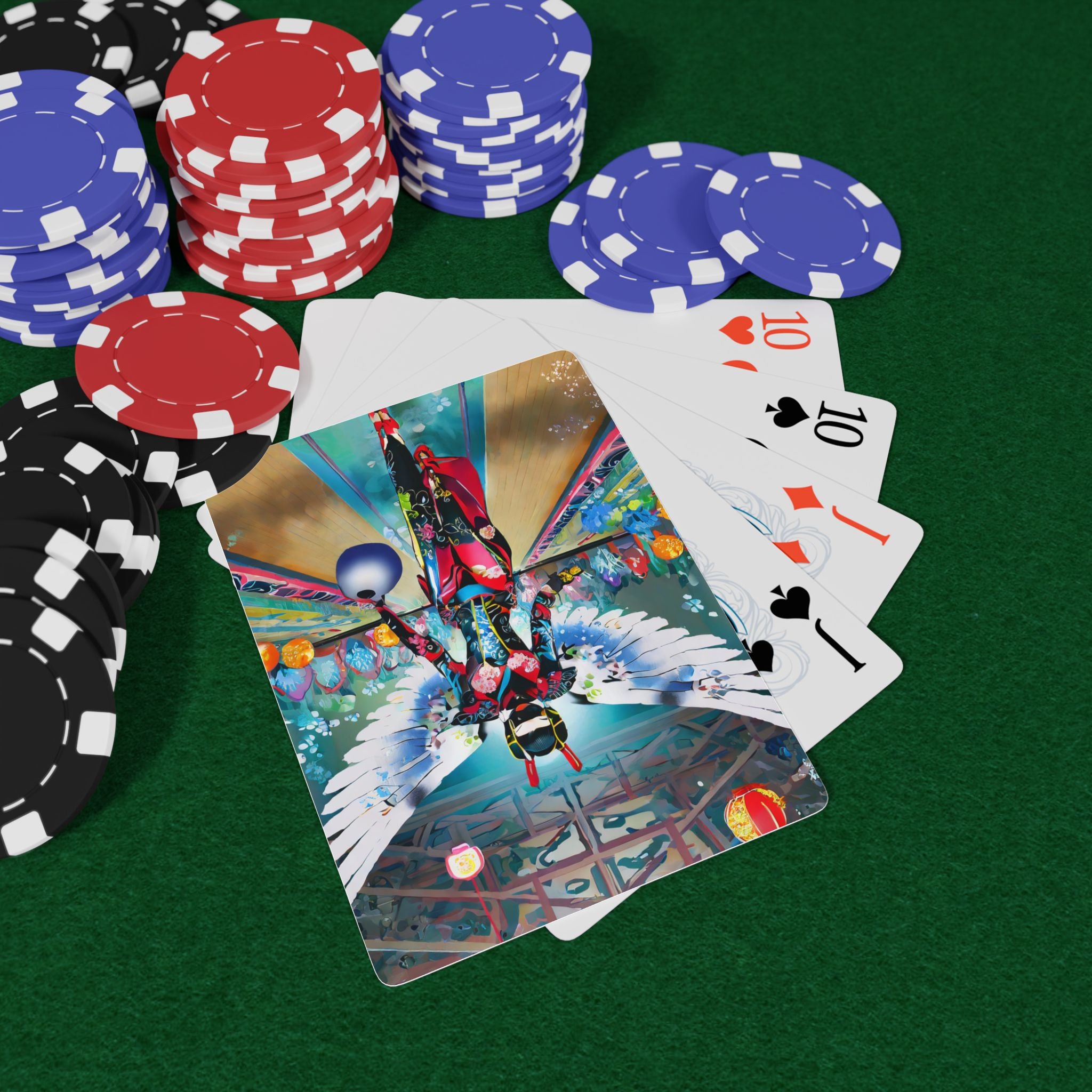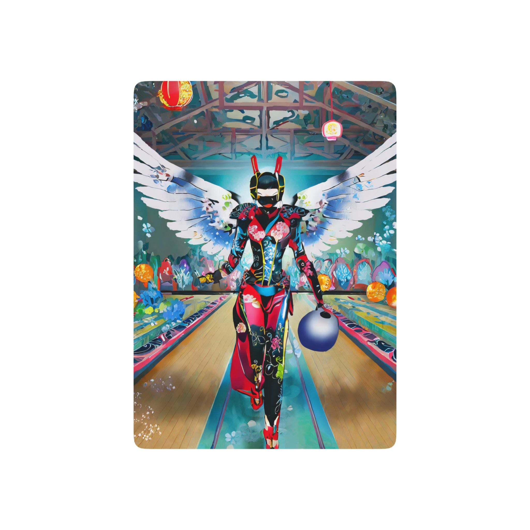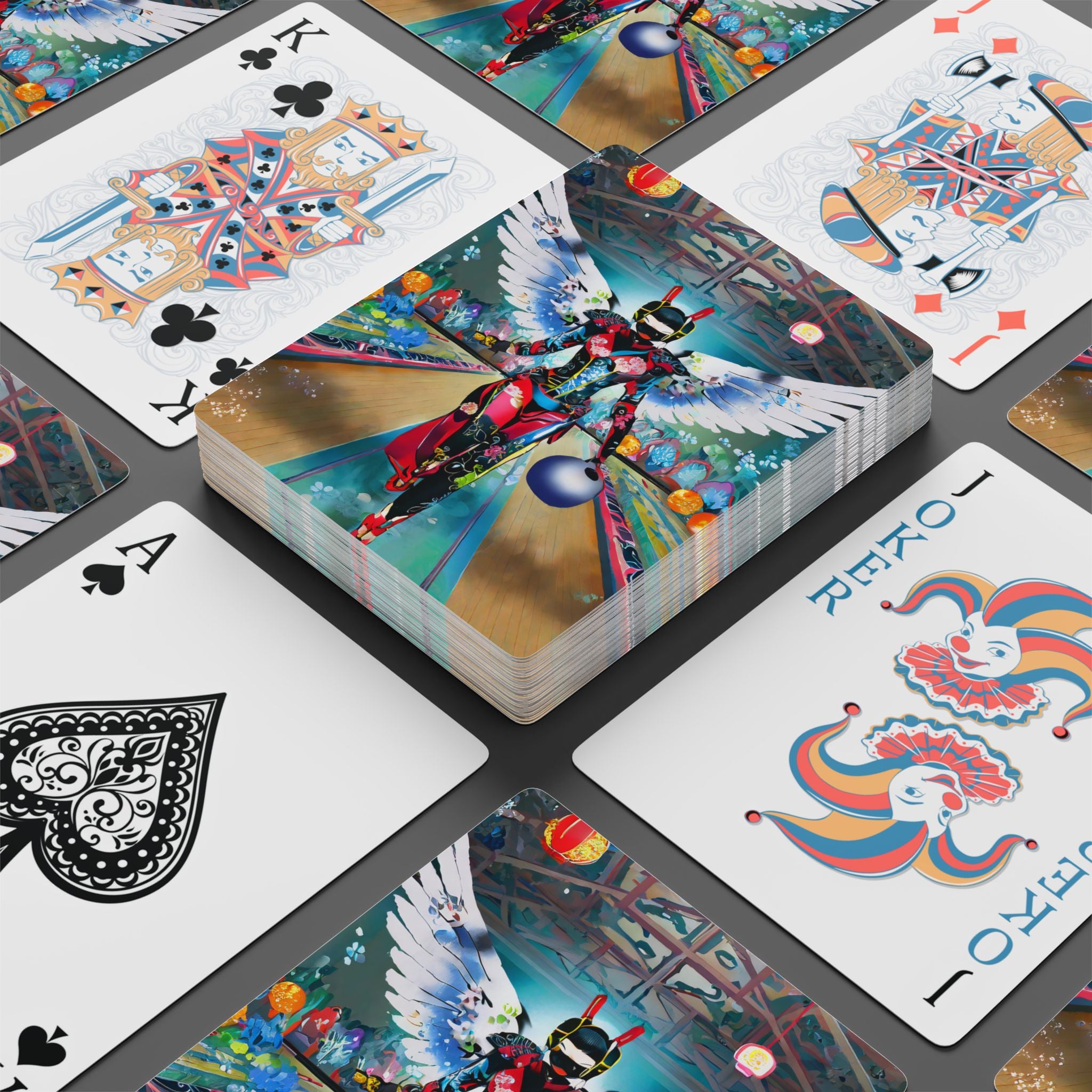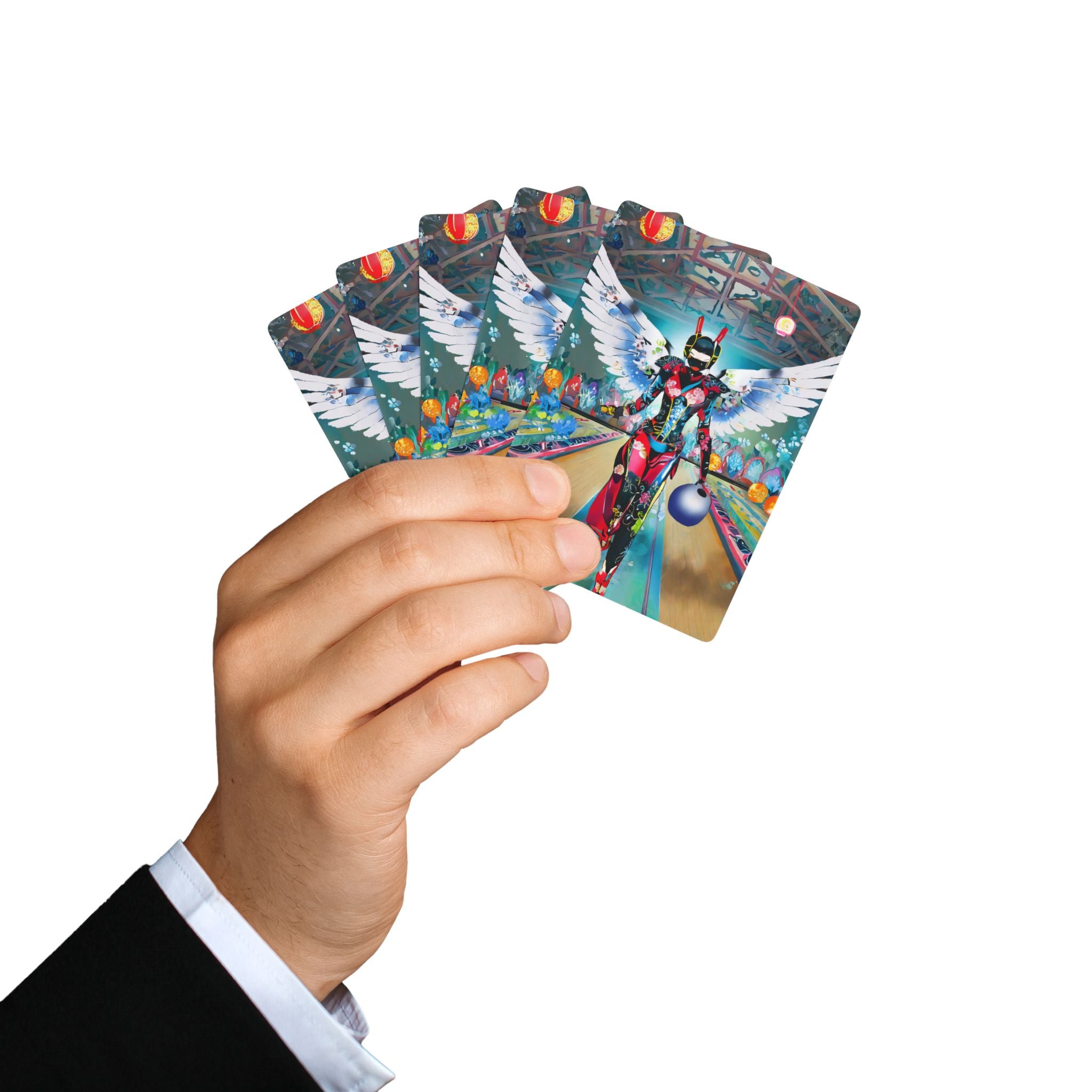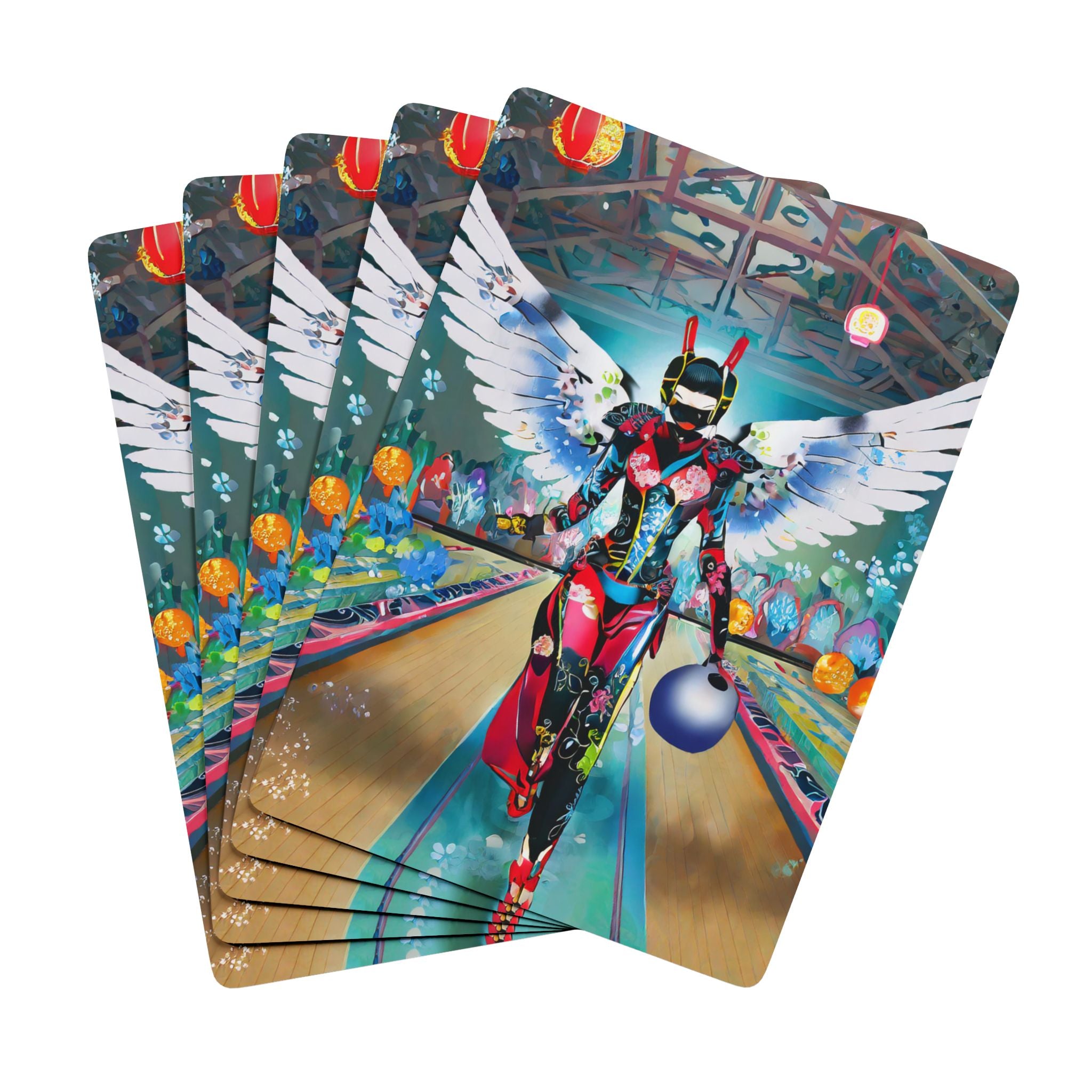 Poker nights are a great deal of fun, but a deck of cards like this makes them unforgettable. The Samurai Robot Angels Playing Cards feature high fashion cyberpunk samurai robot angels hitting the lanes at a glowing, futuristic bowling alley. Clad in sleek armor with ethereal wings and neon accents, these stylish warriors bring fierce energy and surreal elegance to a wildly imaginative cyberpunk world.