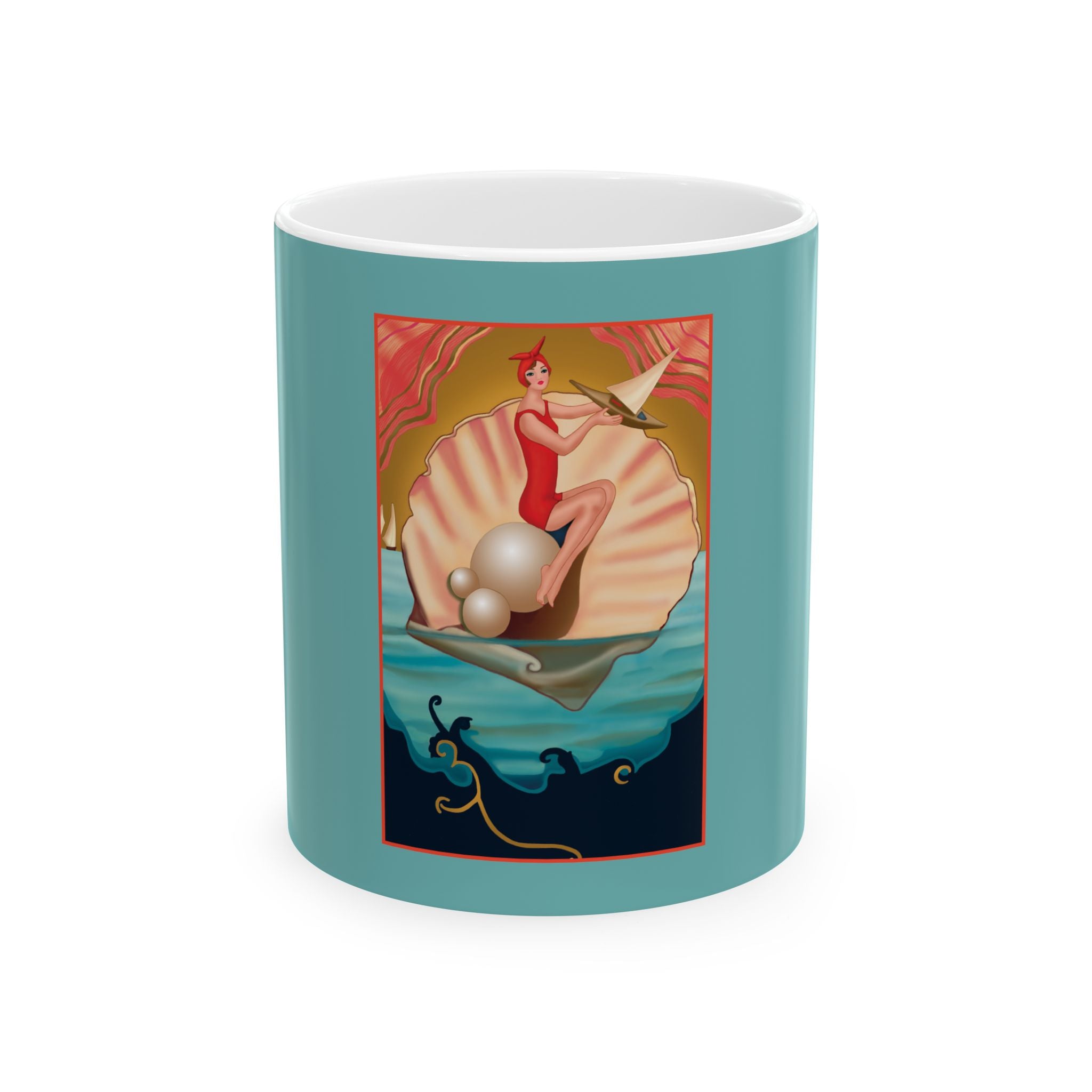 Artwork designed and digitally remastered by Sarasvati Designs. A vintage image shows a woman in a red swimsuit perched on a pearl in a scallop shell against a gold background. The woman holds a toy sailboat and the image is set against a blue-green sea with sailboats on the horizon. The image captures the essence of a sun-kissed day at sea, where beauty, joy, and the allure of exploration intertwine.