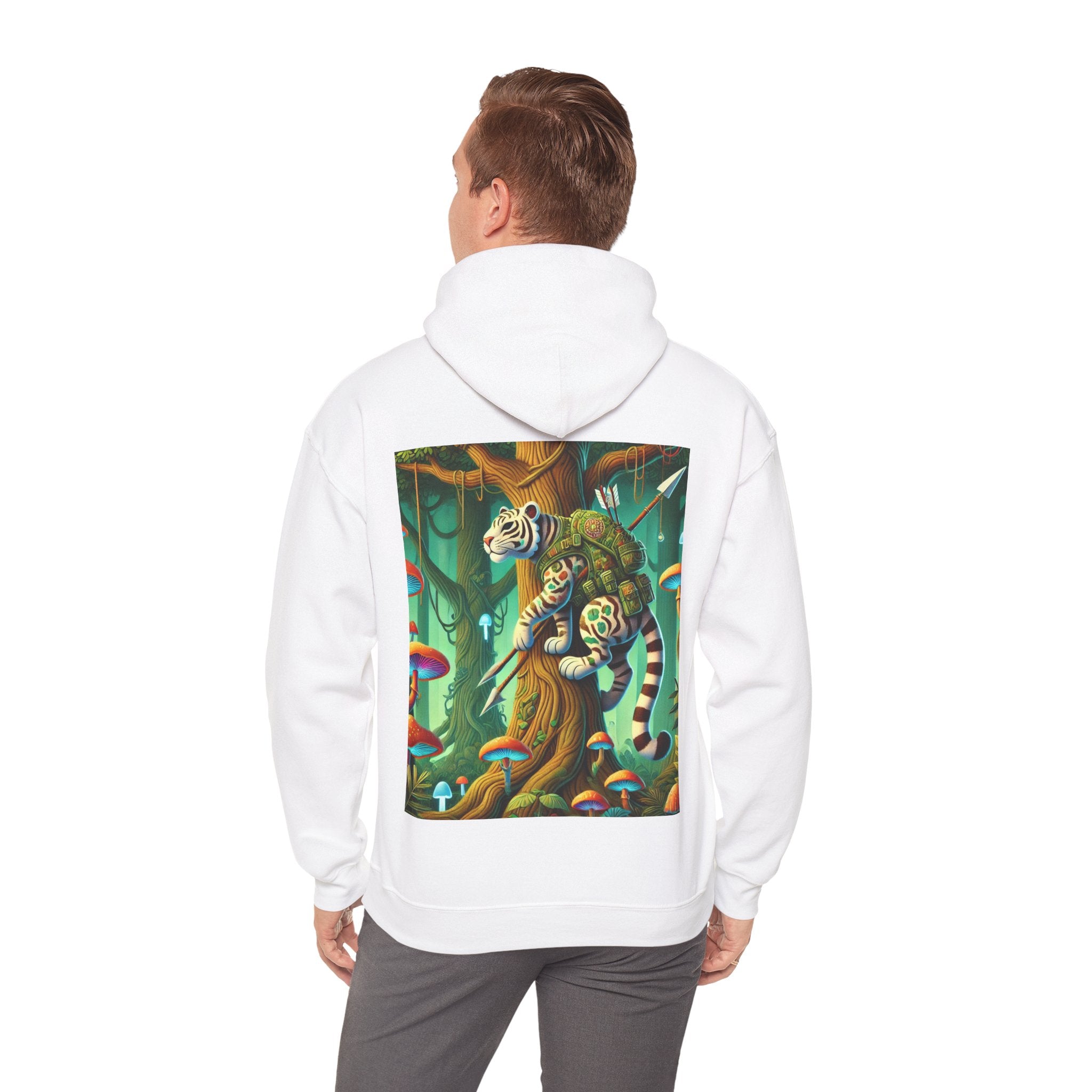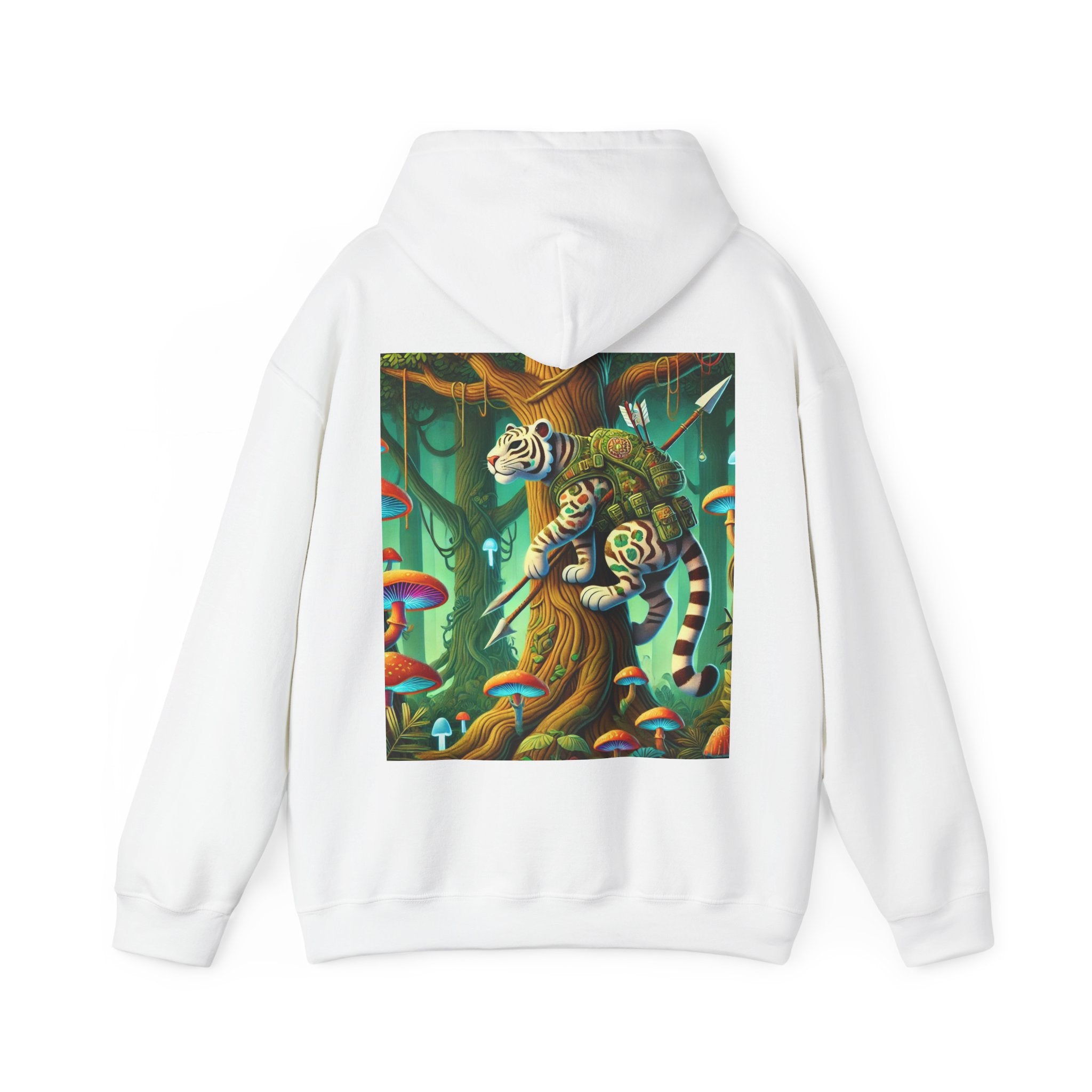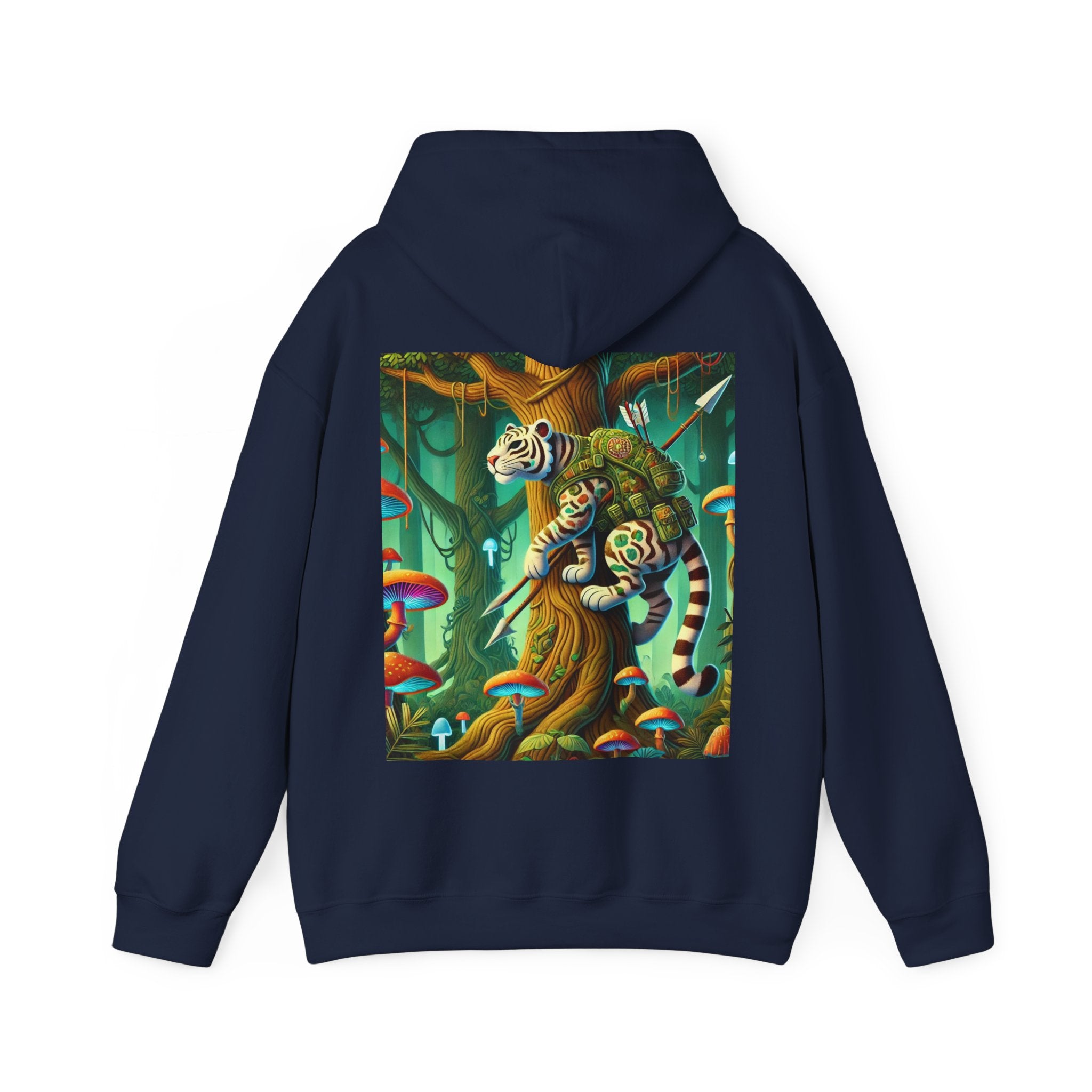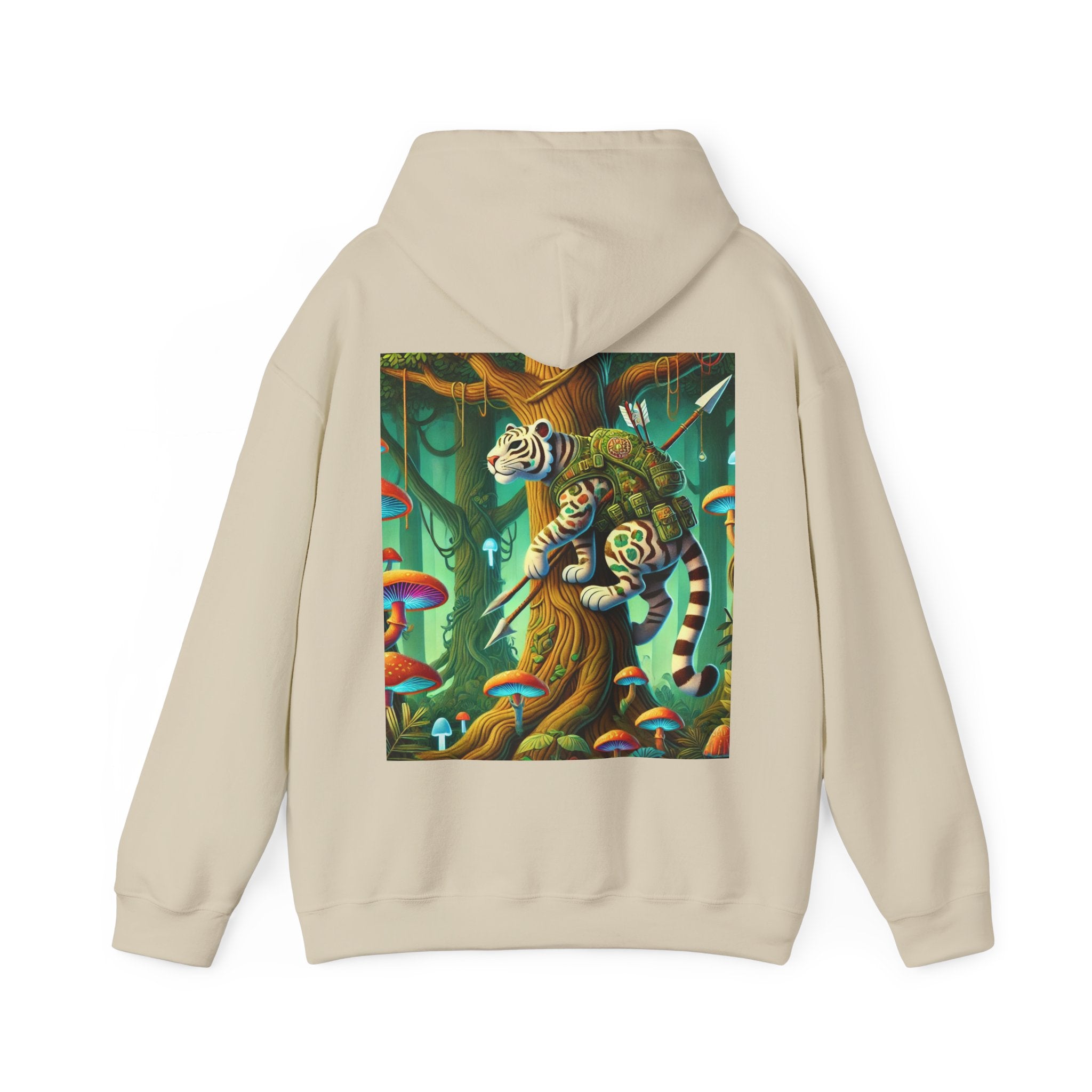 Silent Stripes – Heavy Blend™ Hooded Sweatshirt blends quiet power with the allure of a hidden world deep in the ancient jungle. The artwork follows a solitary tiger moving through an enchanted forest, its stripes merging so seamlessly with the misty, bioluminescent glow that it seems to appear and vanish with every step. Ascending a towering tree, it becomes part guardian, part shadow, part myth—an otherworldly creature whose presence feels both serene and electrifying. The scene captures a moment where nature, magic, and silence hold their breath together.